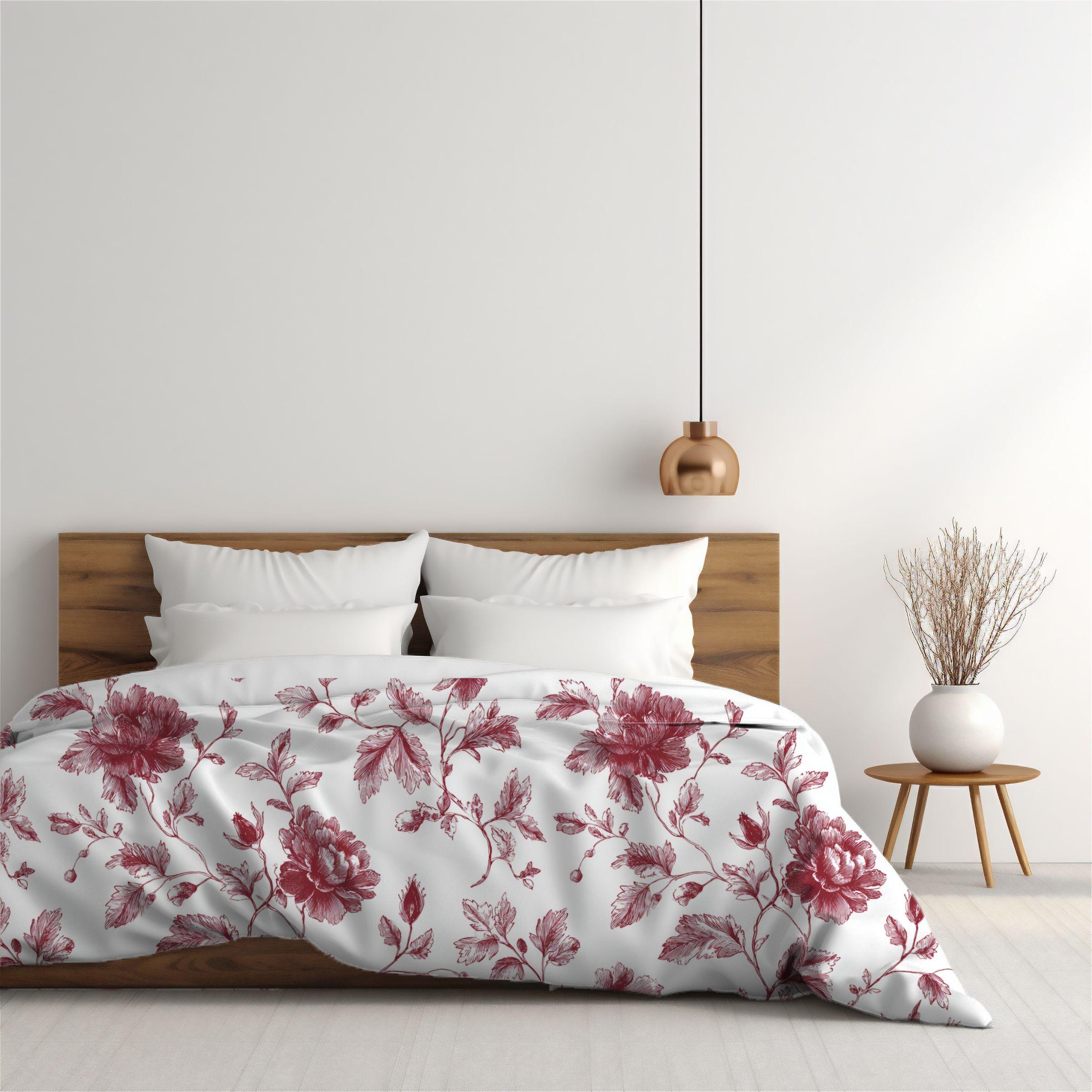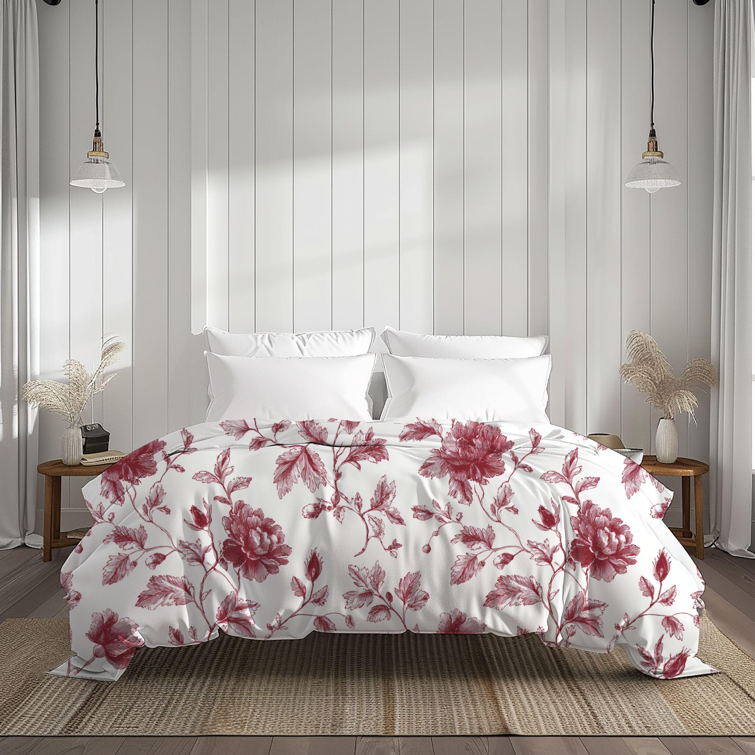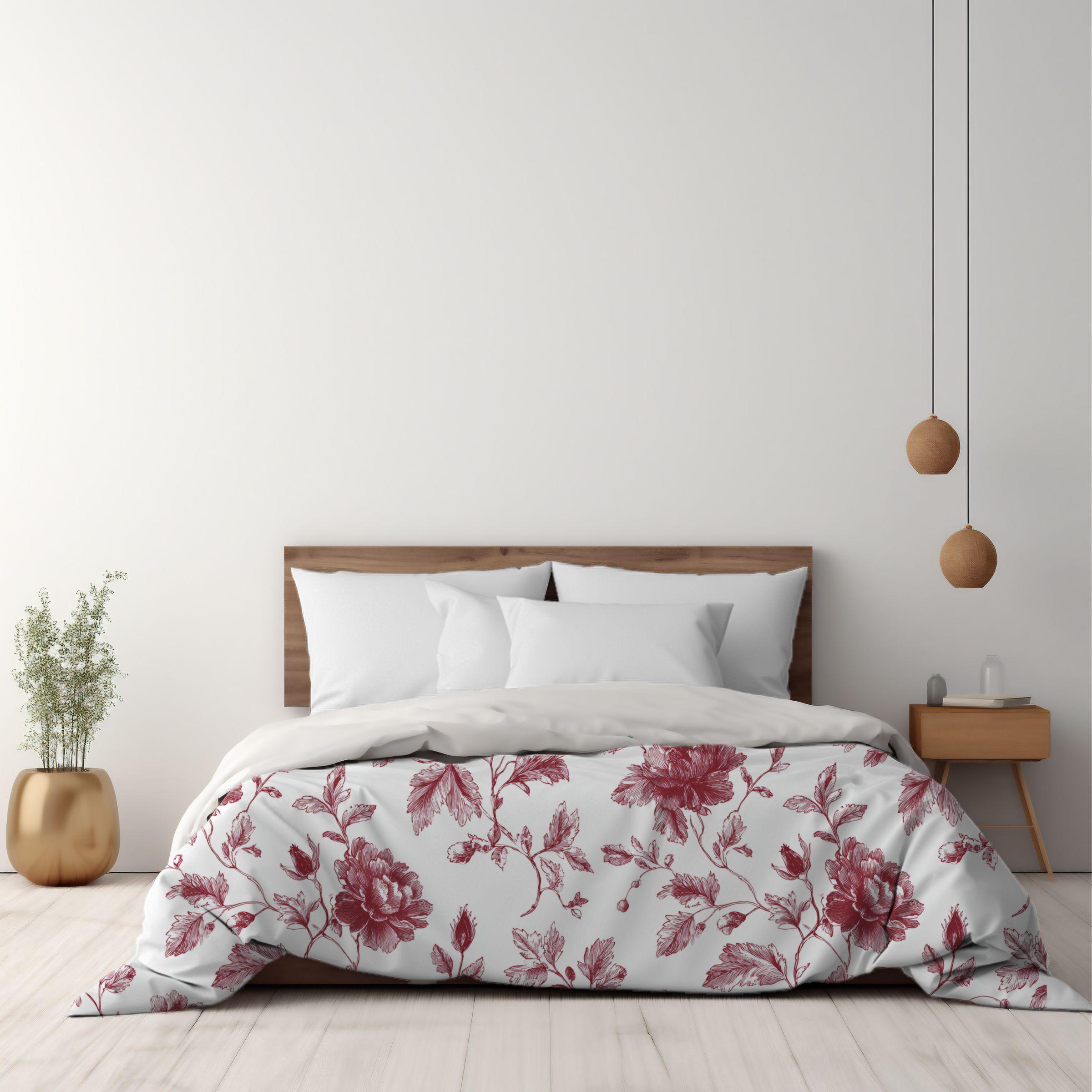 A soft, breathable cotton duvet cover printed with a painterly floral pattern in warm rose tones. The design reads like watercolor sketches—delicate blooms and trailing stems drifting across a clean ivory ground. Lightweight yet substantial, the fabric settles smoothly over your duvet, while an invisible zipper and interior corner ties hold the insert in place for a tidy, tailored look. It brings a calm, quietly romantic mood to a bedroom: think slow mornings with filtered light, cups of tea, and the comfort of a tucked-in bed that still feels inviting and lived-in. Suited to serene, cottagecore, or vintage-inspired interiors, this duvet cover adds a hand-painted sensibility without demanding fuss—wash it gently, re-drape, and sleep in the softened colors night after night.