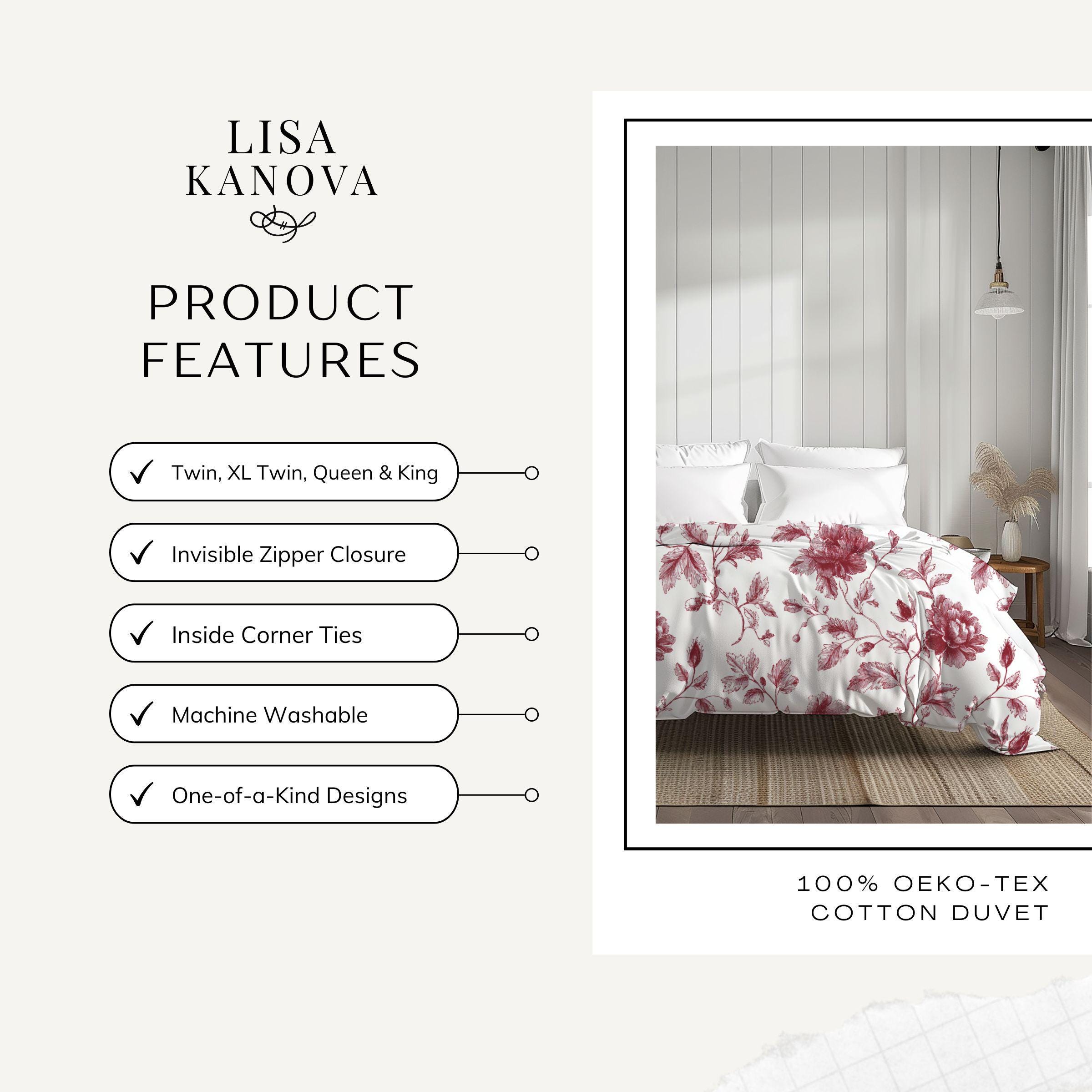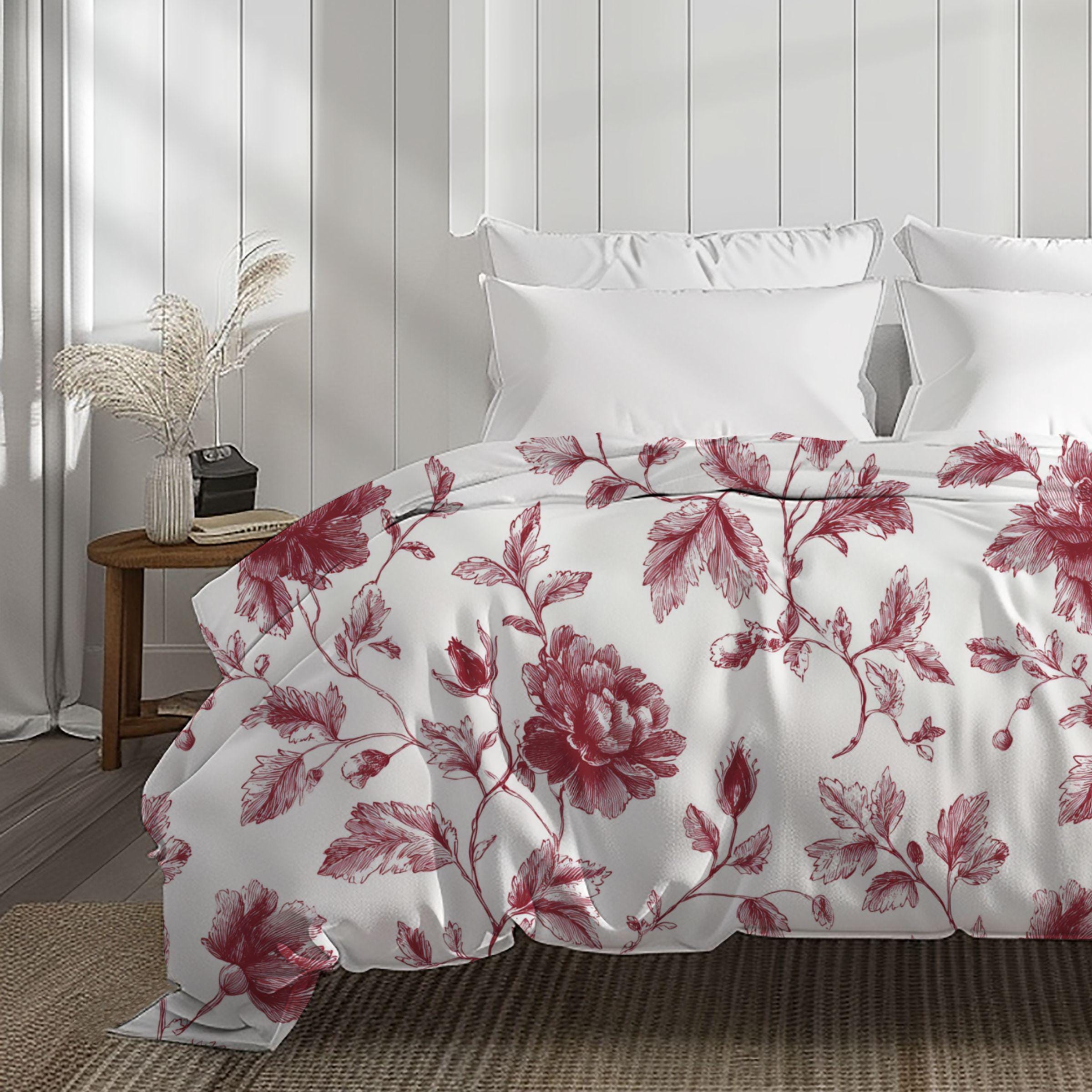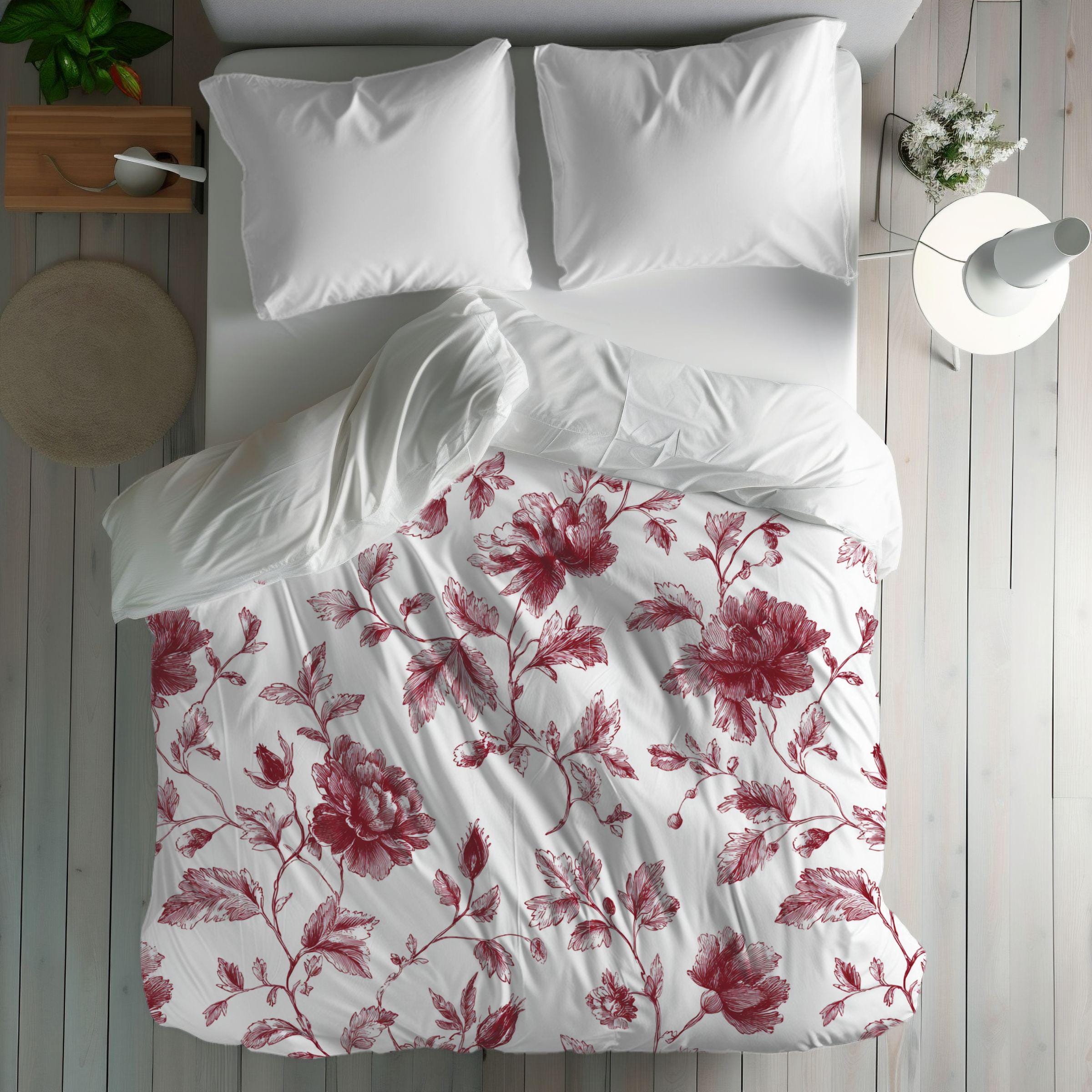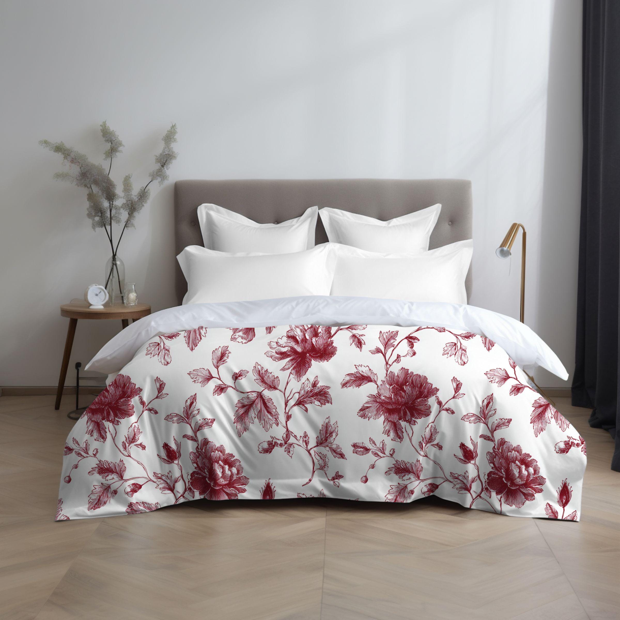 A soft, breathable cotton duvet cover printed with a painterly floral pattern in warm rose tones. The design reads like watercolor sketches—delicate blooms and trailing stems drifting across a clean ivory ground. Lightweight yet substantial, the fabric settles smoothly over your duvet, while an invisible zipper and interior corner ties hold the insert in place for a tidy, tailored look. It brings a calm, quietly romantic mood to a bedroom: think slow mornings with filtered light, cups of tea, and the comfort of a tucked-in bed that still feels inviting and lived-in. Suited to serene, cottagecore, or vintage-inspired interiors, this duvet cover adds a hand-painted sensibility without demanding fuss—wash it gently, re-drape, and sleep in the softened colors night after night.