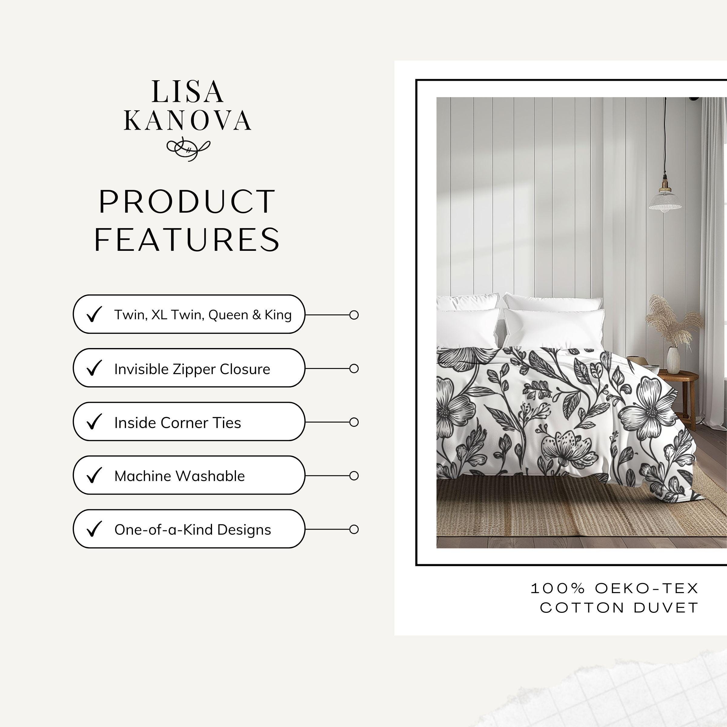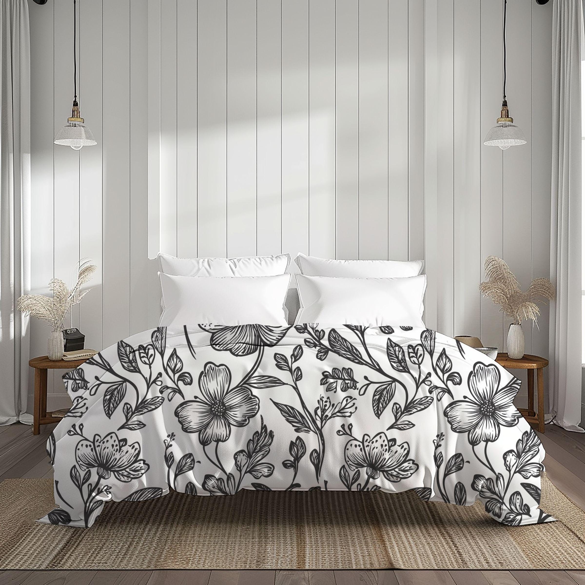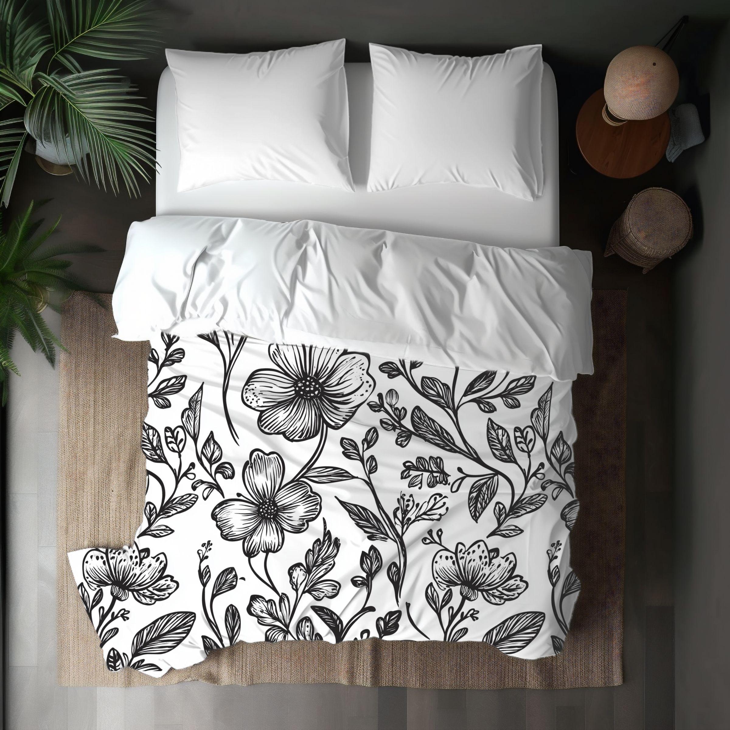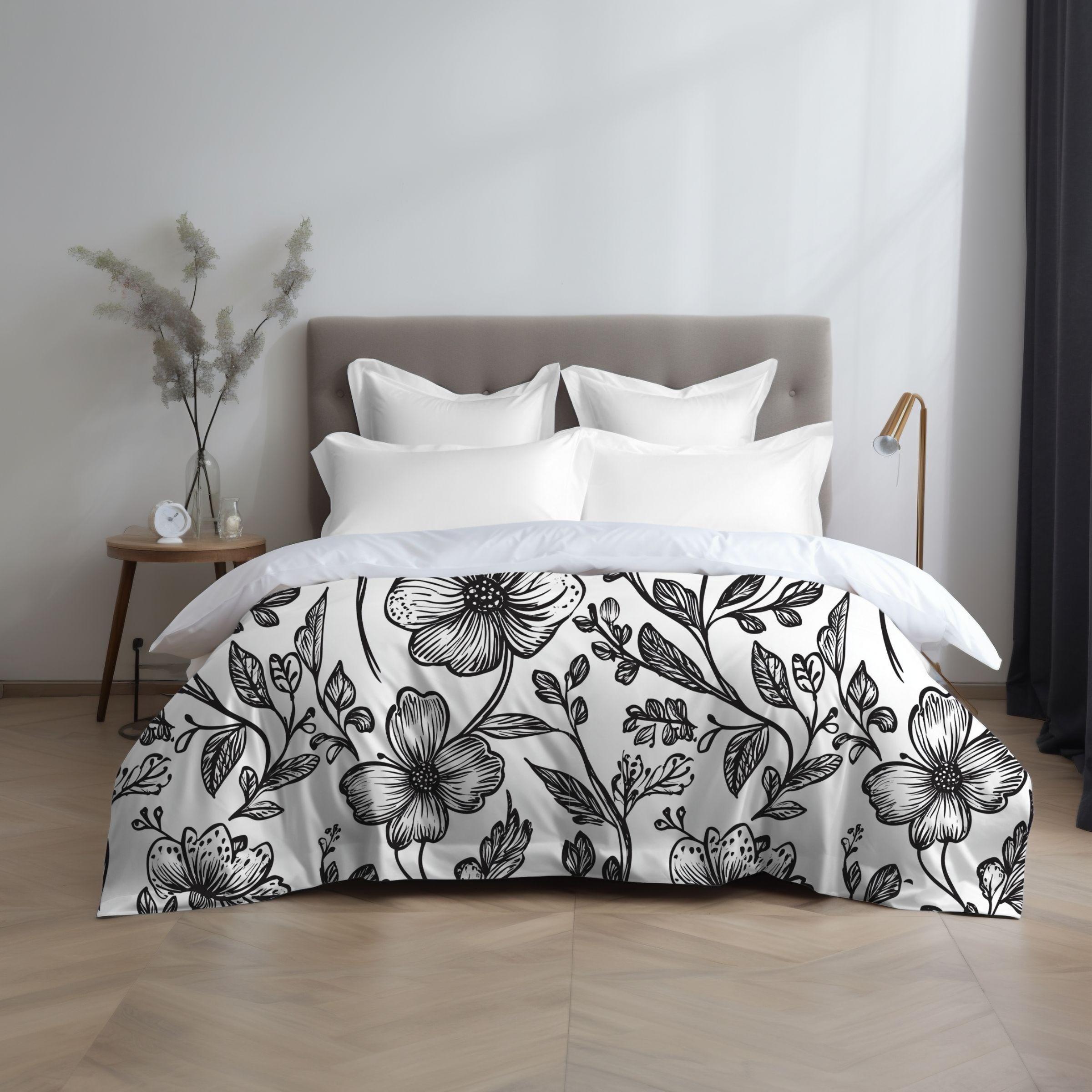 Wrap your bedroom in quiet, hand-drawn charm. This cotton duvet cover features a delicate black-and-white botanical pattern that feels like an illustrated garden drifting across the bed. The soft Oeko‑Tex cotton cradles you each night, while the edge-to-edge direct-to-fabric print keeps linework crisp and subtle. Invisible zipper closure and inside corner ties make changing and securing your insert simple, and the low-maintenance machine-wash fabric stays soft and vibrant through gentle cycles. It settles into Scandinavian, cottage, or minimalist spaces—adding a calm, curated layer that reads like a page from a nature sketchbook and invites slow mornings and lingering evenings.
