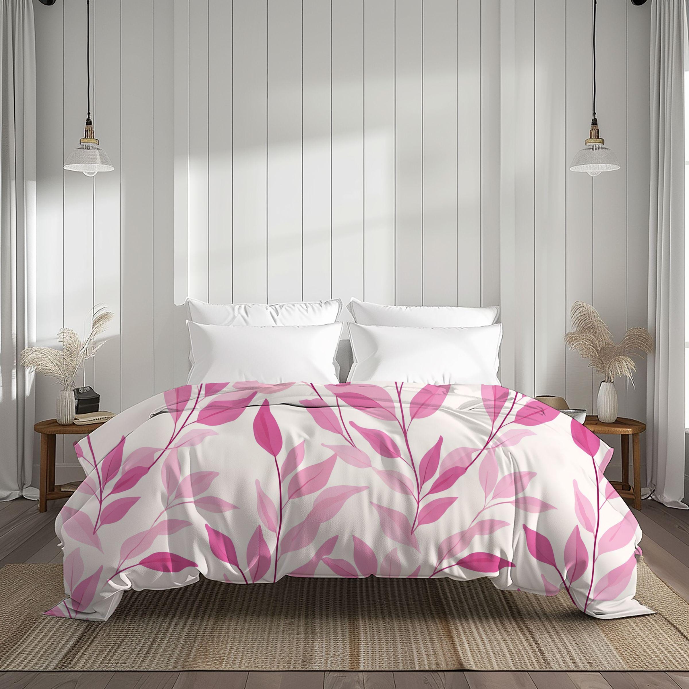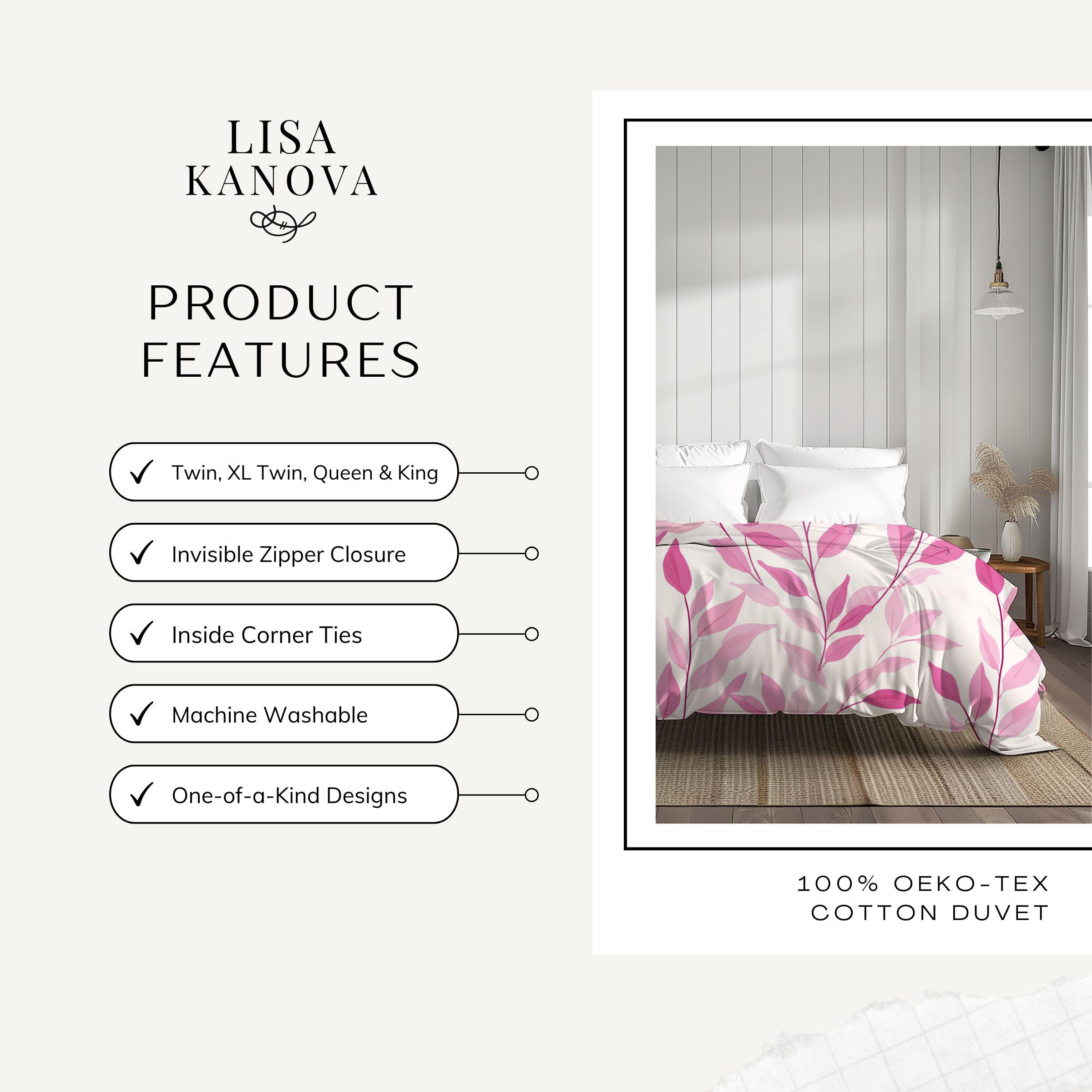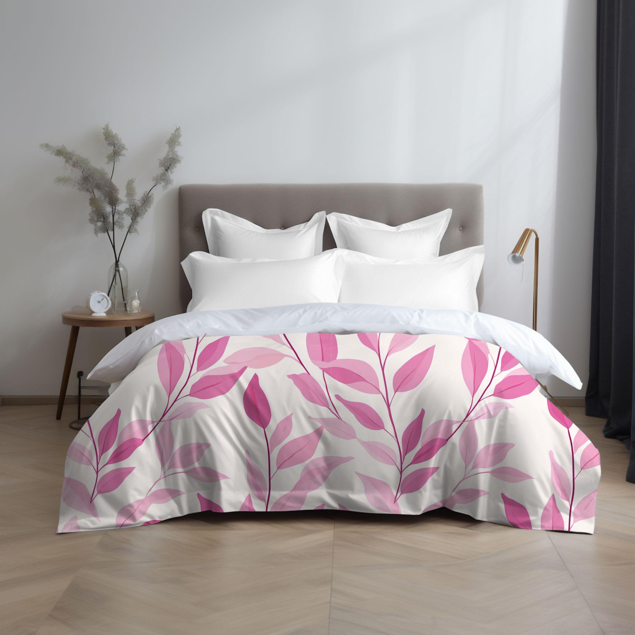 Soft, breathable cotton leaves the day behind. This duvet cover wraps your bed in gentle pink foliage—blush and berry leaves that drift across a clean, white field. It tucks in neatly with an invisible zipper and inside corner ties that hold your insert steady through restless nights. The direct-to-fabric print stays vivid and soft to the touch, wash after wash, so the color feels fresh every morning. Lightweight yet substantial, it brings a calm, uplifted mood to a sunlit bedroom or a cozy studio nook.