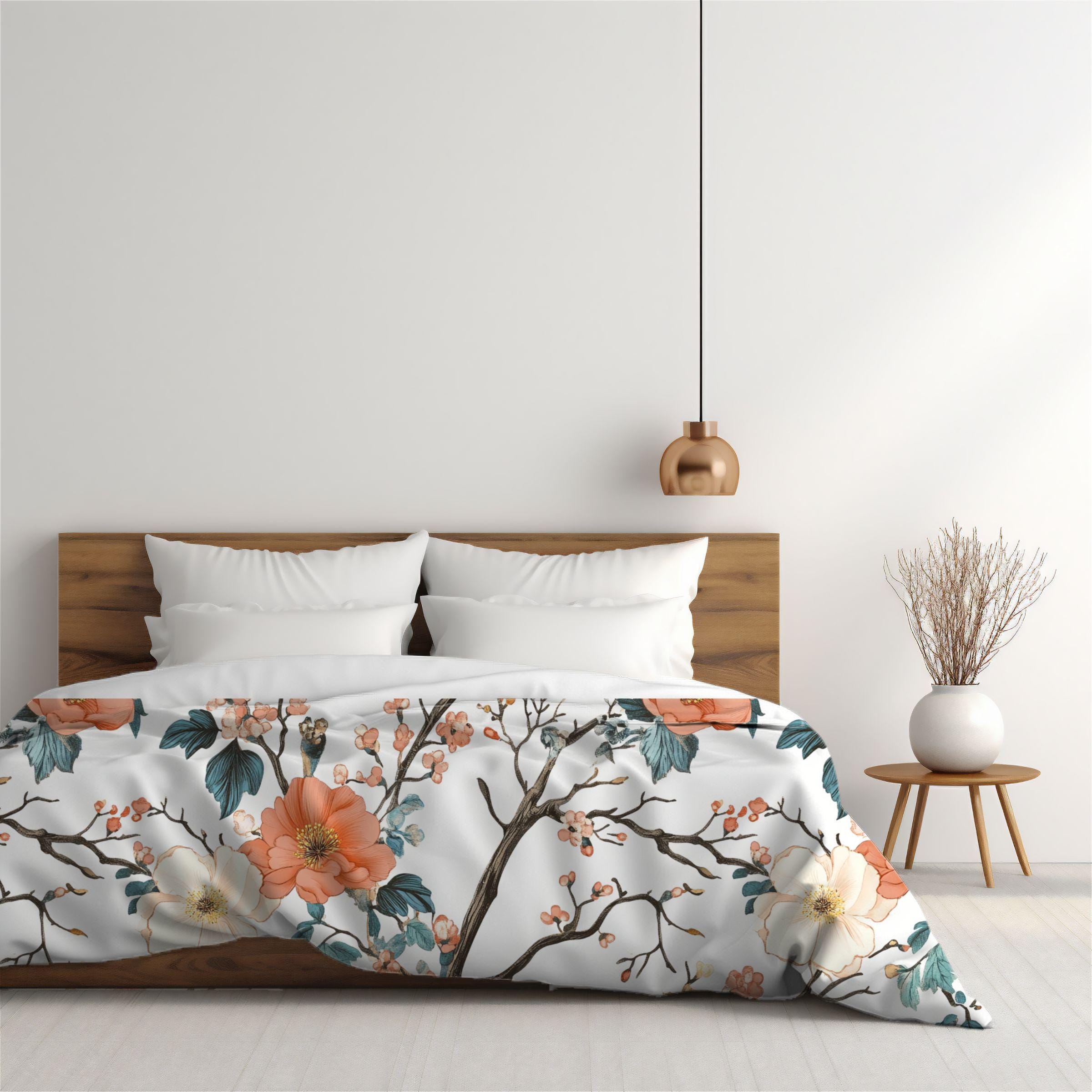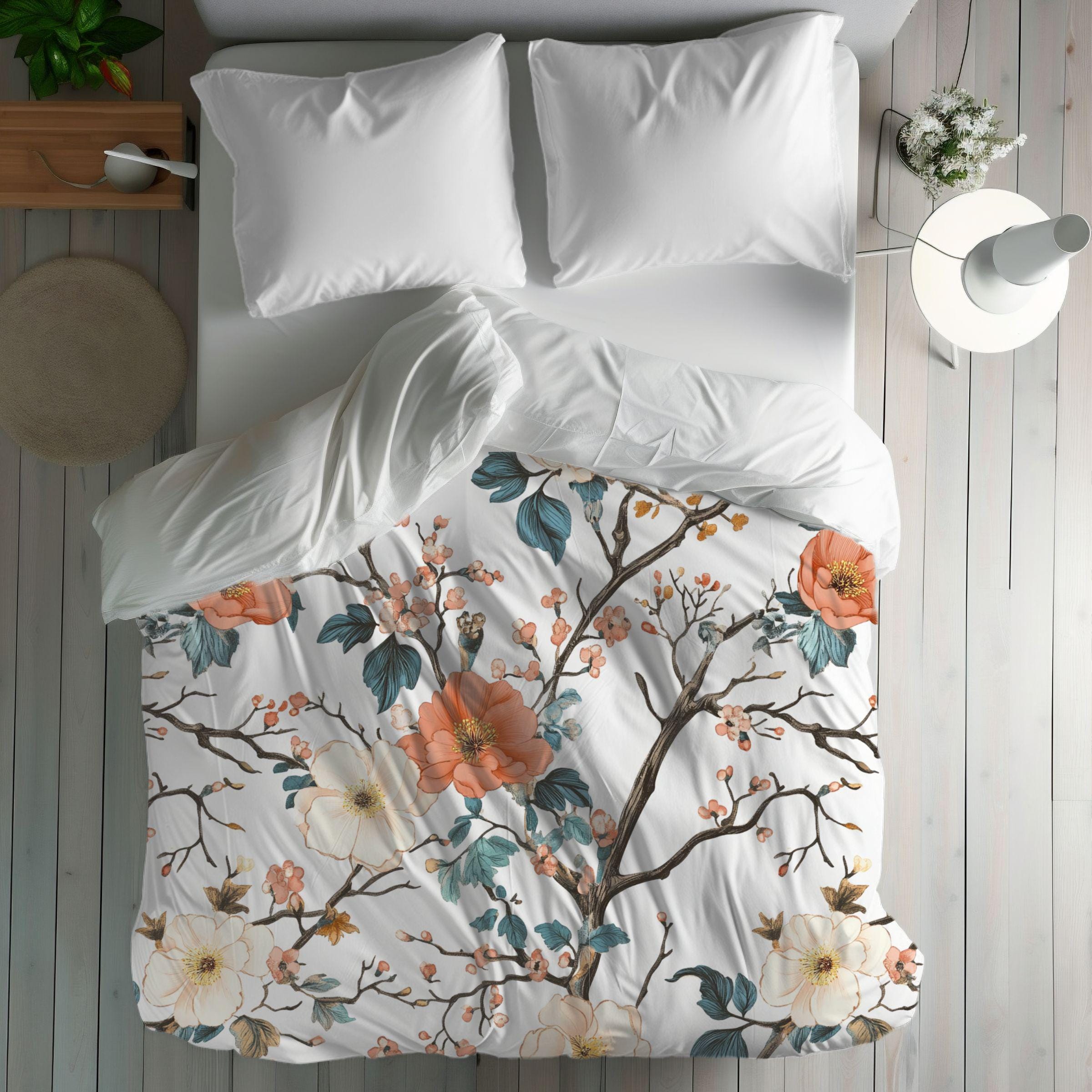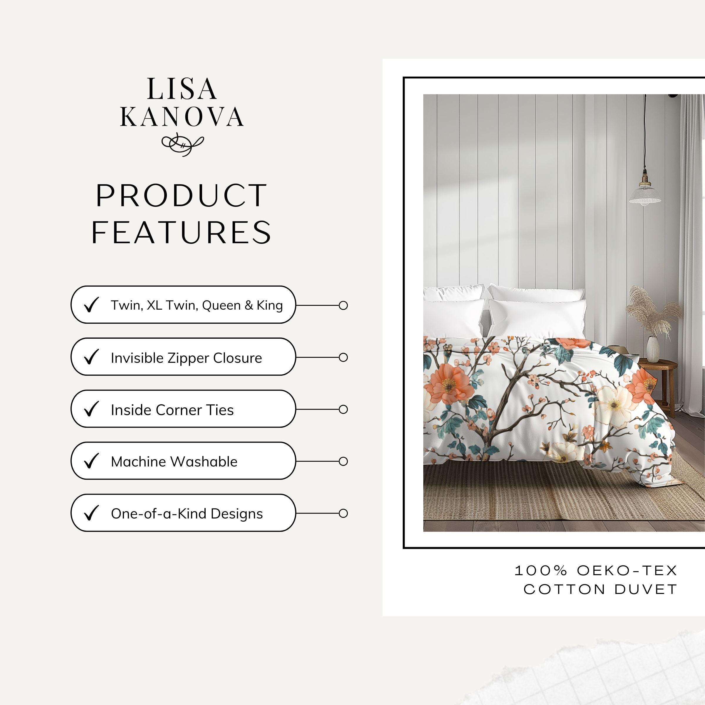 Light, breathable, and quietly elegant — this cotton duvet cover wraps your bed in a painterly bloom of soft apricot and cream flowers on slender branches. The print sits close to the fabric for a smooth, lived-in look that deepens with time, while the invisible zipper and inside corner ties keep your insert neatly in place. It settles into calm, sunlit bedrooms and pairs easily with natural linens and wicker accents. Bring a gentle, botanical rhythm to slower mornings and cozy afternoons spent reading, stretching, or simply enjoying filtered light through curtains.