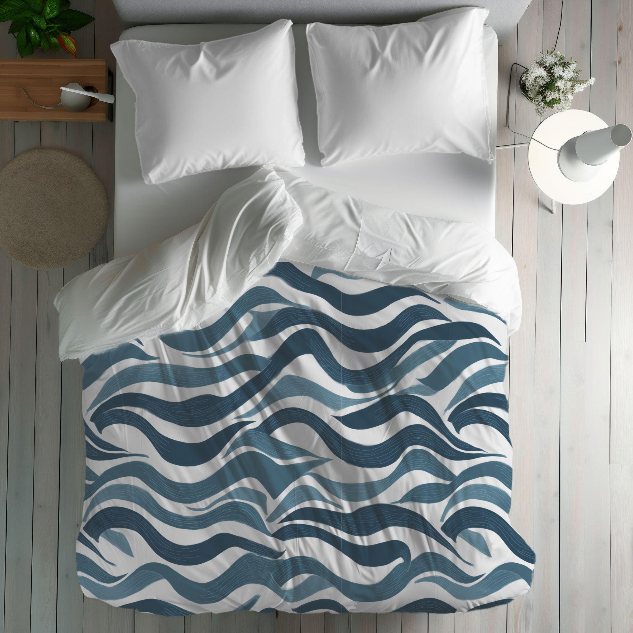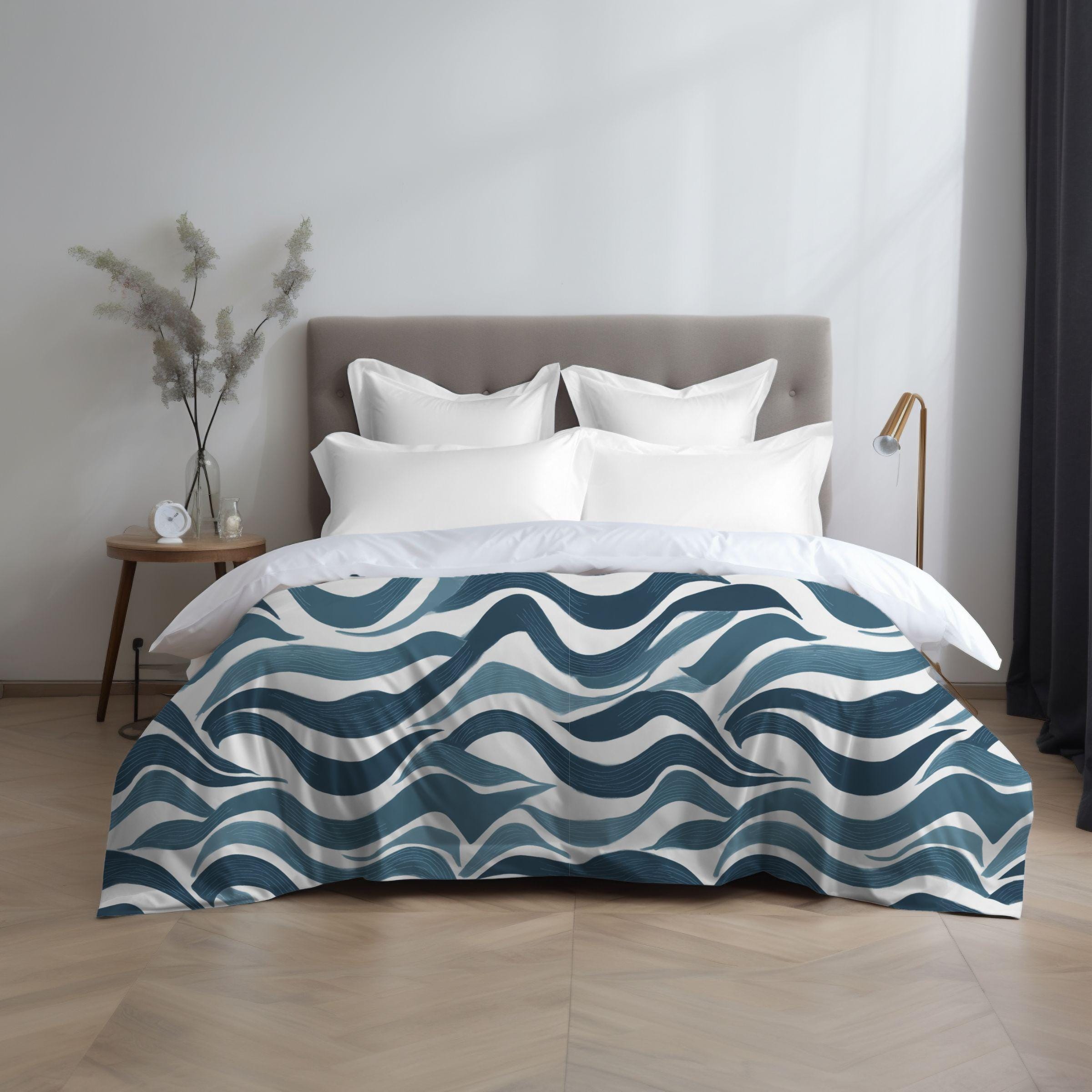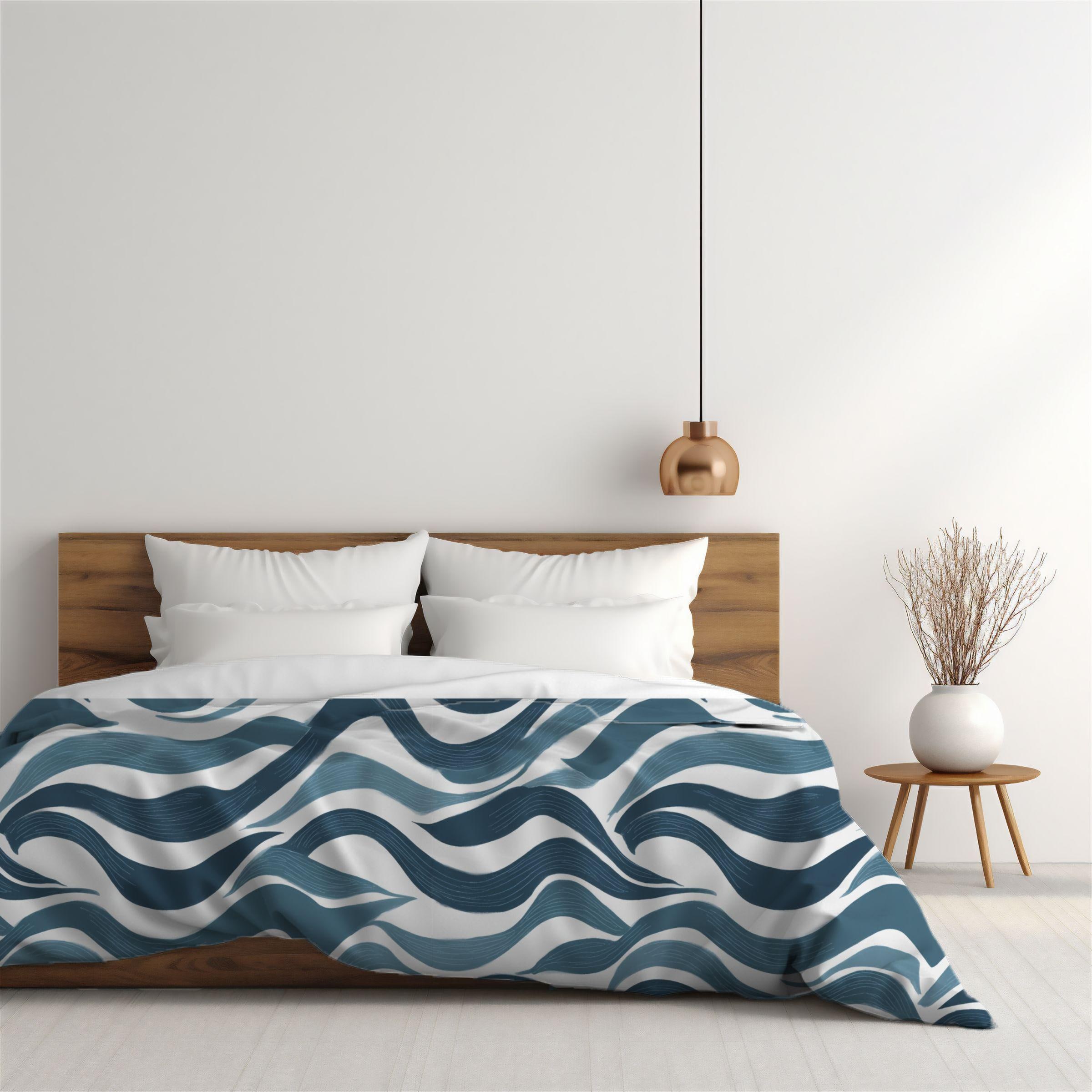 A soft, breathable cotton duvet cover printed with an undulating, hand-drawn wave pattern in layered indigo and slate blues. The design brings a calm, coastal energy without feeling literal — like the hush of tides or a slow, meditative breath across your bed. Lightweight and breathable, the cotton keeps sleep cool and relaxed while the direct-to-fabric printing preserves the painterly texture and color depth. Hidden zipper closure and inside corner ties make swapping inserts effortless and neat. This cover suits a minimalist bedroom or a cozy studio where serene, contemporary patterns set a restful tone for slow mornings and quiet evenings.