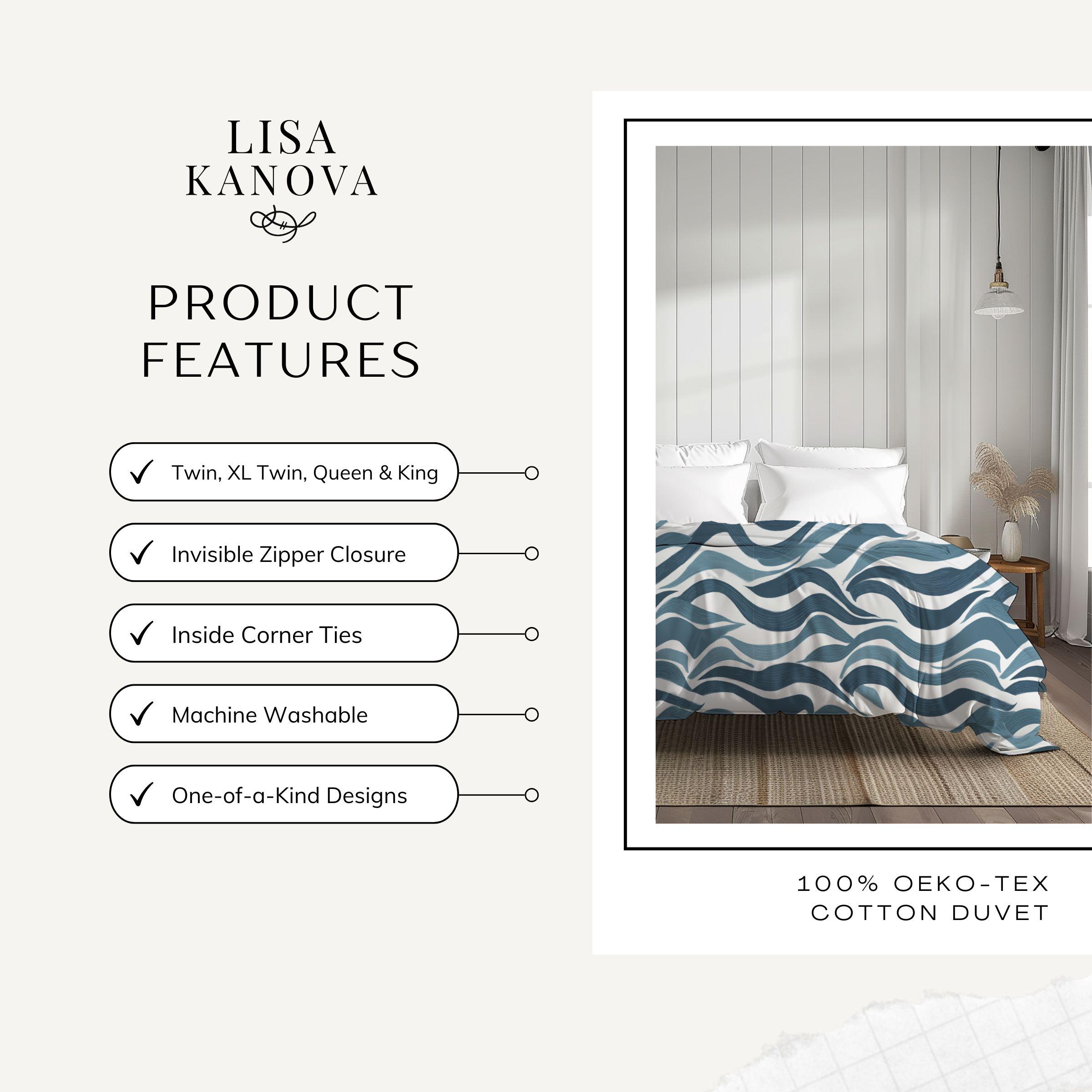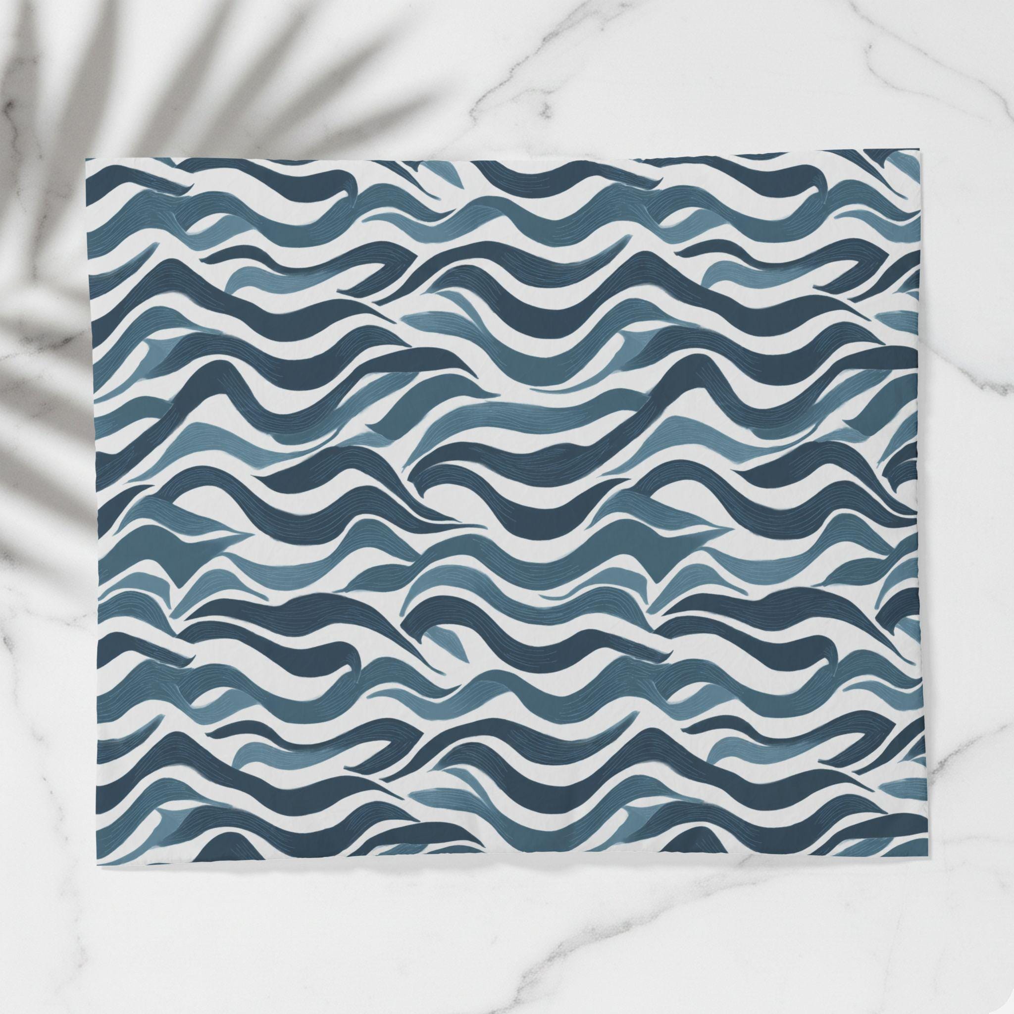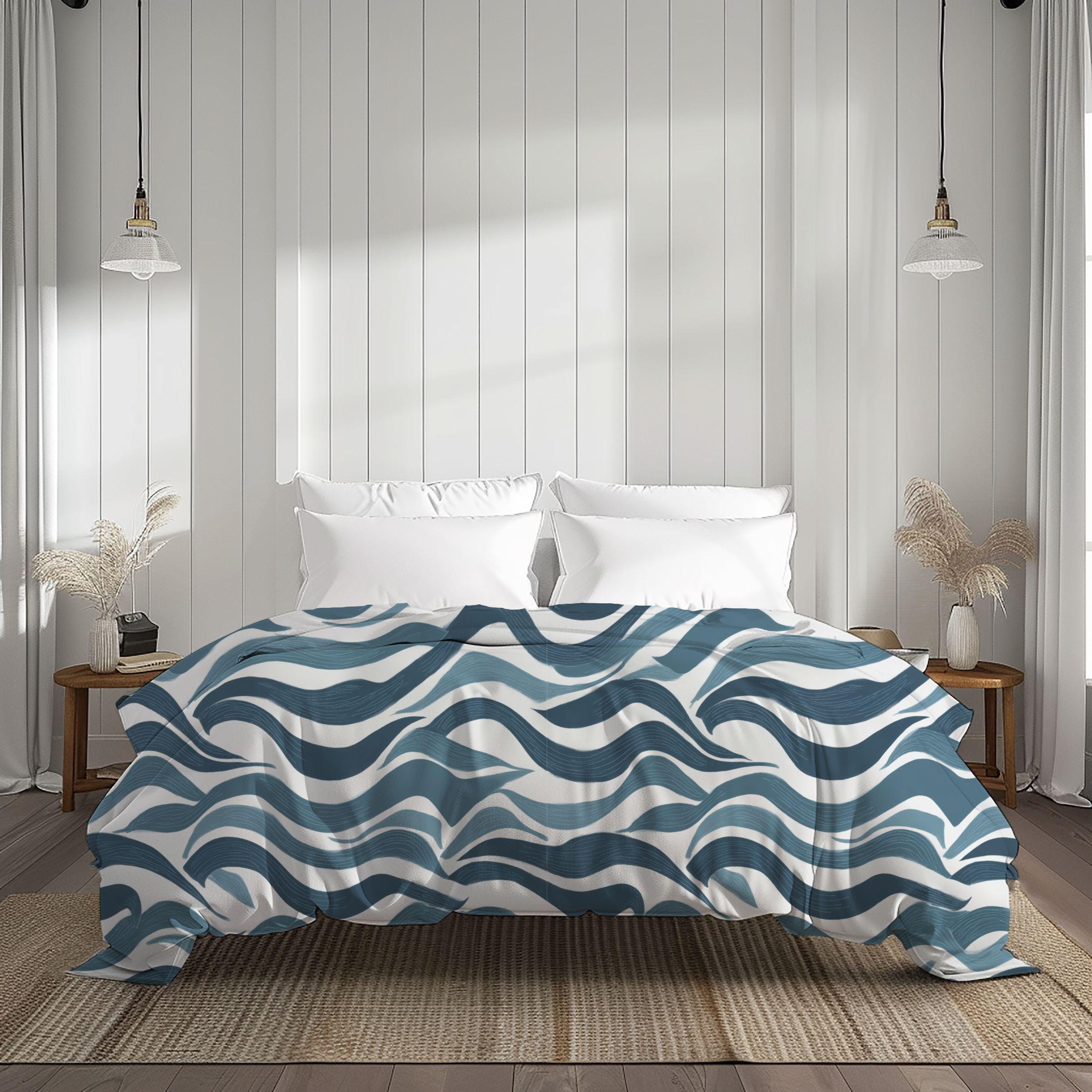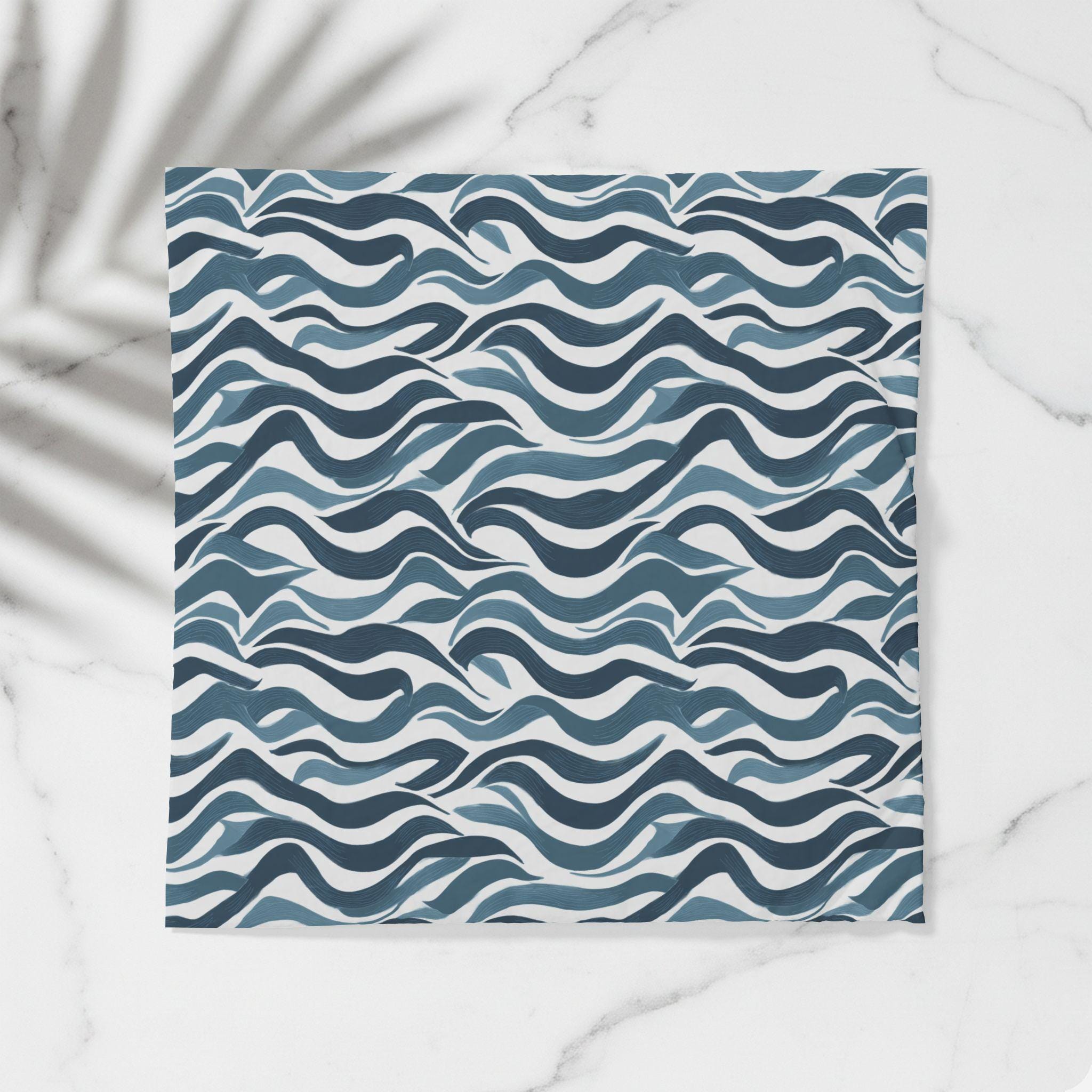 A soft, breathable cotton duvet cover printed with an undulating, hand-drawn wave pattern in layered indigo and slate blues. The design brings a calm, coastal energy without feeling literal — like the hush of tides or a slow, meditative breath across your bed. Lightweight and breathable, the cotton keeps sleep cool and relaxed while the direct-to-fabric printing preserves the painterly texture and color depth. Hidden zipper closure and inside corner ties make swapping inserts effortless and neat. This cover suits a minimalist bedroom or a cozy studio where serene, contemporary patterns set a restful tone for slow mornings and quiet evenings.
