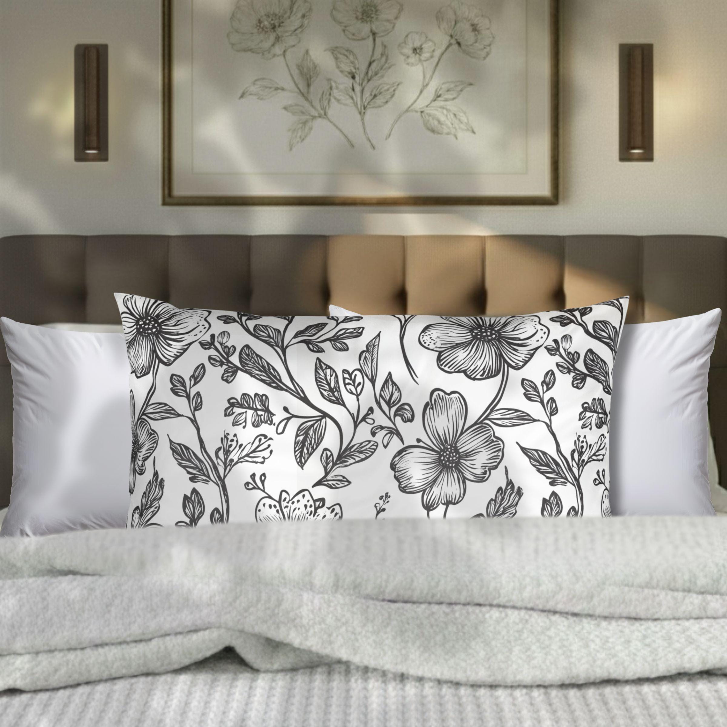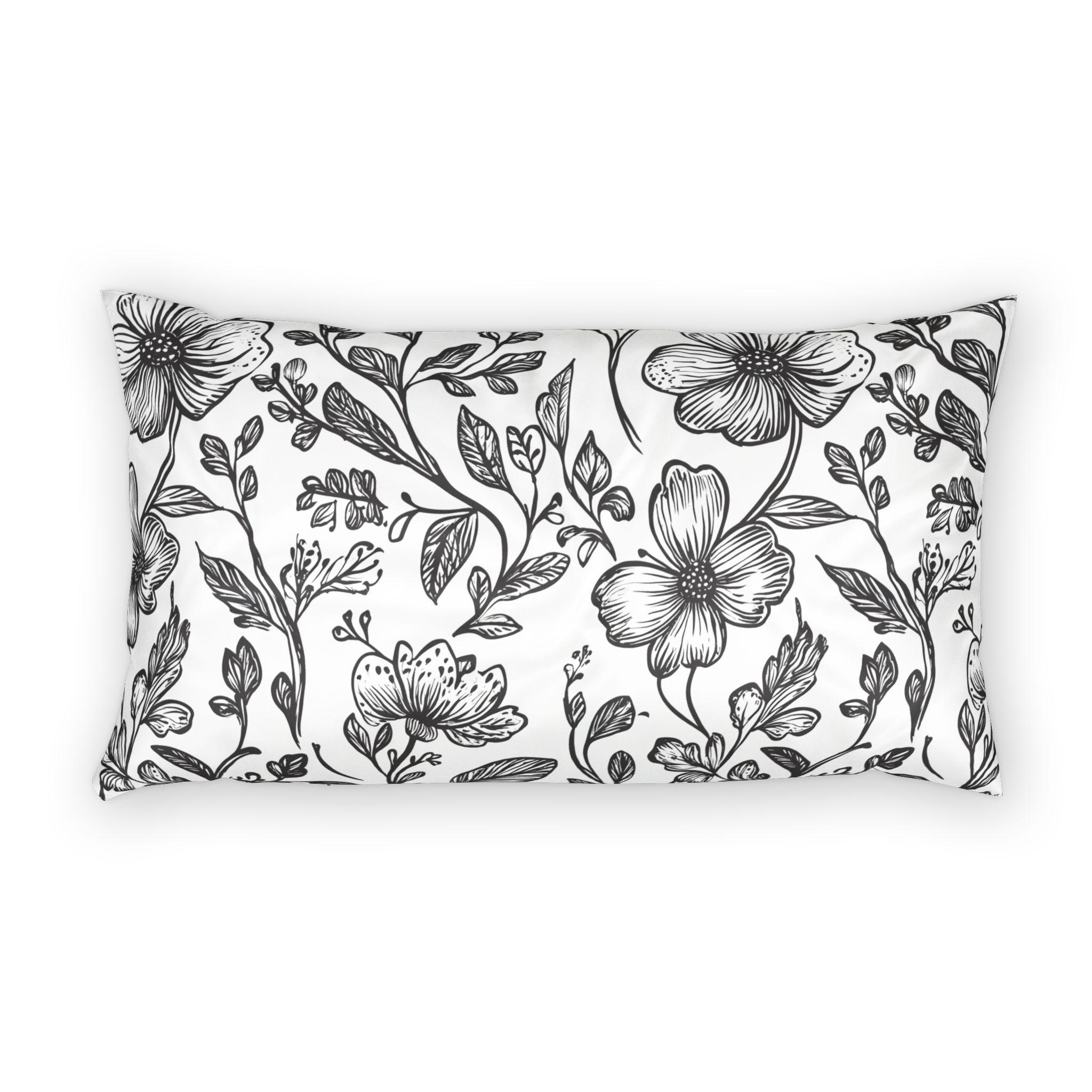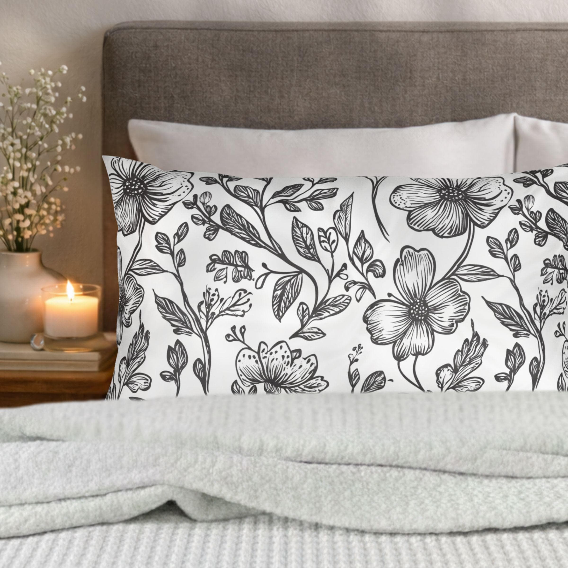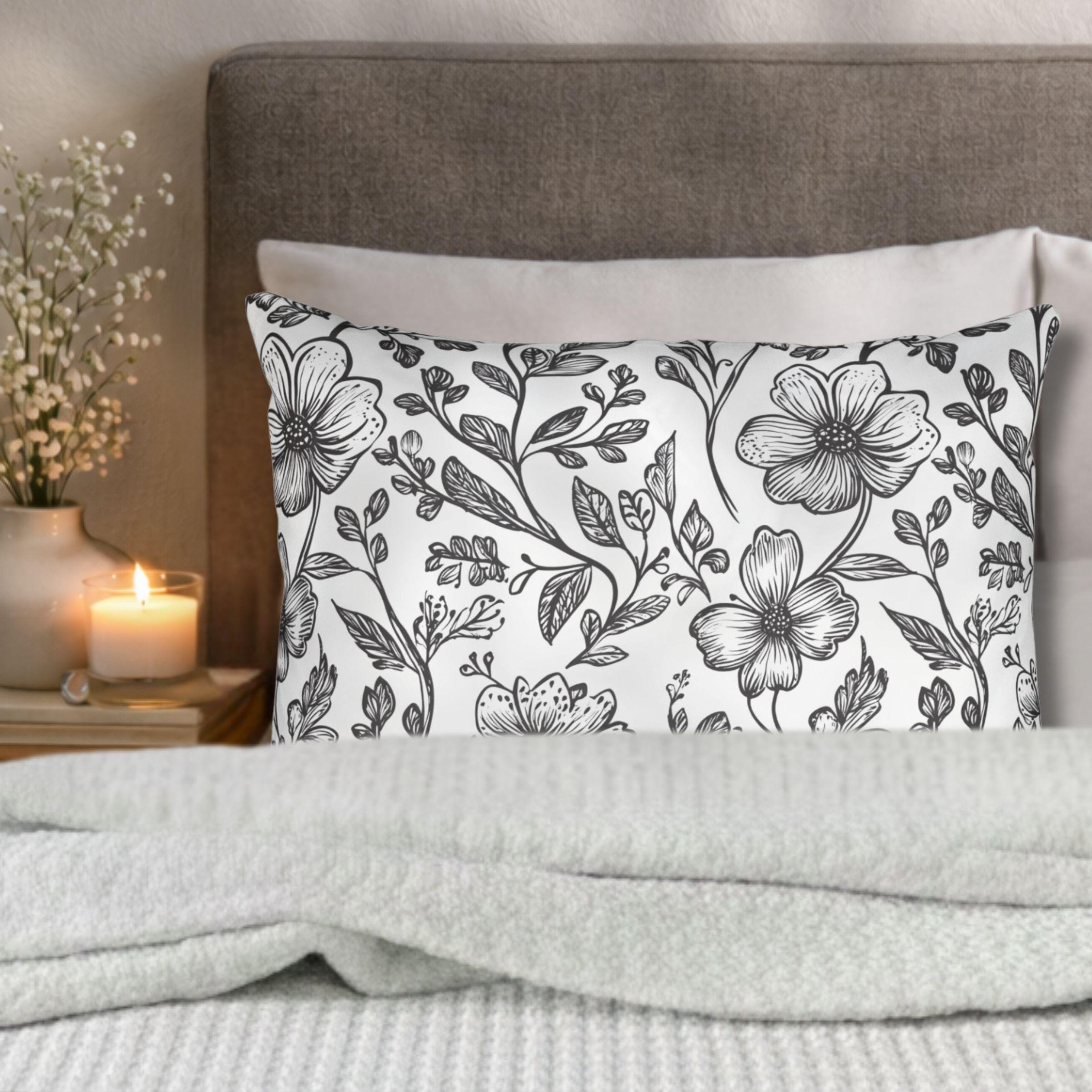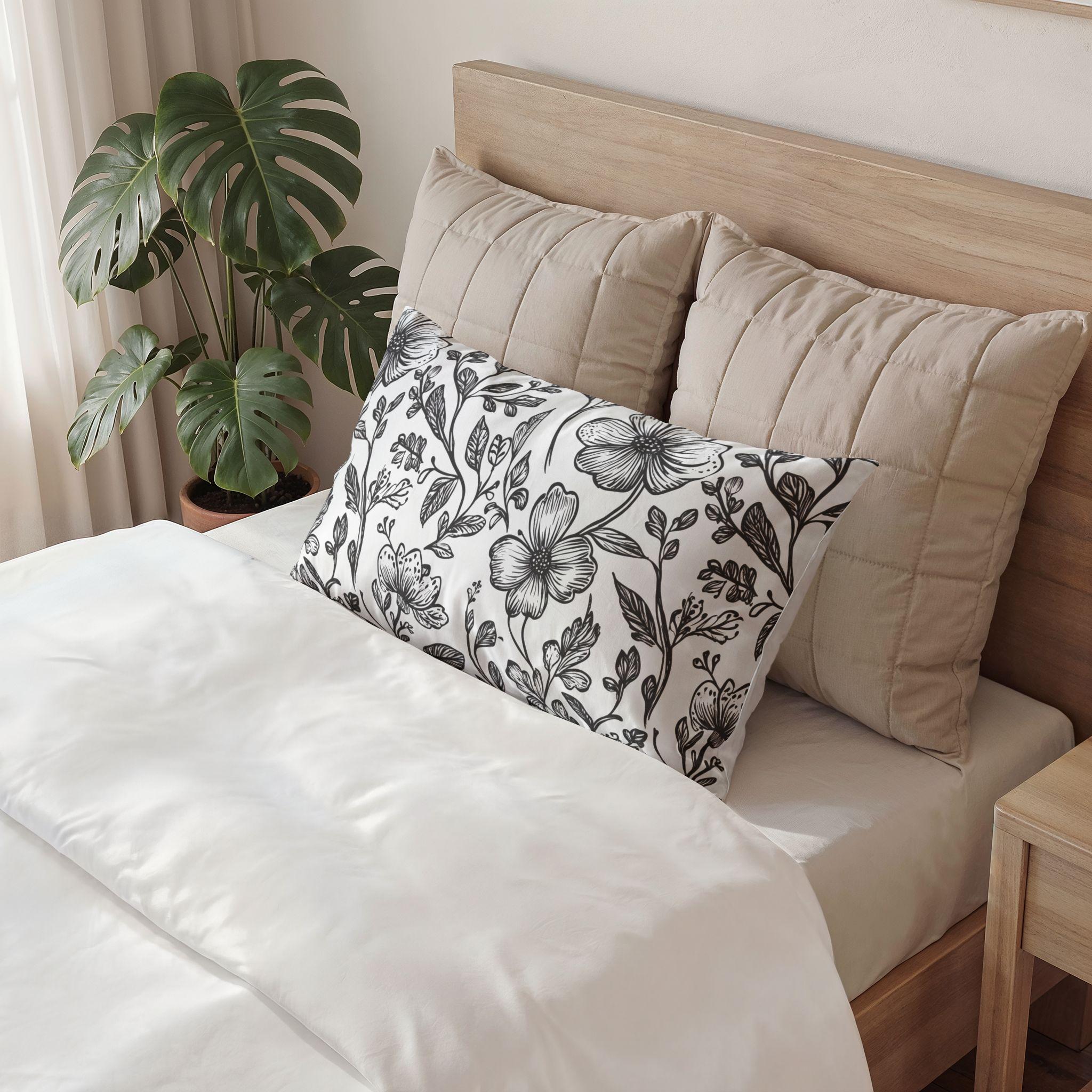 Hand‑drawn blooms and wandering vines come together on a soft, breathable cotton sham that brings a quiet, botanical elegance to your bedroom or reading nook. The monochrome floral sketching feels like pages from a nature journal—delicate lines, shaded petals, and airy negative space that let the pattern breathe. It slips over your pillow easily and lays smooth, so the design reads beautifully on a dresser, daybed, or guest room arrangement. This sham suits people who favor calm, natural decor and handcrafted details; it pairs naturally with linen throws, woven textures, and warm wood tones. Use it to add a layer of thoughtful pattern for spring refreshes, slow weekend mornings, or when you want your space to feel gently curated and lived‑in.