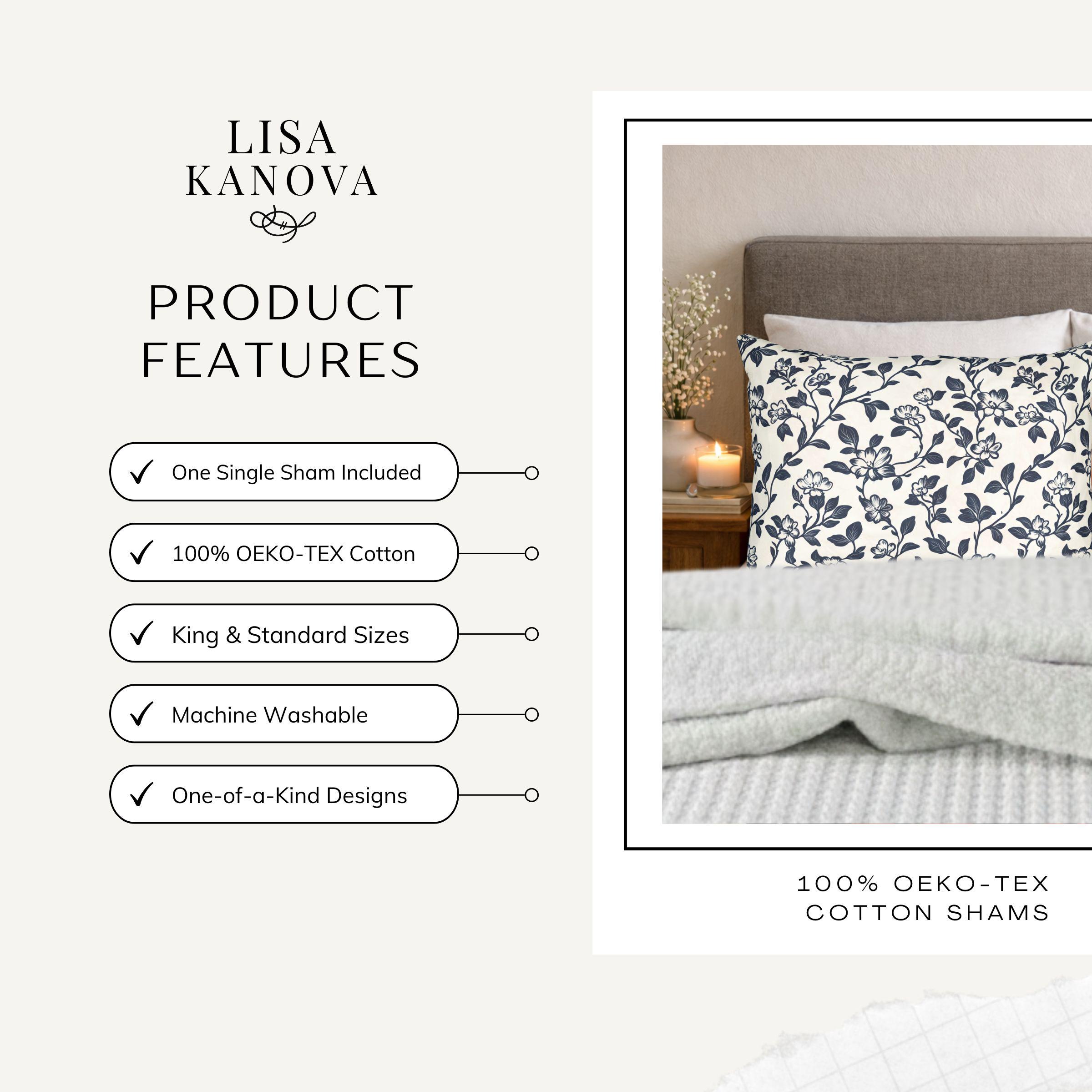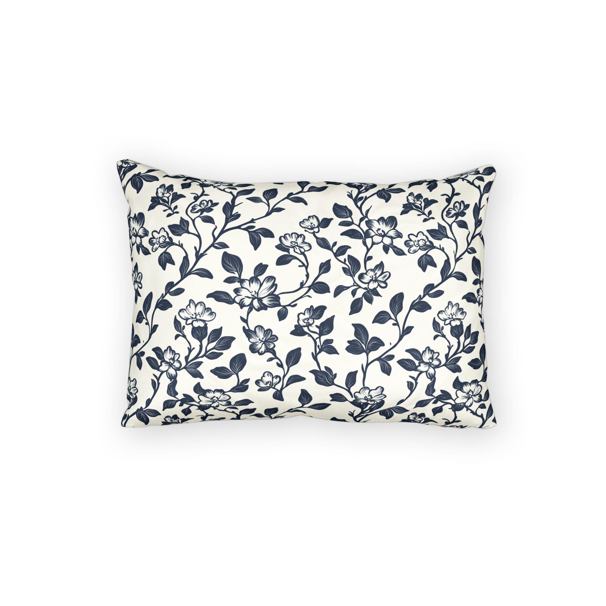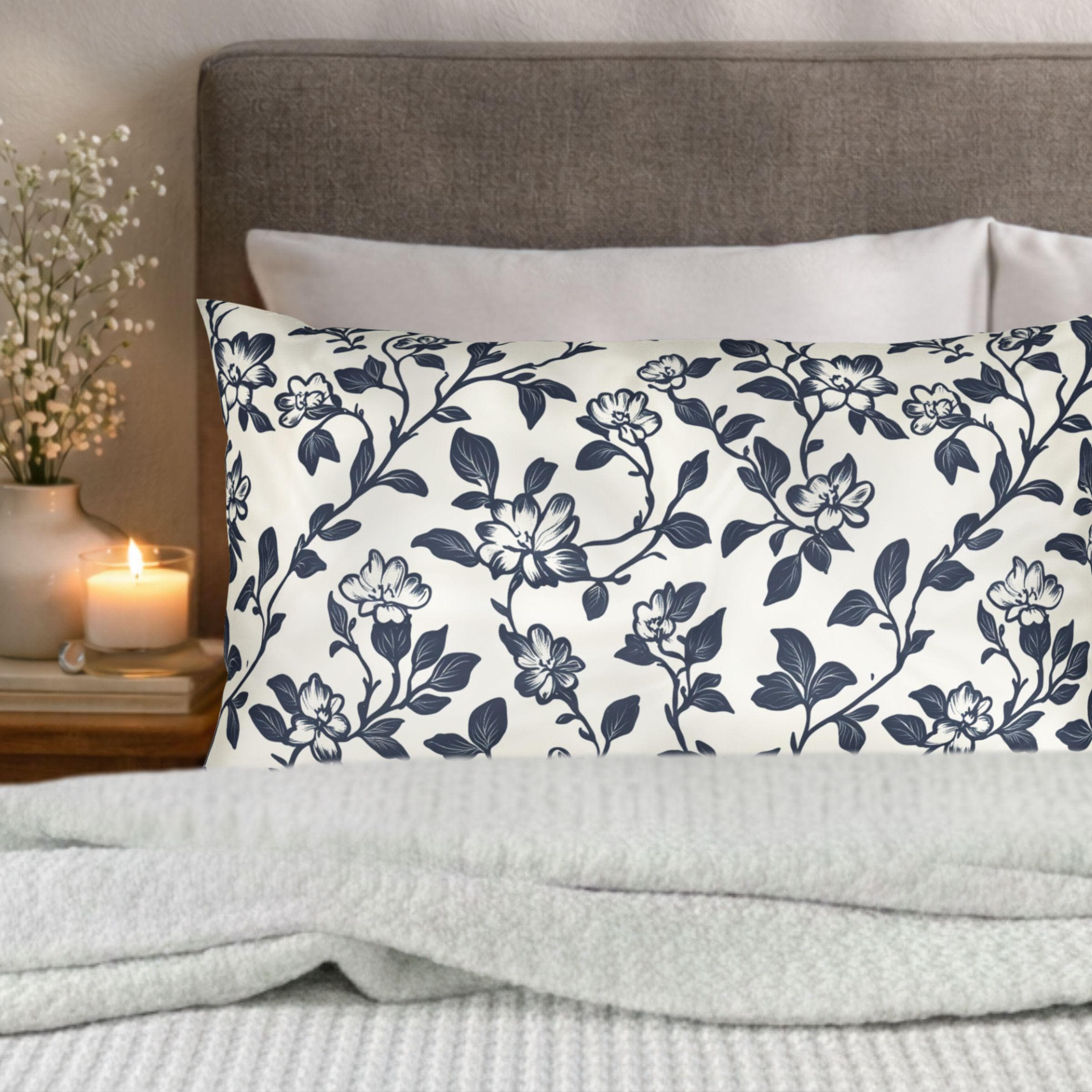 Bring a quiet, lived-in elegance to your sofa or bed with this breathable cotton pillow sham. The soft, tightly spun fibers hold detailed prints beautifully, so the delicate navy floral comes through crisp against the clean white background. It settles into a relaxed, cottage-core or coastal-inspired room with subtle charm — the kind of piece you notice after a long day when you want something calm to lean against. Lightweight and natural-feeling, the sham layers easily with textured throws and linen cushions for cozy evenings, slow mornings, and laid-back gatherings where comfort matters more than formality.