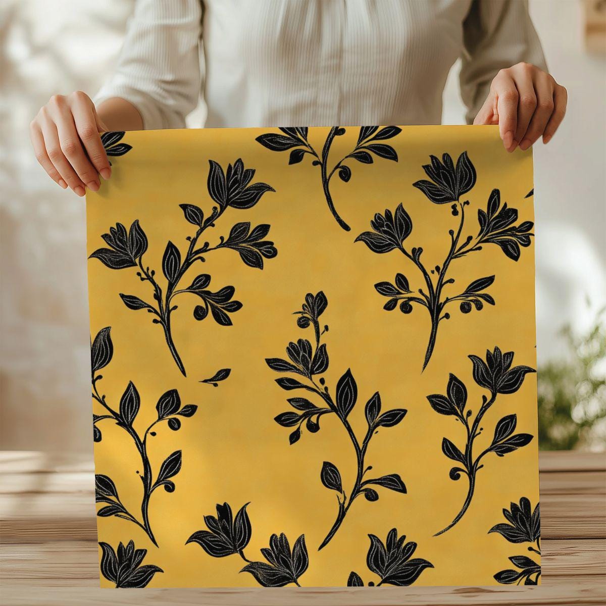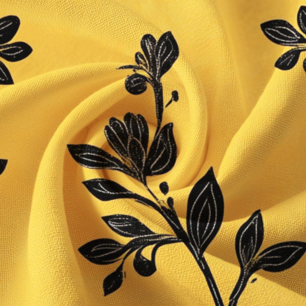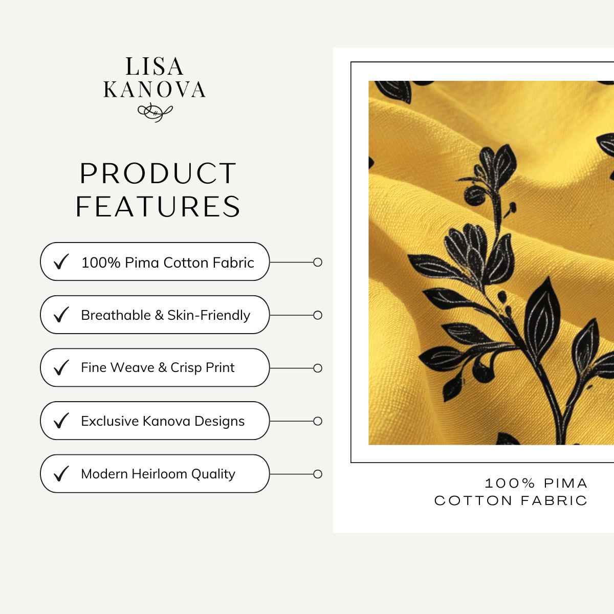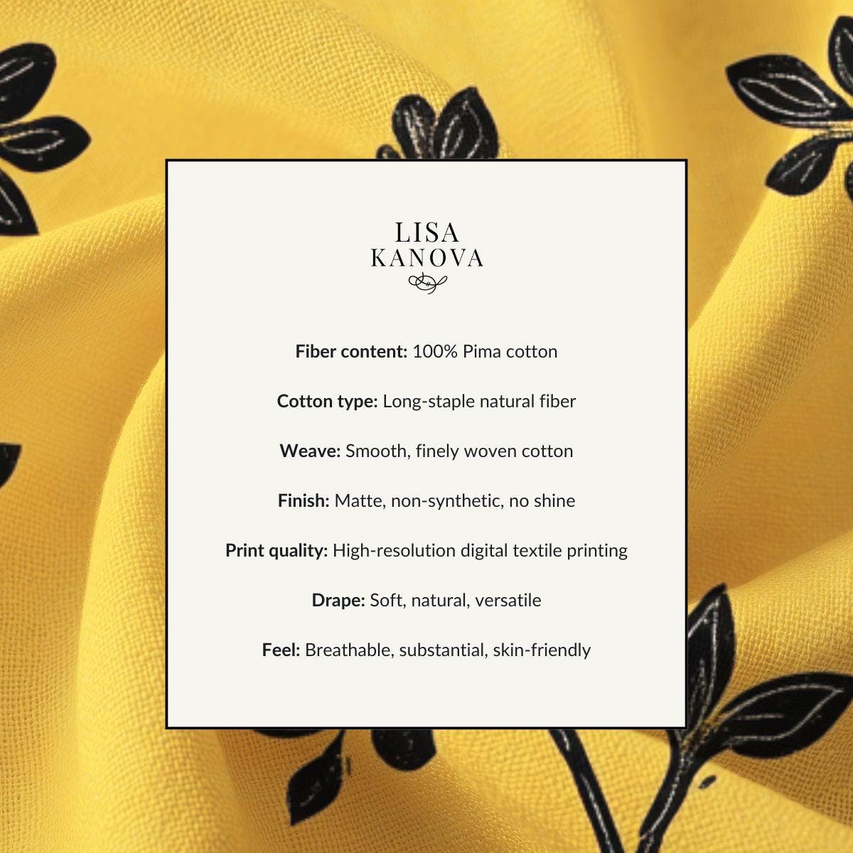 Sunlit, hand-drawn sprigs unfurl across a warm golden field—this soft Pima cotton piece feels like wrapping yourself in a late-afternoon glow. The fine, long-staple fibers give a silky touch against skin while the bold black botanical silhouettes add a modern, artful contrast. Wear it on slow weekend mornings, layer it for cool evening strolls, or tuck it into your travel bag as a reliable, breathable companion. It settles into everyday life without shouting, bringing a quiet, crafted elegance to routines and small celebrations alike.
