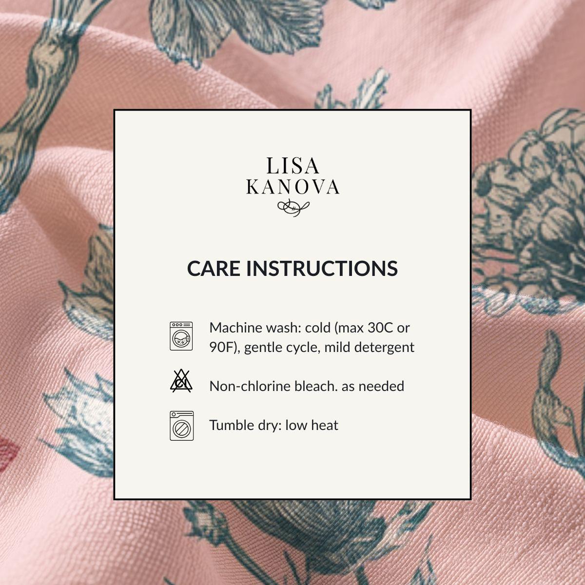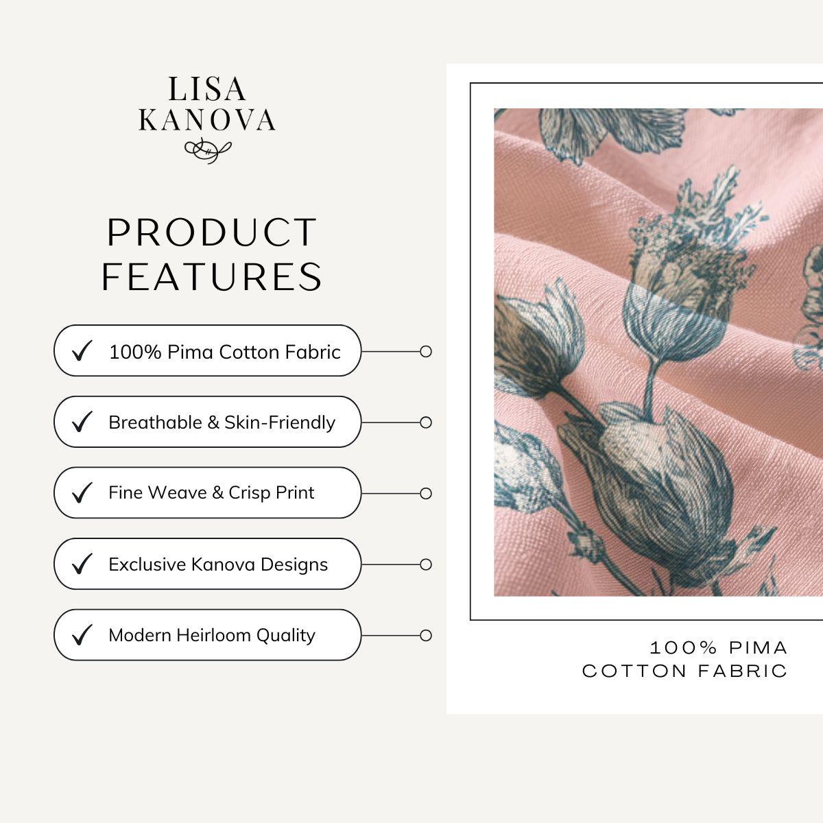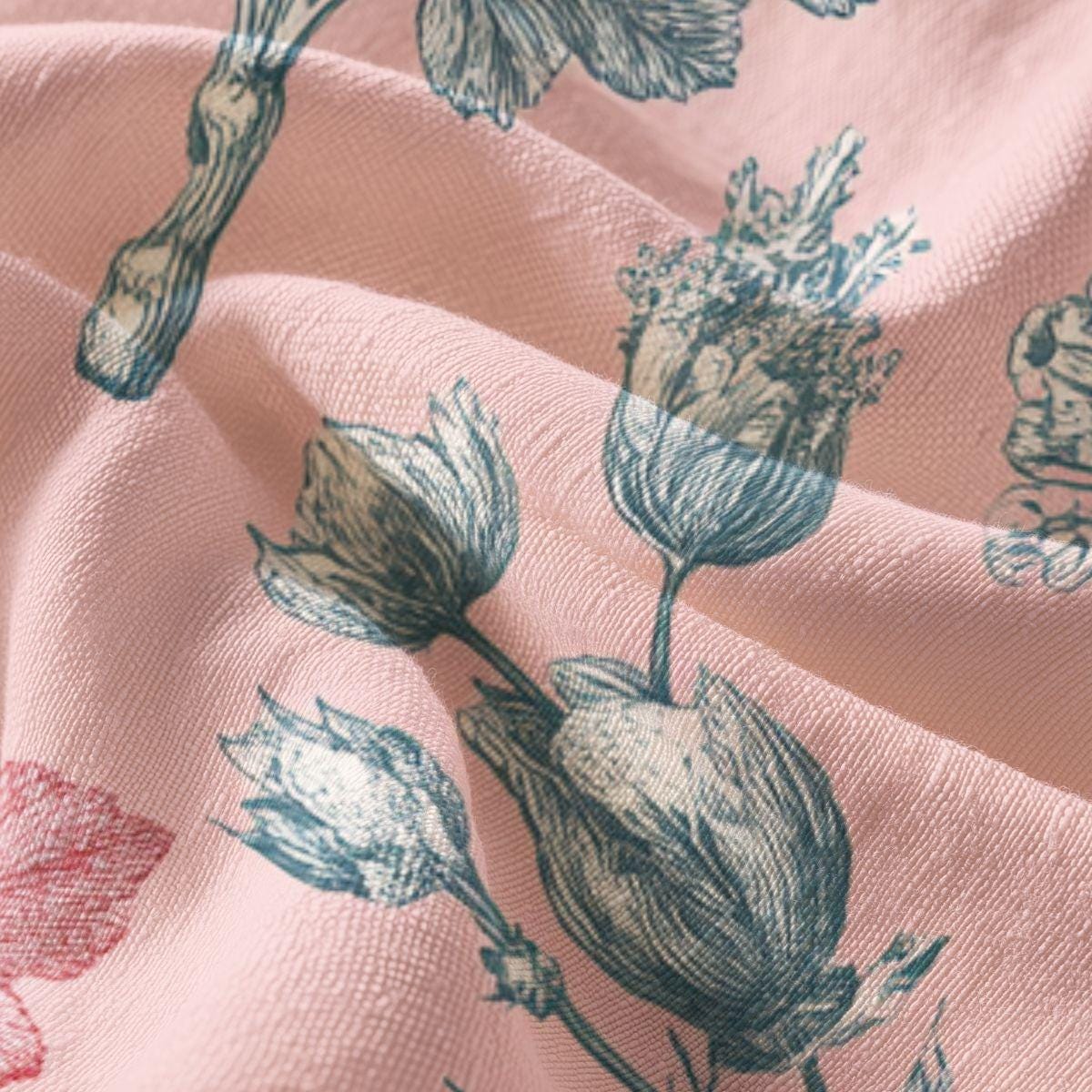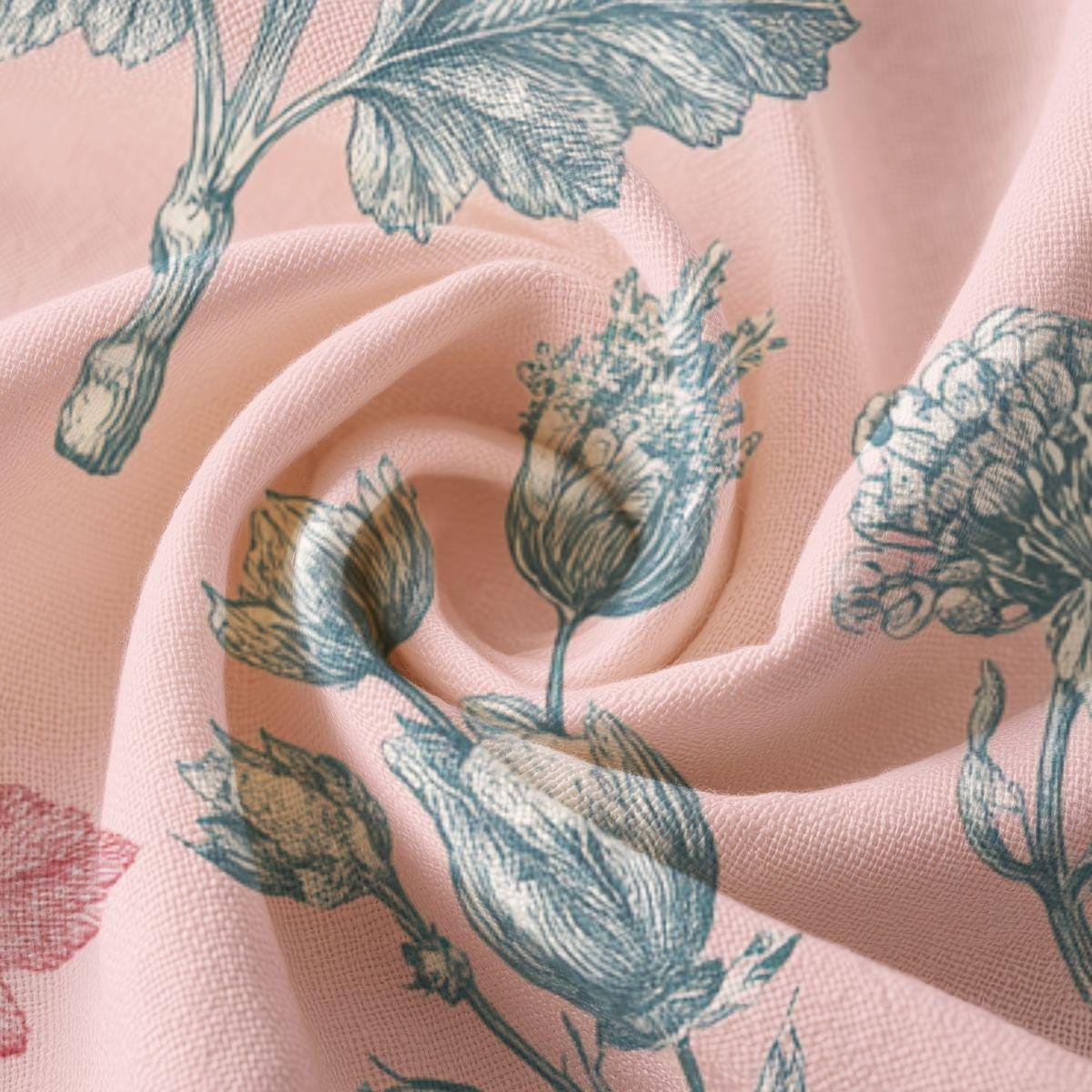 Soft, breathable fabric with a gentle vintage botanical print that settles like a whisper against the skin. The combed Pima cotton has a satiny hand and lightweight drape, making it feel like a second-skin during warm mornings or layered evenings. The muted rose-pink background and delicate grey-blue floral etchings evoke a quiet garden stroll—calm, collected, and a little nostalgic. This piece suits someone who values understated elegance and comfort, whether worn at home with tea, carried on a weekend away, or layered for a casual brunch. The printed panels may be cut after printing on certain sizes, giving each item a subtly unique placement of the pattern.