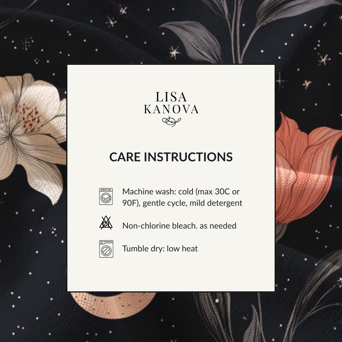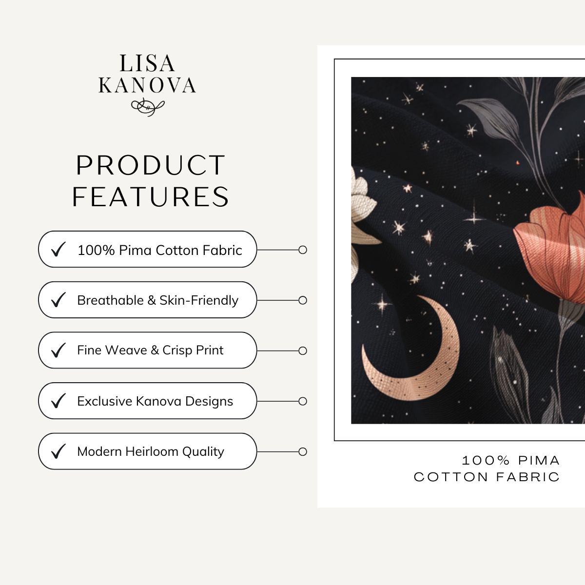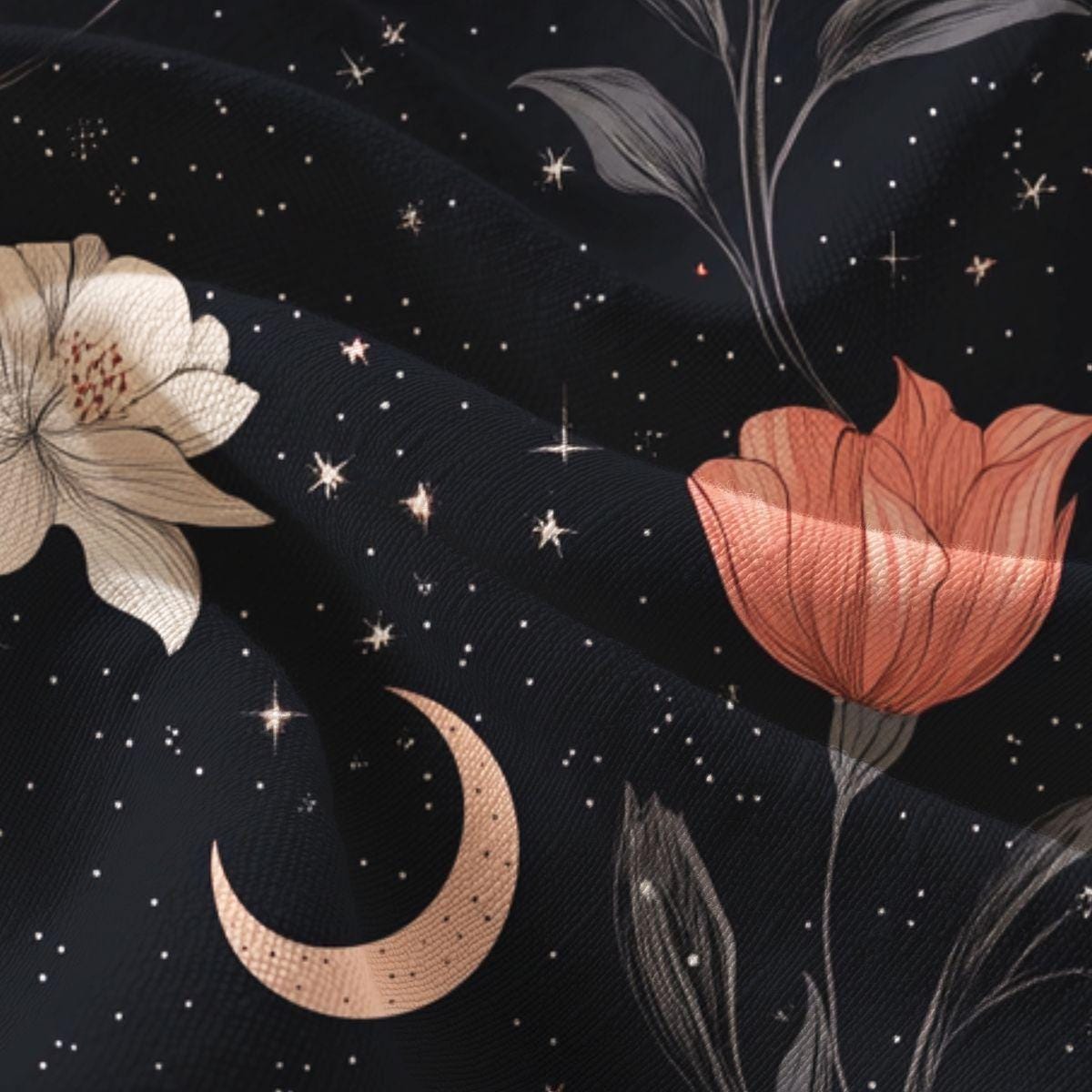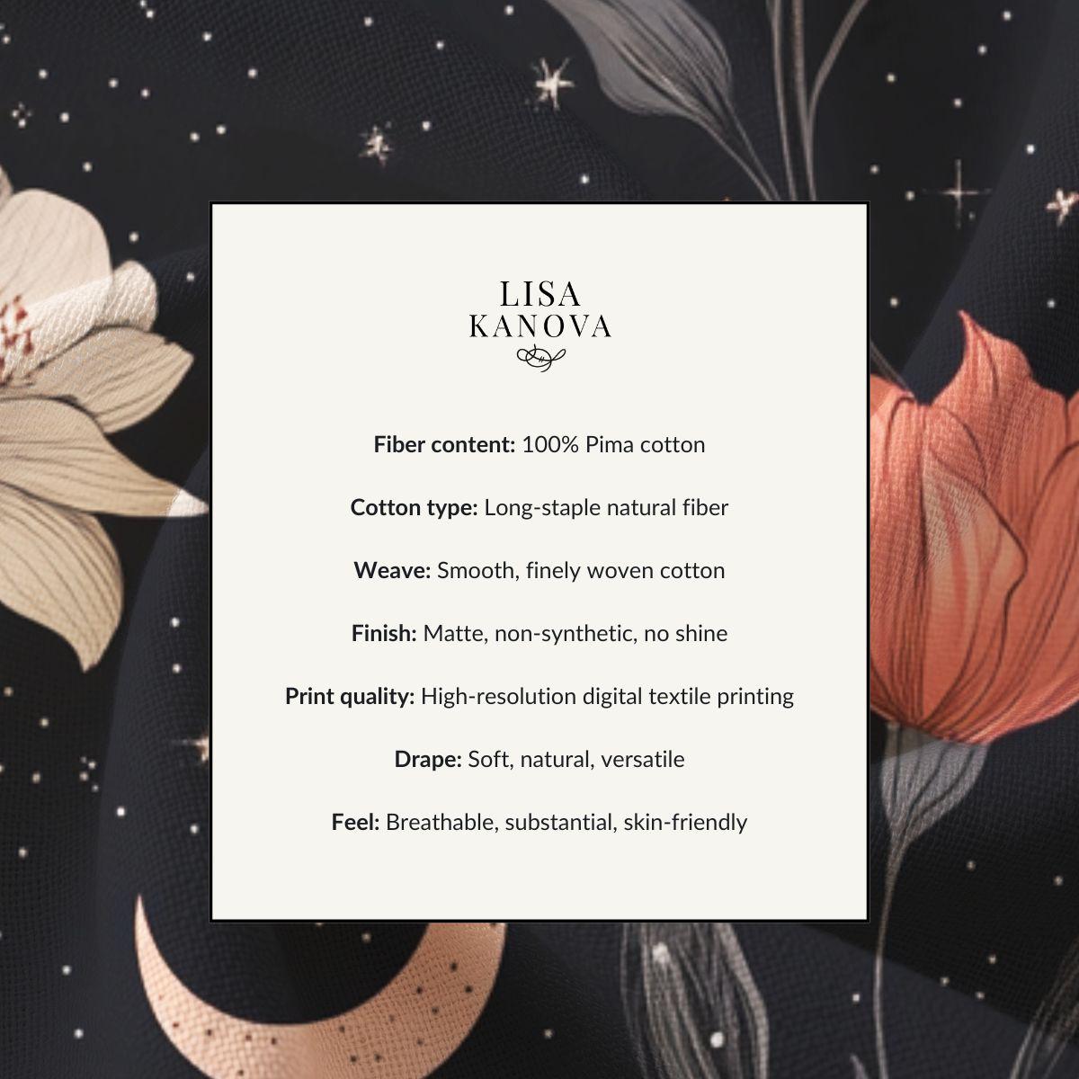 Wrap yourself in a whisper of night-blooming magic. This soft pima cotton piece features a deep, star-speckled background dotted with crescent moons and delicate blossoms in blush and cream. The fabric drapes gently, carrying a quiet, cozy elegance — like stepping into a calm evening garden. Wear or display it when you want to feel grounded and tender: an understated statement that reads as both romantic and thoughtfully modern. The small-scale celestial print blends with organic florals, so it layers beautifully with neutral basics or evening loungewear. Meant for slow mornings, moonlit walks, and cups of tea that stretch into soft conversation.