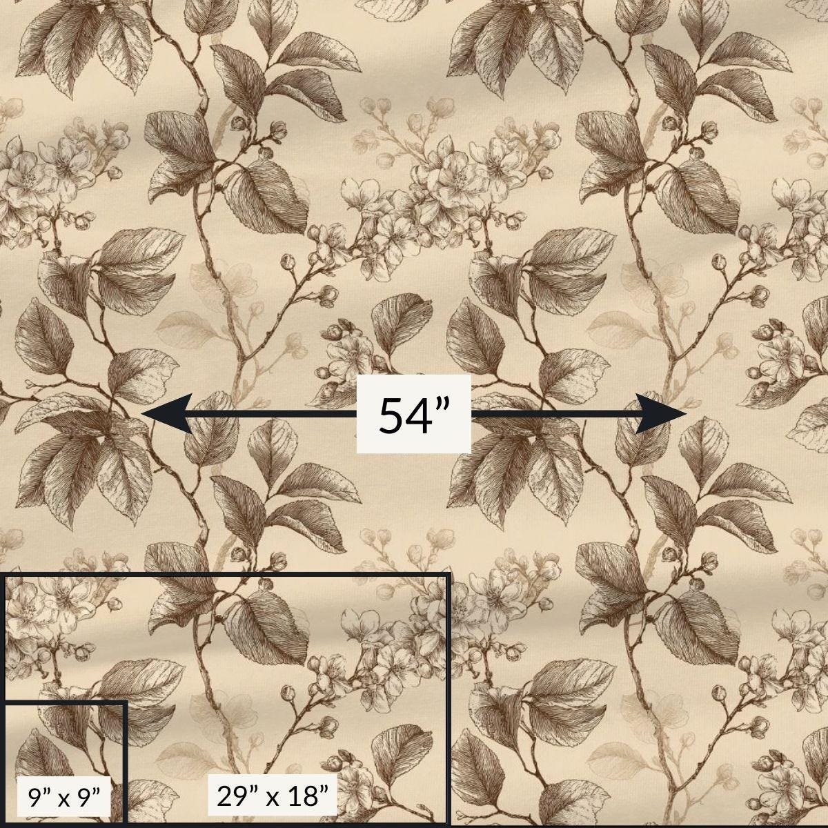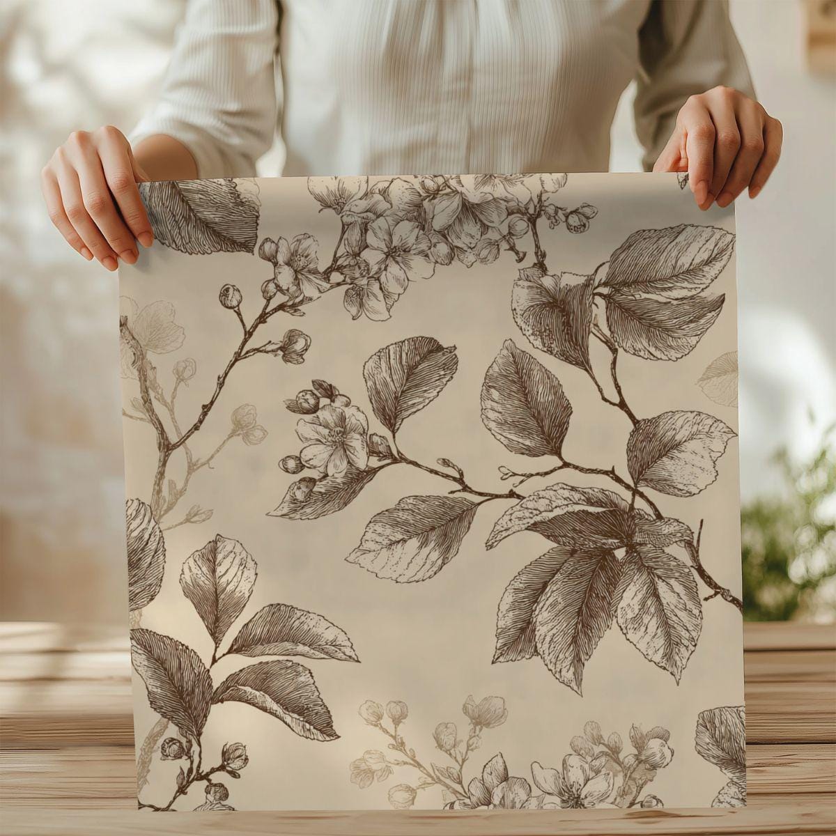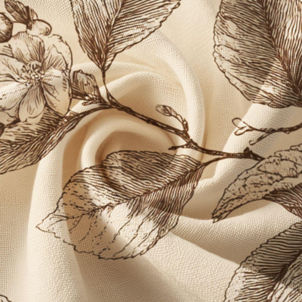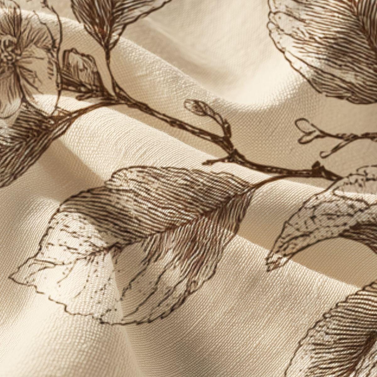 - Delicate sepia botanical print on warm cream background