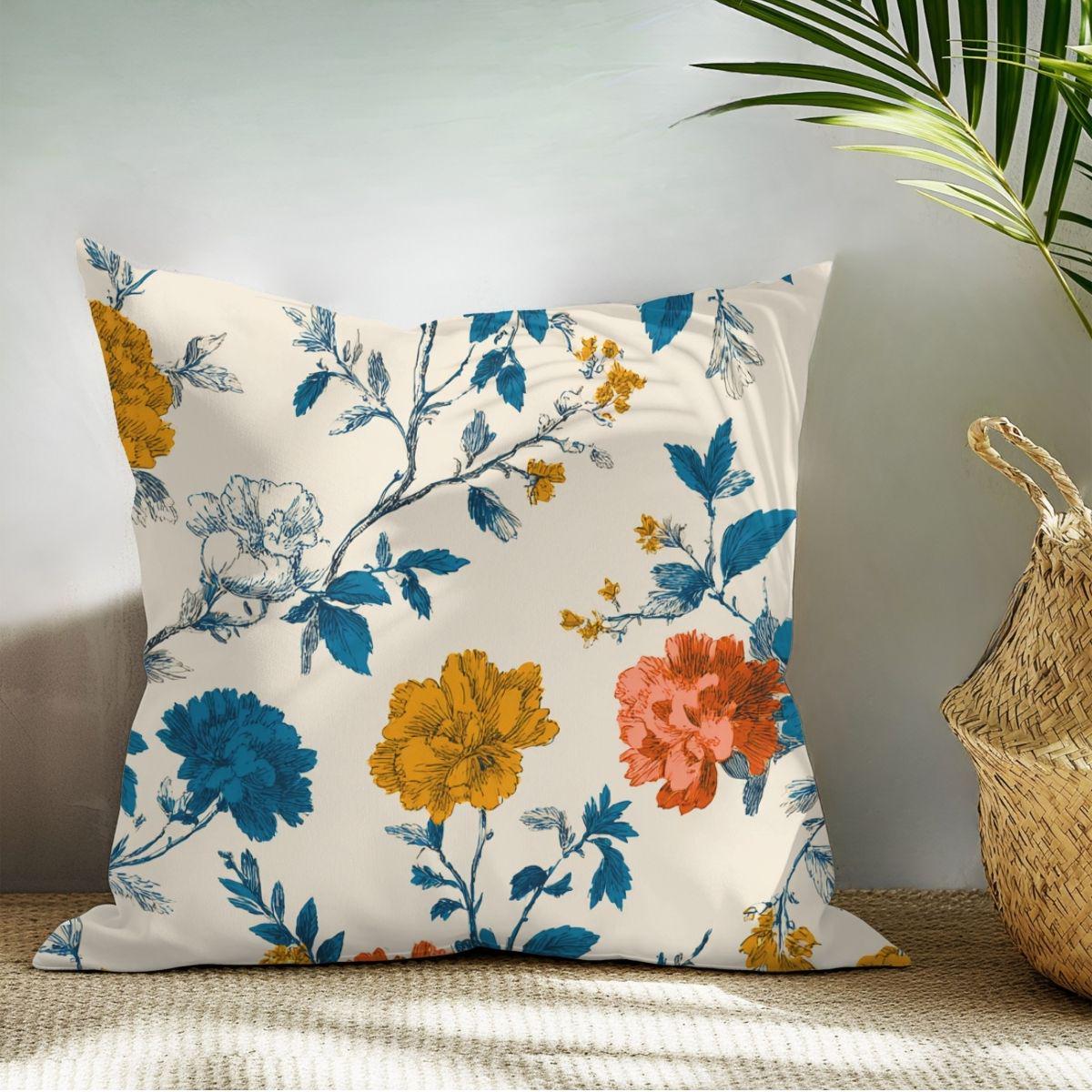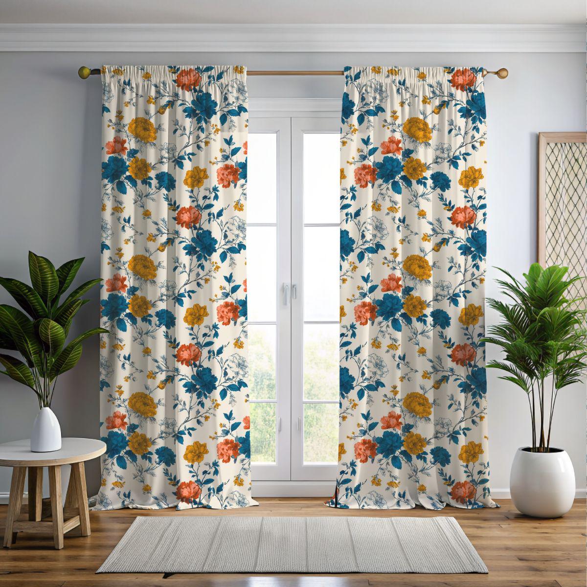 - Painterly floral print with teal, ochre, and coral accents