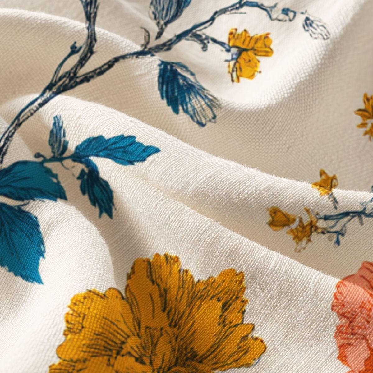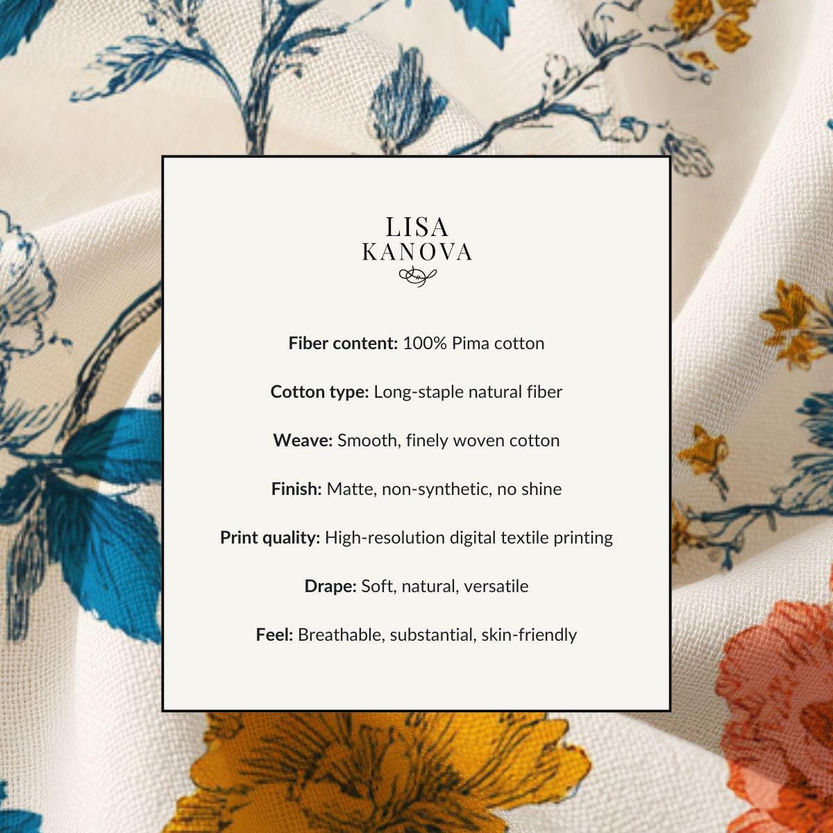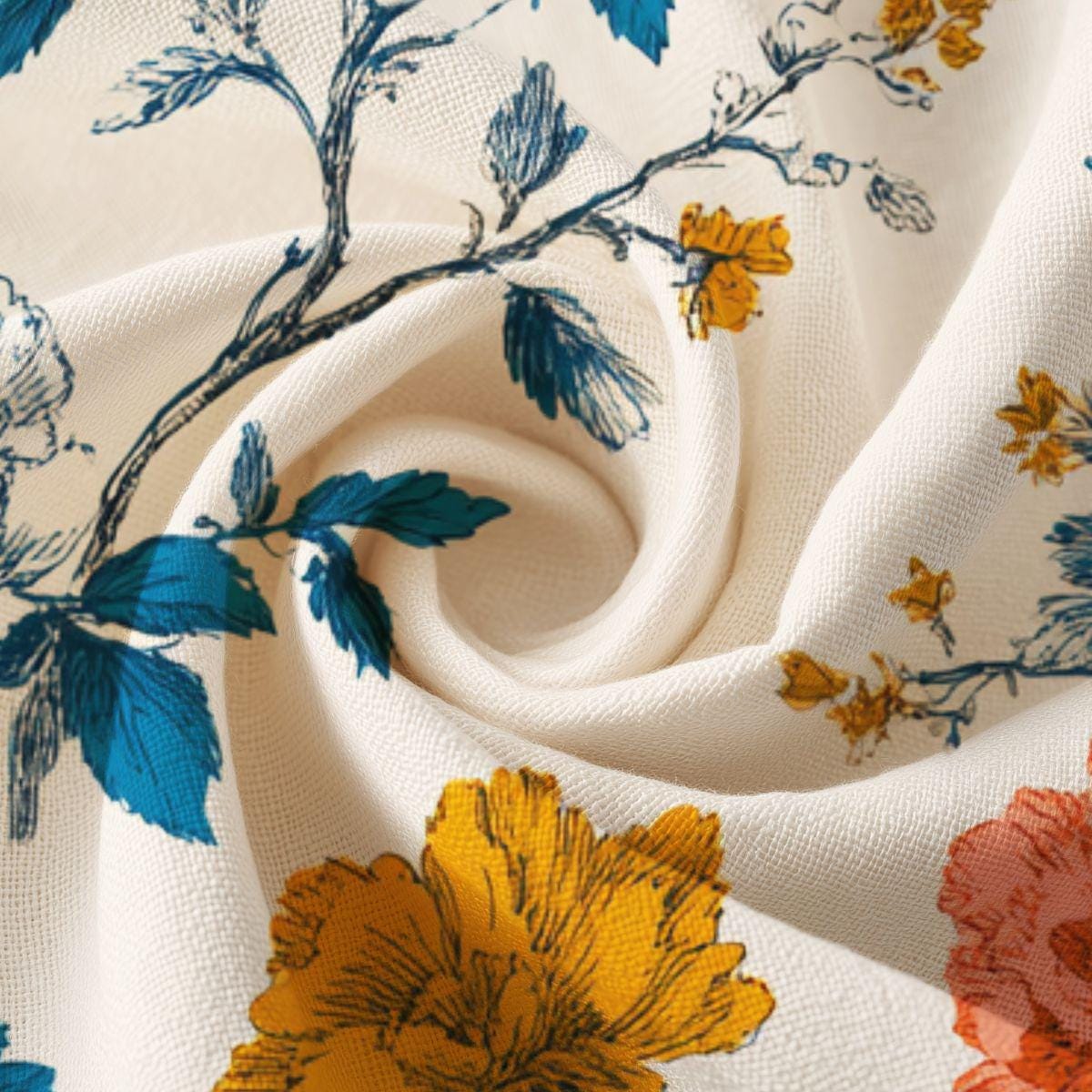 This lightweight textile brings a calm, vintage garden into everyday life. The soft Pima cotton feels cool and smooth against the skin, while the painterly floral print—deep teal leaves, warm ochre blossoms, and soft coral accents on a creamy background—adds quiet elegance. It settles easily into morning routines: folded on a shelf, draped over a chair, or used as a wrap for delicate items. The breathable weave and fine fibers give a gentle, refined hand that comforts without weight. Wear it close, use it around the home, or layer it into a relaxed, artful wardrobe for days when you want small, comforting beauty.