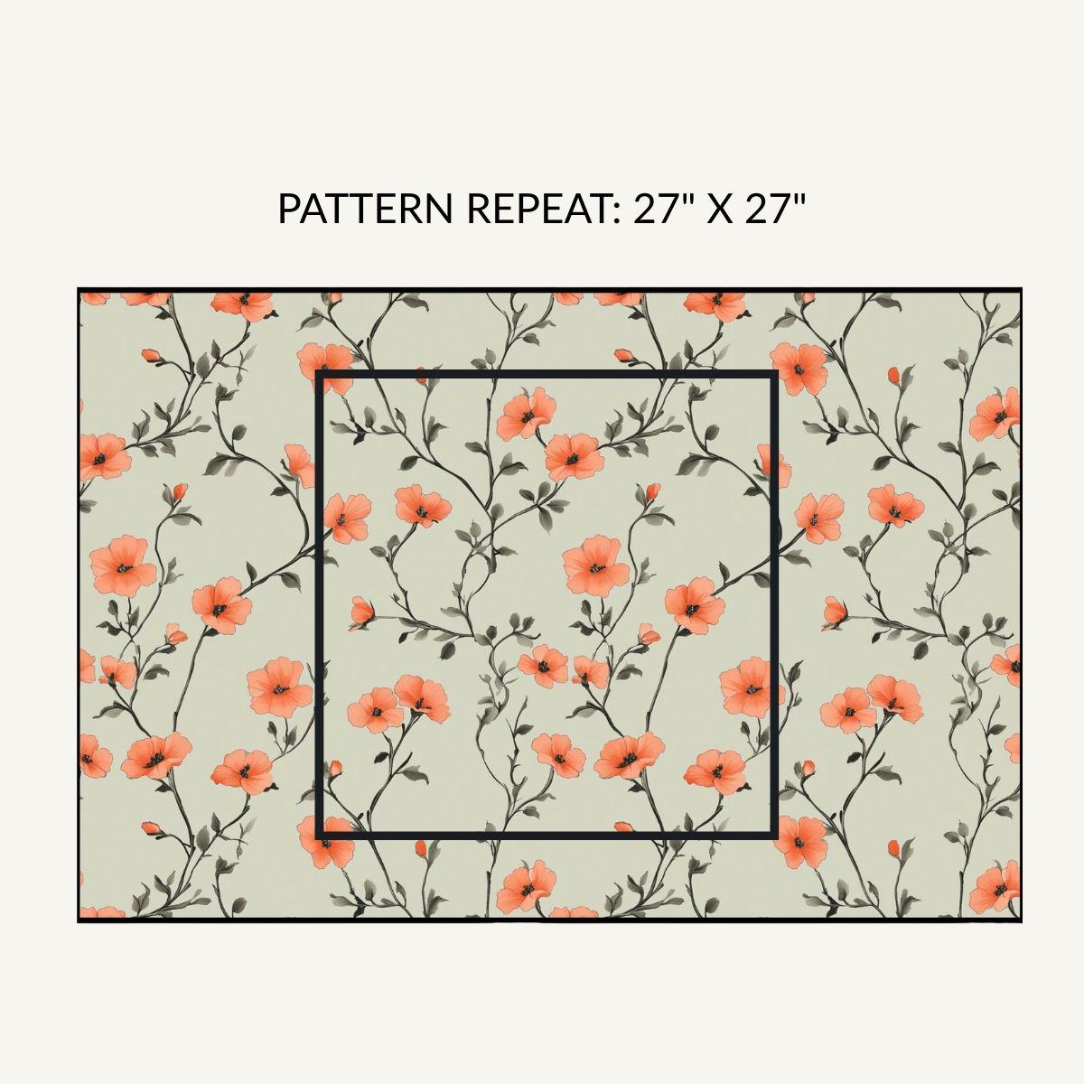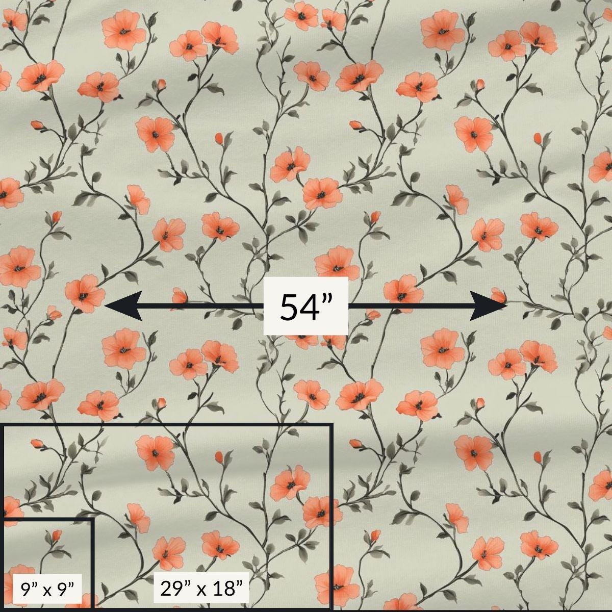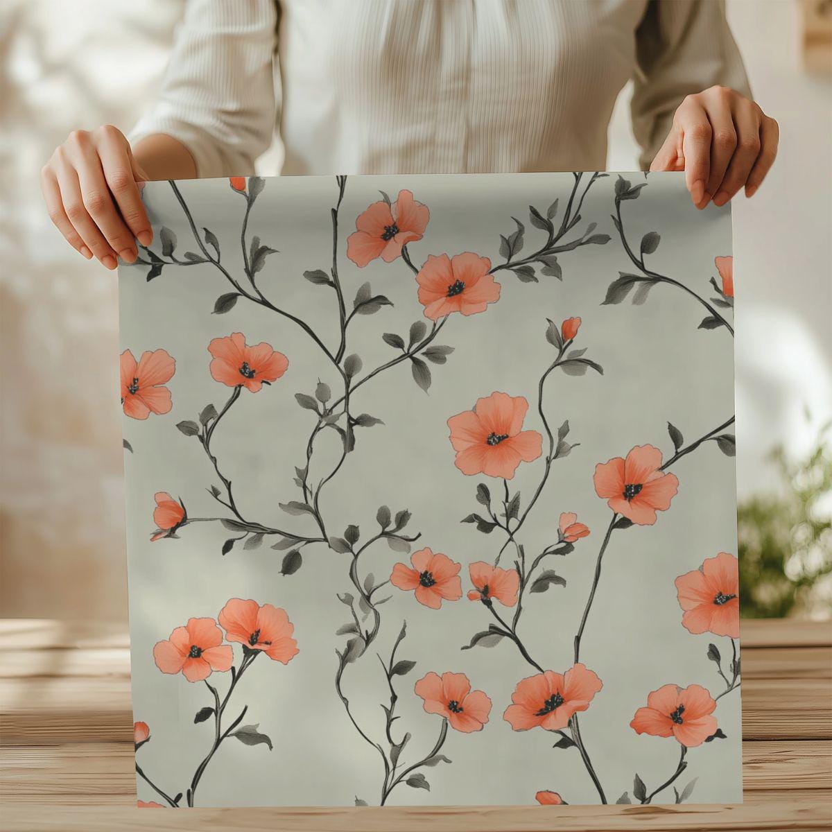 - Printed design — delicate coral poppies with charcoal stems on pale sage