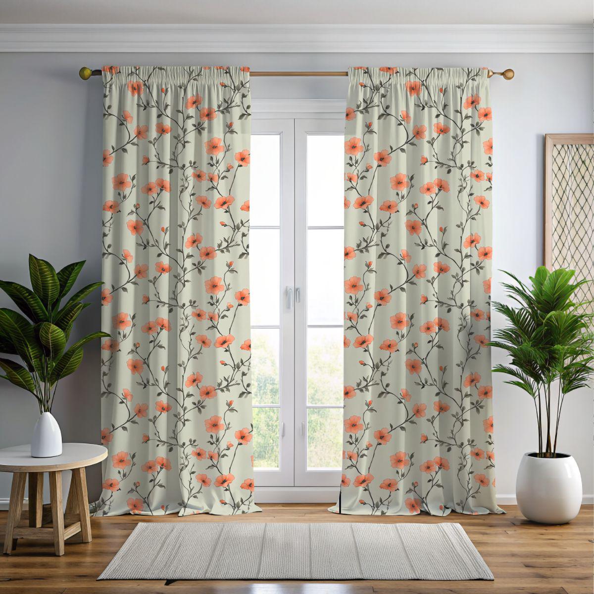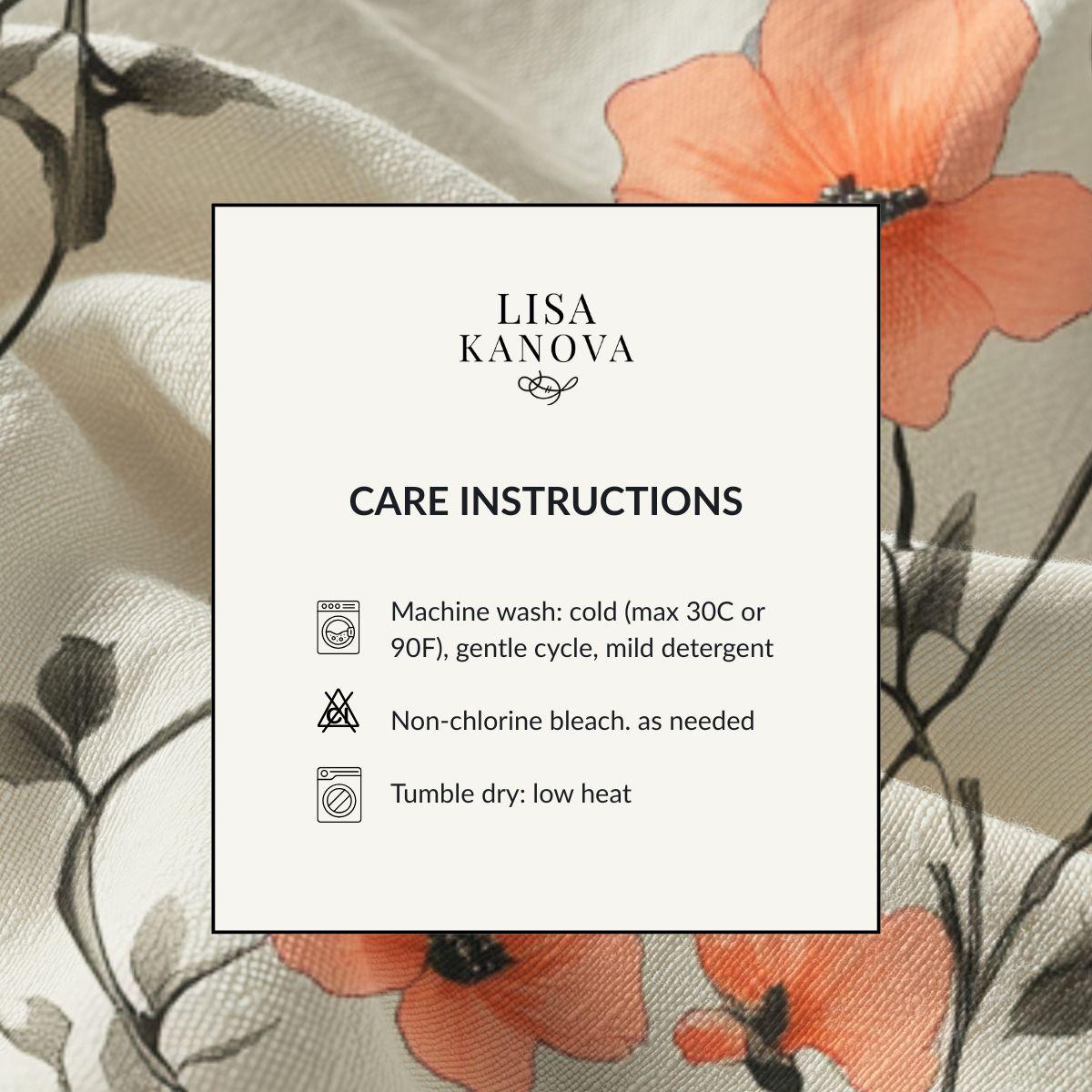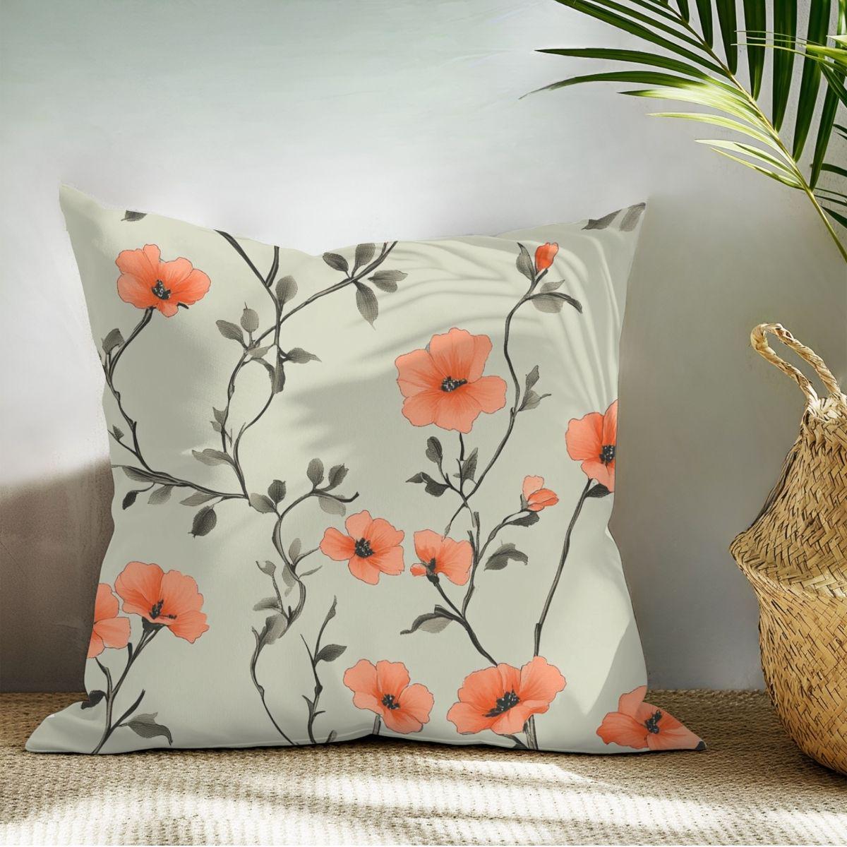 - Printed design — delicate coral poppies with charcoal stems on pale sage