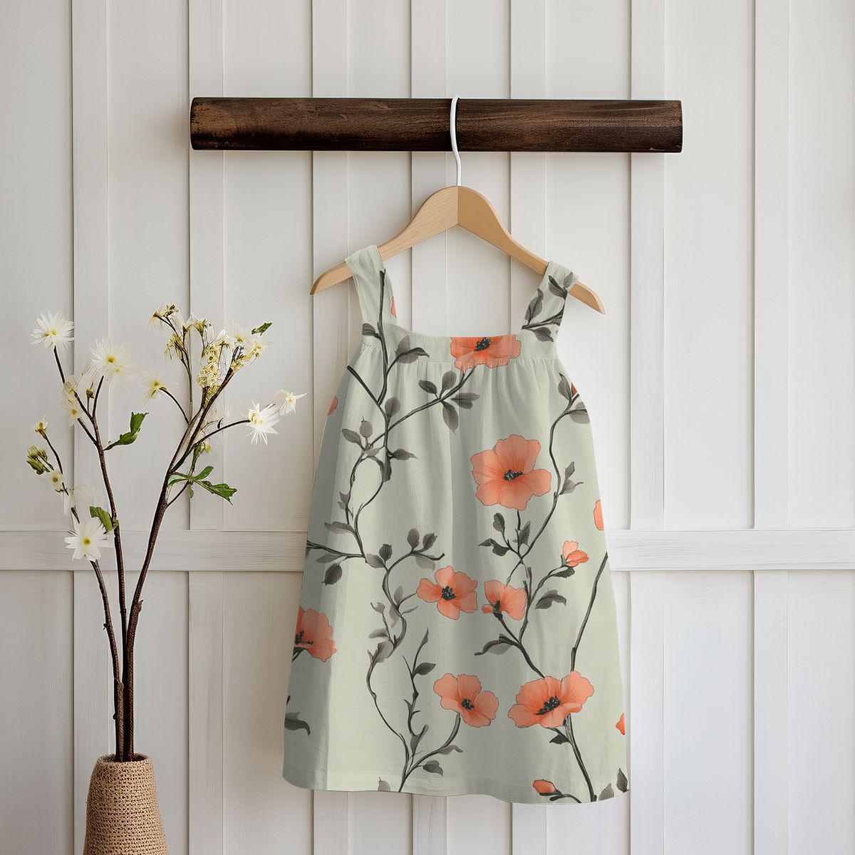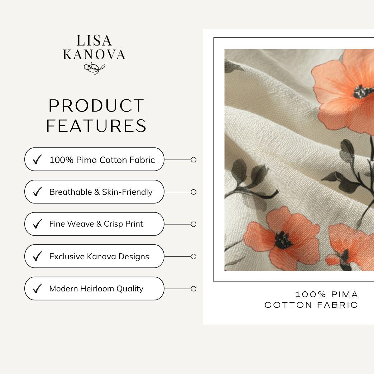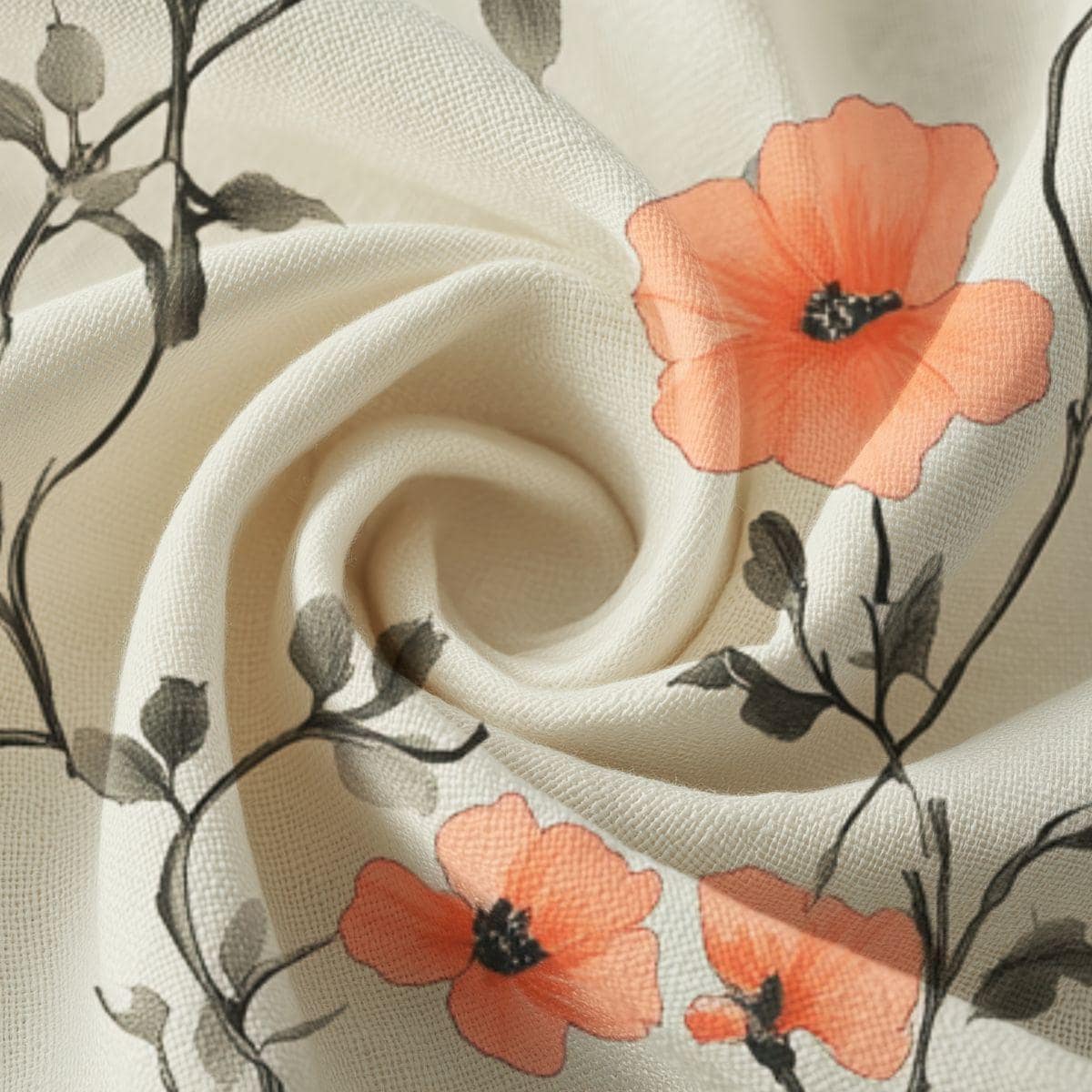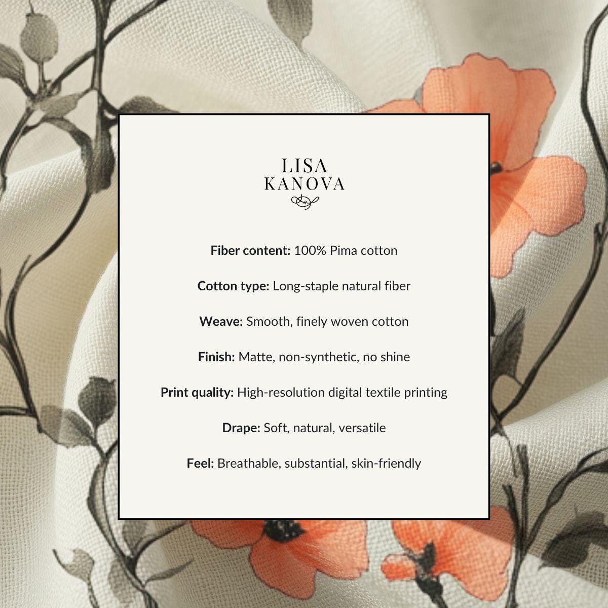 A lightweight, ultra-soft fabric piece patterned with delicate coral poppies and wispy charcoal stems on a pale sage background. The gentle floral print feels like a quiet spring morning — calm, slightly nostalgic, and quietly cheerful. Draped or folded, it brings a soft, refined touch to everyday moments: brushing shoulders on a stroll, layered for warmth at a café, or spread out as a subtle accent in a sunlit nook. The long-staple Pima cotton gives the surface a smooth, breathable hand that wears in beautifully over time, keeping colors soft but vivid and the texture luxuriously gentle against skin.