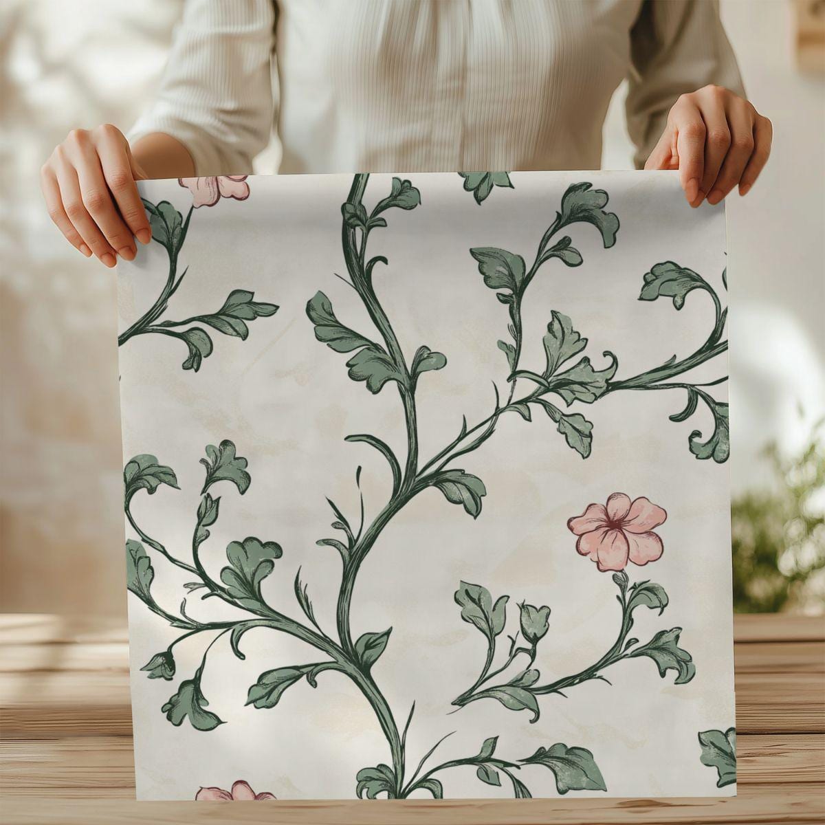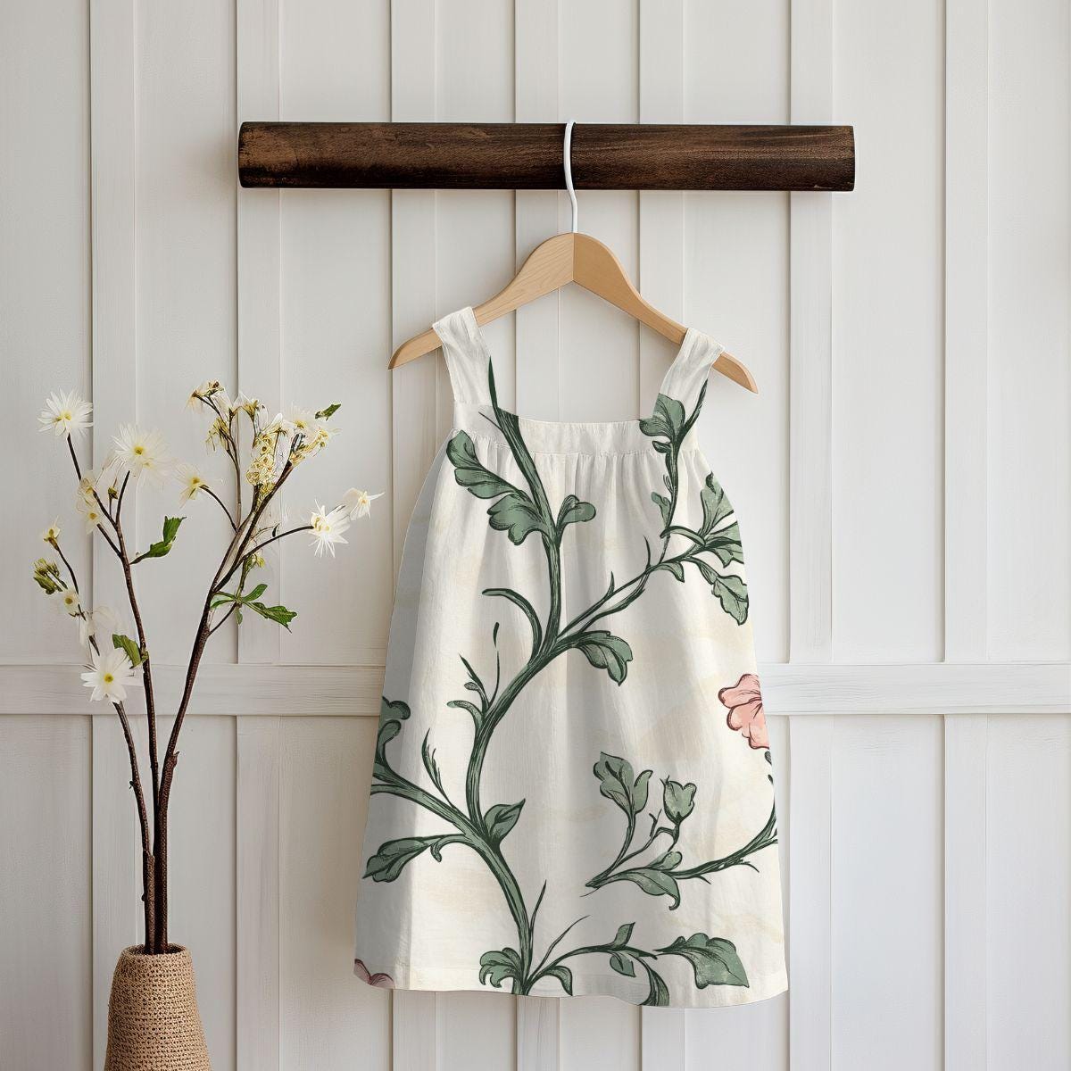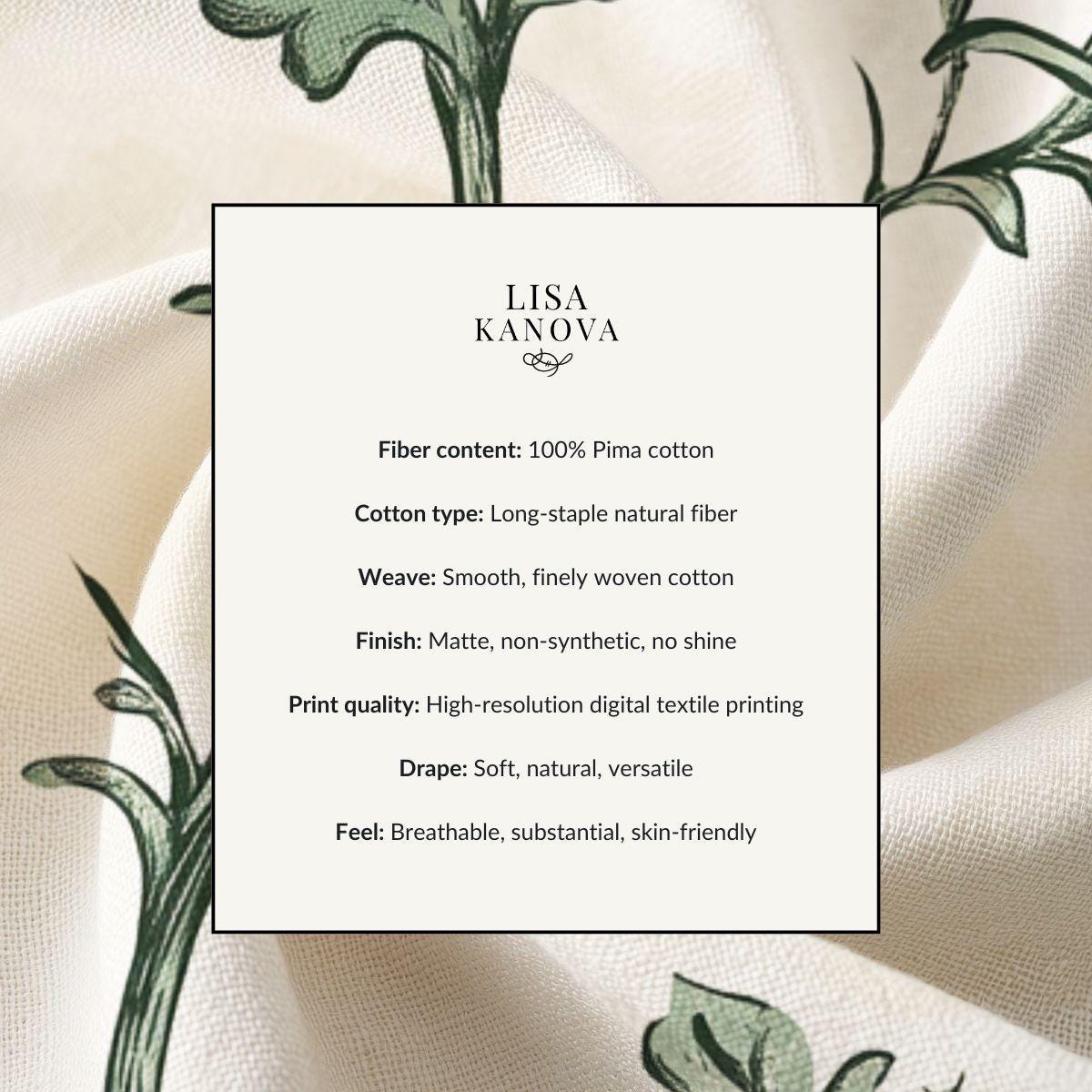 Light, breathable, and whisper-soft—this cotton piece carries a gentle, vintage botanical mood. Delicate green vines curl across a warm cream ground, punctuated by tiny rose-pink blooms. Wear it on slow mornings with a mug and a book, or layer it under a cardigan for strolls through farmers’ markets. The subtle, hand-drawn illustration feels personal and lived-in, like a pressed flower inside a notebook. It settles into everyday life without shouting—comfort that looks like calm.