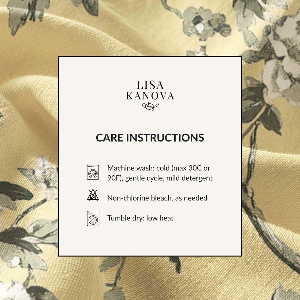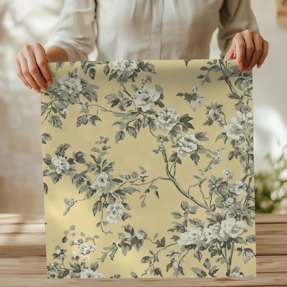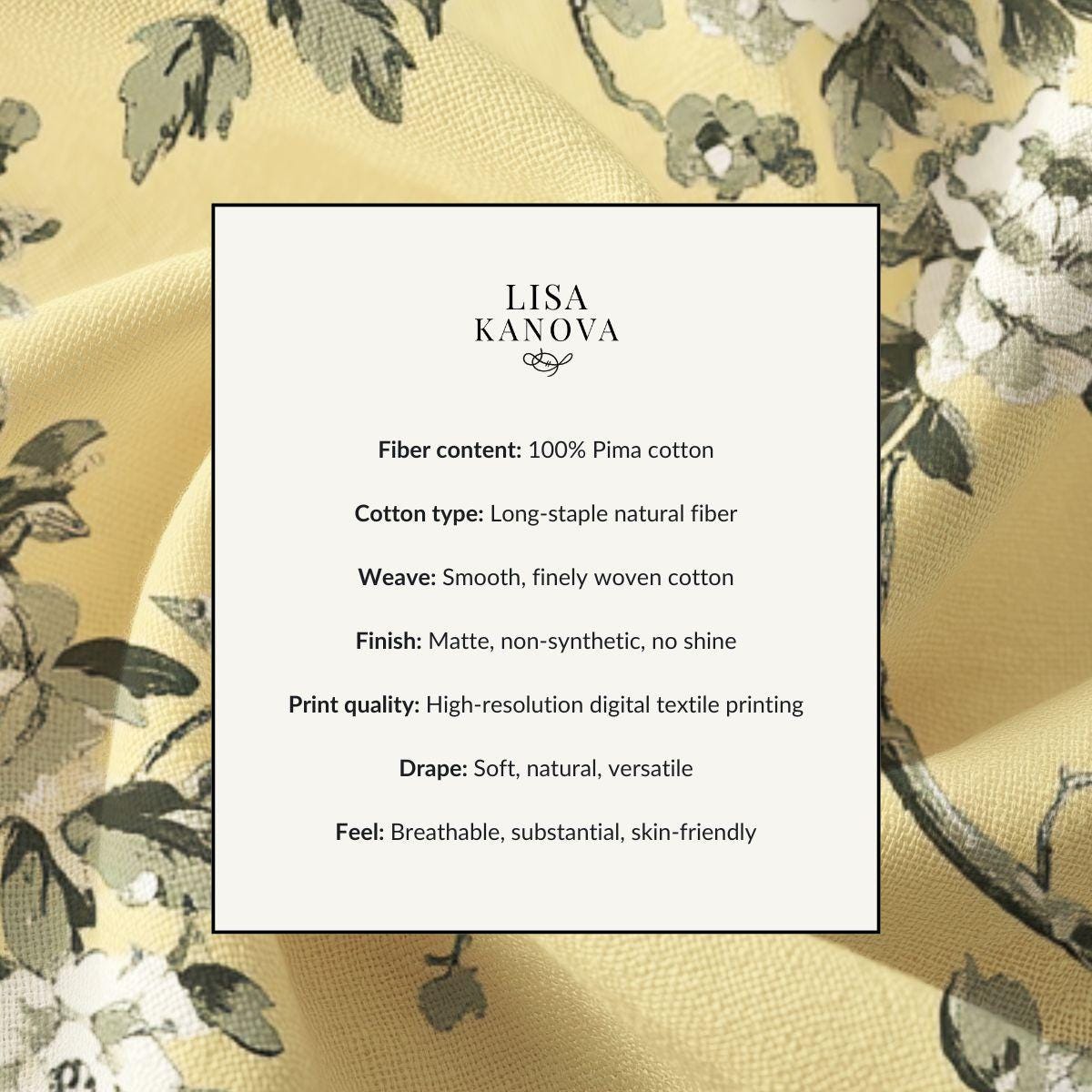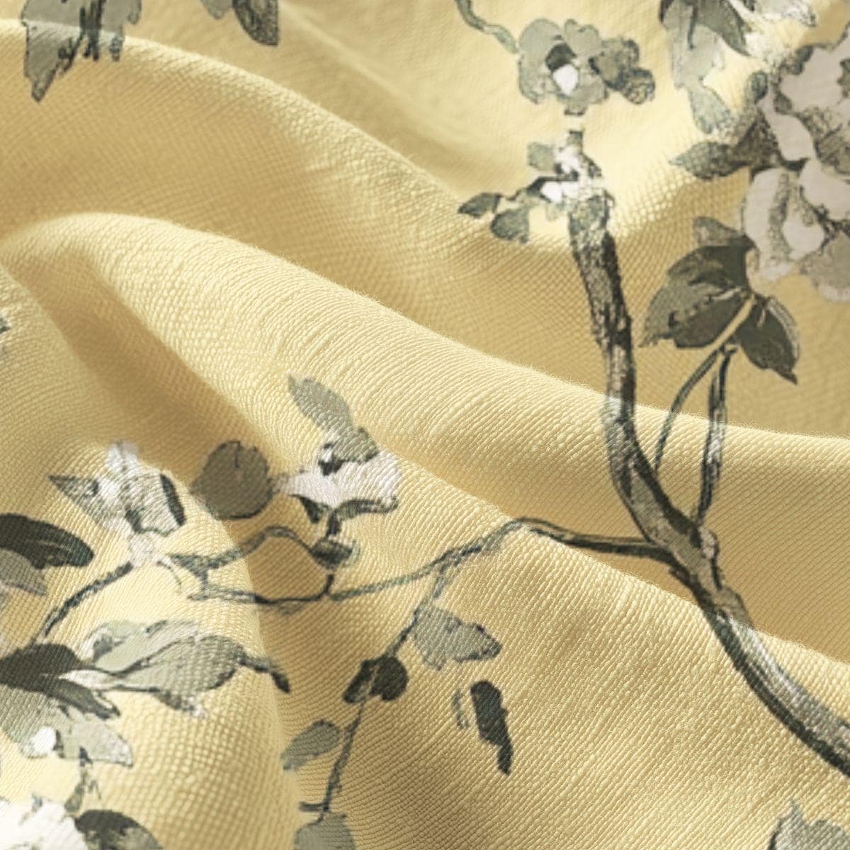A soft, floral cotton piece that brings gentle warmth and vintage charm to everyday living. The pale buttery background is dotted with detailed gray-green blossoms and winding branches, giving the fabric a quietly elegant, lived-in look. Worn or draped, it feels breathable and luxuriously smooth against skin, with a lightweight hand that layers well through spring and into cooler evenings. The design reads like an heirloom textile — calm, sentimental, and quietly refined — adding a subtle botanical accent to casual wardrobes or cozy home moments.