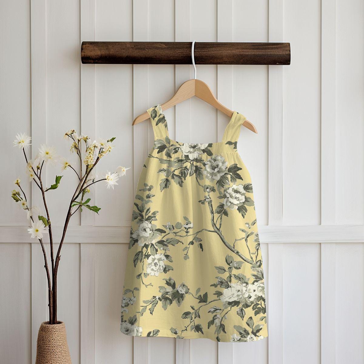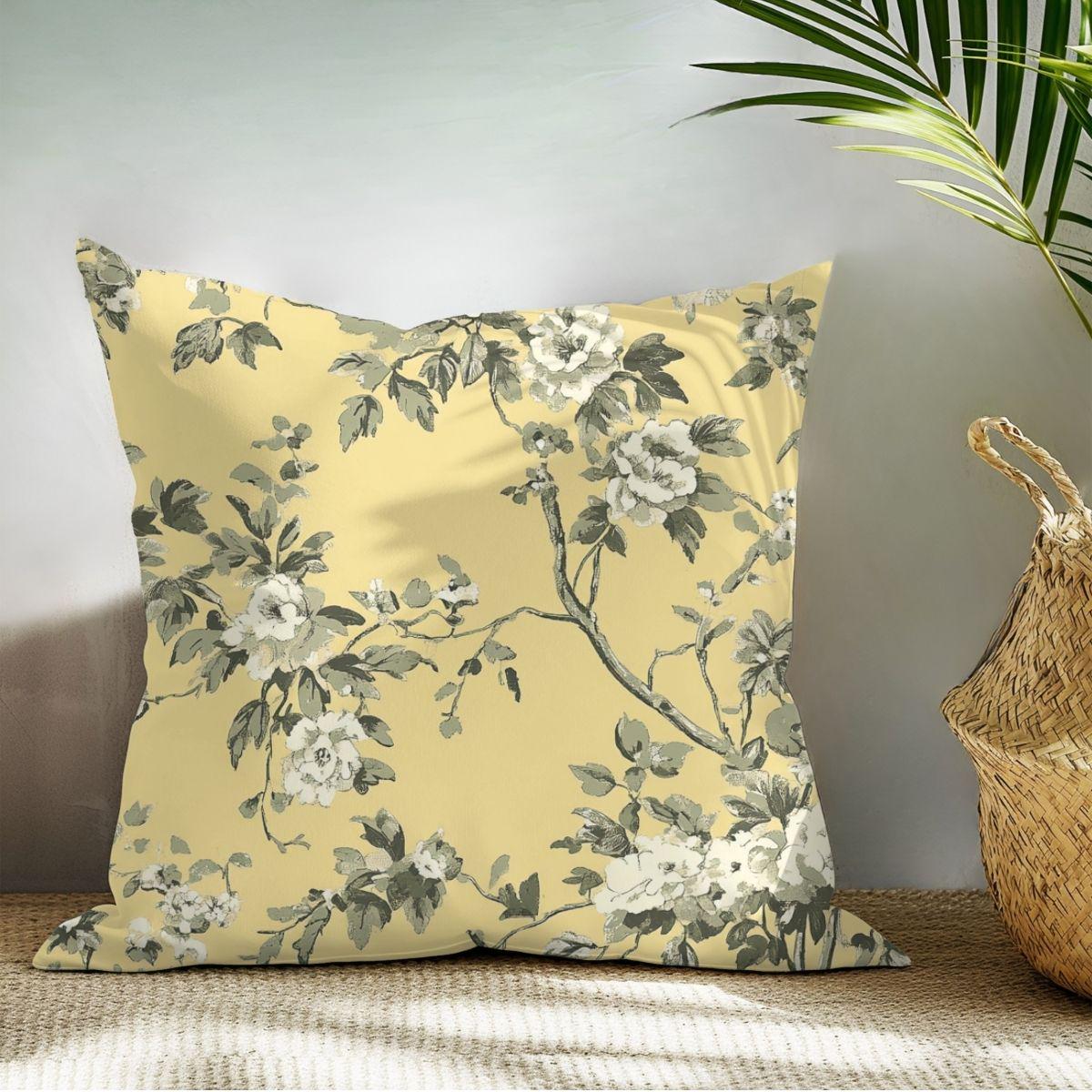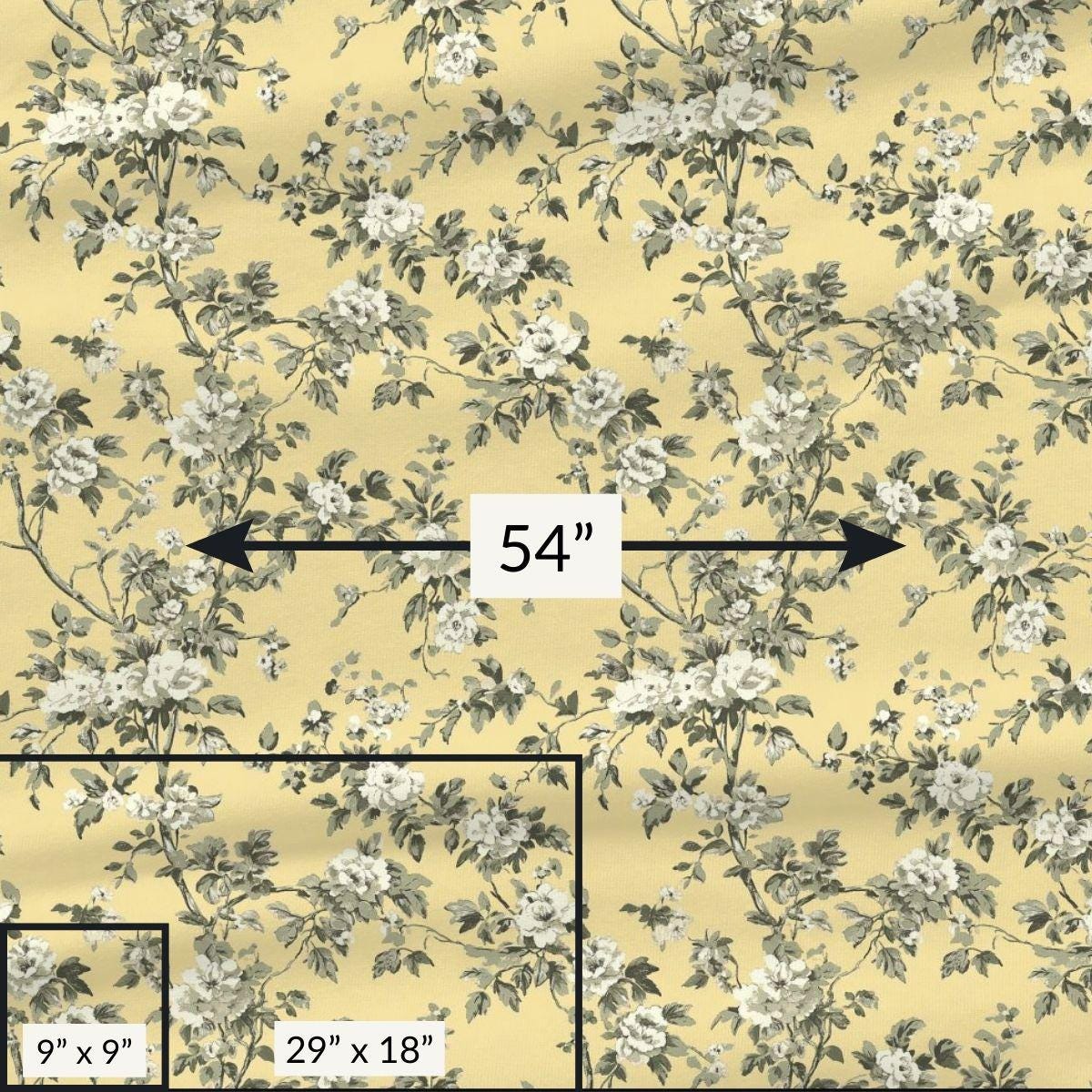 - Vintage-inspired floral print in soft yellow and muted gray-green tones