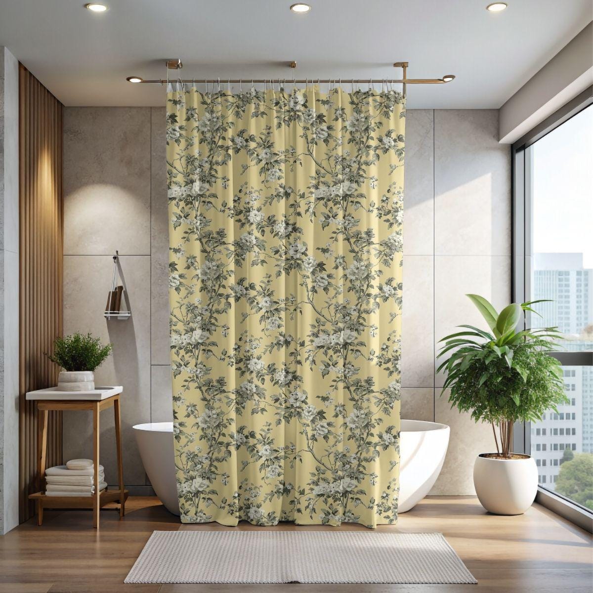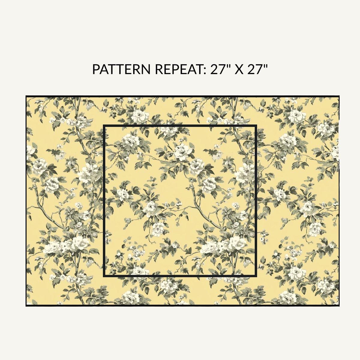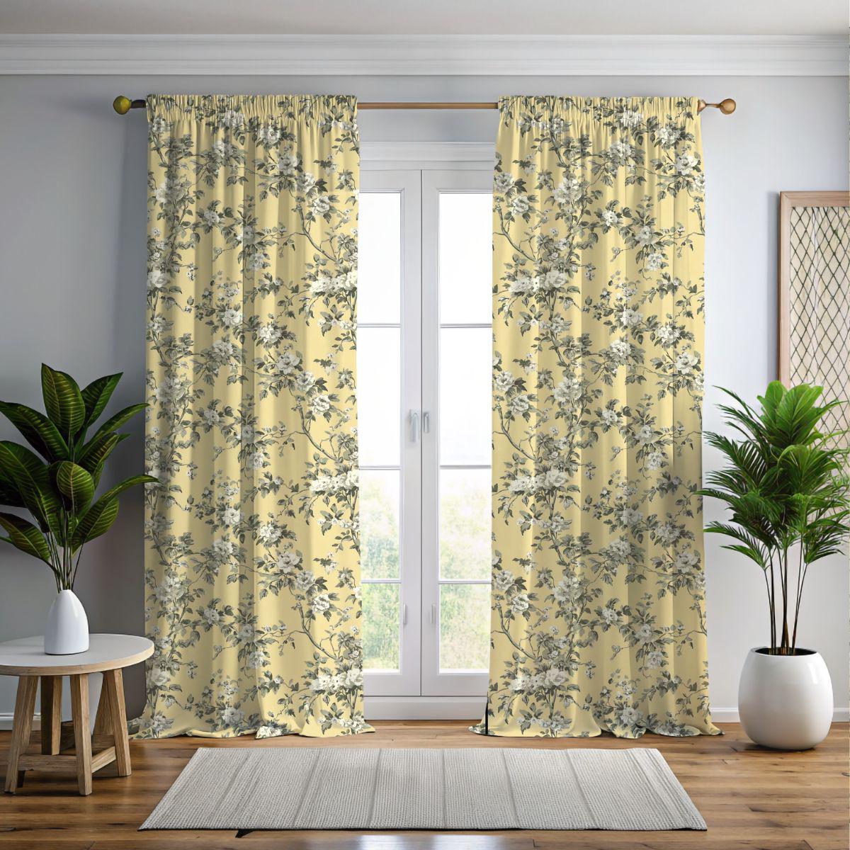 - Vintage-inspired floral print in soft yellow and muted gray-green tones