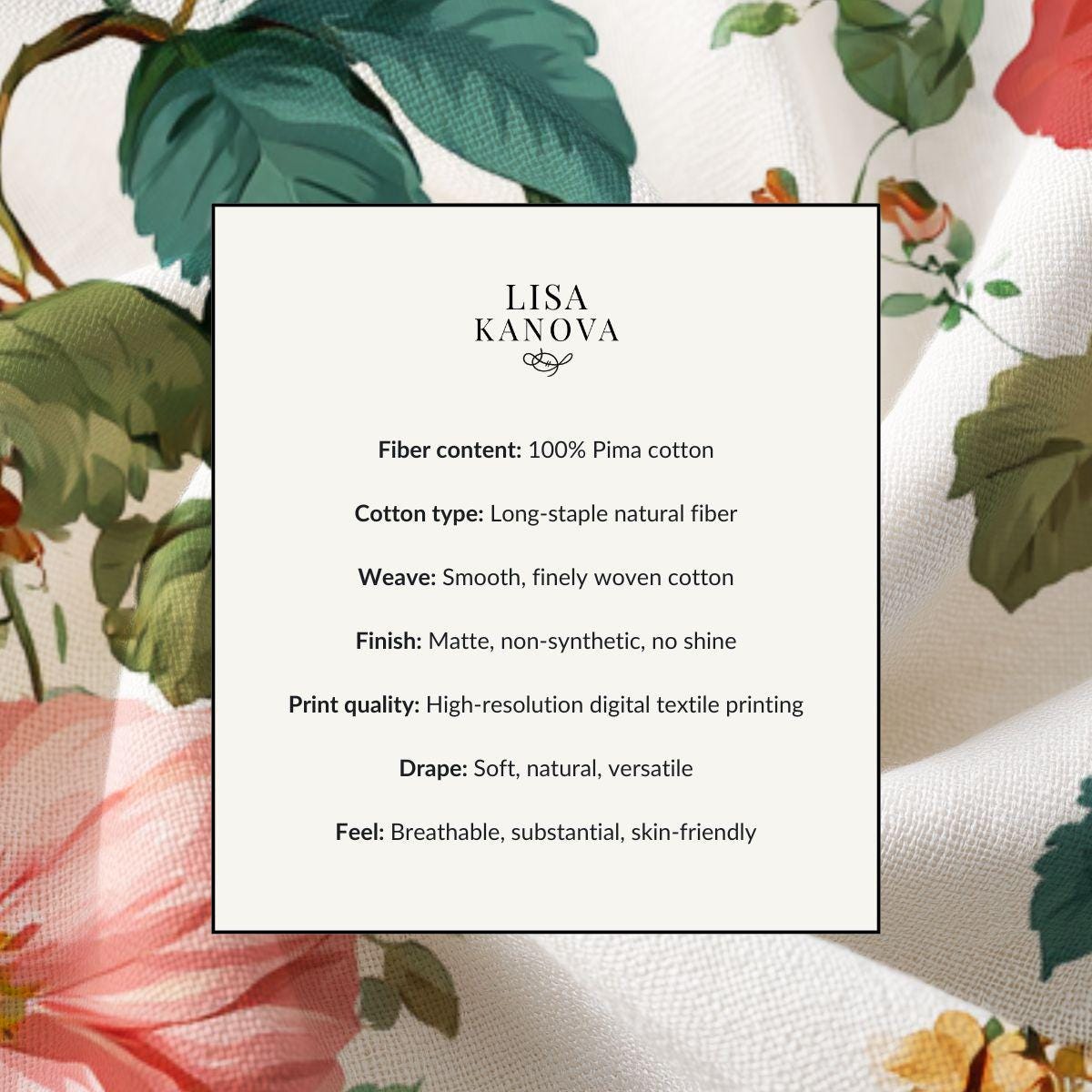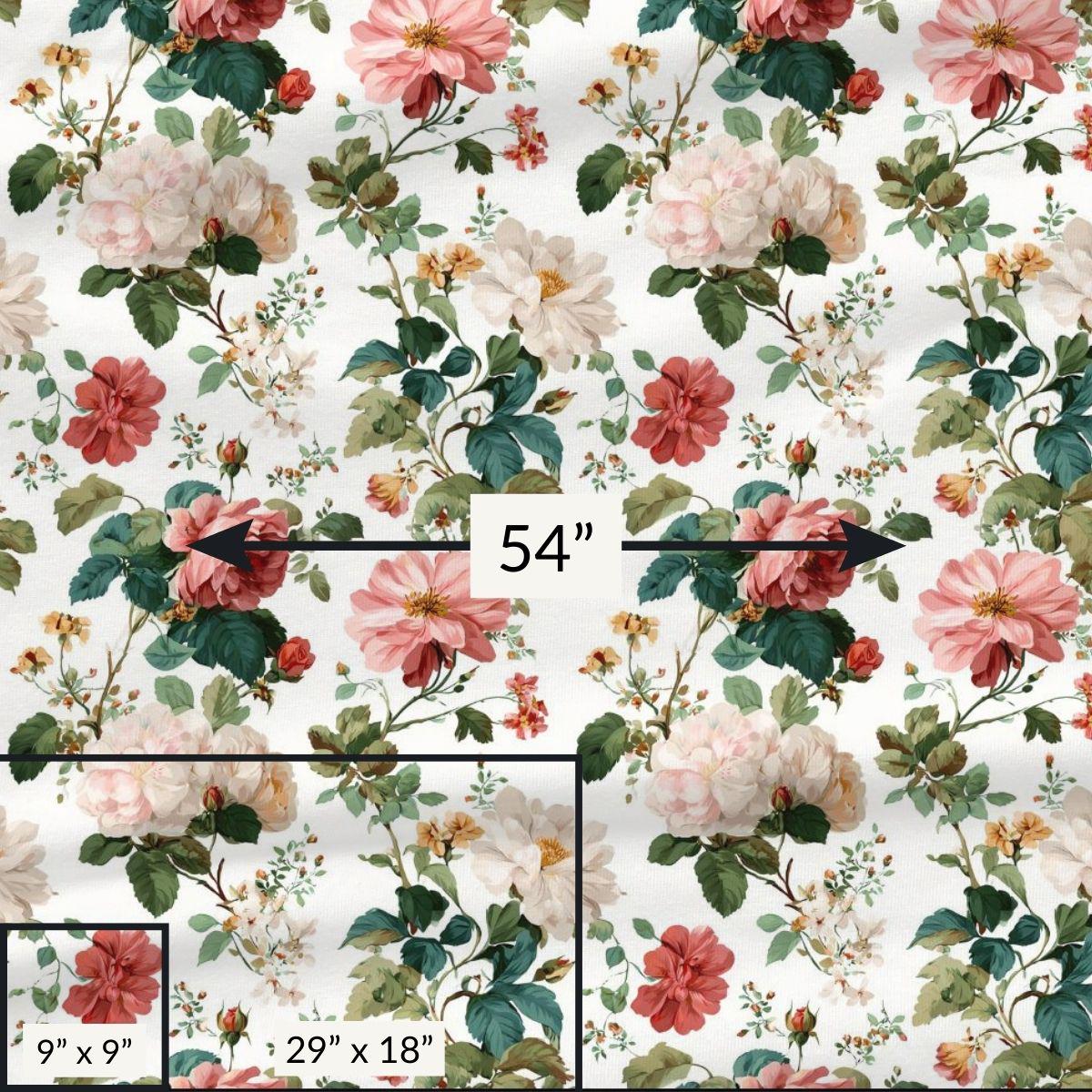- Large print repeat for expansive, continuous floral scenes; smaller cuts still show concentrated blooms