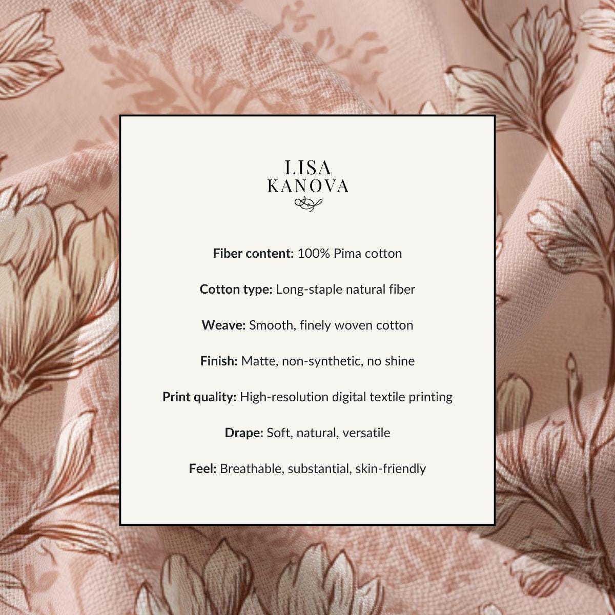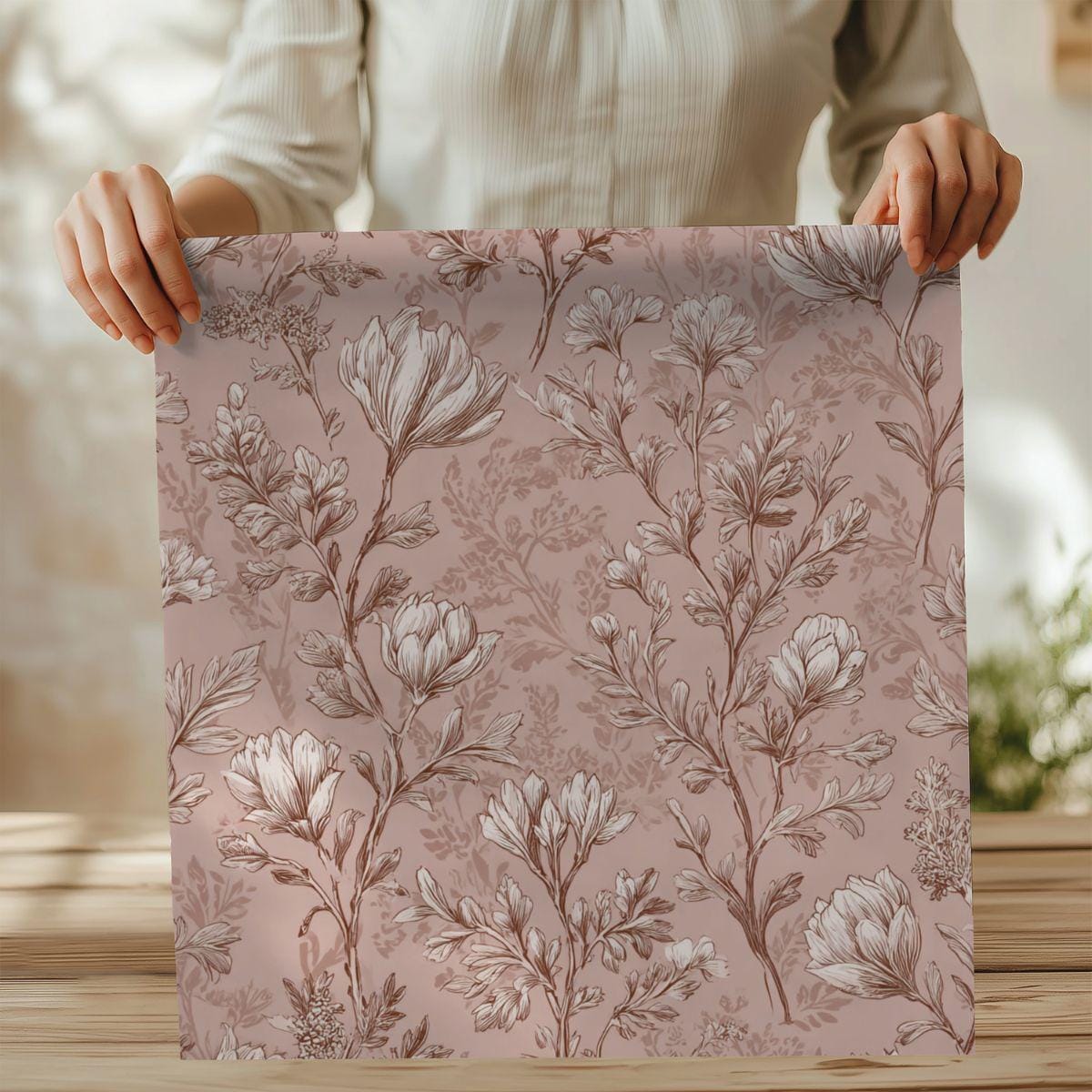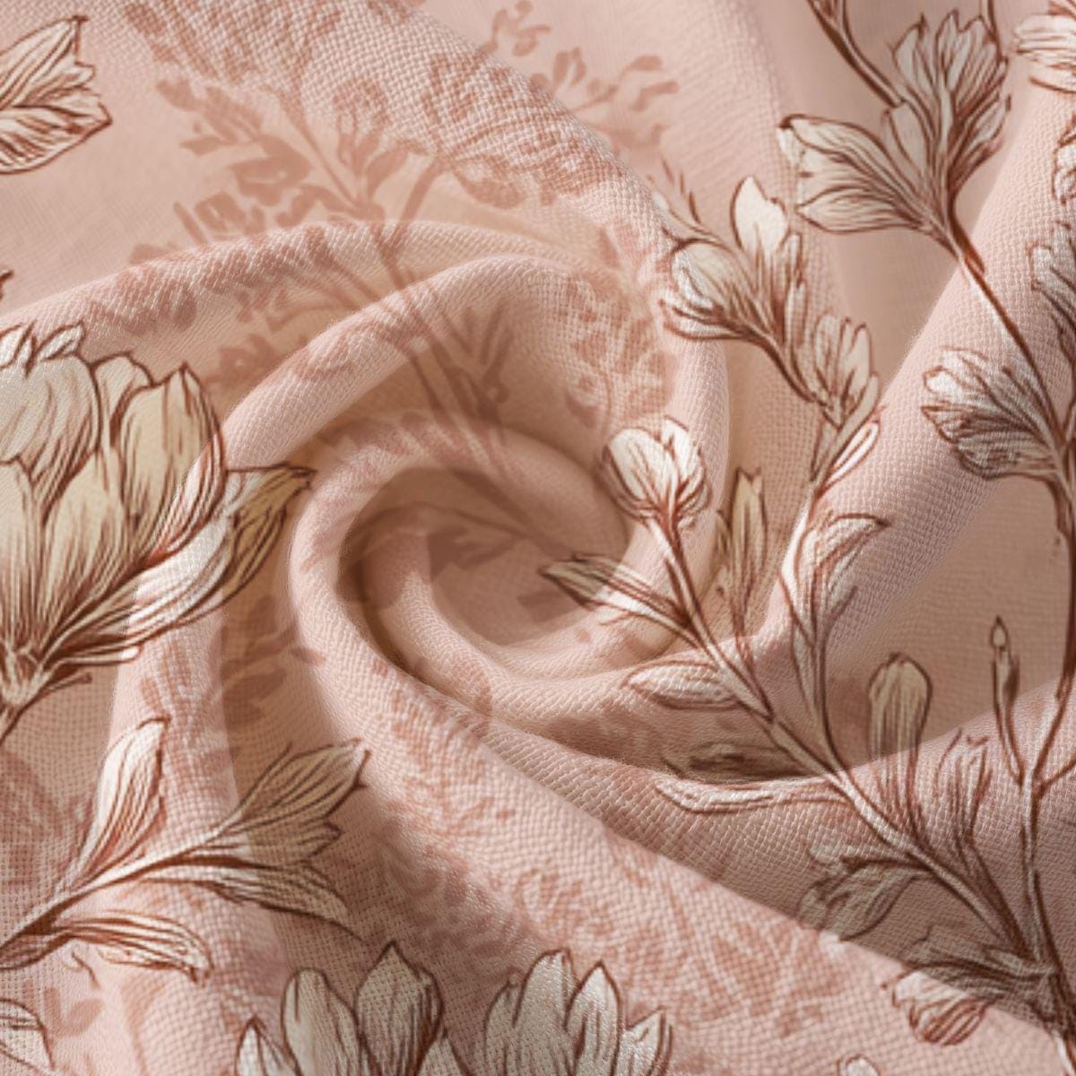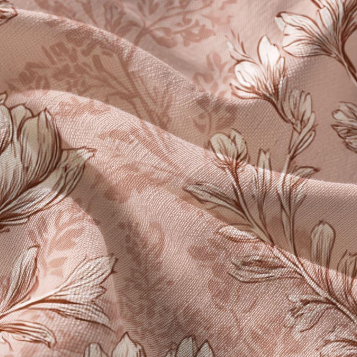 This lightweight textile brings a quietly elegant floral print into everyday life. The soft, dusty-rose background and finely sketched botanical motifs feel like a well-loved vintage wallpaper translated into fabric—gentle, warm, and thoughtfully detailed. It drapes smoothly and holds the print with clarity, making it suited for wearables or home accents where a subtle, romantic touch is wanted. Imagine slipping into something that looks lived-in and cherished, or folding it into a room to add a calm, feminine layer that ages gracefully.