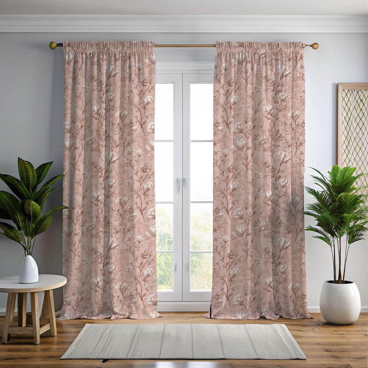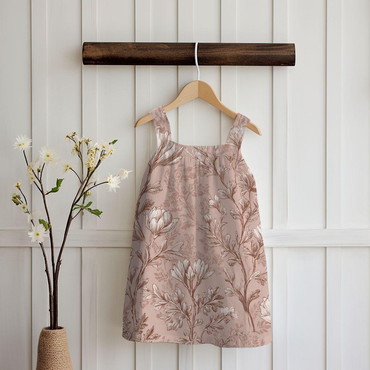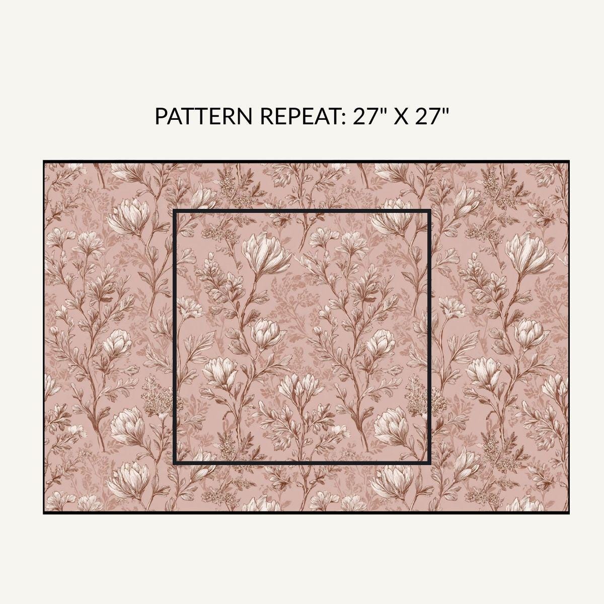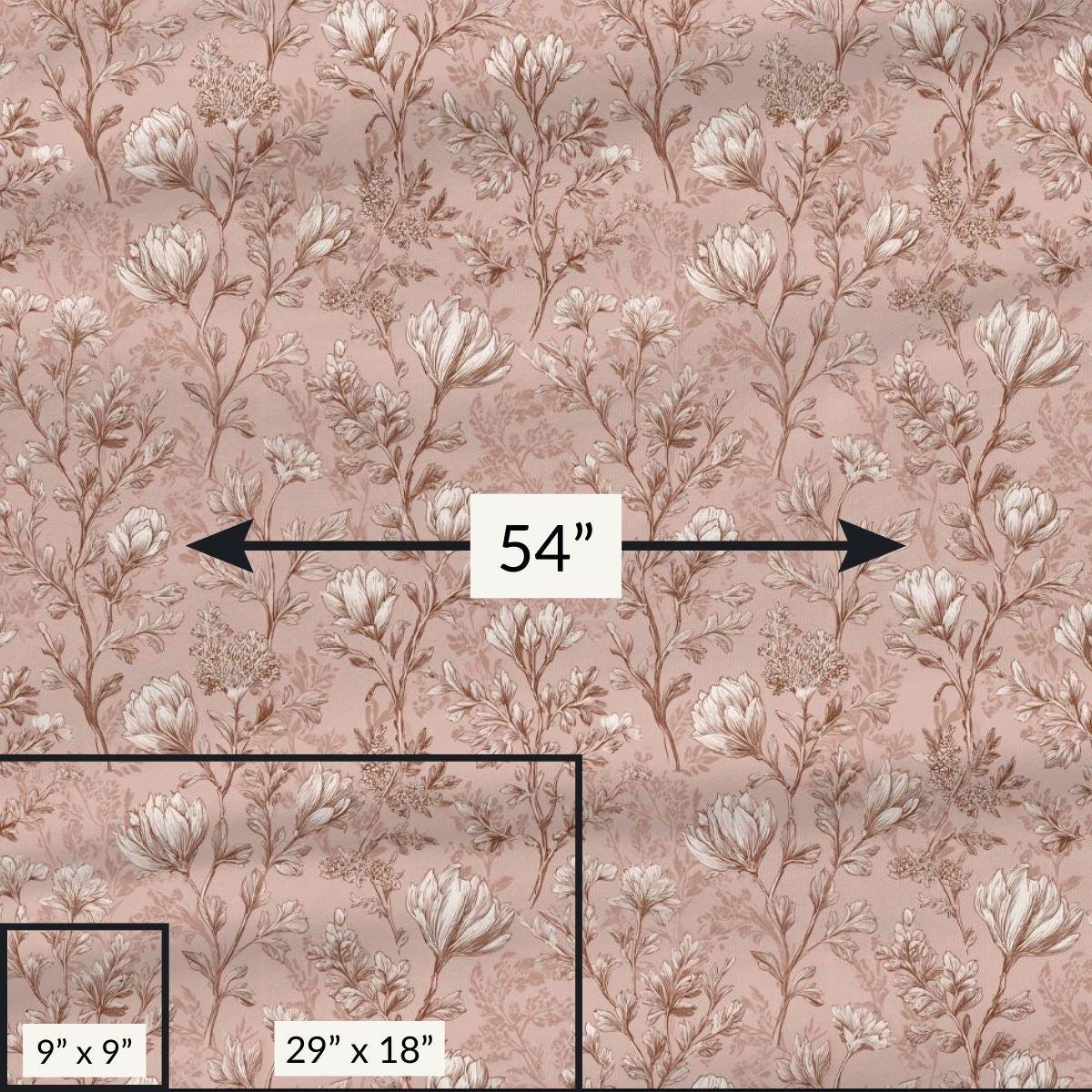 - Fine, vintage-style floral print on a dusty-rose background