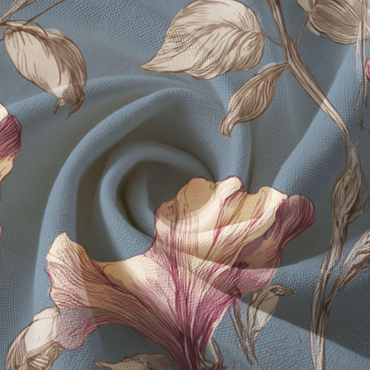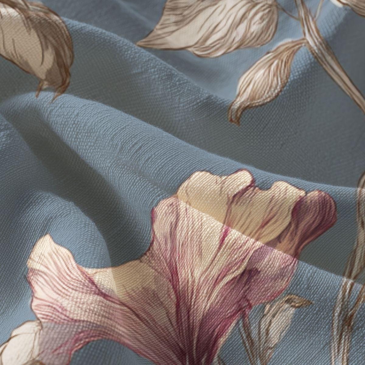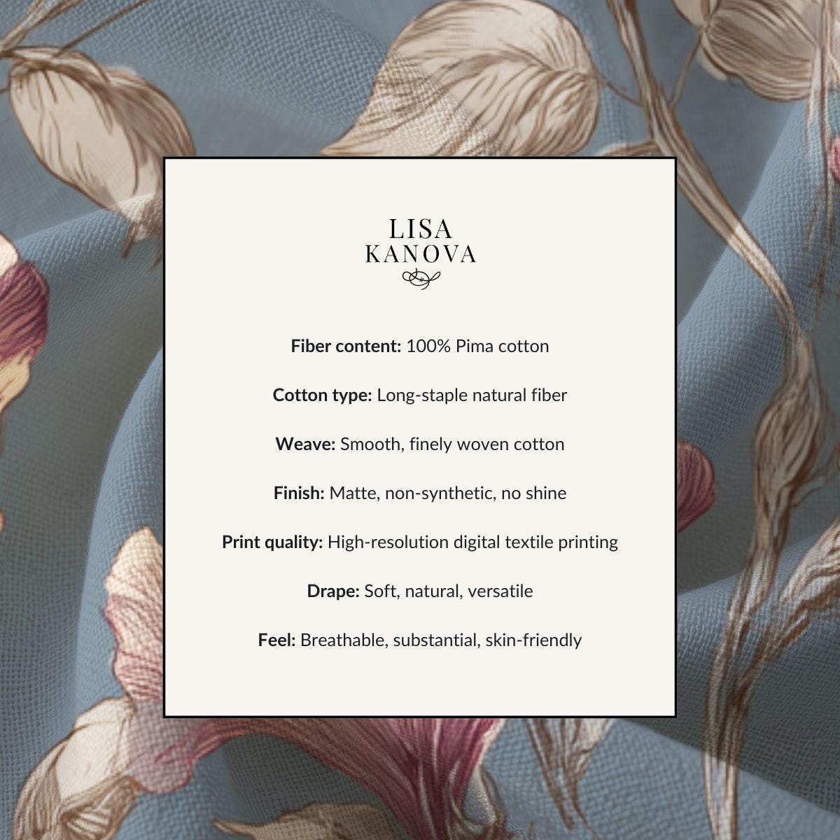 Soft, breathable Pima cotton brings this floral piece to life with a gentle, vintage-inspired palette. The muted blue background lets blush and mauve blooms drift across the fabric like a hand-painted wallpaper. Lightweight and smooth to the touch, the fabric folds and drapes with an elegant, relaxed movement—comfortable for slow mornings curled up with tea or layered for an afternoon market stroll. The printed edges for larger sizes are cut after printing so each piece carries a slightly unique composition, lending a bespoke feel. This is for someone who favors quiet, artful details and wants a wearable textile that feels both refined and lived-in.