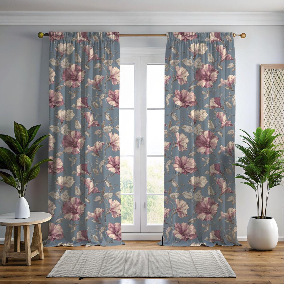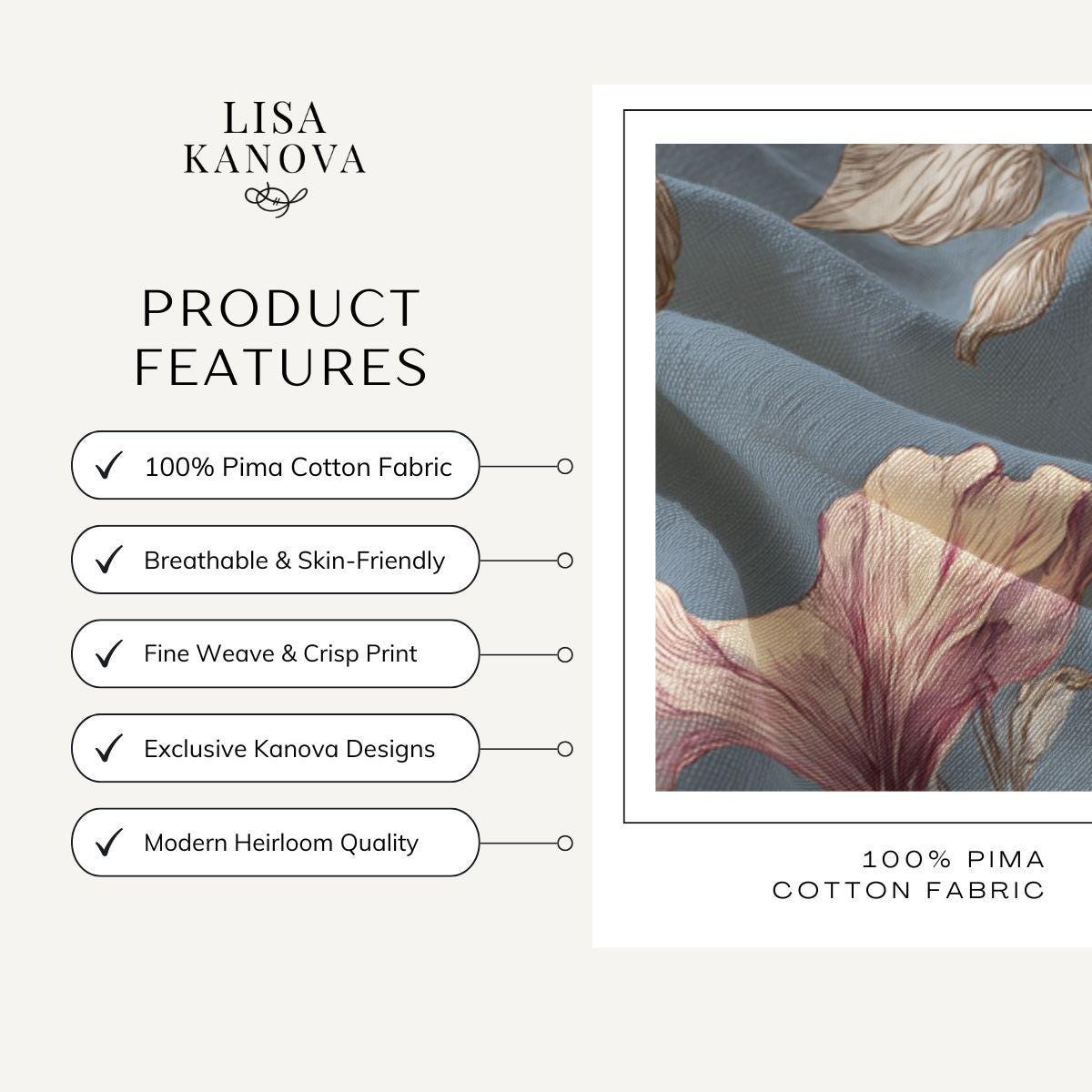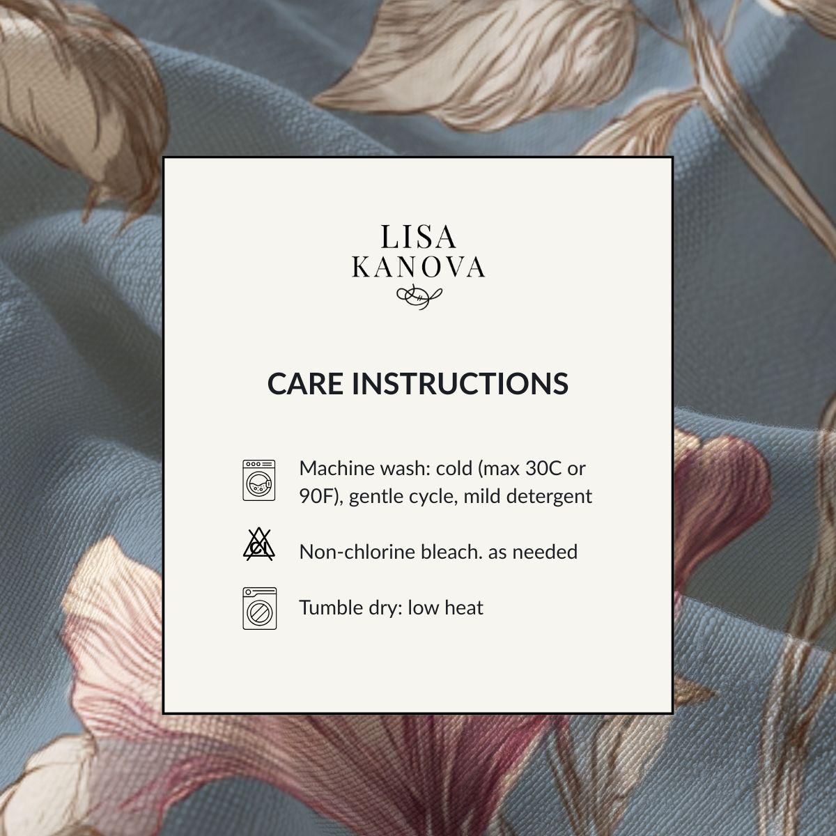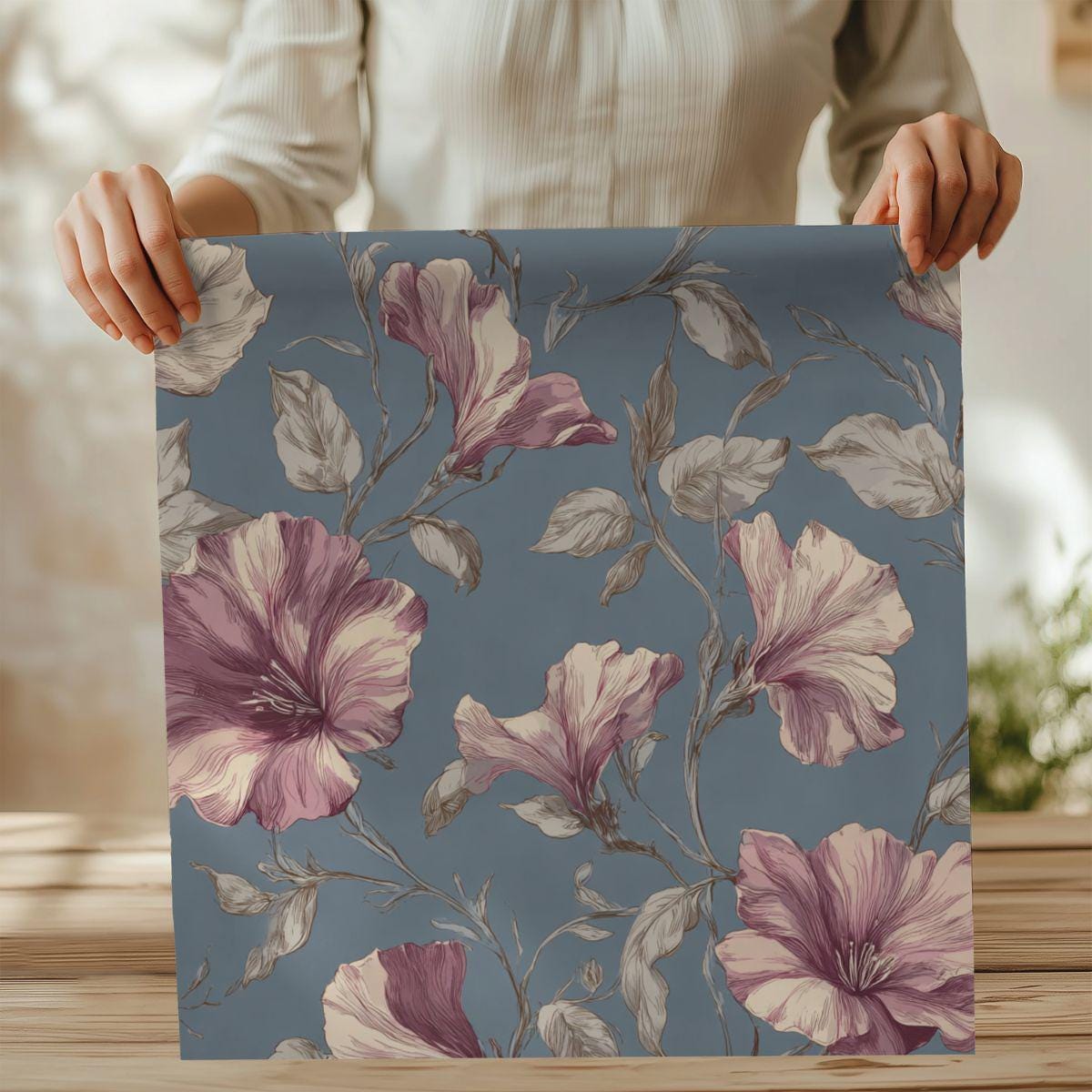 Soft, breathable Pima cotton brings this floral piece to life with a gentle, vintage-inspired palette. The muted blue background lets blush and mauve blooms drift across the fabric like a hand-painted wallpaper. Lightweight and smooth to the touch, the fabric folds and drapes with an elegant, relaxed movement—comfortable for slow mornings curled up with tea or layered for an afternoon market stroll. The printed edges for larger sizes are cut after printing so each piece carries a slightly unique composition, lending a bespoke feel. This is for someone who favors quiet, artful details and wants a wearable textile that feels both refined and lived-in.