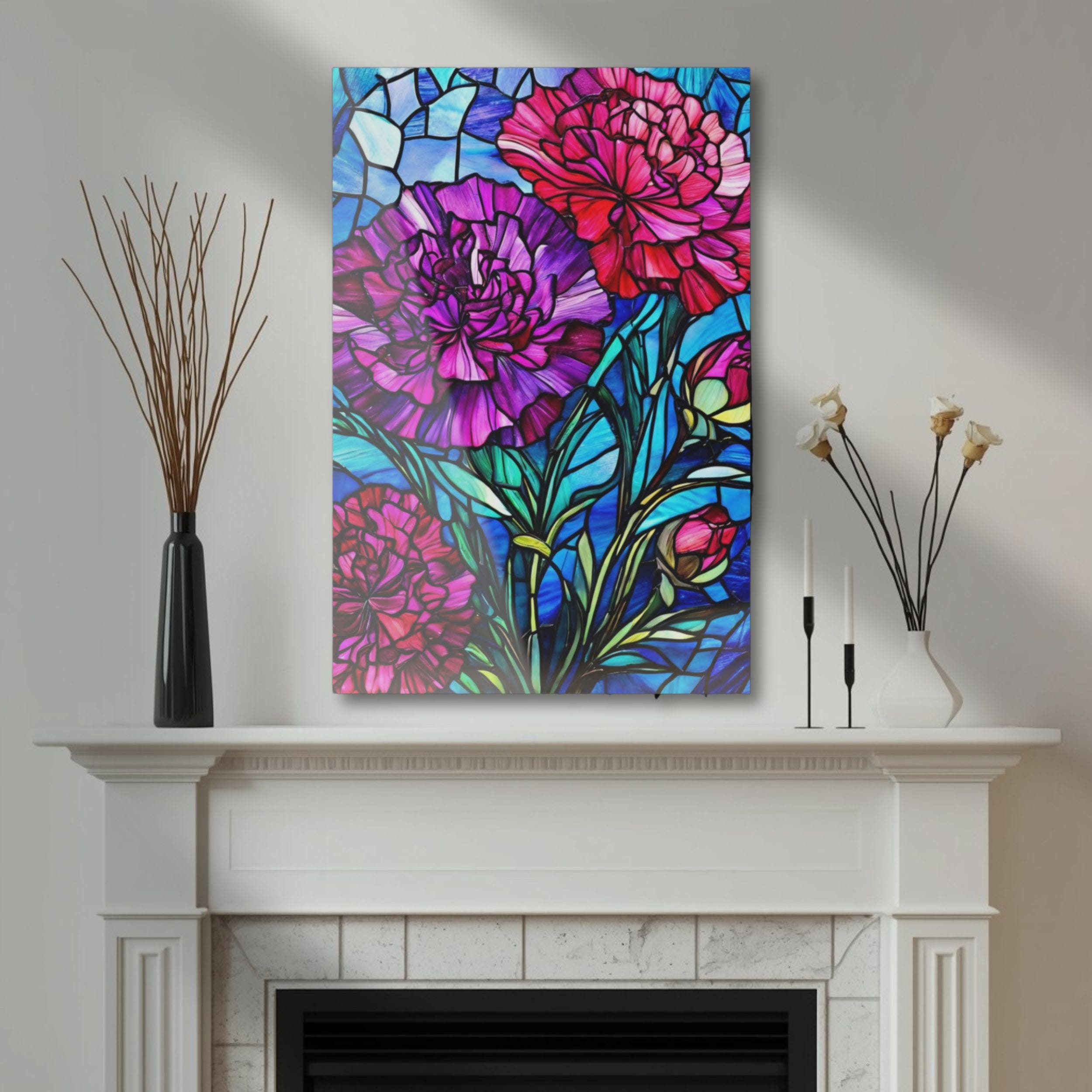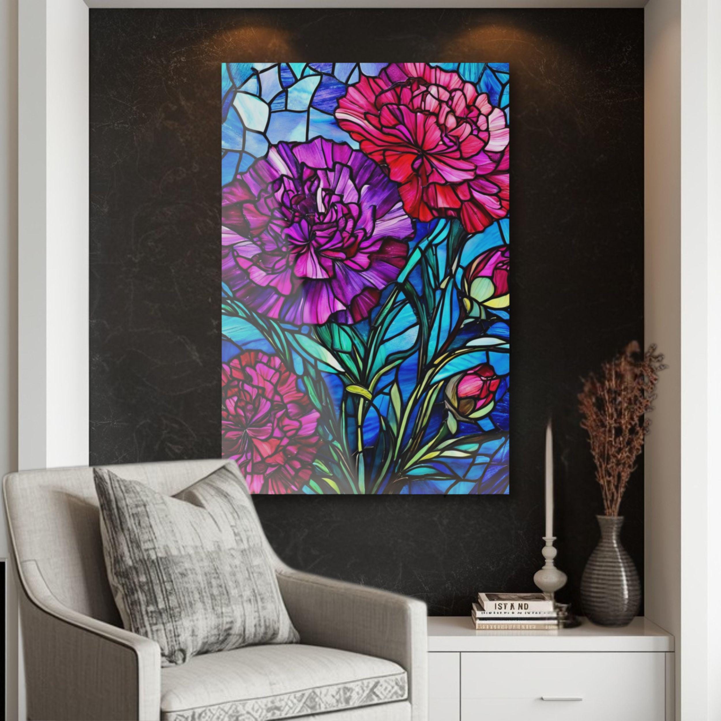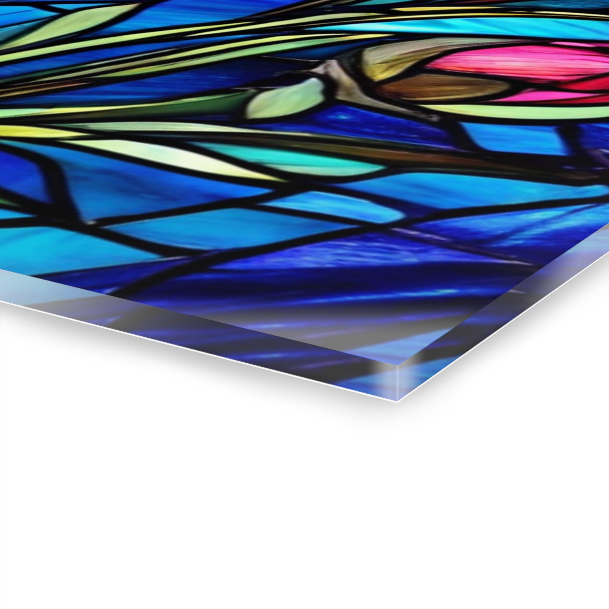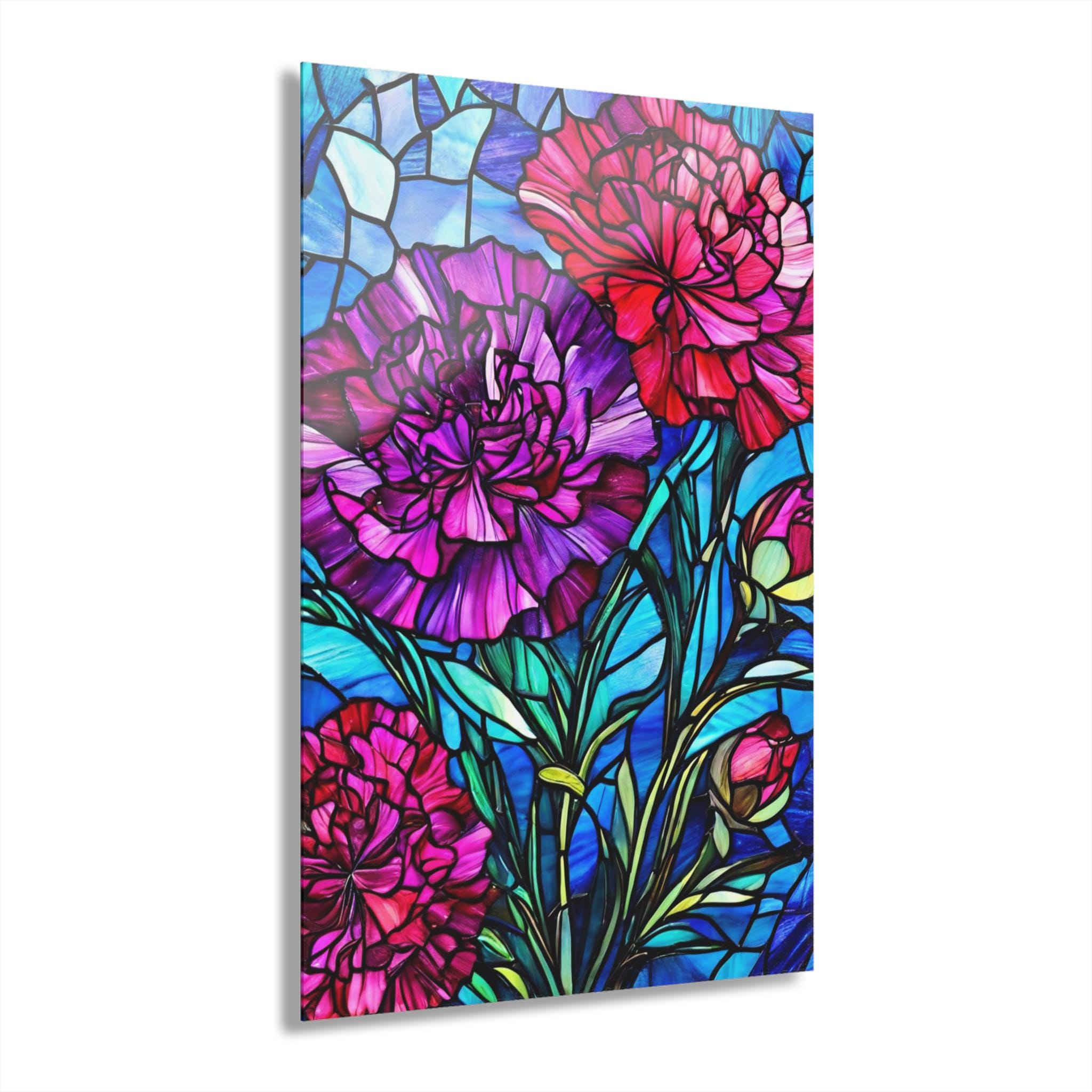 Vibrant color and glossy depth make this acrylic art piece feel alive on the wall. Printed on archival photographic paper with fade-resistant inks and fused to 0.25" grade-A acrylic, the image sits beneath a crystal-clear surface that amplifies color and contrast. The white vinyl backing sharpens detail while the hand-polished edges catch light like a gem. A French cleat system is pre-installed for rock-solid, level hanging — screws and setup instructions included — so the piece mounts cleanly and stays secure. Water-resistant and easy to wipe clean, this print brings museum-quality presence to living rooms, studios, or entryways where bold, stained-glass–like florals can set the tone.