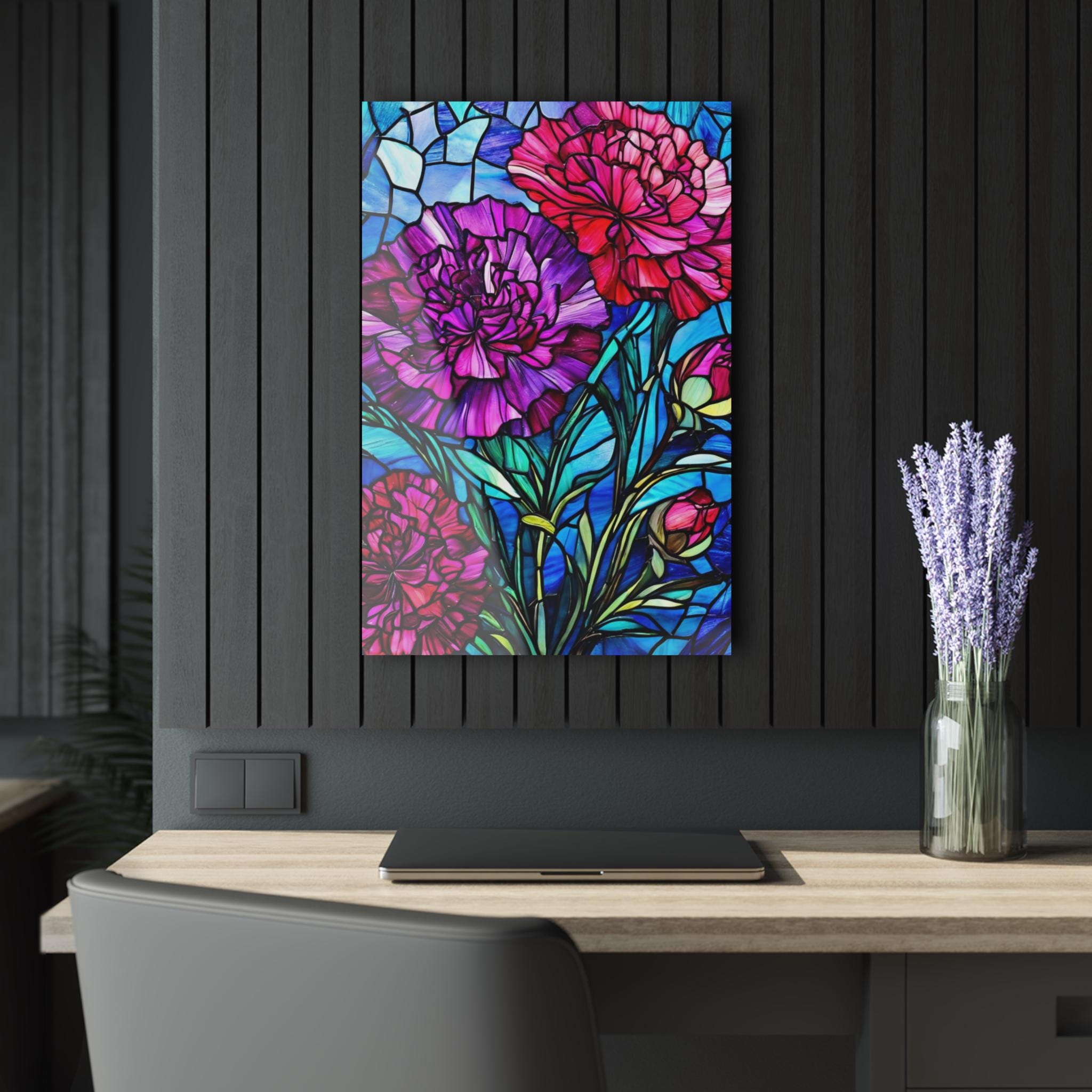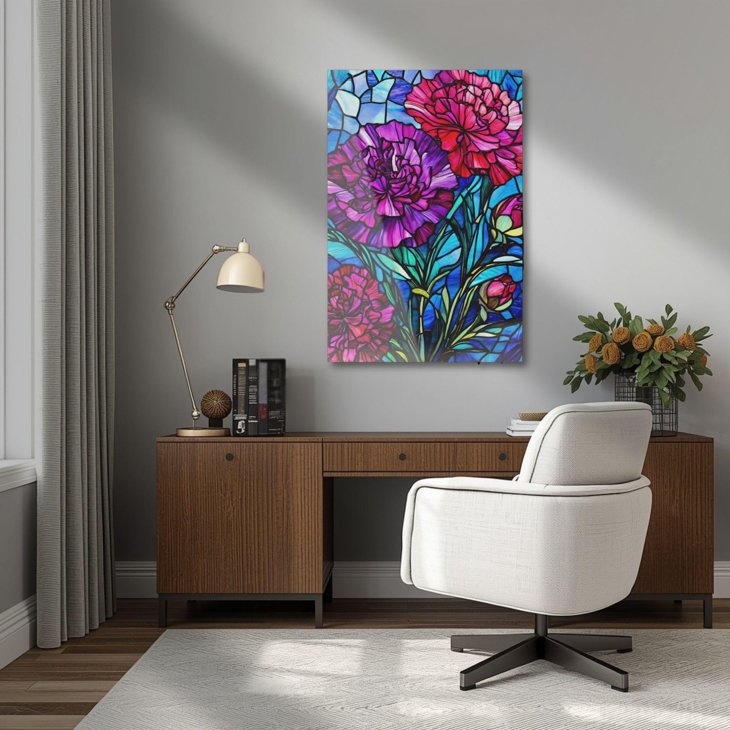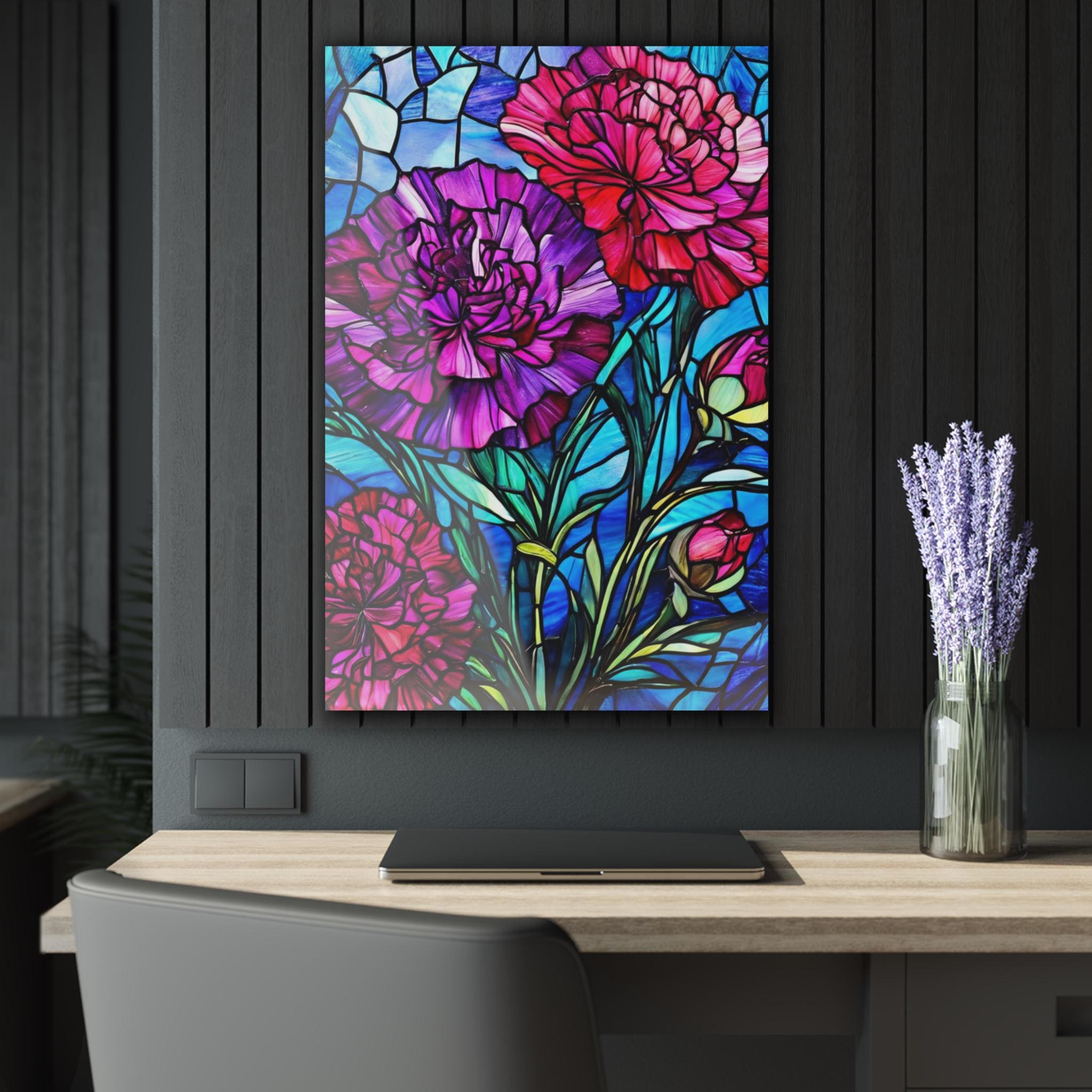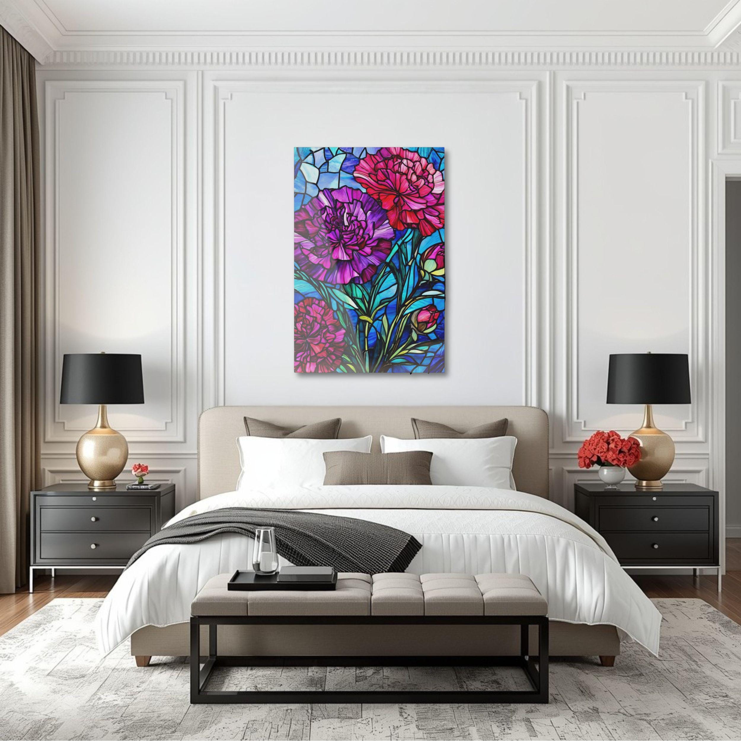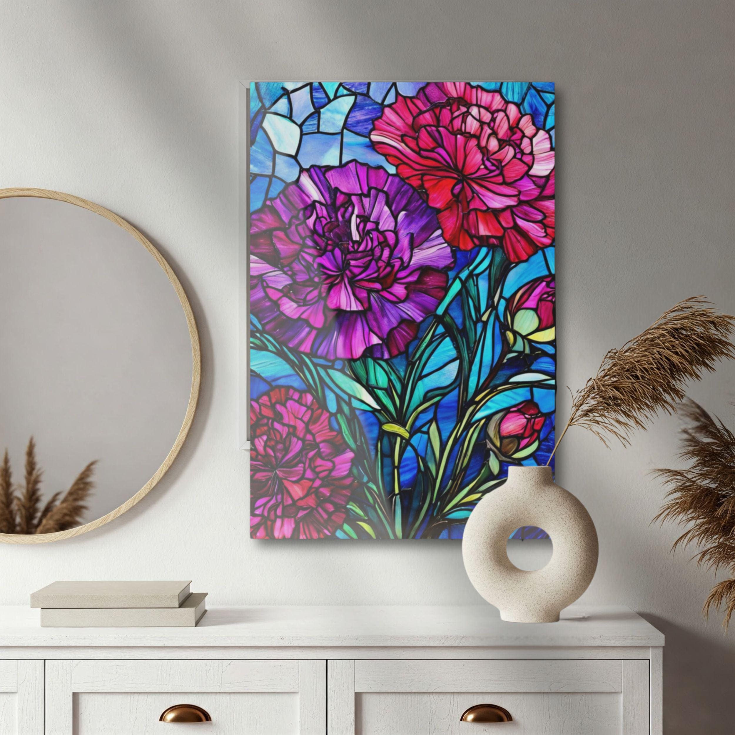 Vibrant color and glossy depth make this acrylic art piece feel alive on the wall. Printed on archival photographic paper with fade-resistant inks and fused to 0.25" grade-A acrylic, the image sits beneath a crystal-clear surface that amplifies color and contrast. The white vinyl backing sharpens detail while the hand-polished edges catch light like a gem. A French cleat system is pre-installed for rock-solid, level hanging — screws and setup instructions included — so the piece mounts cleanly and stays secure. Water-resistant and easy to wipe clean, this print brings museum-quality presence to living rooms, studios, or entryways where bold, stained-glass–like florals can set the tone.