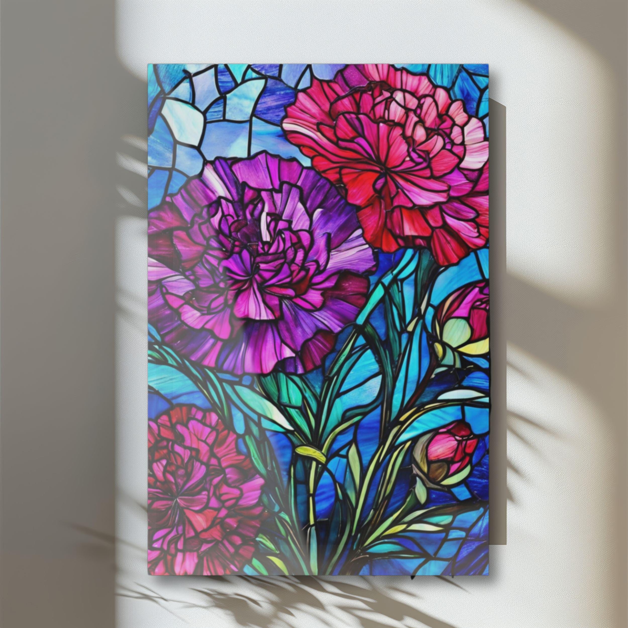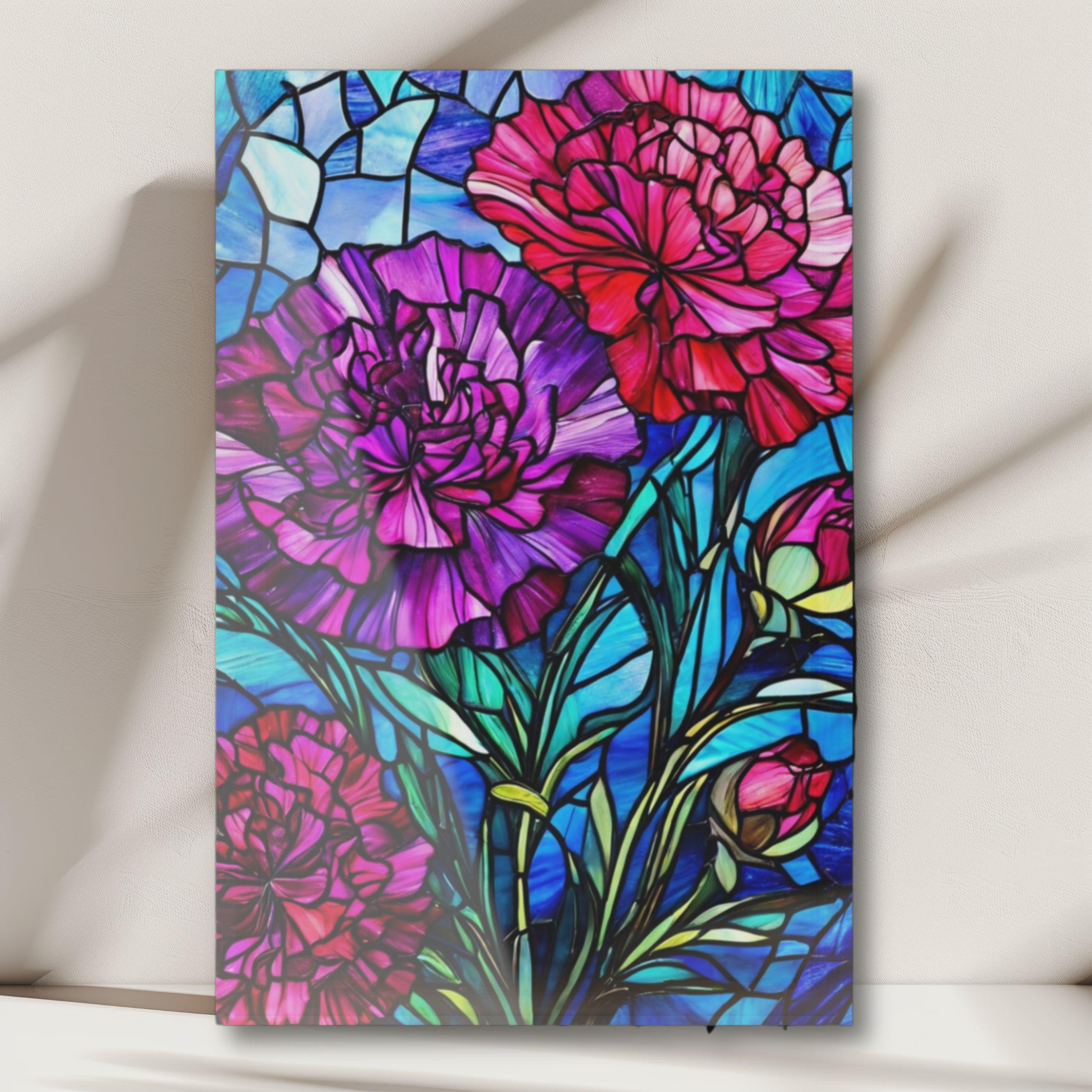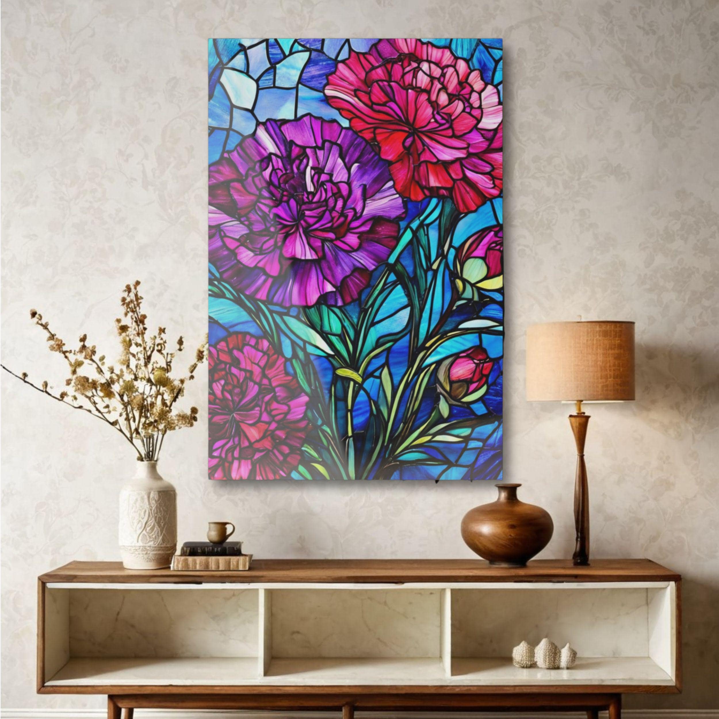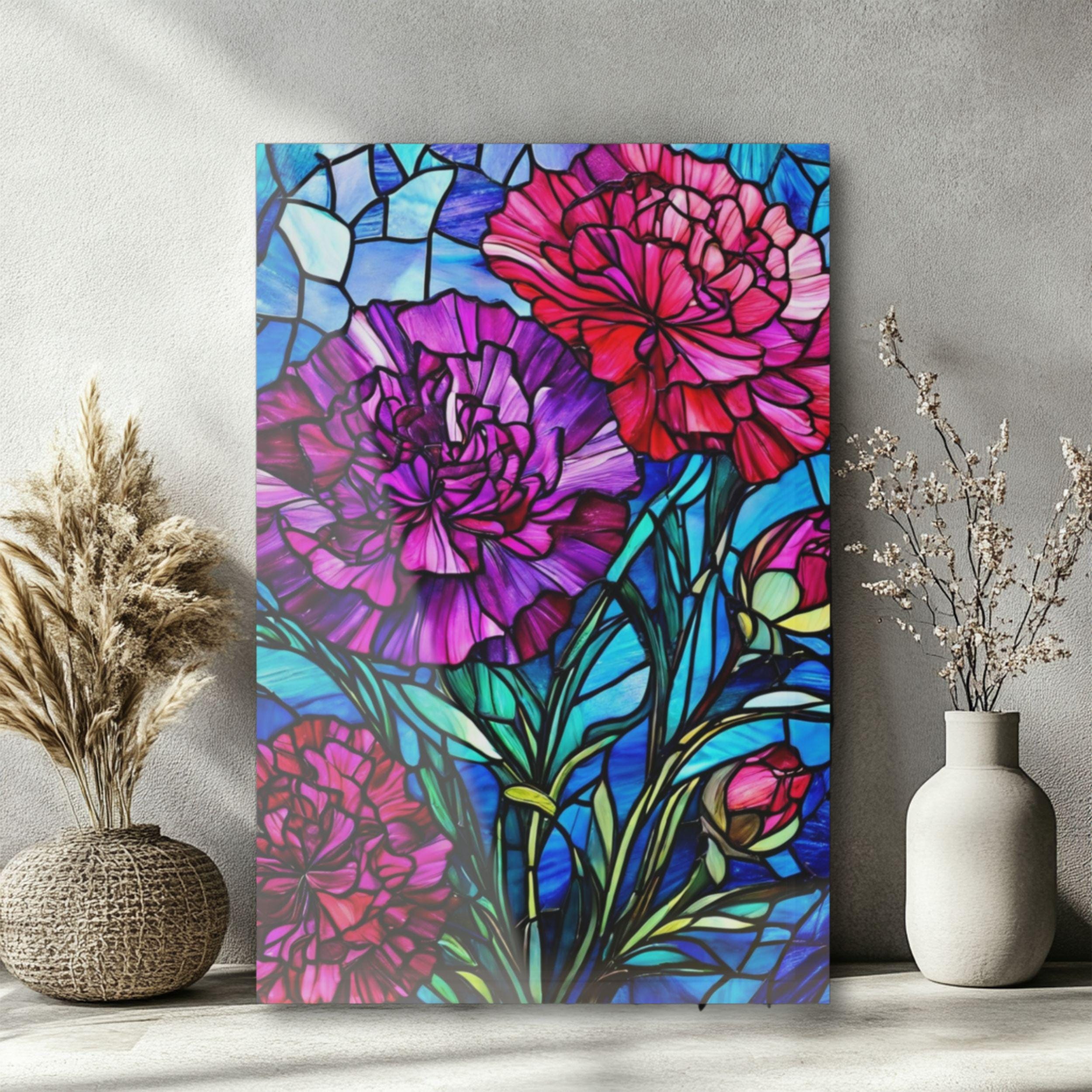 Vibrant color and glossy depth make this acrylic art piece feel alive on the wall. Printed on archival photographic paper with fade-resistant inks and fused to 0.25" grade-A acrylic, the image sits beneath a crystal-clear surface that amplifies color and contrast. The white vinyl backing sharpens detail while the hand-polished edges catch light like a gem. A French cleat system is pre-installed for rock-solid, level hanging — screws and setup instructions included — so the piece mounts cleanly and stays secure. Water-resistant and easy to wipe clean, this print brings museum-quality presence to living rooms, studios, or entryways where bold, stained-glass–like florals can set the tone.