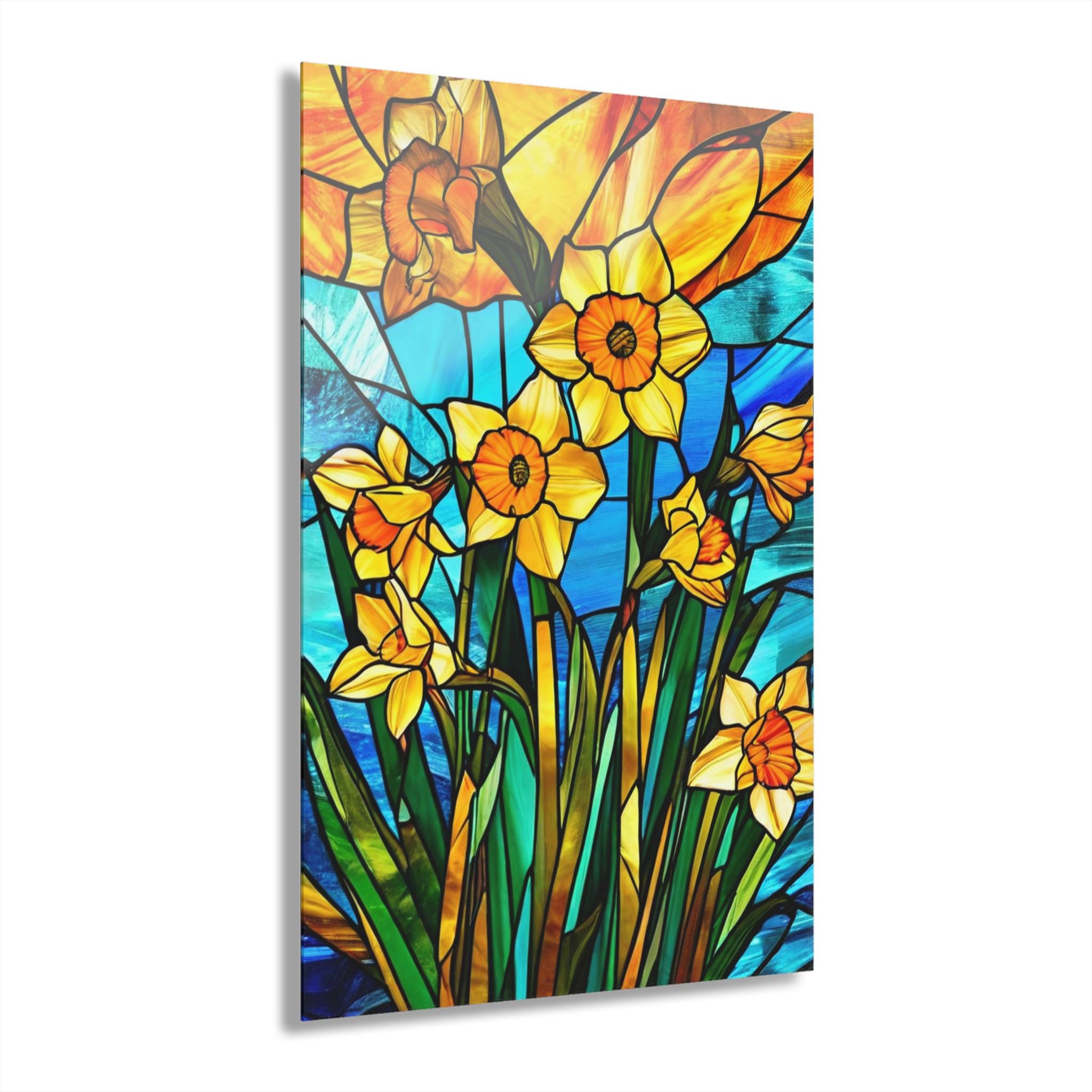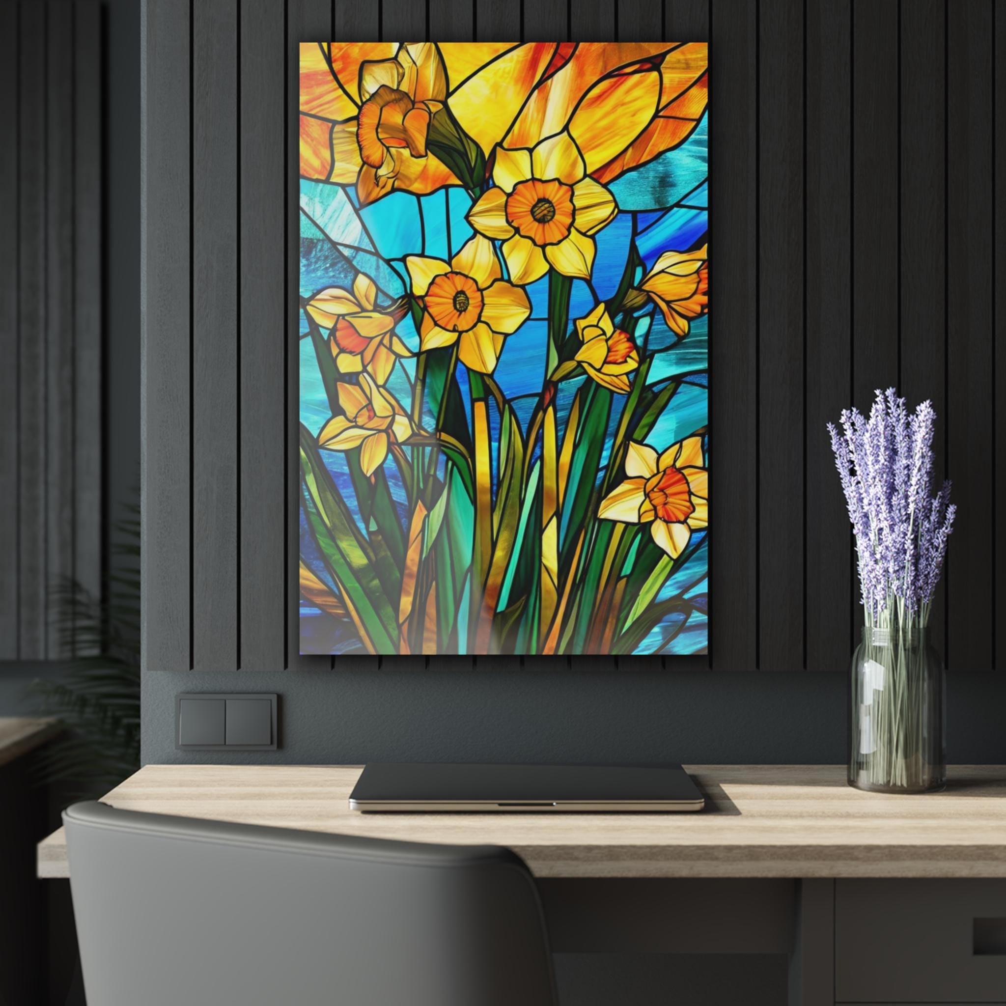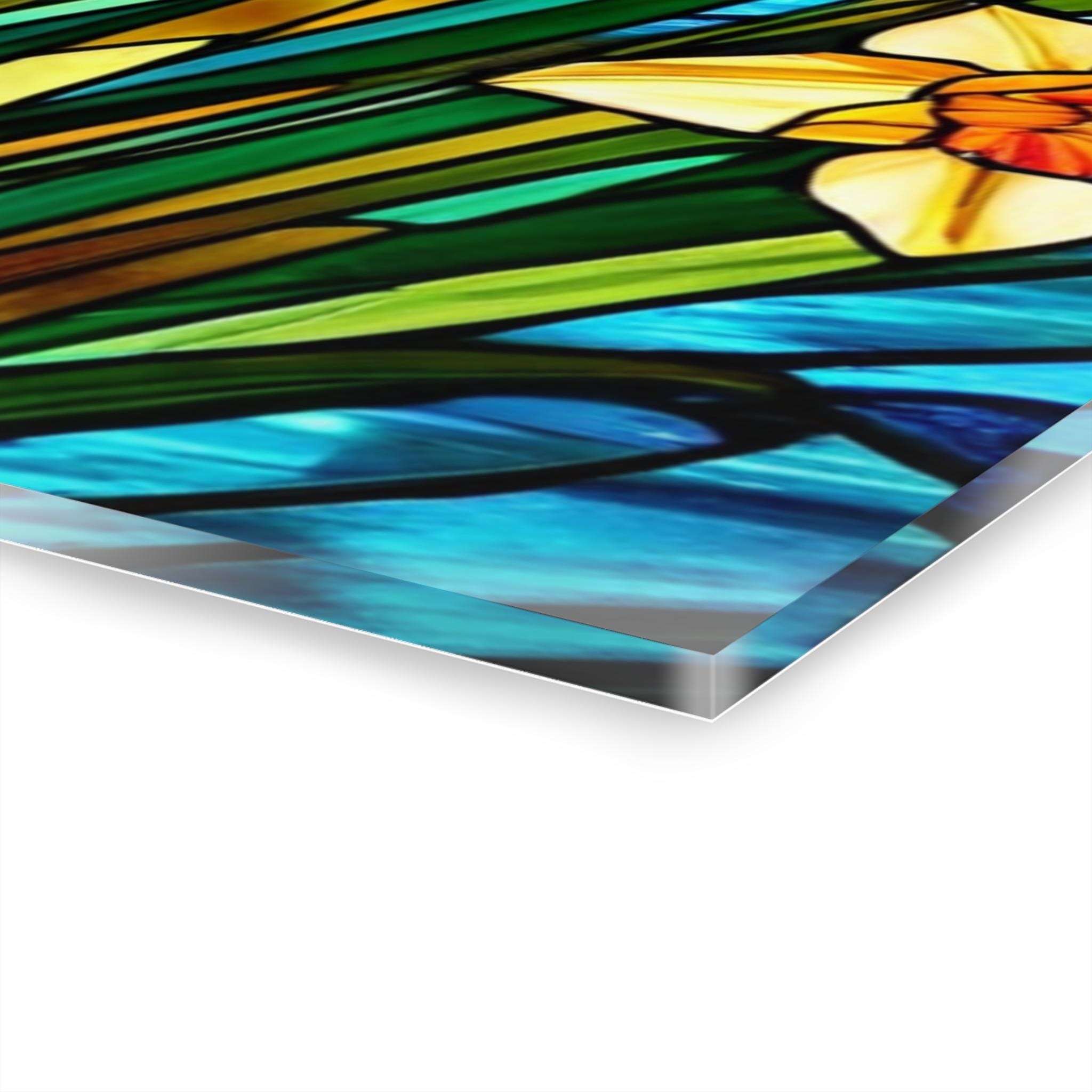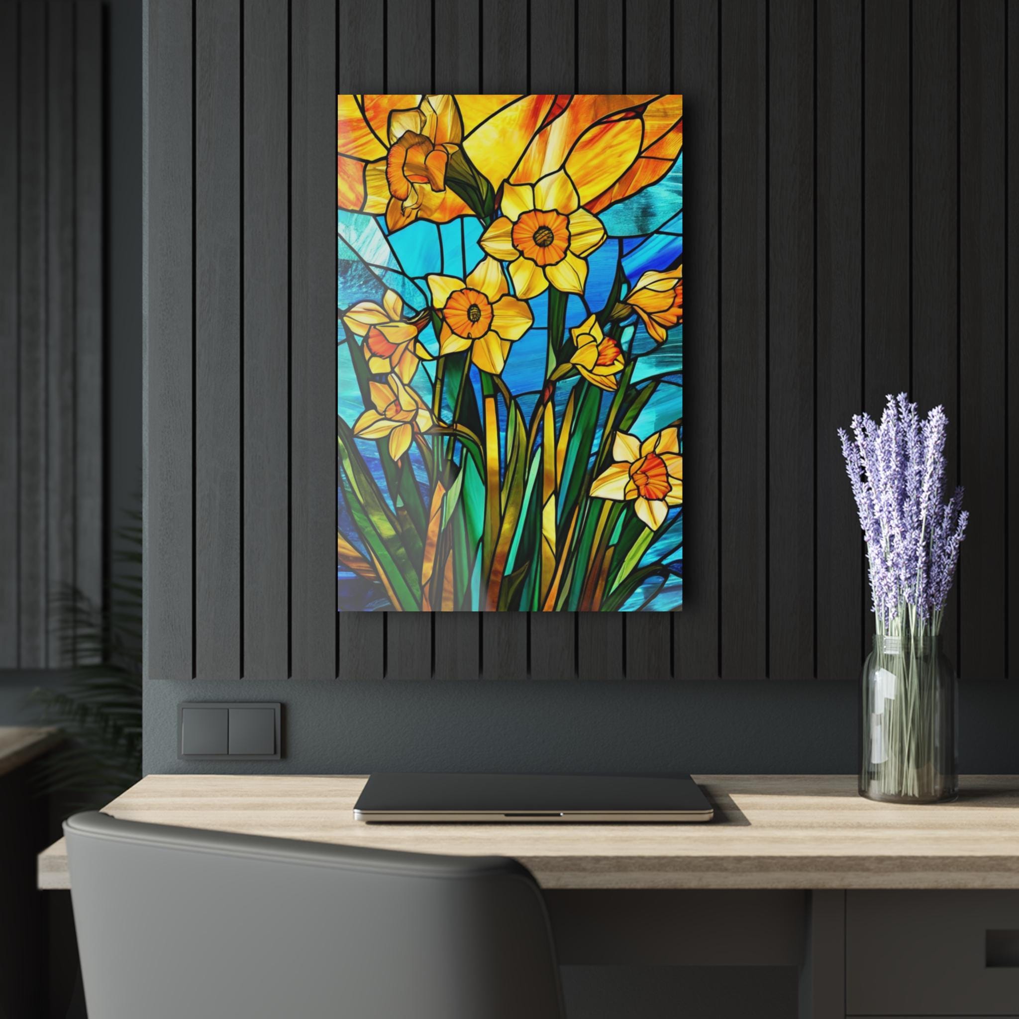 Bring stained-glass warmth to your wall with this vibrant acrylic print. Sunlit daffodils jump from deep turquoise and amber panes, their color and texture preserved in a high-definition archival print fused to crystal-clear acrylic. The glossy surface and polished edges make the image glow from every angle, while the sturdy French cleat backing keeps the piece flush and secure. It cleans easily and resists moisture, so it fits lively spaces like kitchens, sunrooms, or entryways where light and life gather. Hang it vertically or horizontally to suit your space; the overall effect is bright, personal, and quietly joyful—like a pocket of spring captured in glass.