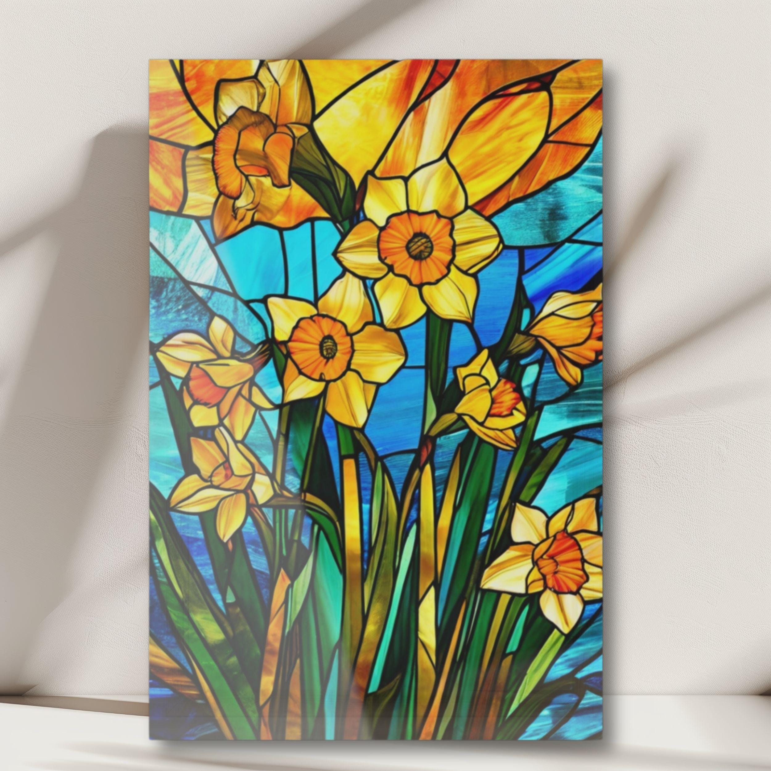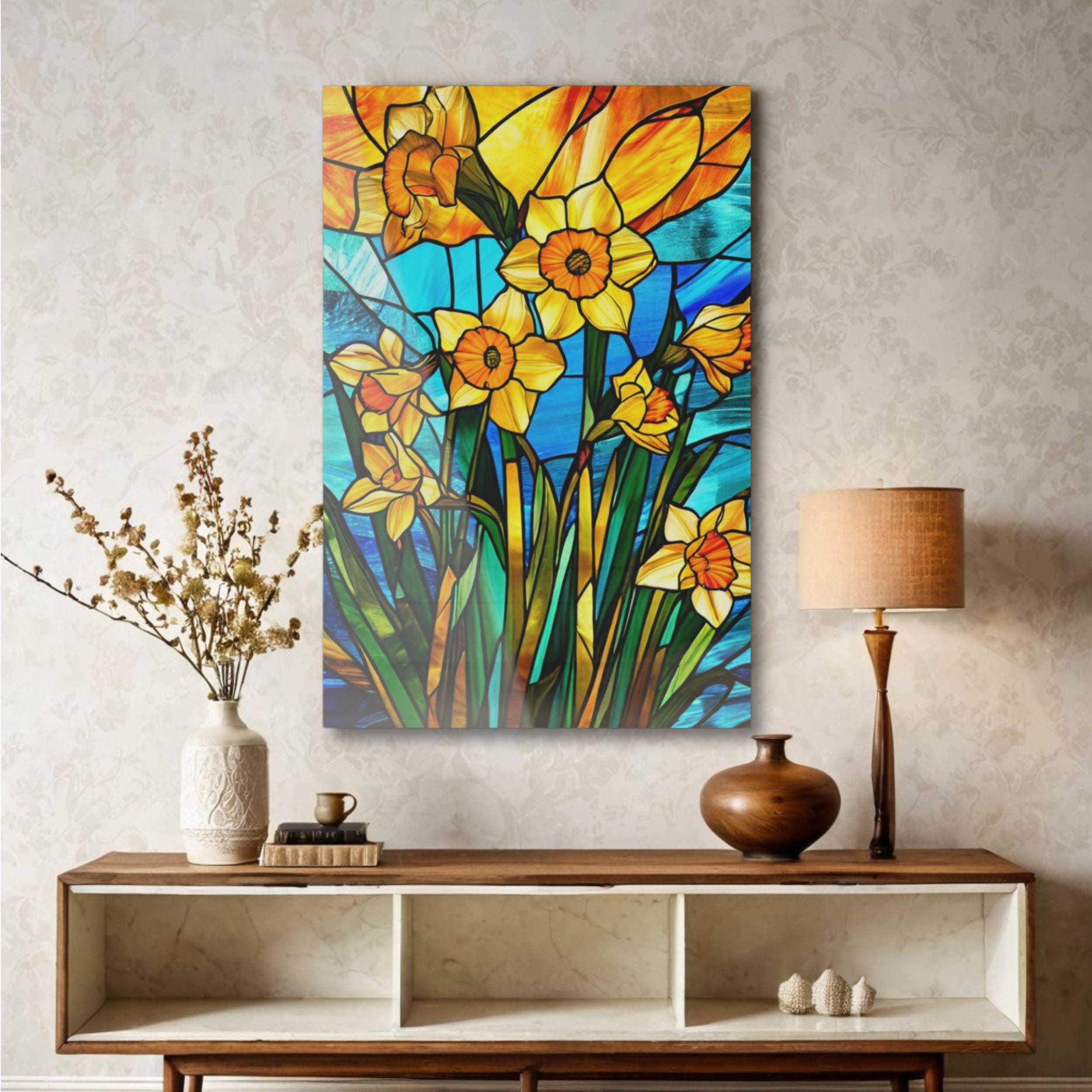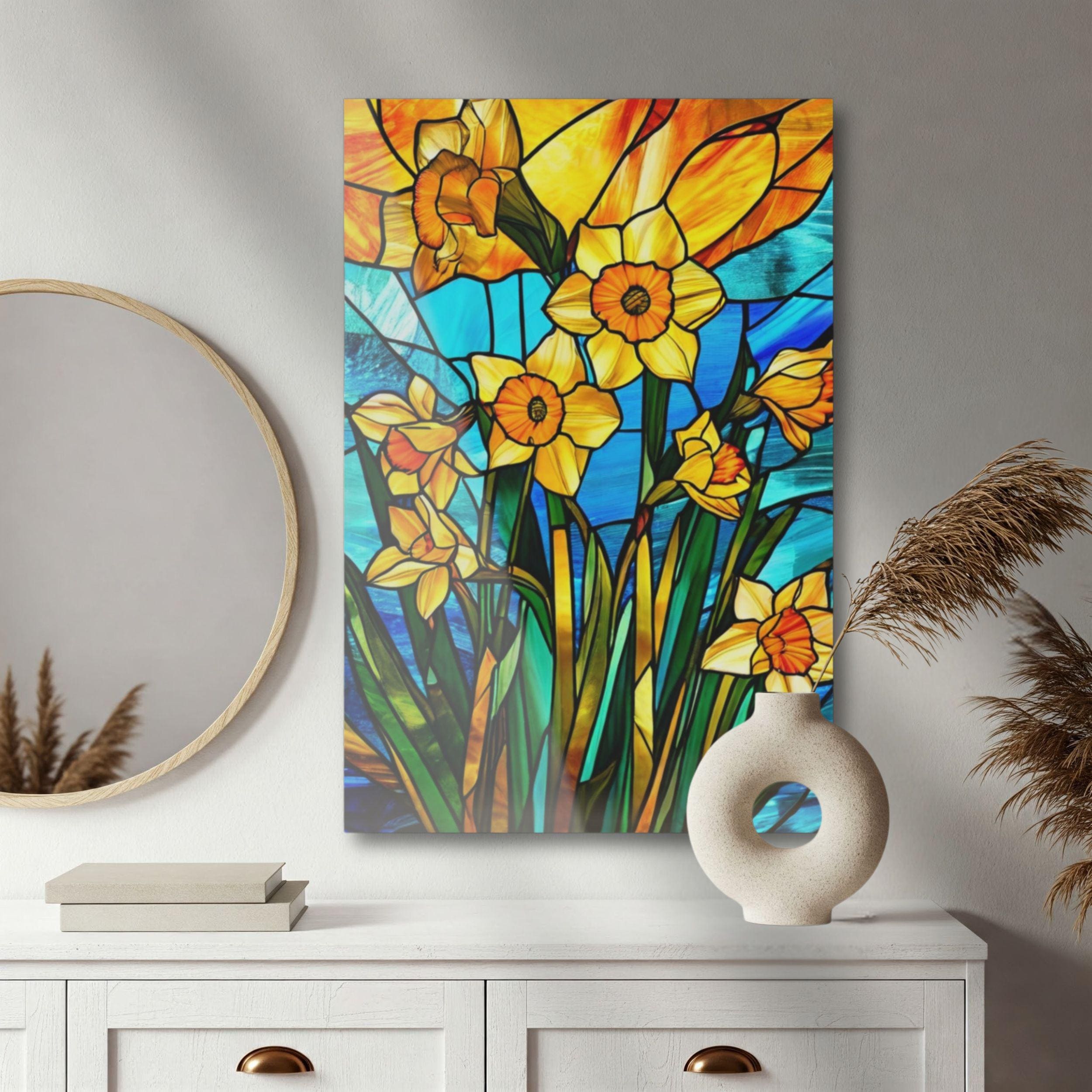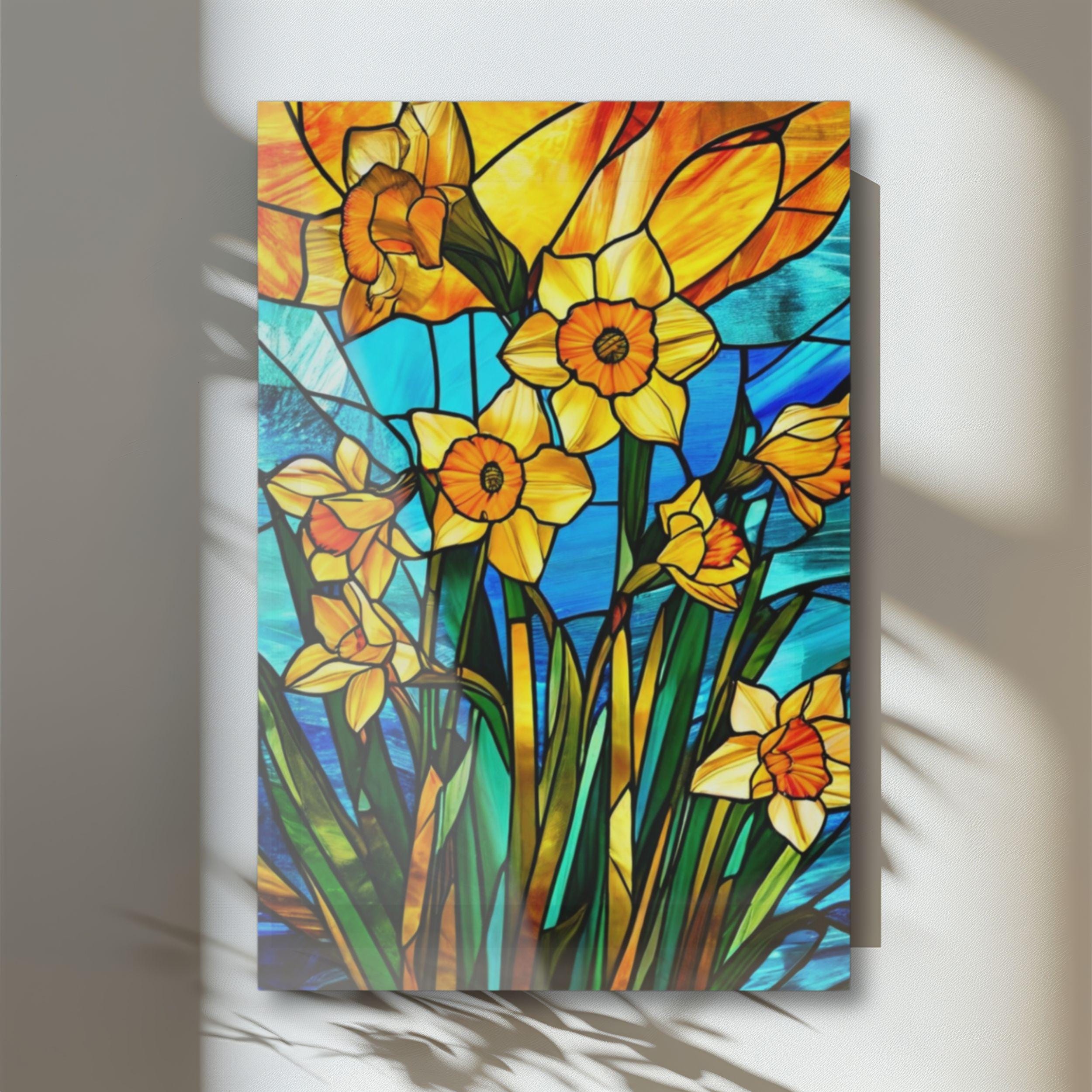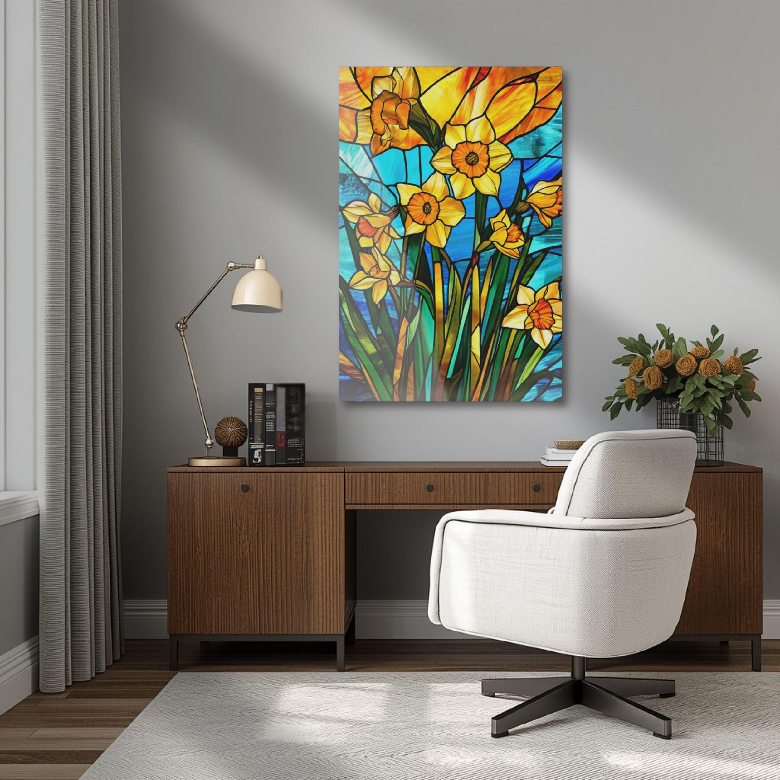 Bring stained-glass warmth to your wall with this vibrant acrylic print. Sunlit daffodils jump from deep turquoise and amber panes, their color and texture preserved in a high-definition archival print fused to crystal-clear acrylic. The glossy surface and polished edges make the image glow from every angle, while the sturdy French cleat backing keeps the piece flush and secure. It cleans easily and resists moisture, so it fits lively spaces like kitchens, sunrooms, or entryways where light and life gather. Hang it vertically or horizontally to suit your space; the overall effect is bright, personal, and quietly joyful—like a pocket of spring captured in glass.