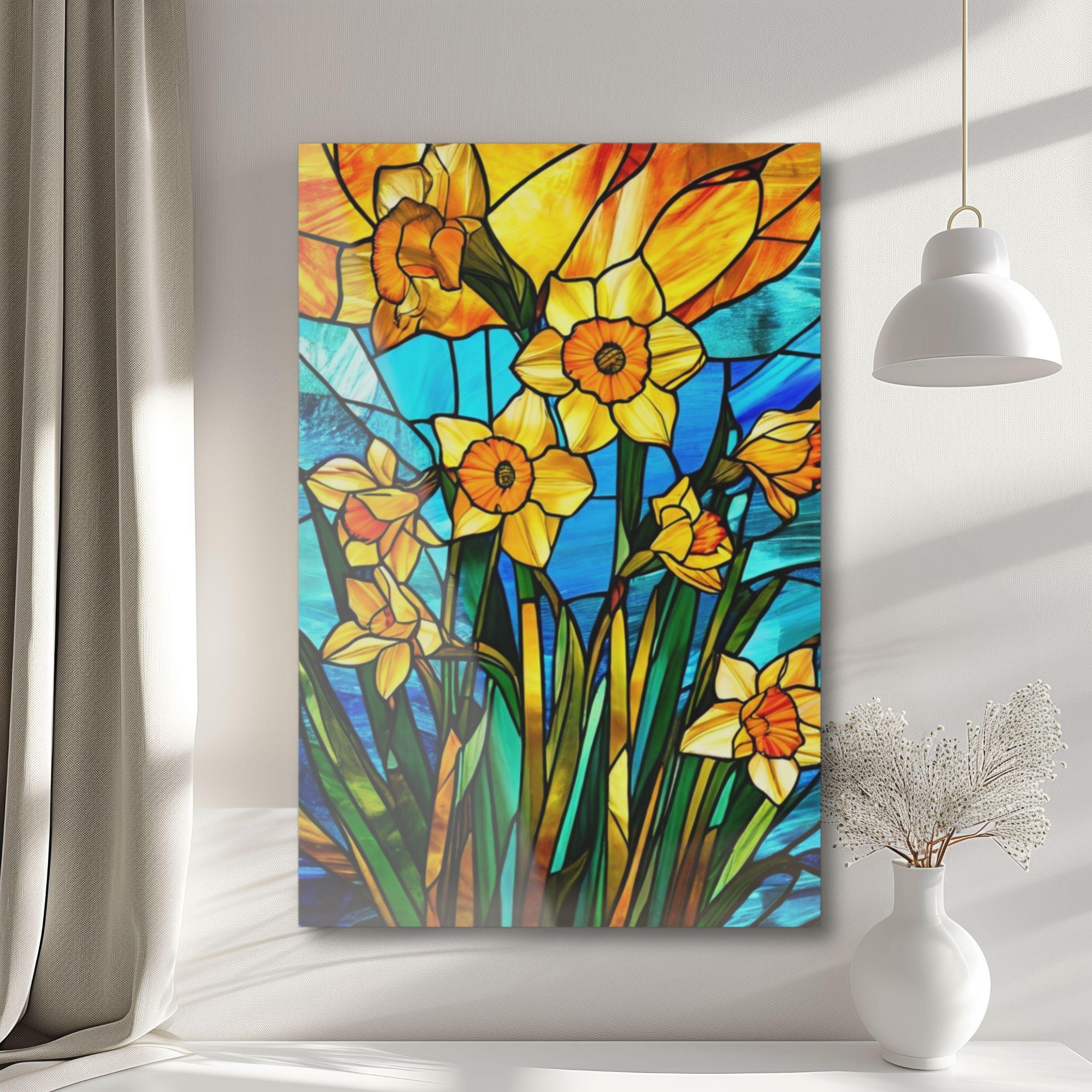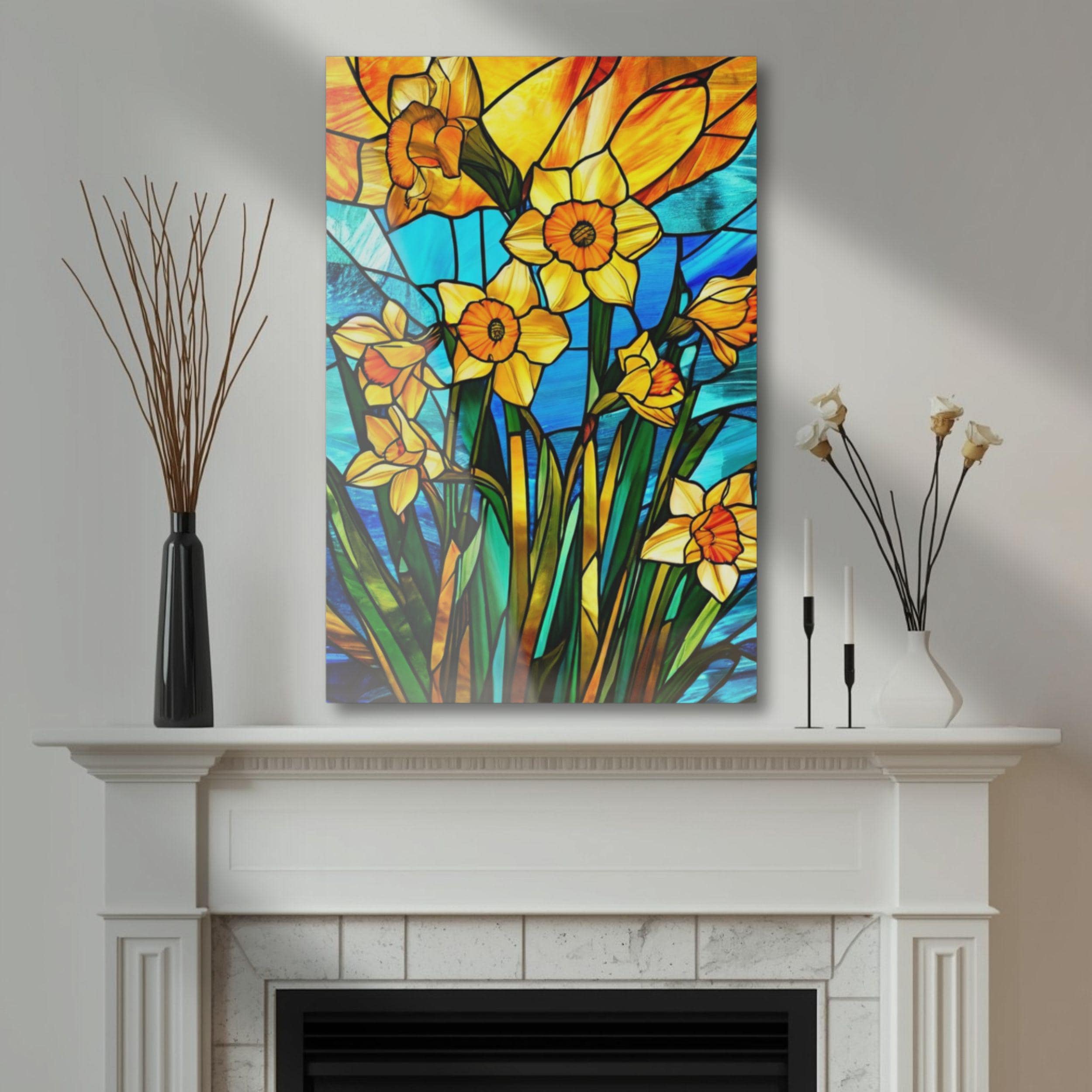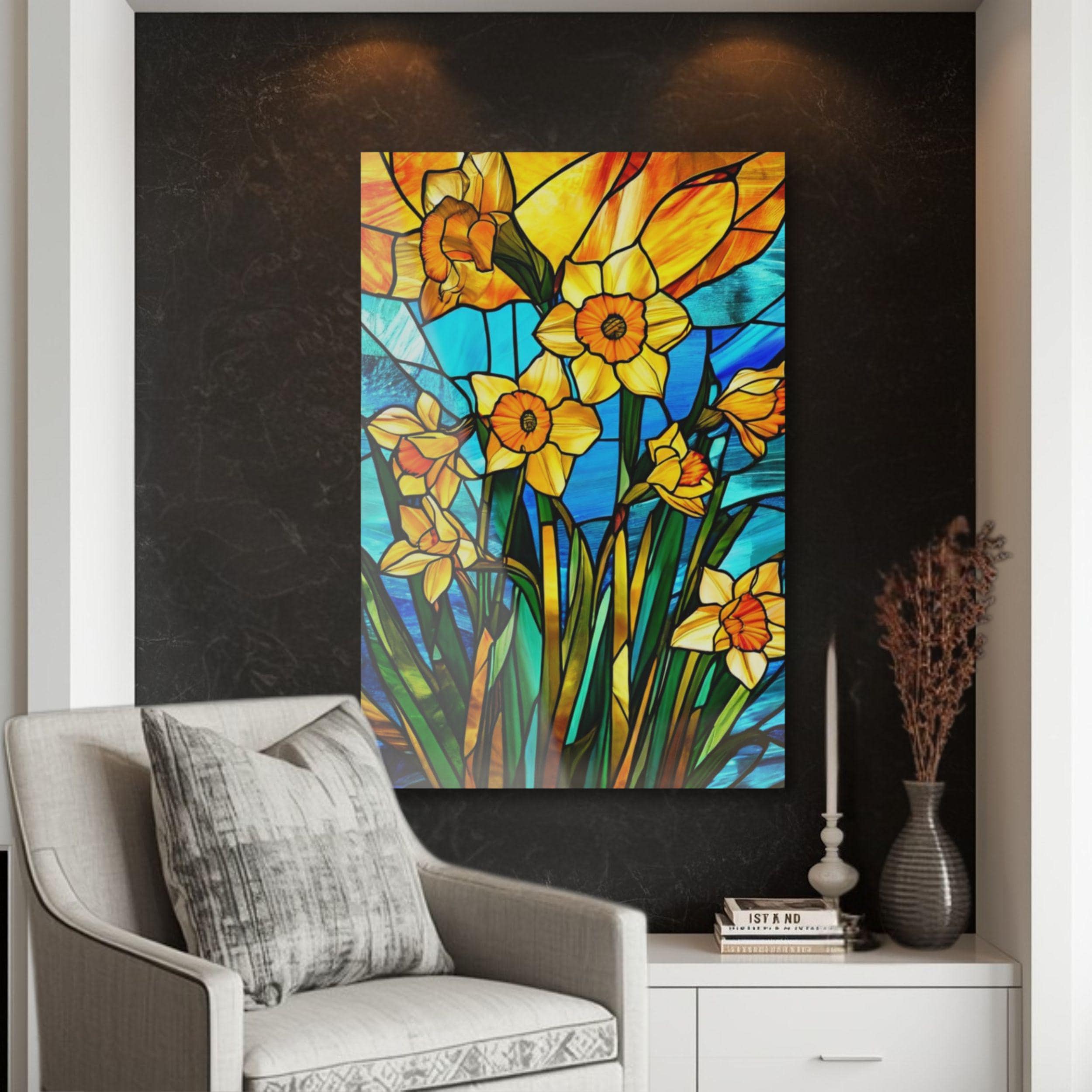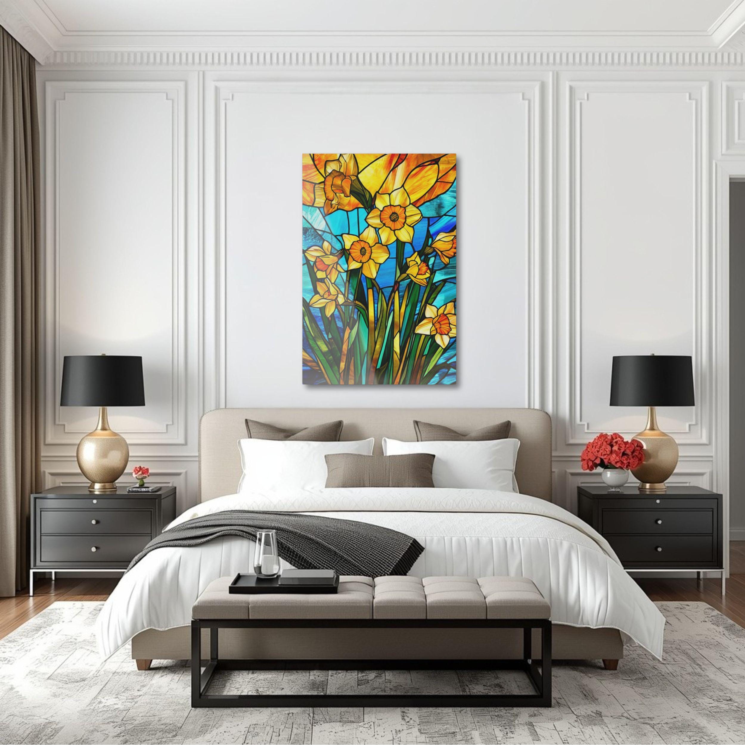 Bring stained-glass warmth to your wall with this vibrant acrylic print. Sunlit daffodils jump from deep turquoise and amber panes, their color and texture preserved in a high-definition archival print fused to crystal-clear acrylic. The glossy surface and polished edges make the image glow from every angle, while the sturdy French cleat backing keeps the piece flush and secure. It cleans easily and resists moisture, so it fits lively spaces like kitchens, sunrooms, or entryways where light and life gather. Hang it vertically or horizontally to suit your space; the overall effect is bright, personal, and quietly joyful—like a pocket of spring captured in glass.