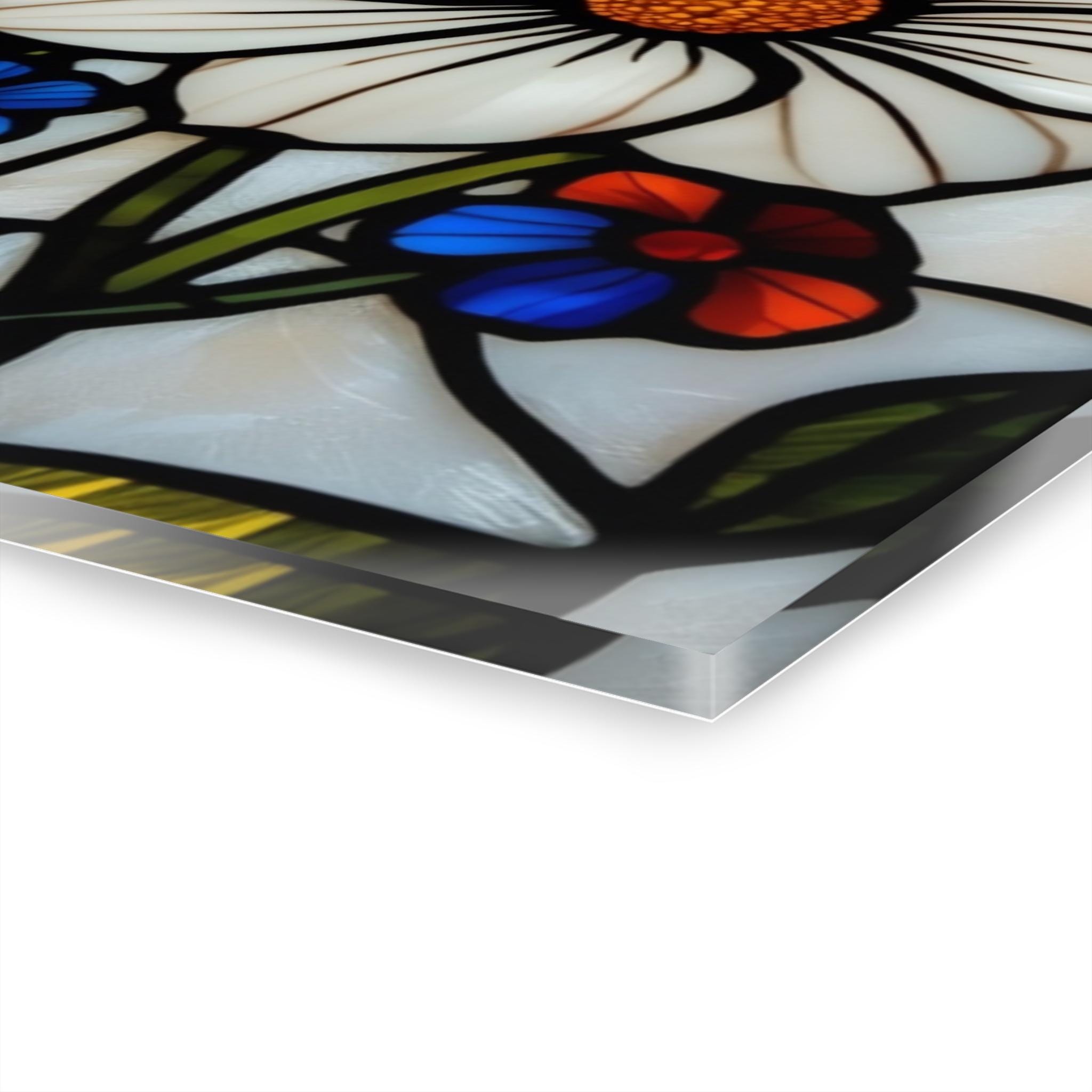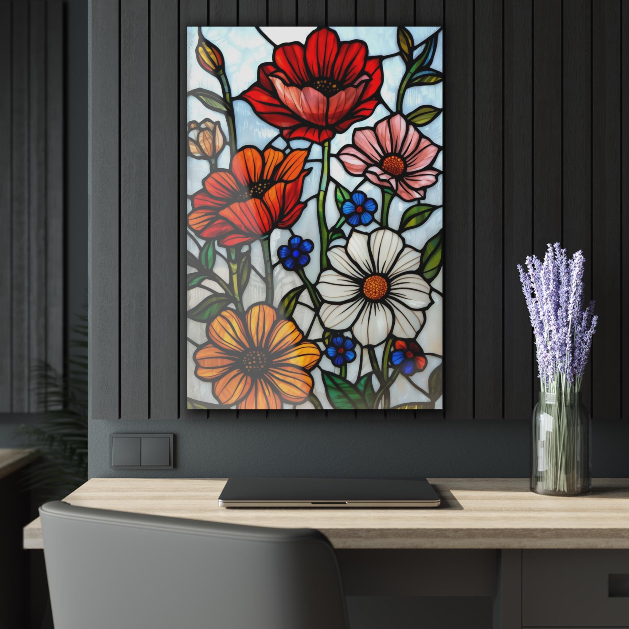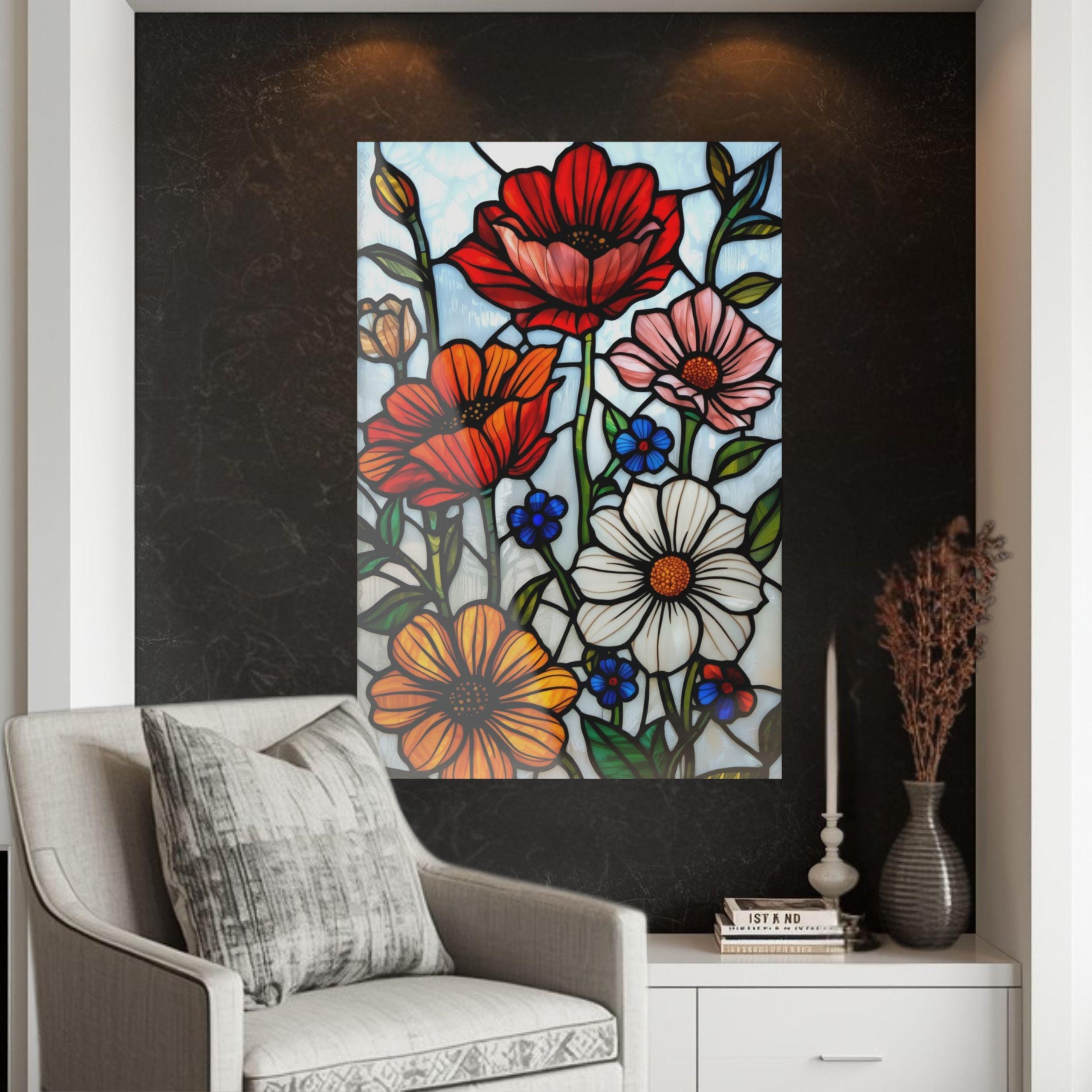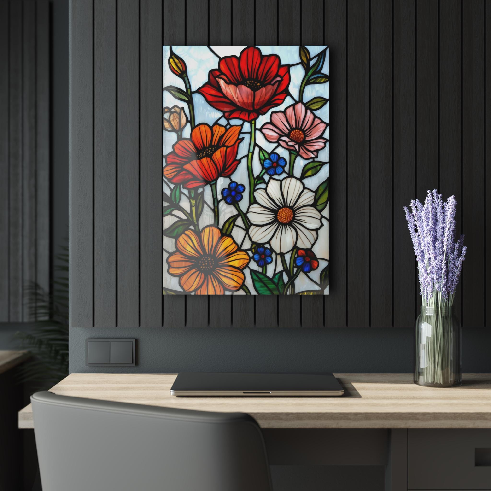 A vibrant acrylic print that brings stained-glass style florals to your wall. Bright reds, warm oranges, soft pinks and crisp whites pop against the glossy acrylic surface, giving depth and a luminous glow that changes with the light. The 0.25" grade-A acrylic and white vinyl backing sharpen colors and create a floating effect from the wall. Ready to hang with a secure french cleat system and included screws, this piece cleans easily and resists moisture — a living-room focal point, hallway accent, or a burst of color for a cozy reading nook.
