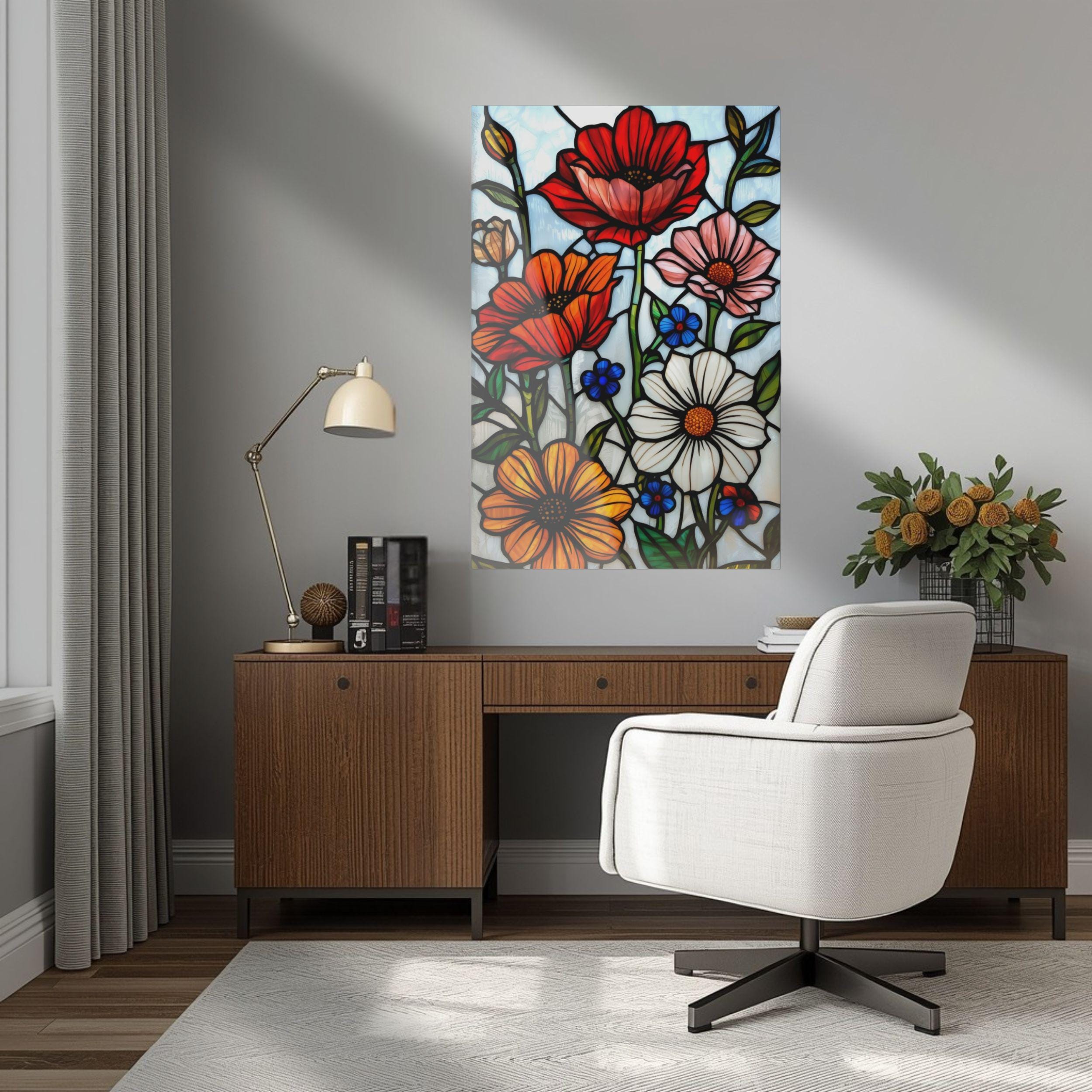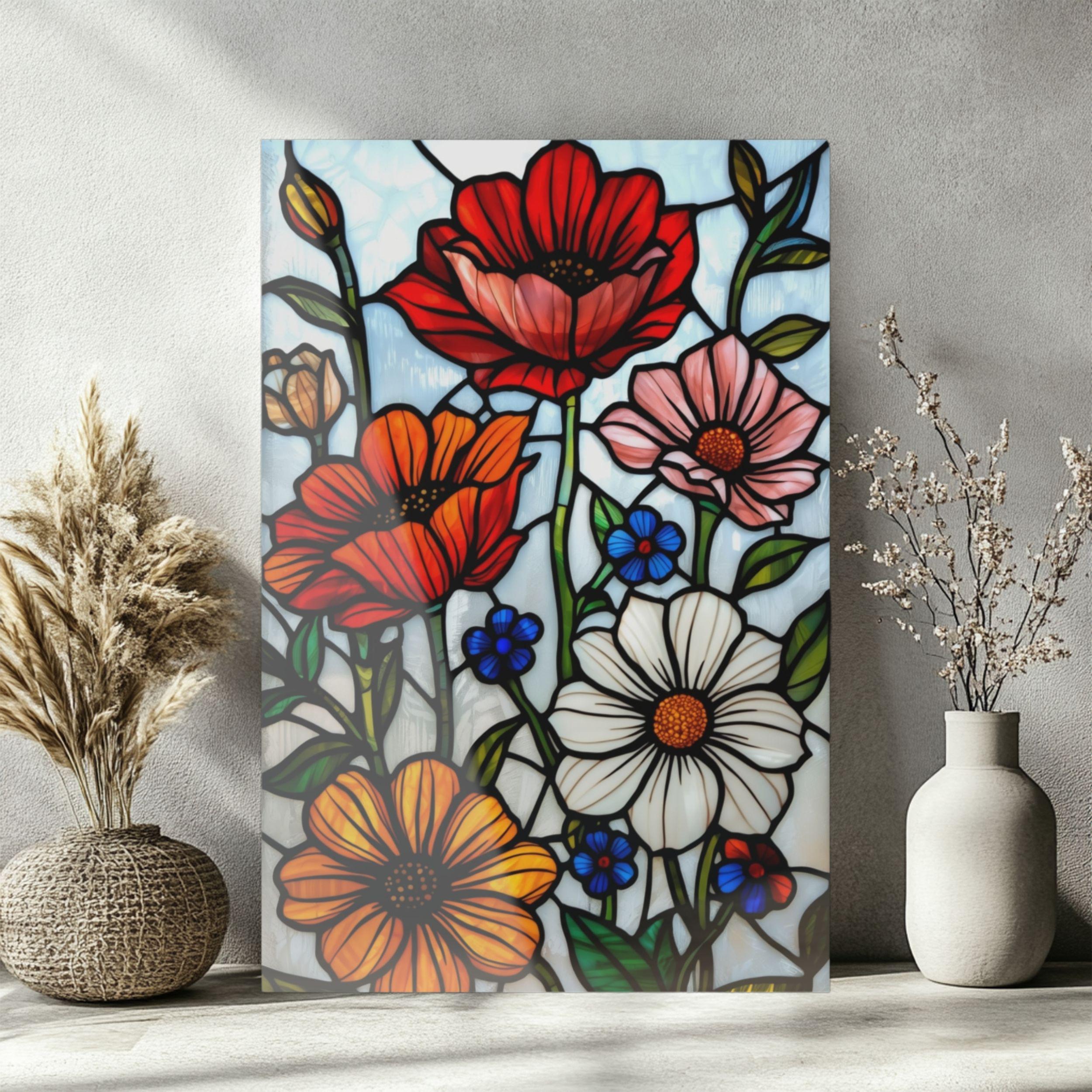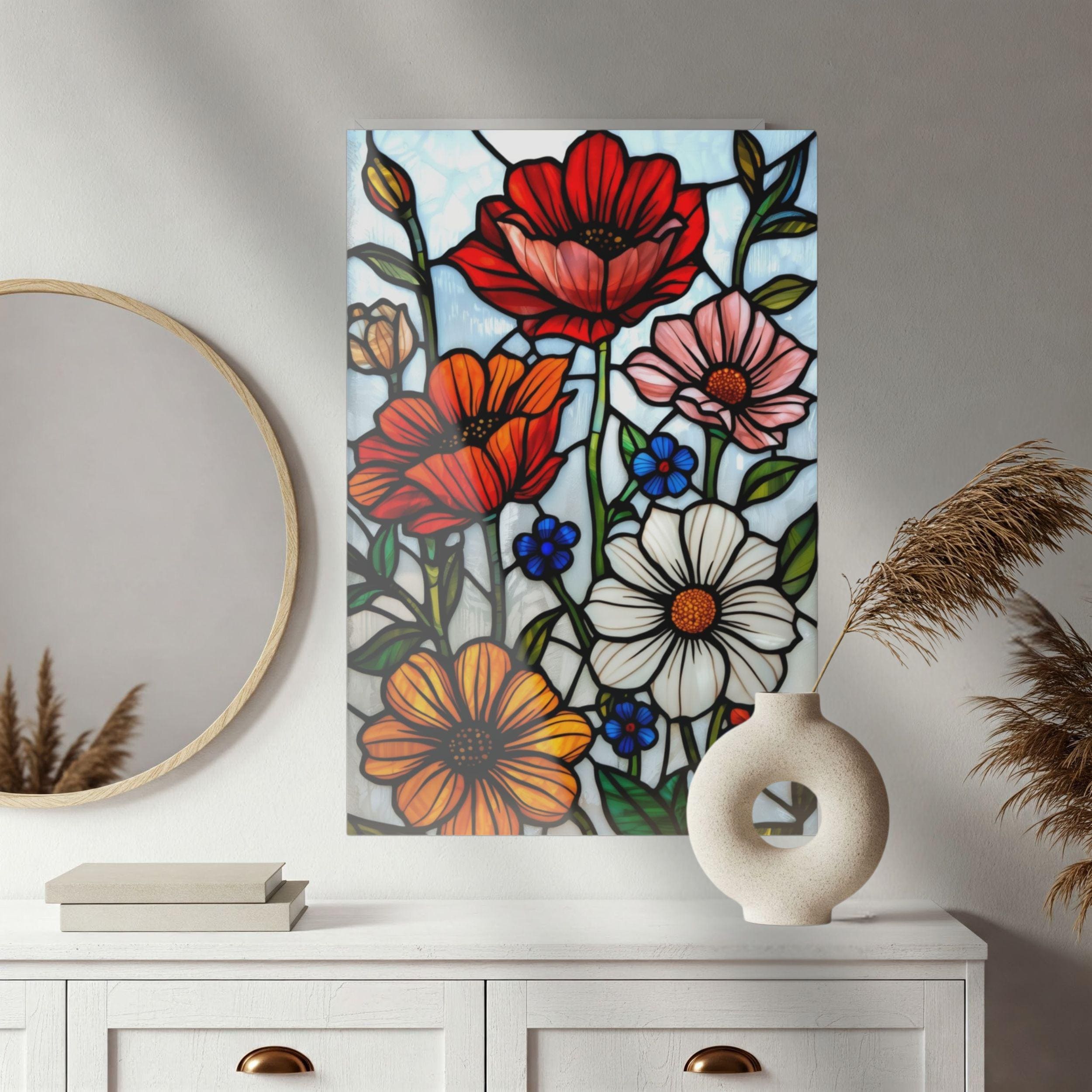 A vibrant acrylic print that brings stained-glass style florals to your wall. Bright reds, warm oranges, soft pinks and crisp whites pop against the glossy acrylic surface, giving depth and a luminous glow that changes with the light. The 0.25" grade-A acrylic and white vinyl backing sharpen colors and create a floating effect from the wall. Ready to hang with a secure french cleat system and included screws, this piece cleans easily and resists moisture — a living-room focal point, hallway accent, or a burst of color for a cozy reading nook.