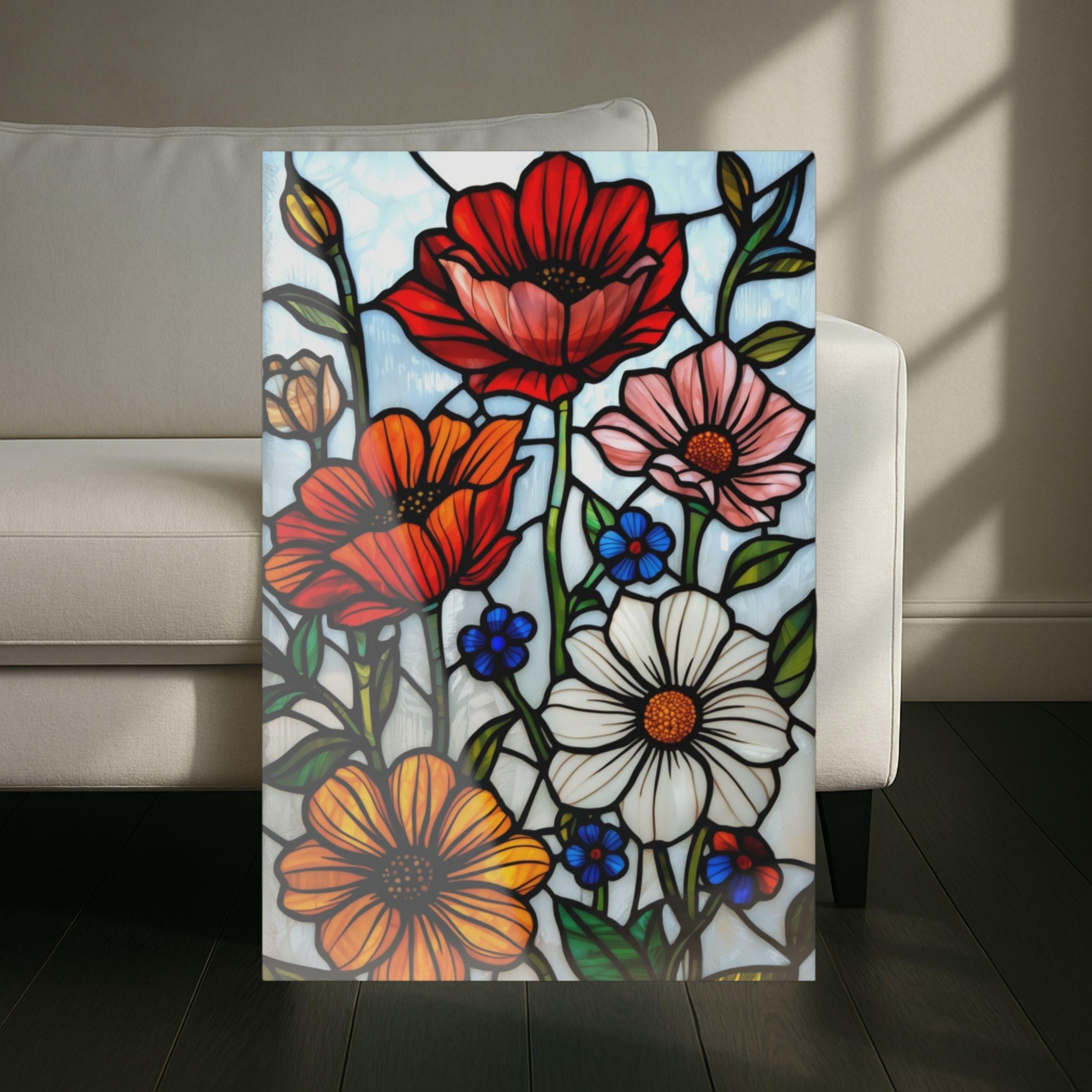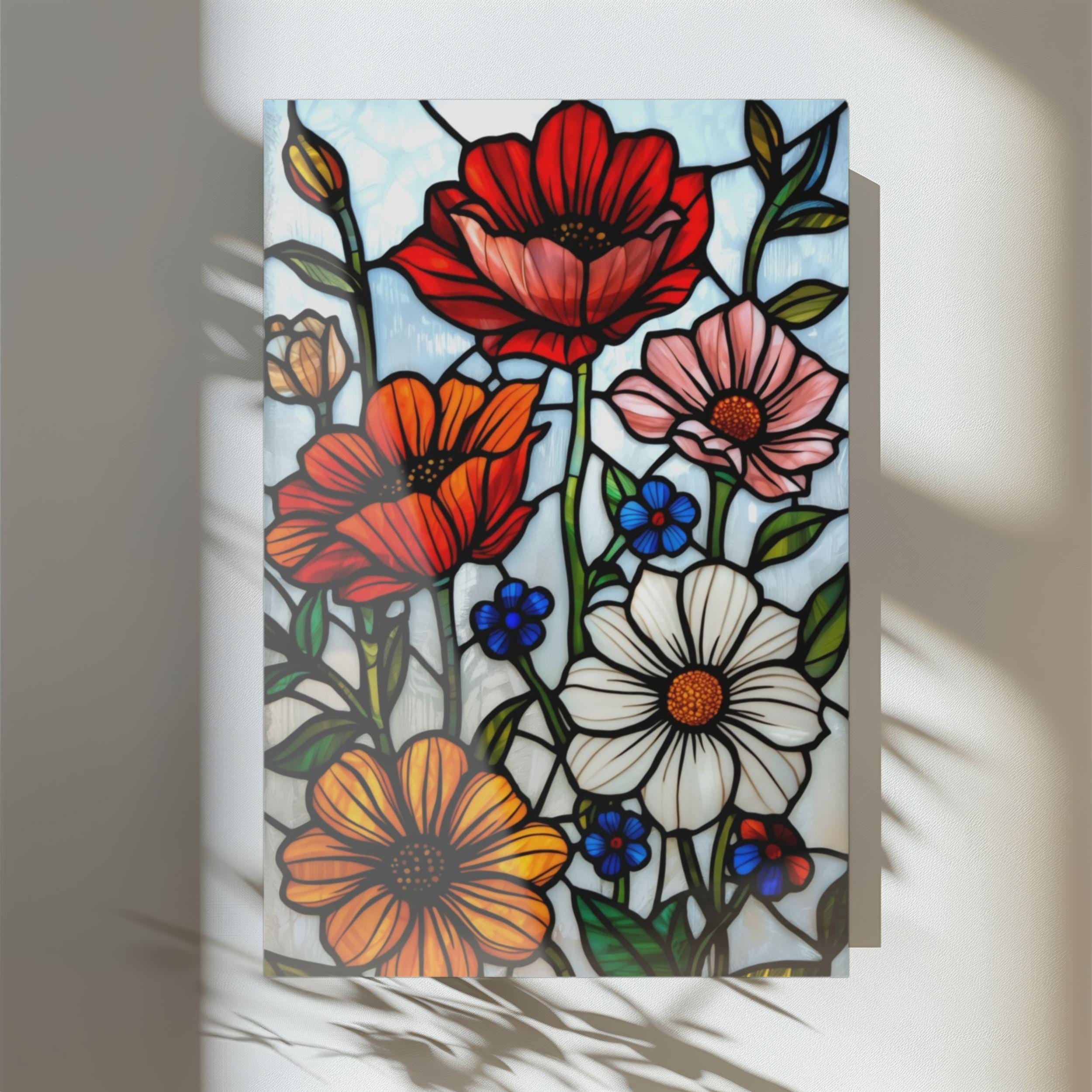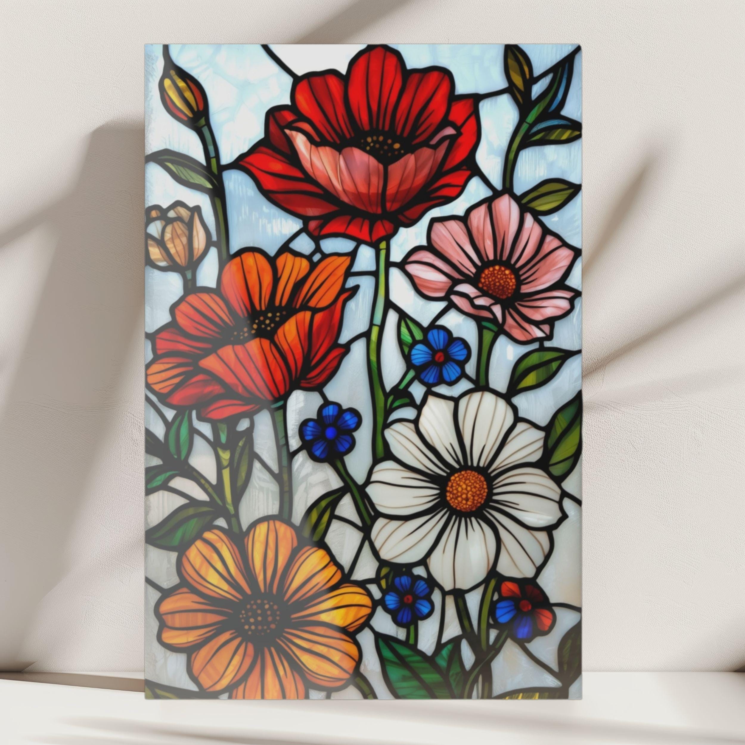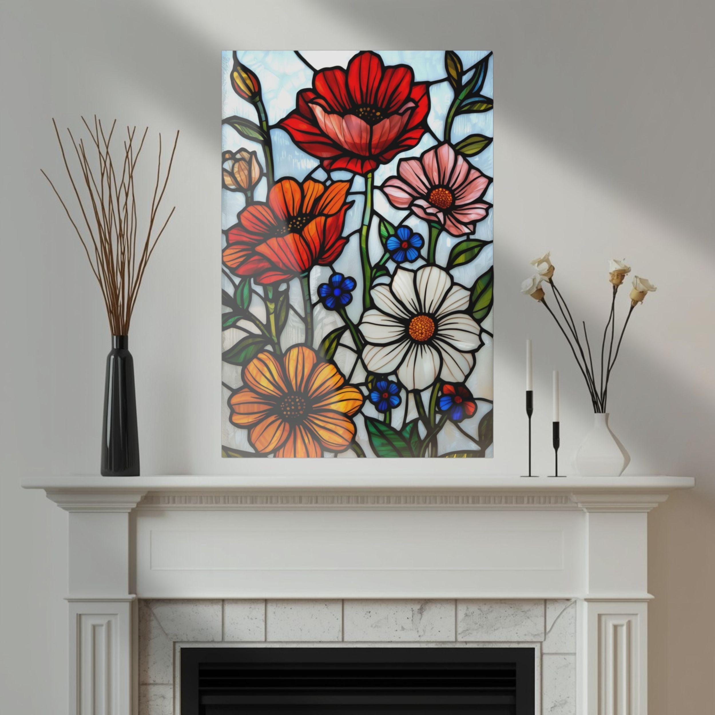 A vibrant acrylic print that brings stained-glass style florals to your wall. Bright reds, warm oranges, soft pinks and crisp whites pop against the glossy acrylic surface, giving depth and a luminous glow that changes with the light. The 0.25" grade-A acrylic and white vinyl backing sharpen colors and create a floating effect from the wall. Ready to hang with a secure french cleat system and included screws, this piece cleans easily and resists moisture — a living-room focal point, hallway accent, or a burst of color for a cozy reading nook.
