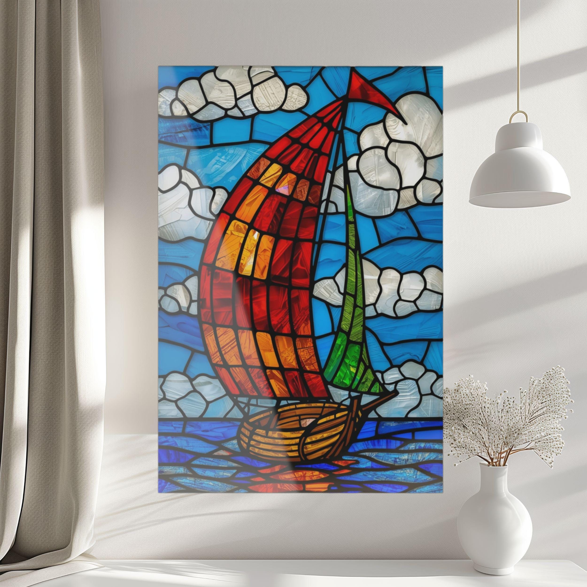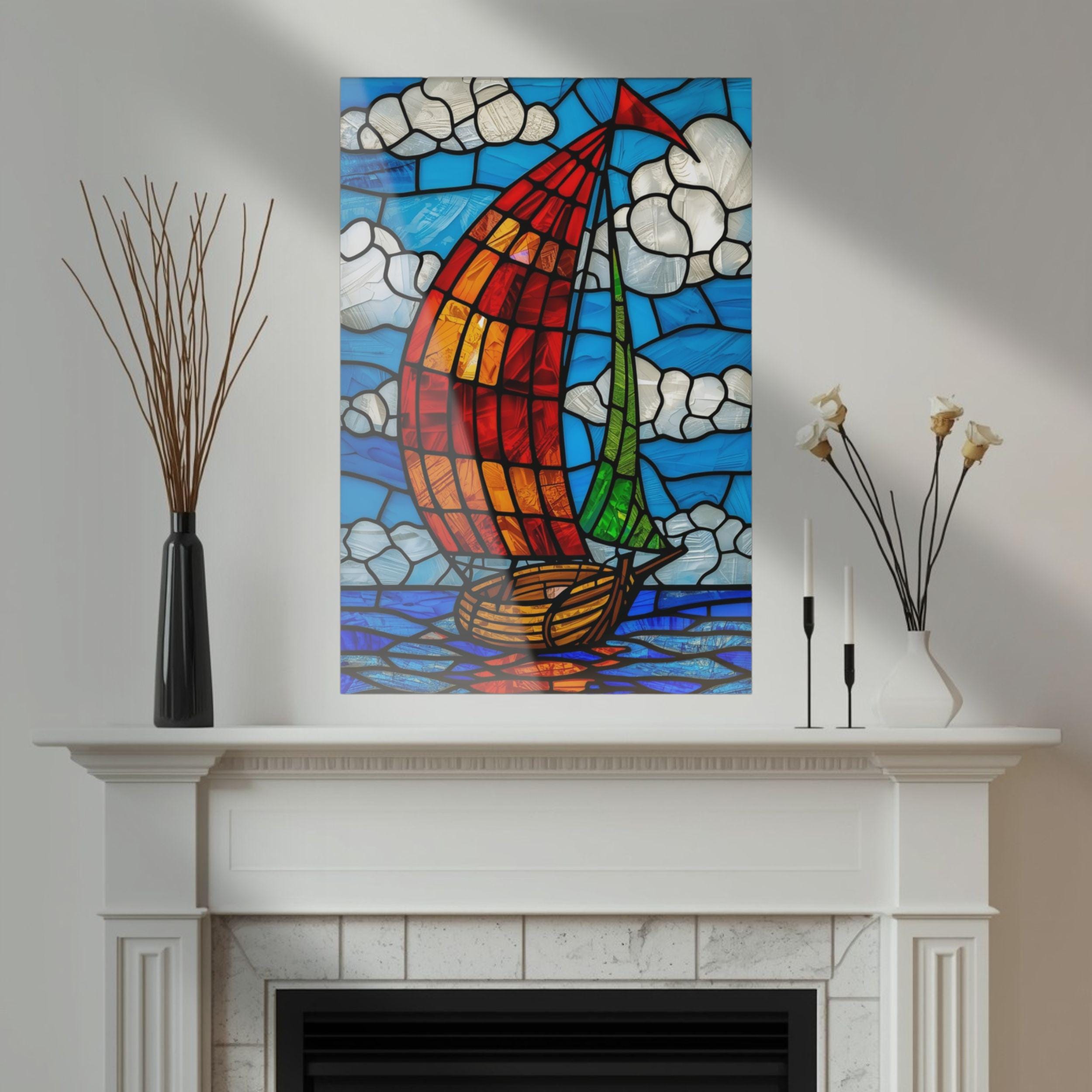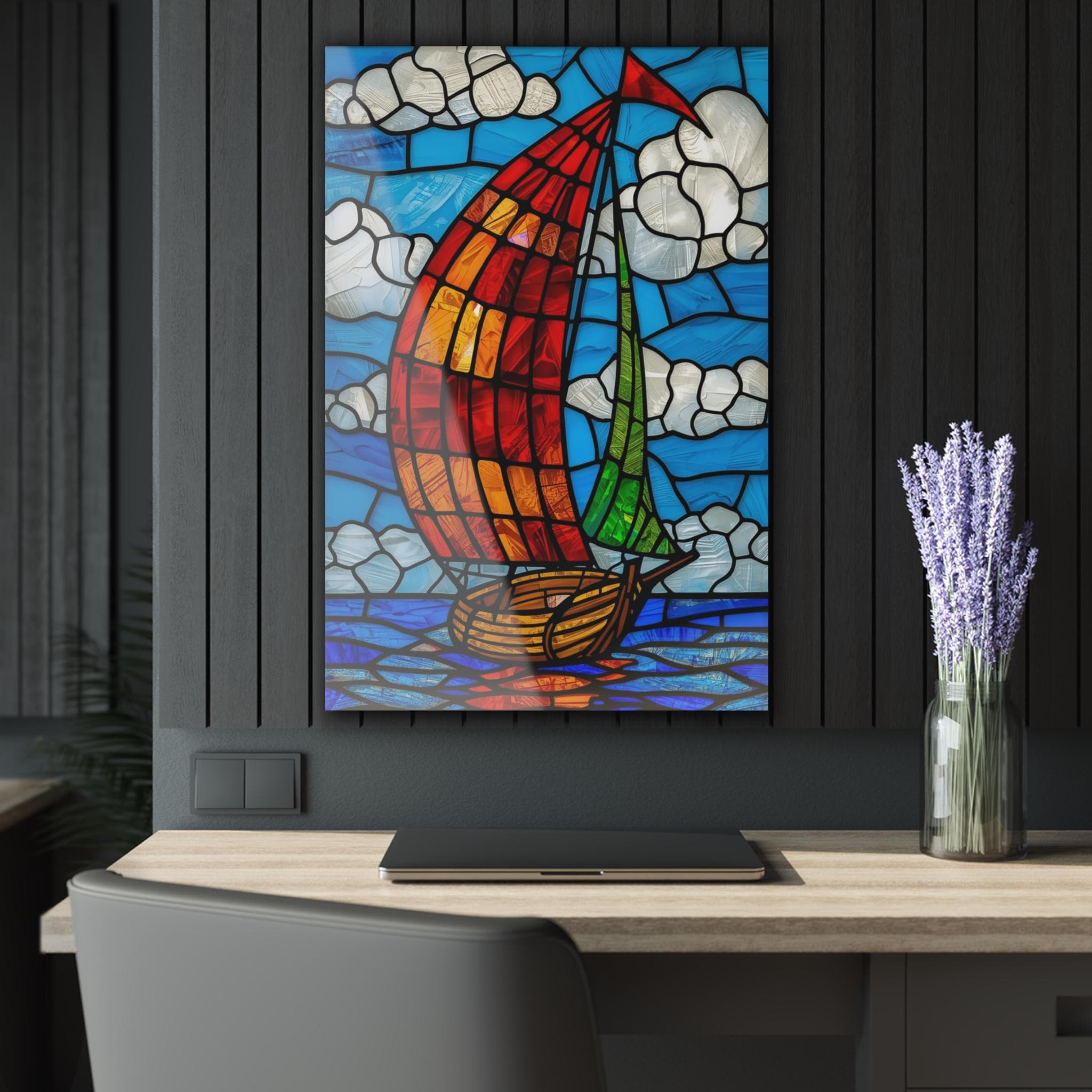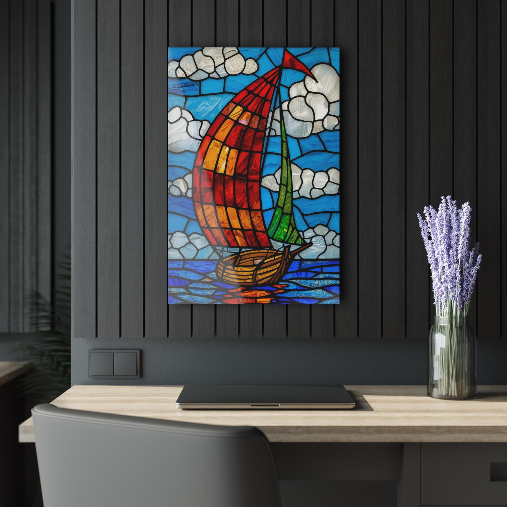 Bring a burst of color and nautical charm to any wall with this glossy acrylic print. The vibrant stained-glass sailboat design glows from within the 0.25" acrylic, creating depth and luminous clarity that feels like sunlight on water. The streamlined french cleat backing makes hanging secure and simple, while hand-polished edges give a clean, gallery-ready finish. Easy to wipe clean and available in multiple sizes and orientations, this piece slips effortlessly into coastal cottages, boat rooms, or a sunlit hallway where it can catch the light and start conversations.