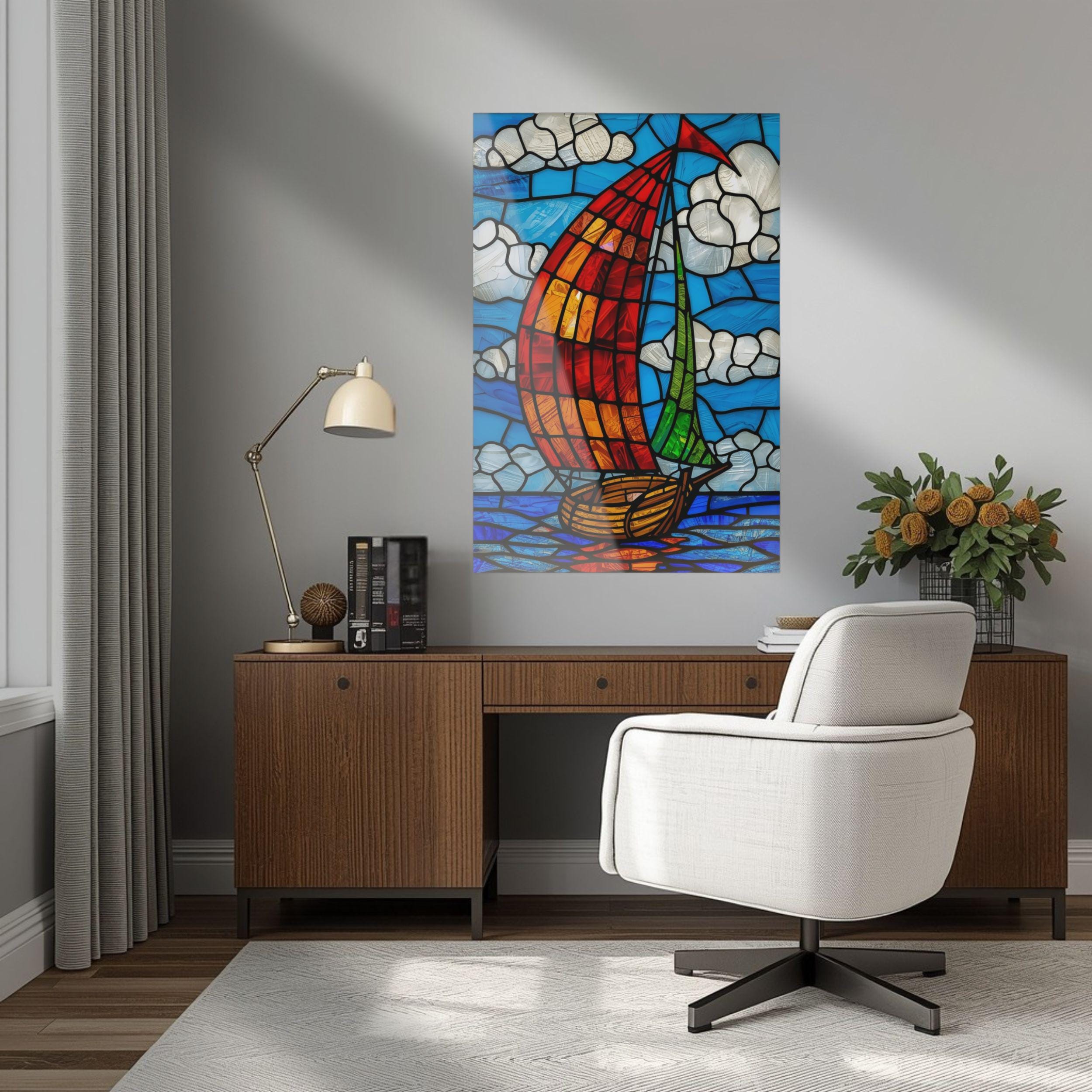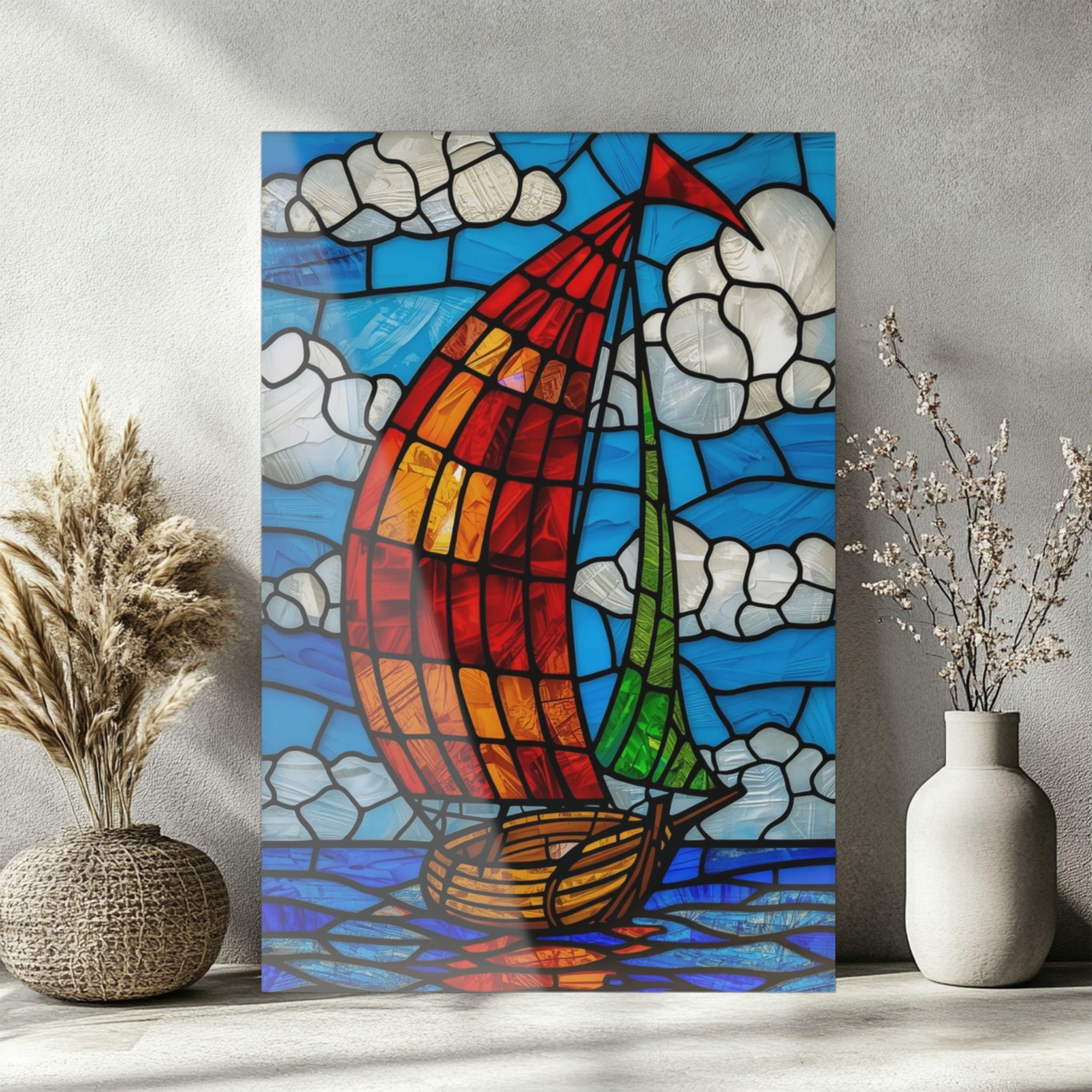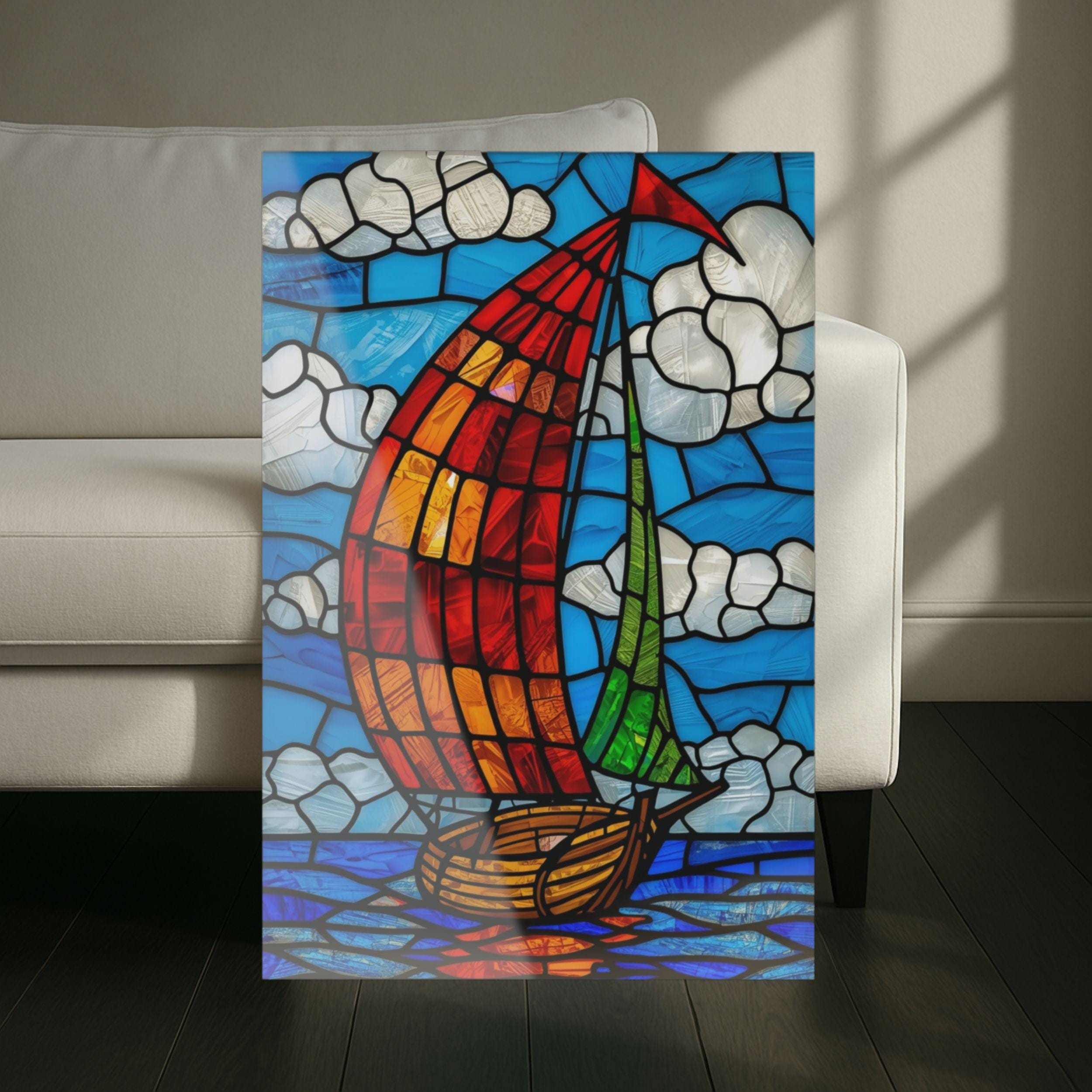 Bring a burst of color and nautical charm to any wall with this glossy acrylic print. The vibrant stained-glass sailboat design glows from within the 0.25" acrylic, creating depth and luminous clarity that feels like sunlight on water. The streamlined french cleat backing makes hanging secure and simple, while hand-polished edges give a clean, gallery-ready finish. Easy to wipe clean and available in multiple sizes and orientations, this piece slips effortlessly into coastal cottages, boat rooms, or a sunlit hallway where it can catch the light and start conversations.