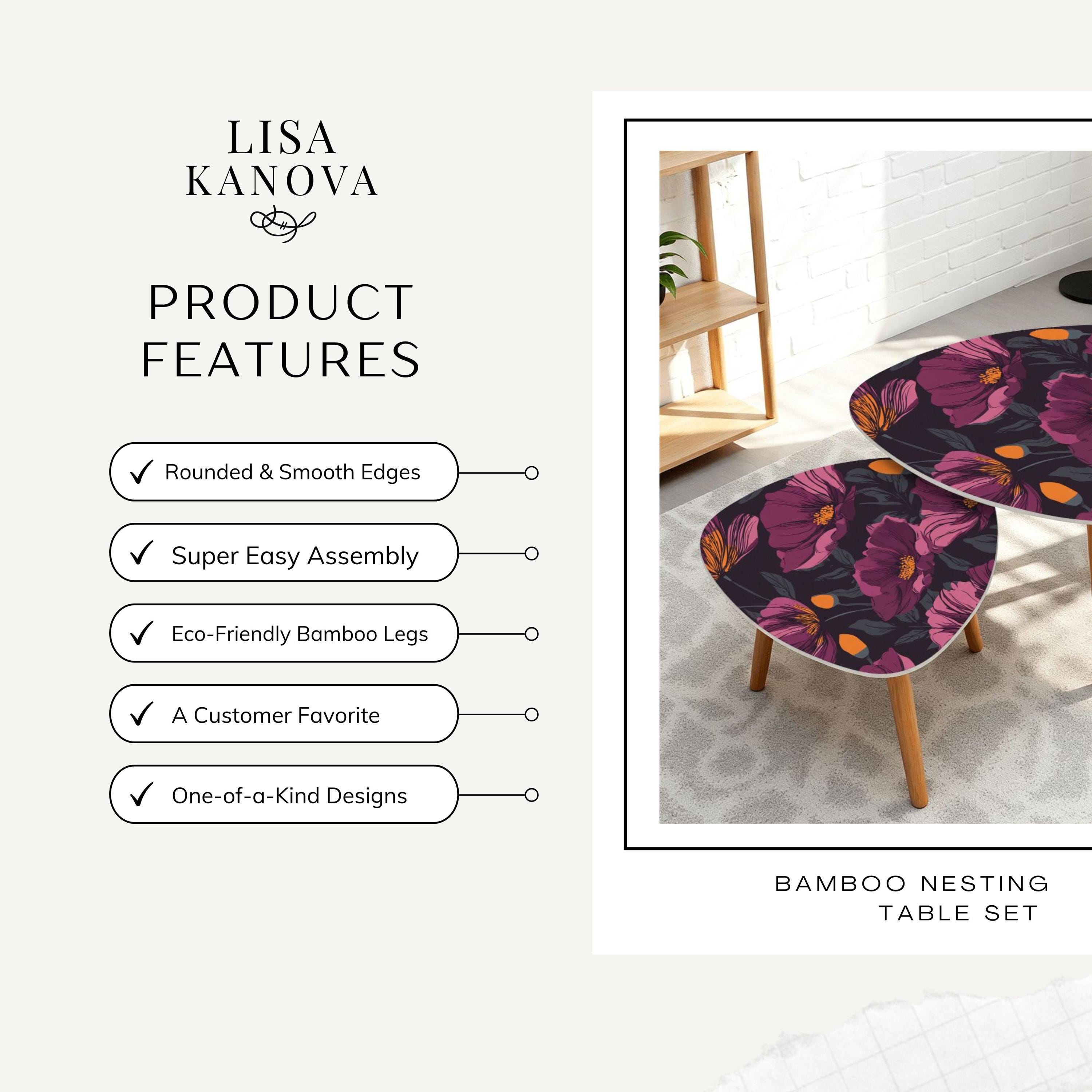 Bring sculptural simplicity into your space with this modern nesting table set — functional art designed to layer, shift, and adapt to the way you live. Each table features a smooth, rounded MDF top paired with eco‑friendly bamboo legs, creating a warm, contemporary silhouette that feels both refined and effortless.