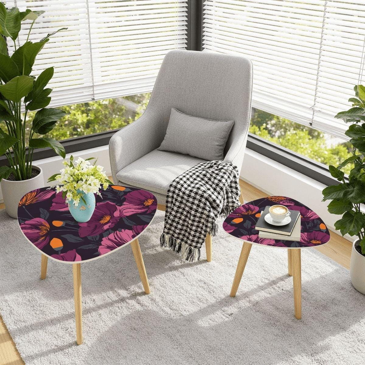 The two‑piece design allows you to nest the smaller table beneath the larger one for a compact footprint, or separate them to create additional surface area when guests arrive. Their curved contours, soft edges, and balanced proportions make them feel like art on legs — quietly modern, beautifully minimal, and endlessly versatile.