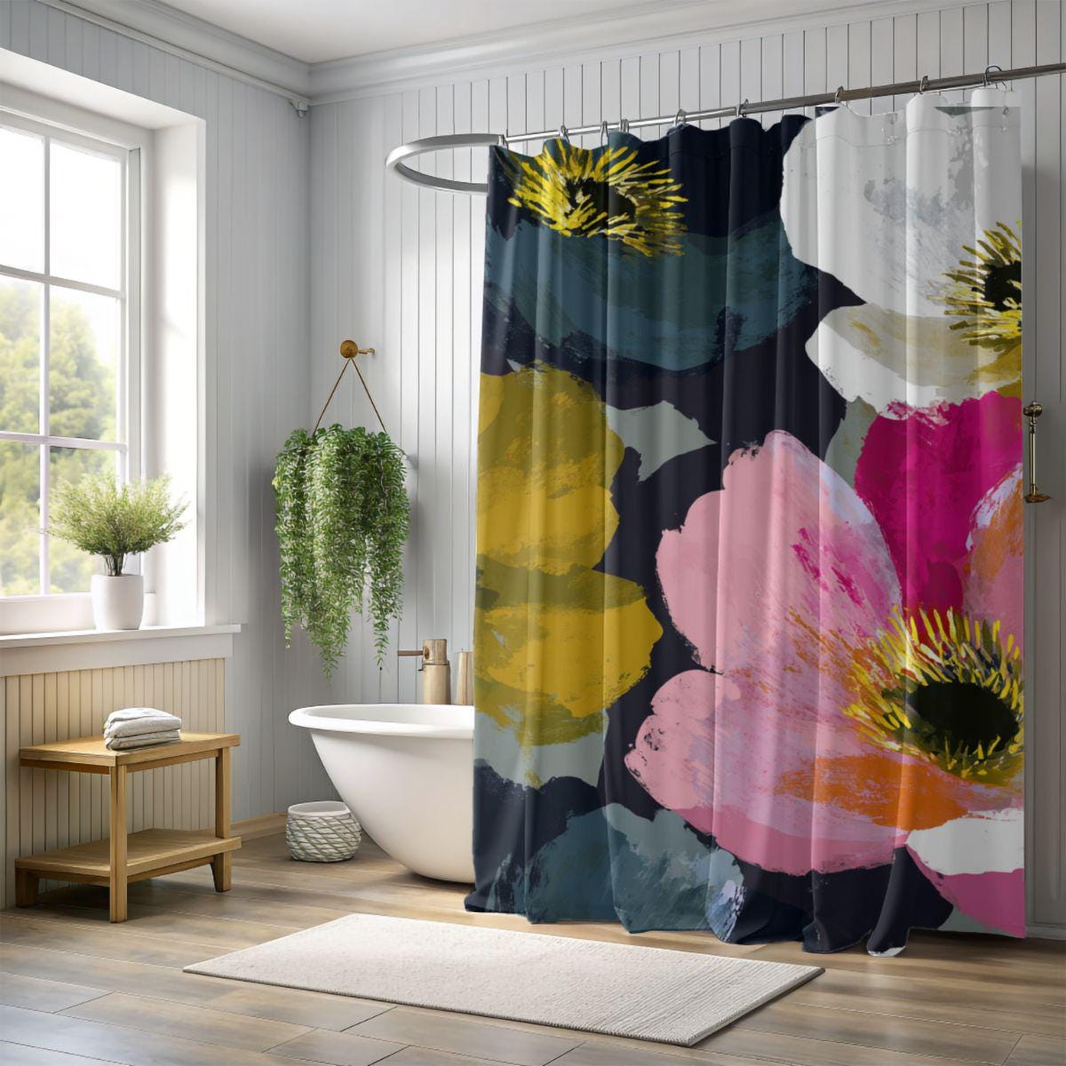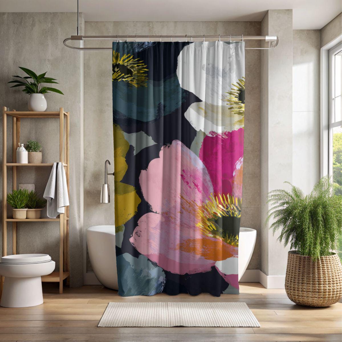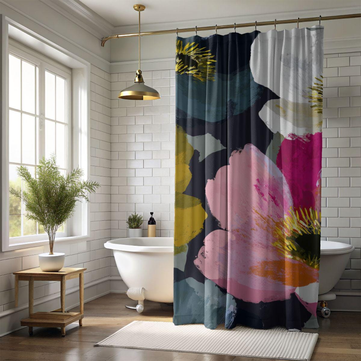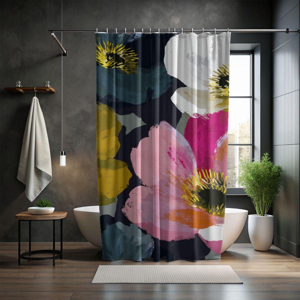 A bold, painterly shower curtain that brings an art-studio mood to your bathroom. Broad, hand-brushed florals in deep navy, mustard, blush and magenta float across a moody dark background—like a bouquet caught in evening light. The fabric has a soft drape and quick-drying feel, so it hangs like a canvas while resisting mildew. Use it to lift a neutral bath with color, anchor a gallery-style powder room, or add a touch of modern-romantic contrast to tile and brass finishes. The oversized blooms read like expressive strokes up close and become a dramatic, restful pattern from across the room.