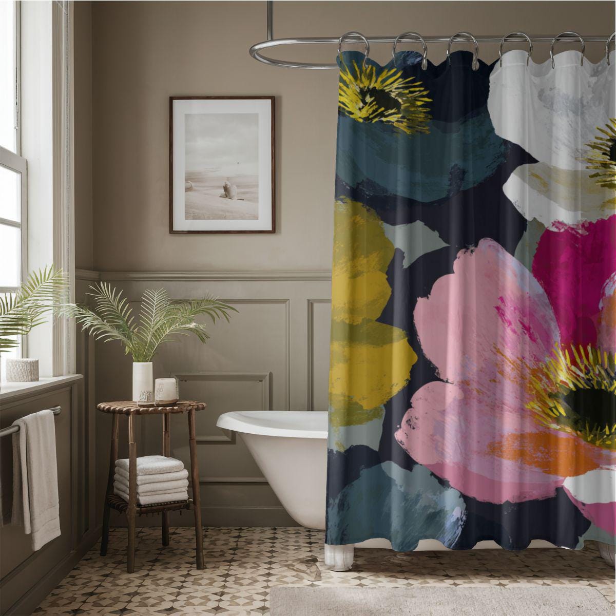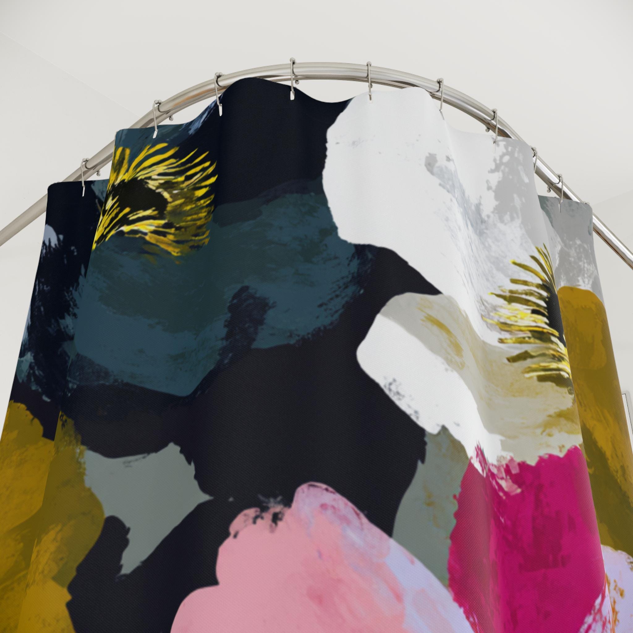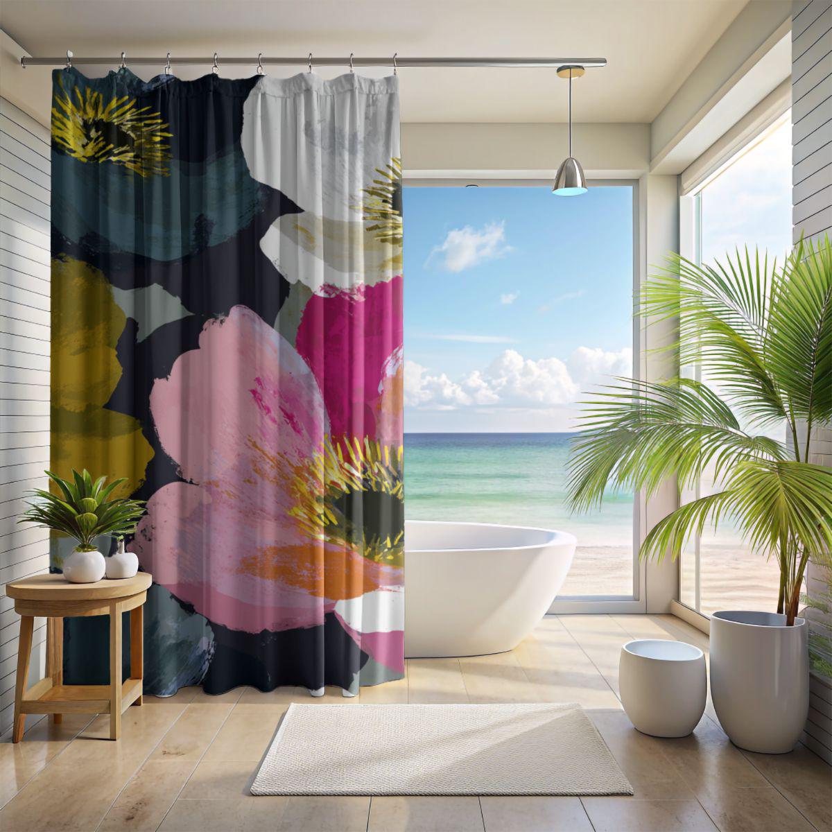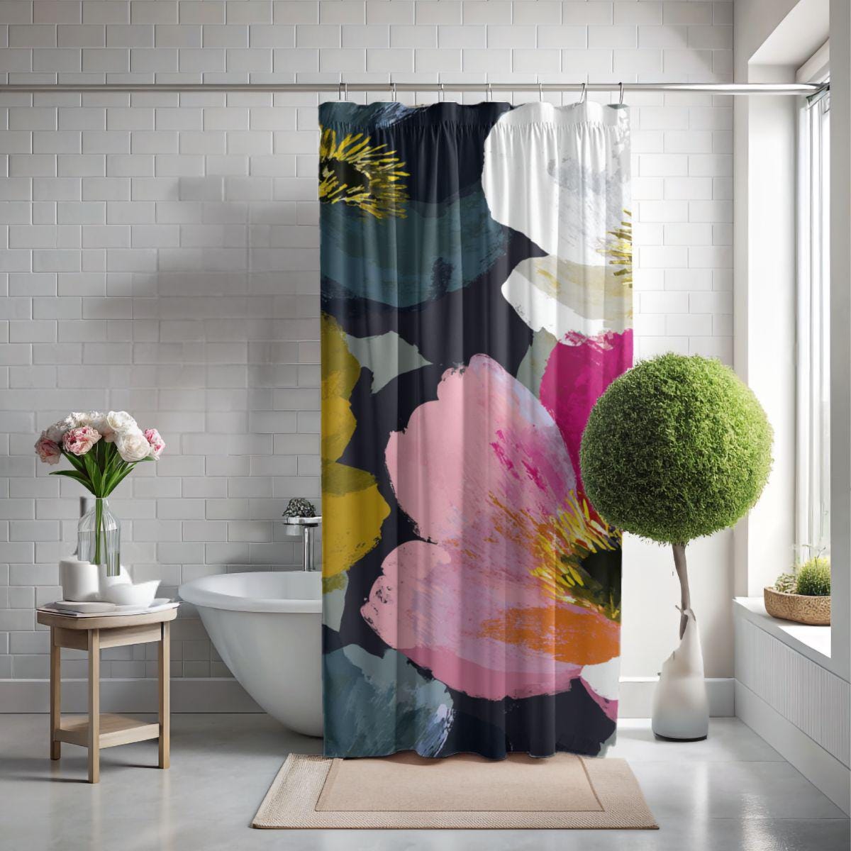 A bold, painterly shower curtain that brings an art-studio mood to your bathroom. Broad, hand-brushed florals in deep navy, mustard, blush and magenta float across a moody dark background—like a bouquet caught in evening light. The fabric has a soft drape and quick-drying feel, so it hangs like a canvas while resisting mildew. Use it to lift a neutral bath with color, anchor a gallery-style powder room, or add a touch of modern-romantic contrast to tile and brass finishes. The oversized blooms read like expressive strokes up close and become a dramatic, restful pattern from across the room.