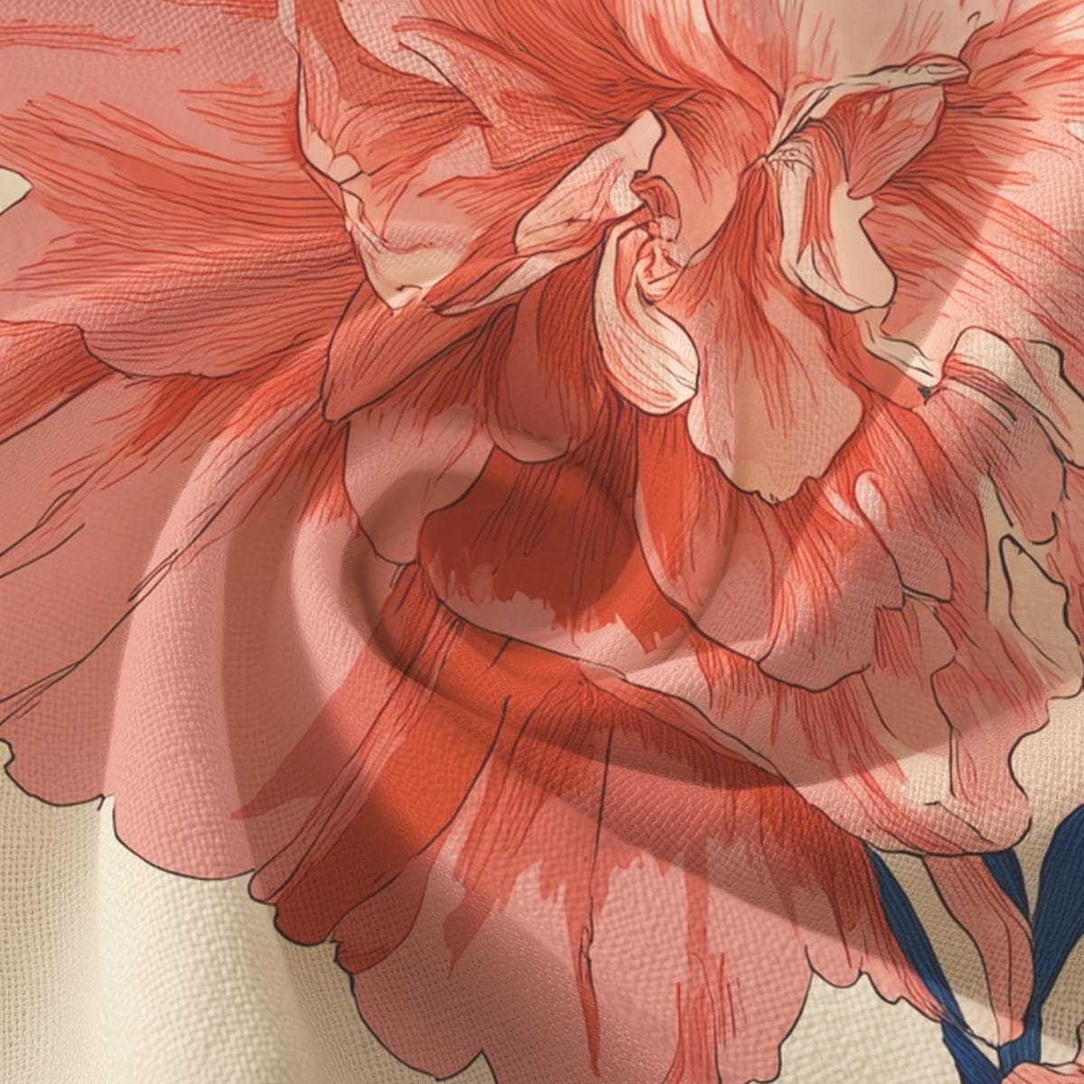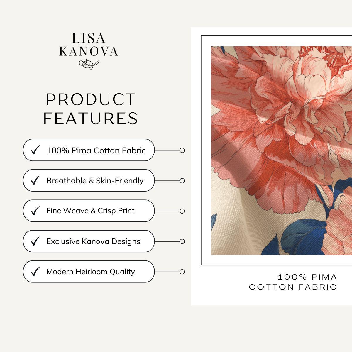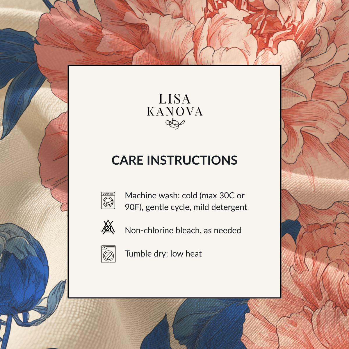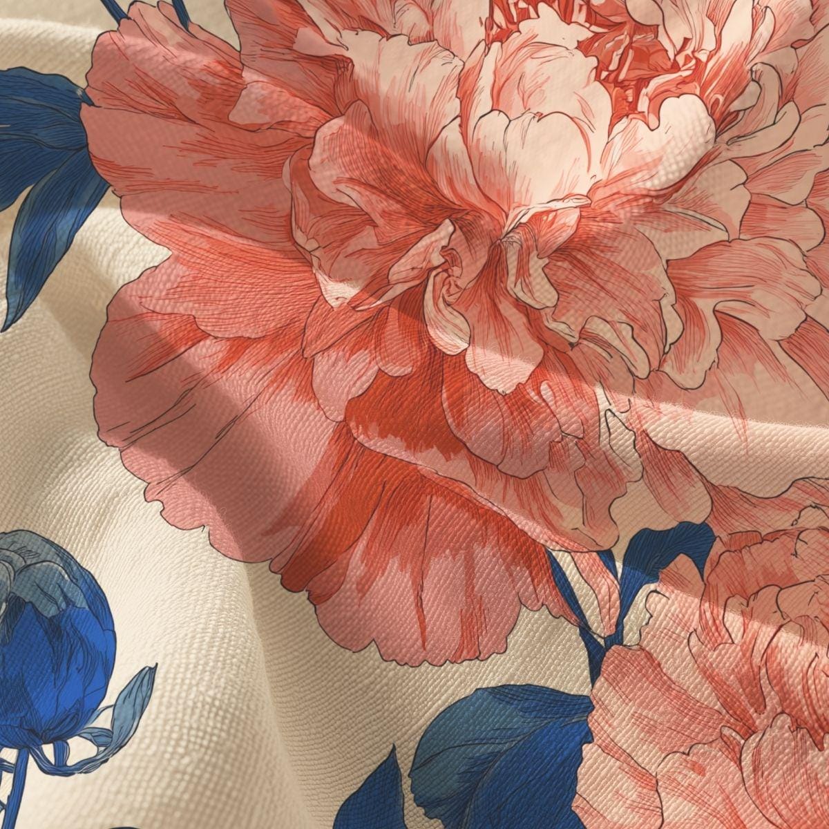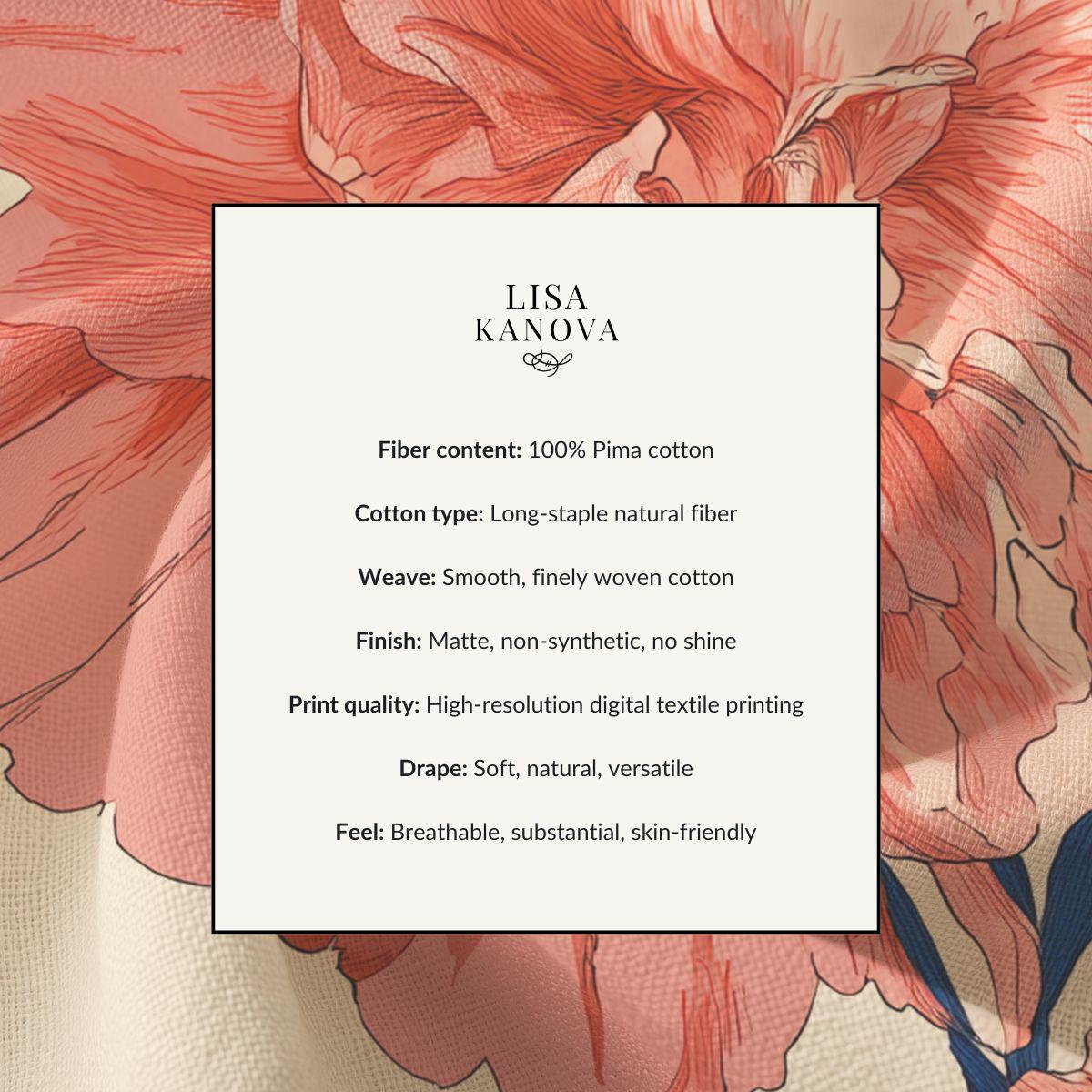 Soft, breathable Pima cotton brings this floral piece to life with a gentle, vintage-inspired palette. The muted blue background lets blush and mauve blooms drift across the fabric like a hand-painted wallpaper. Lightweight and smooth to the touch, the fabric folds and drapes with an elegant, relaxed movement—comfortable for slow mornings curled up with tea or layered for an afternoon market stroll. The printed edges for larger sizes are cut after printing so each piece carries a slightly unique composition, lending a bespoke feel. This is for someone who favors quiet, artful details and wants a wearable textile that feels both refined and lived-in.