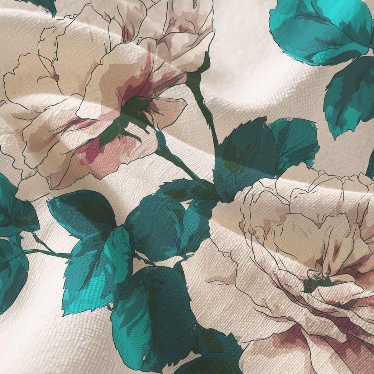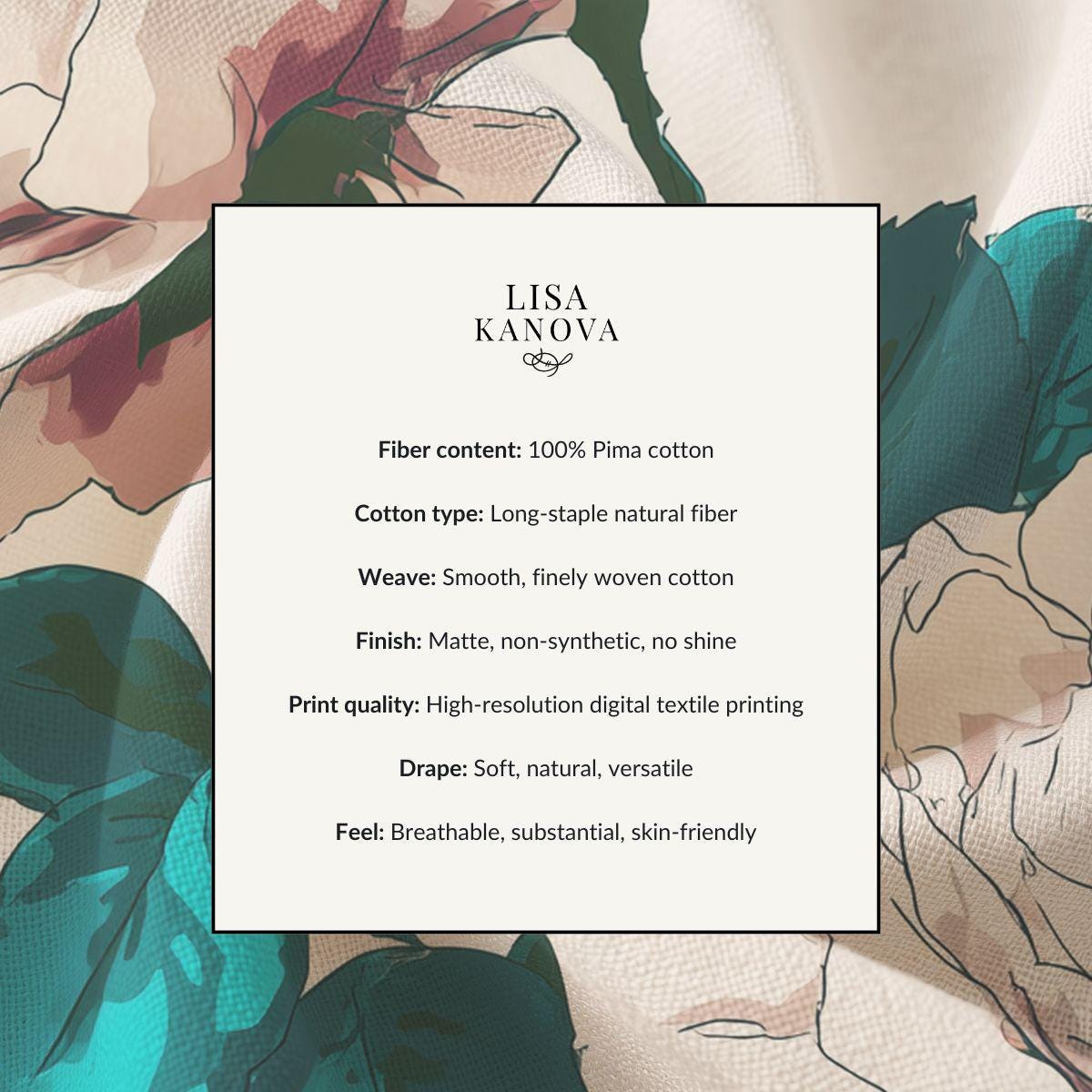 This lightweight, buttery-soft fabric brings a calm, vintage garden to life. Imagine morning light on cream roses and deep teal leaves—gentle colors that age beautifully and drape like a well-loved linen. The combed Pima cotton feels cool against skin and wears with a soft tumble; it settles into your routine and becomes the cloth you reach for when you want quiet comfort and a touch of floral elegance. Wear it, sew it into a scarf, or let it become a simple throw—this fabric blends refined floral art with everyday ease, inviting slow mornings and warm conversations.
