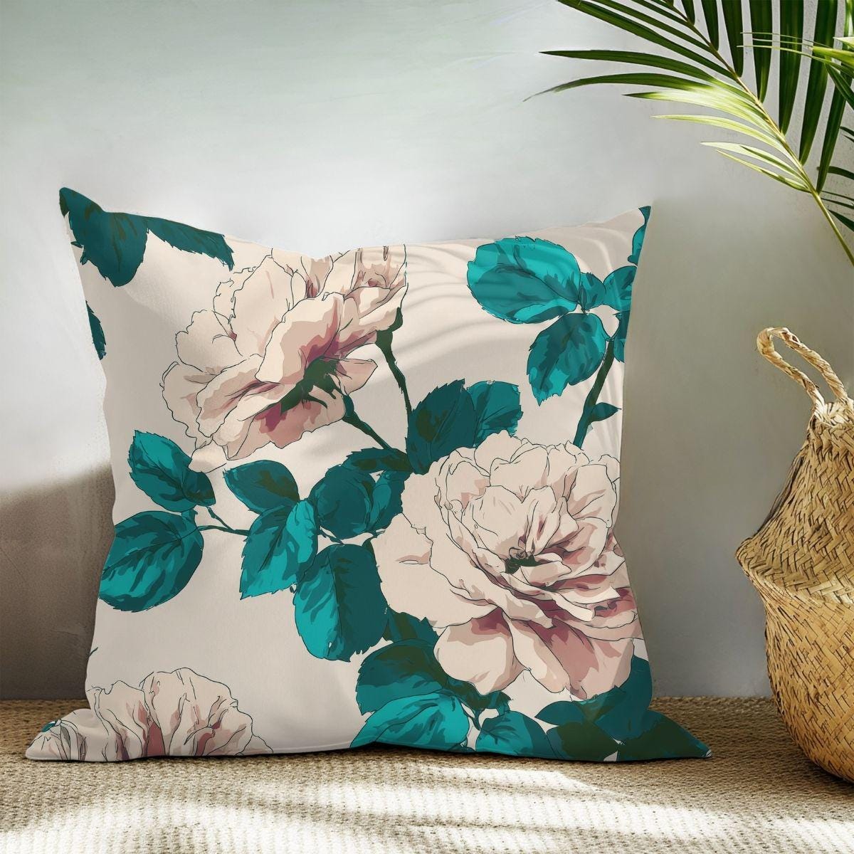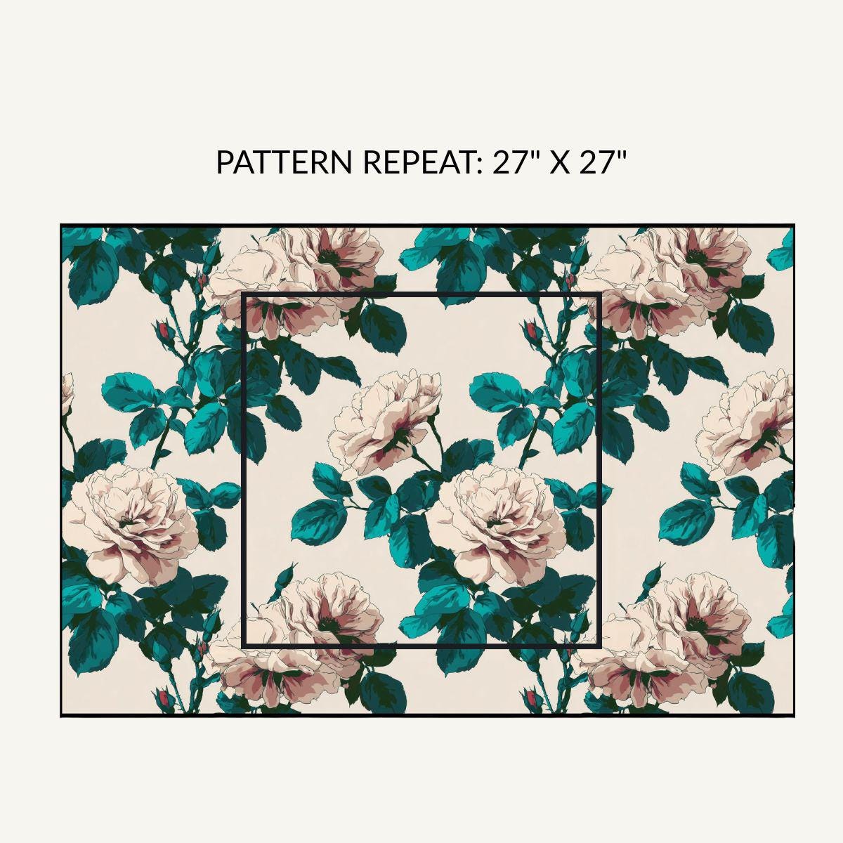 - Muted cream and teal floral motif with painterly, vintage-inspired look