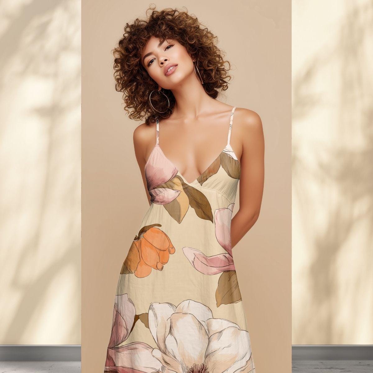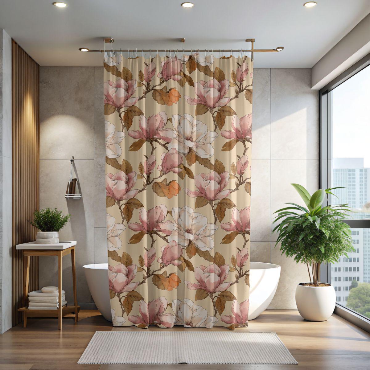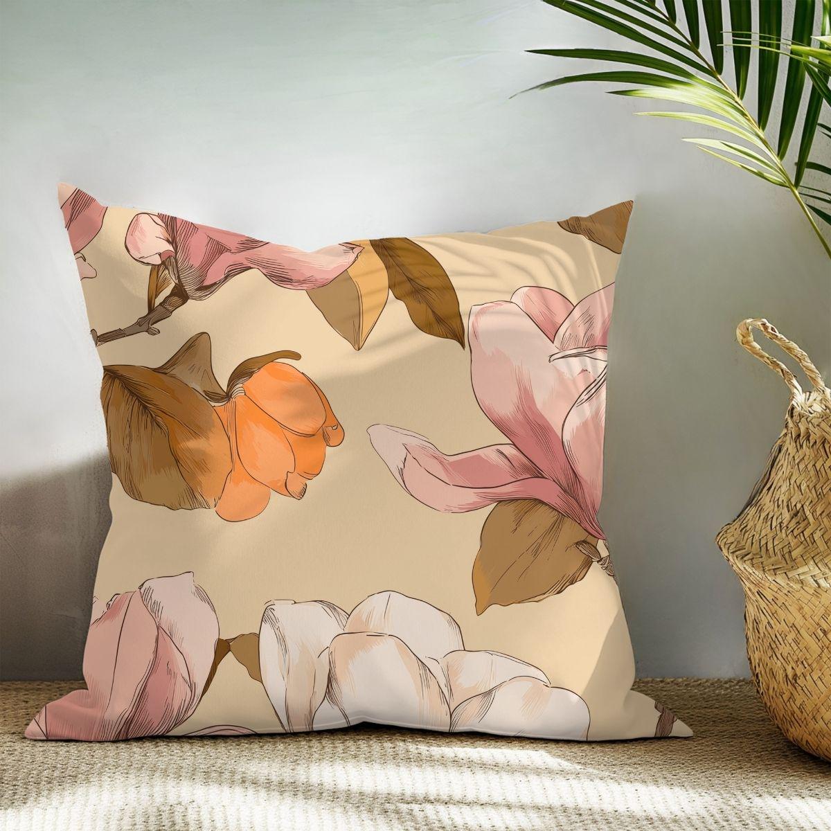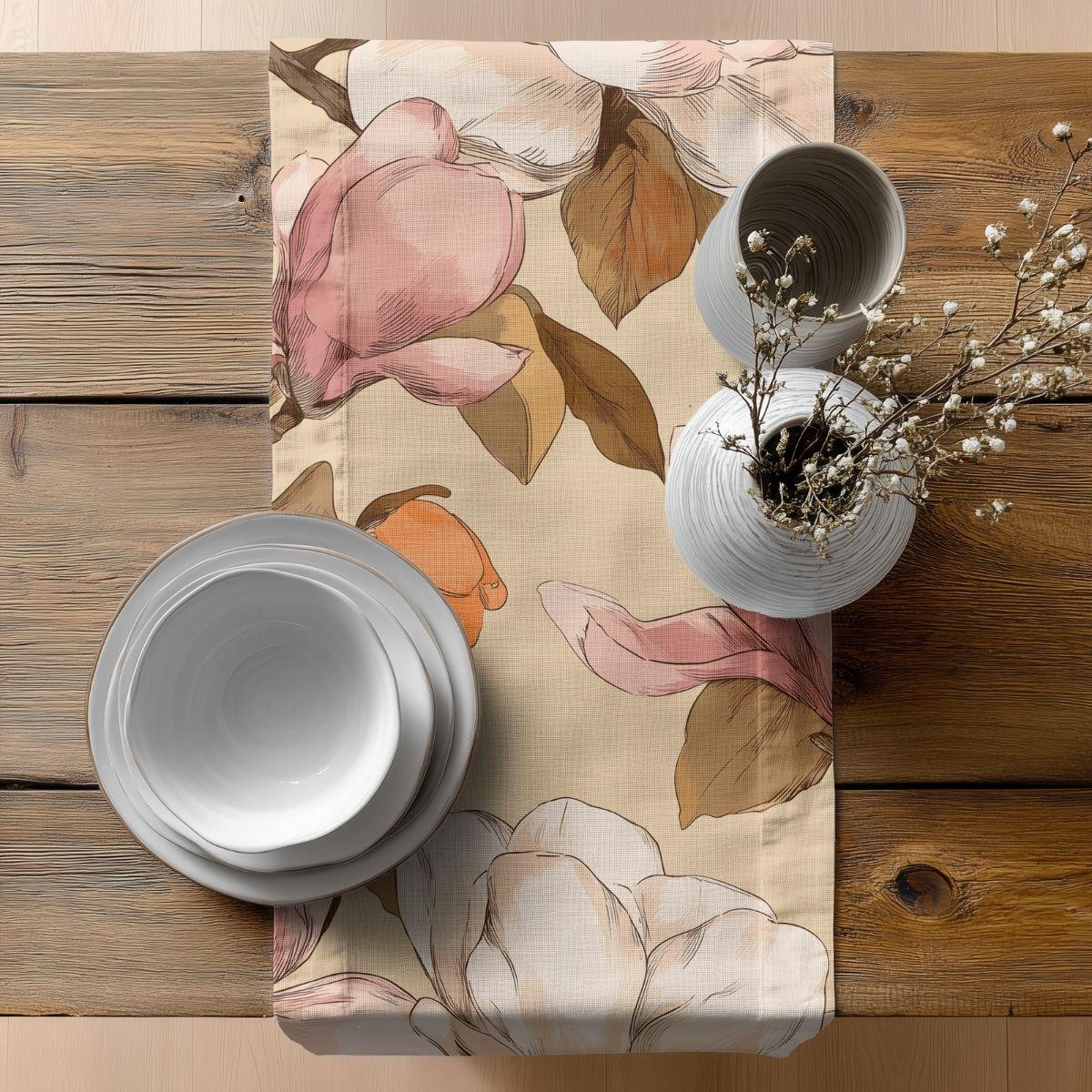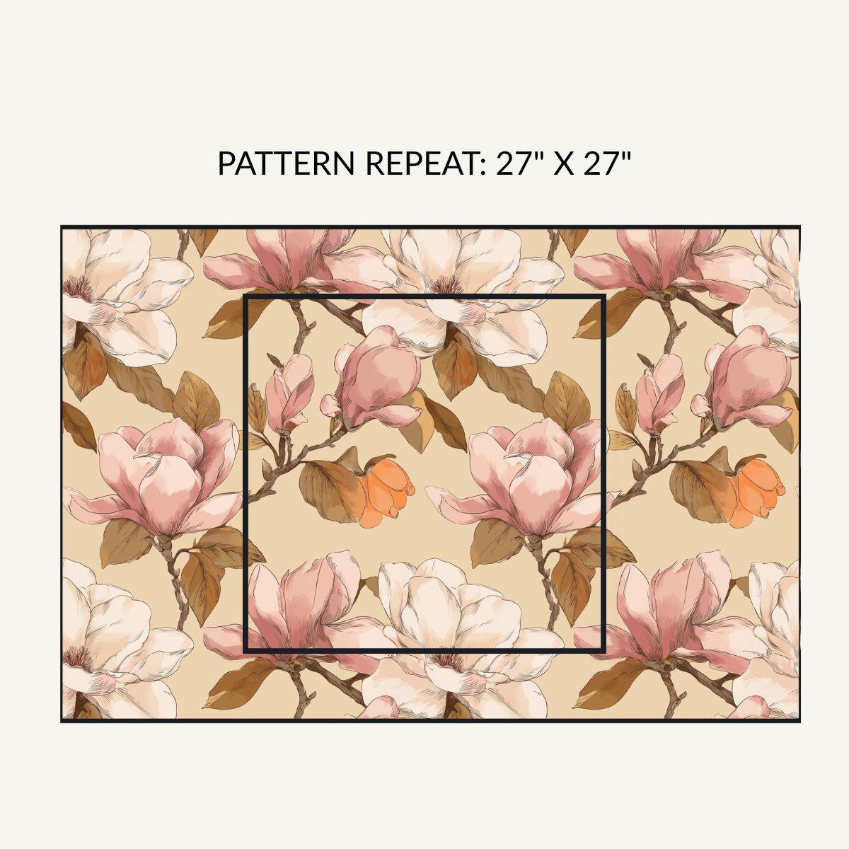 - Painterly magnolia floral print in warm peach, rose, and cream tones