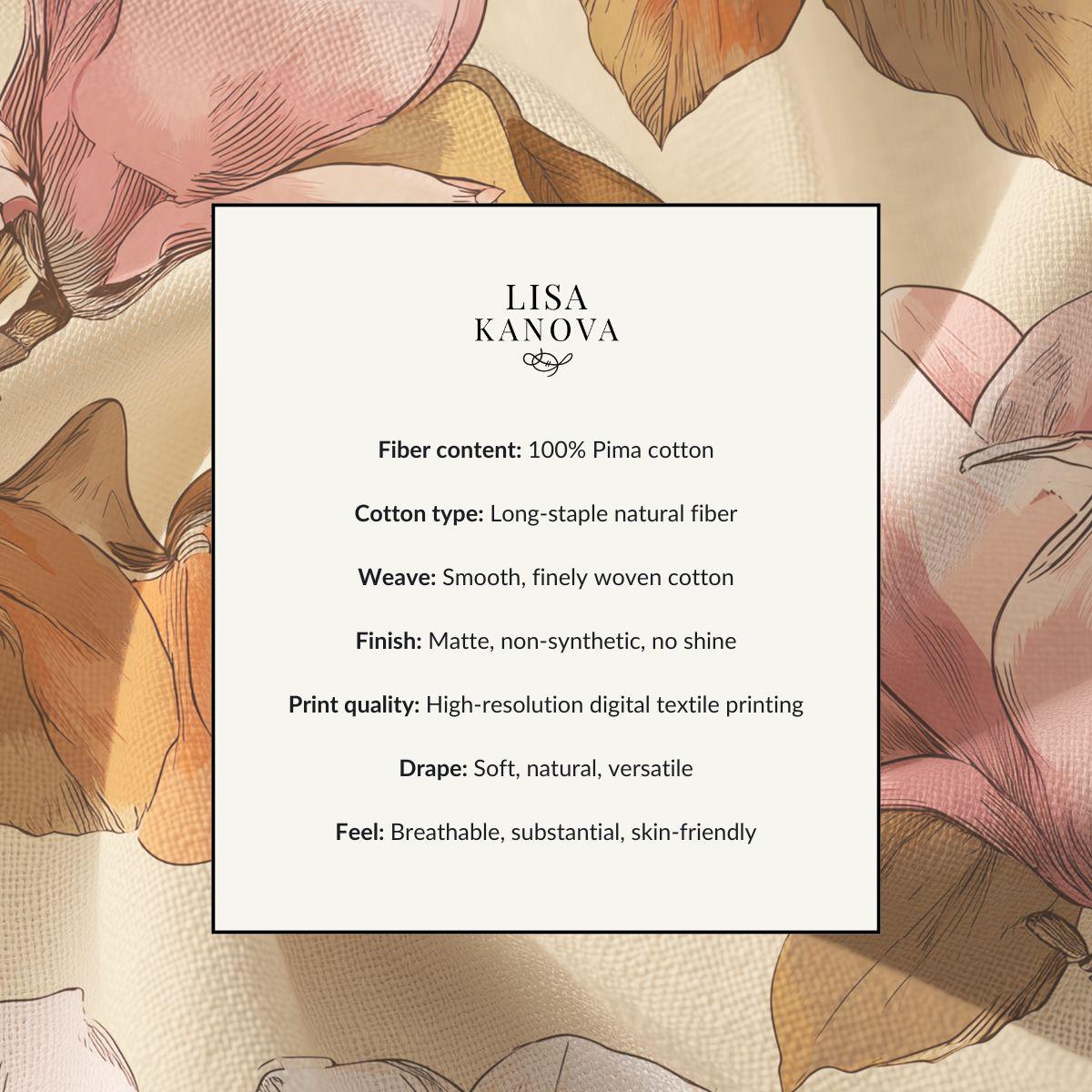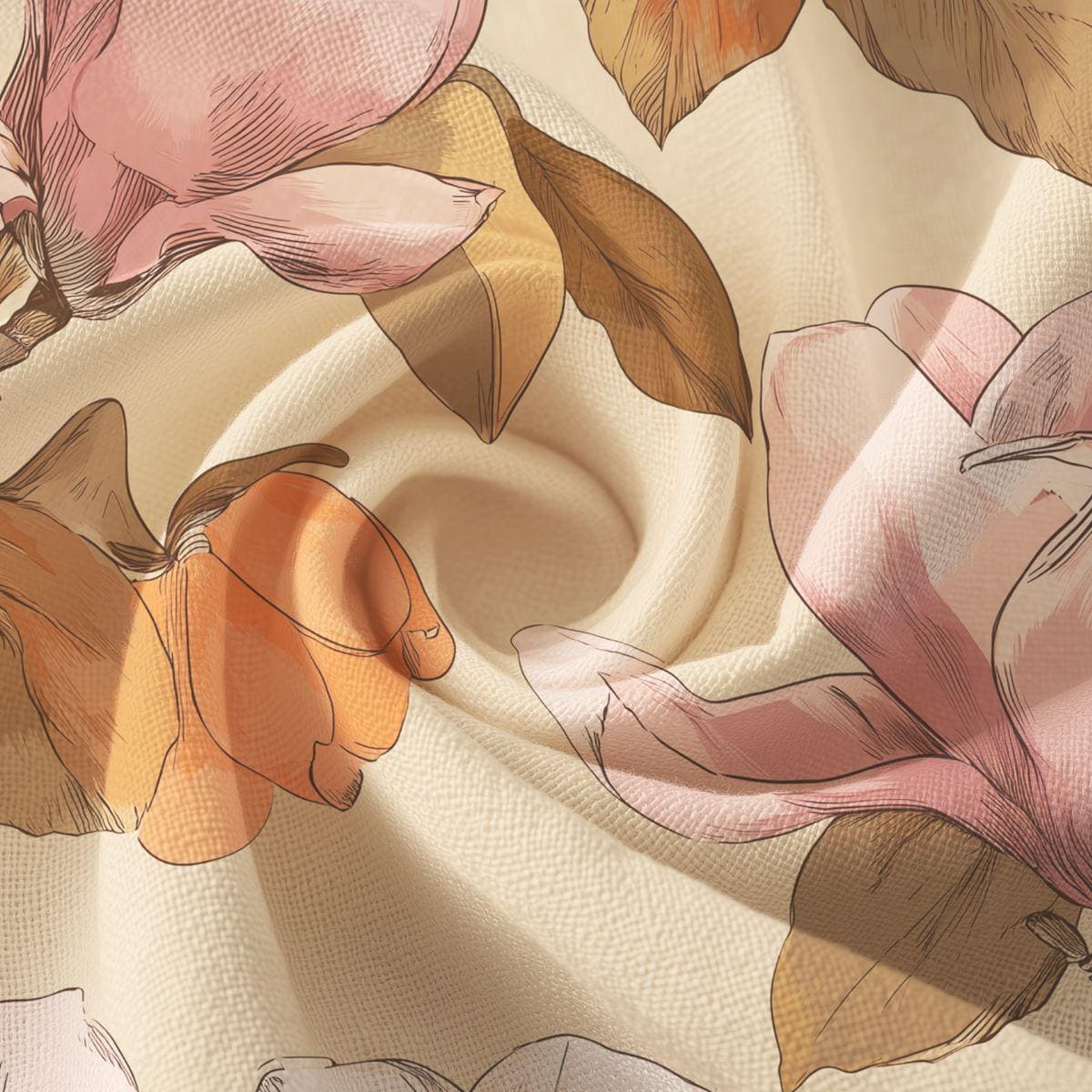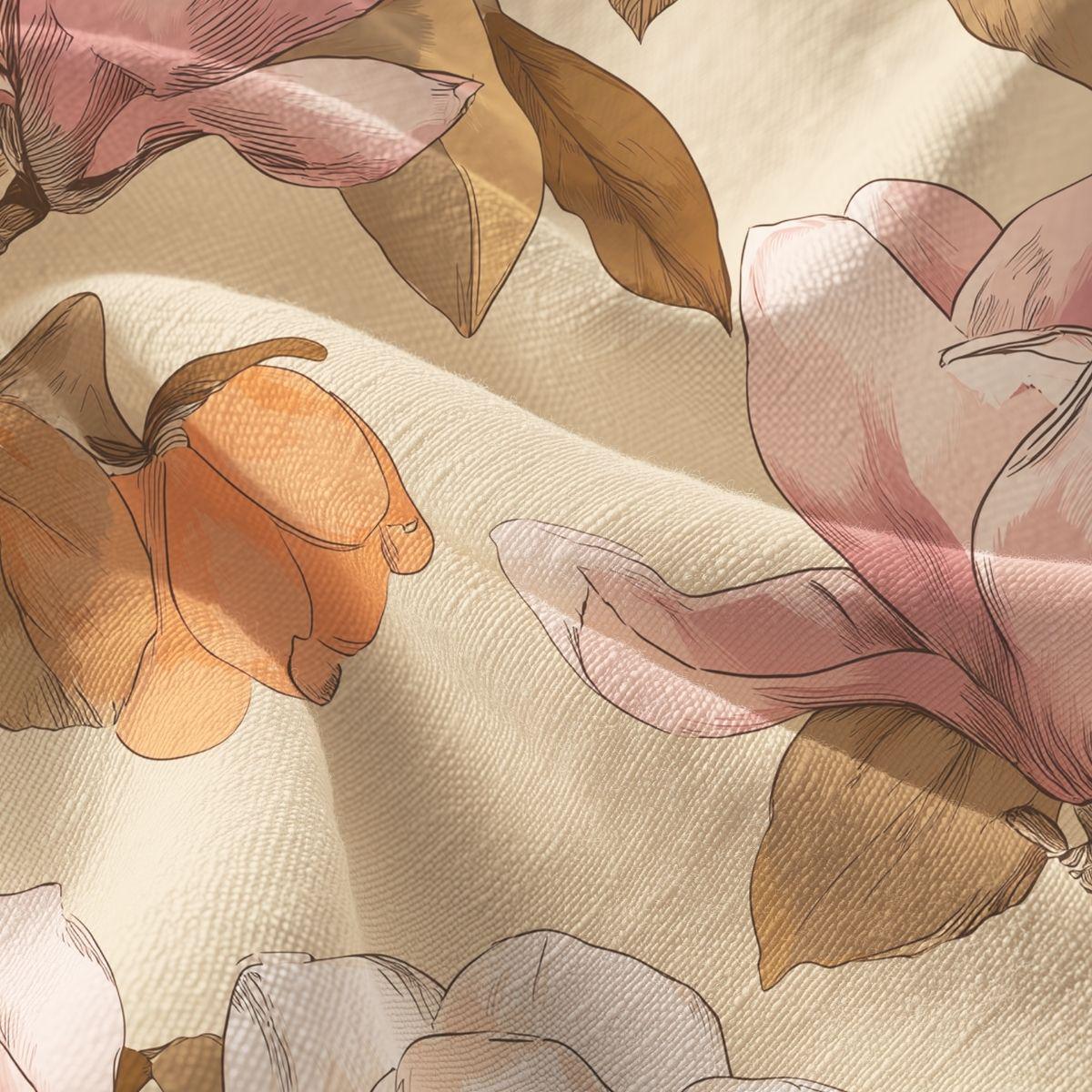 A soft, floral textile printed on buttery Pima cotton — airy magnolia blooms in warm peach and rose tones drift across a creamy background. The cloth feels gentle against skin, with a slight weight that still moves freely. It works as a cozy wrap, a decorative fabric panel, or a personalized home accent that brings a quiet, vintage-inspired garden into everyday life. Wear it, drape it, or style it on a table or shelf; the muted palette and painterly petals add a calm, feminine touch to slow mornings, garden parties, or serene afternoons spent with tea and a book.