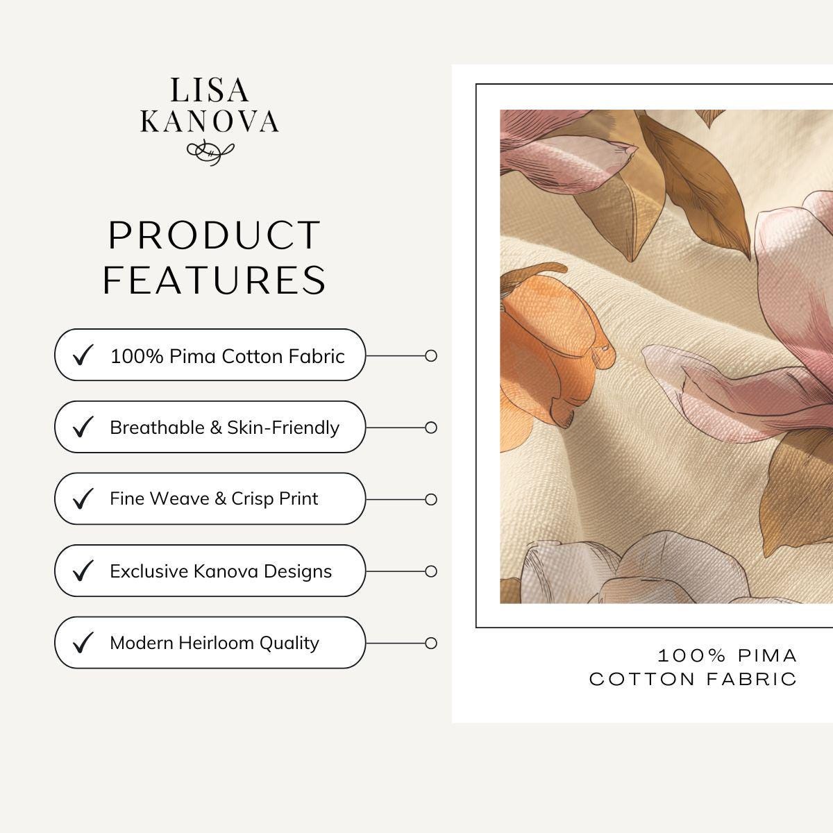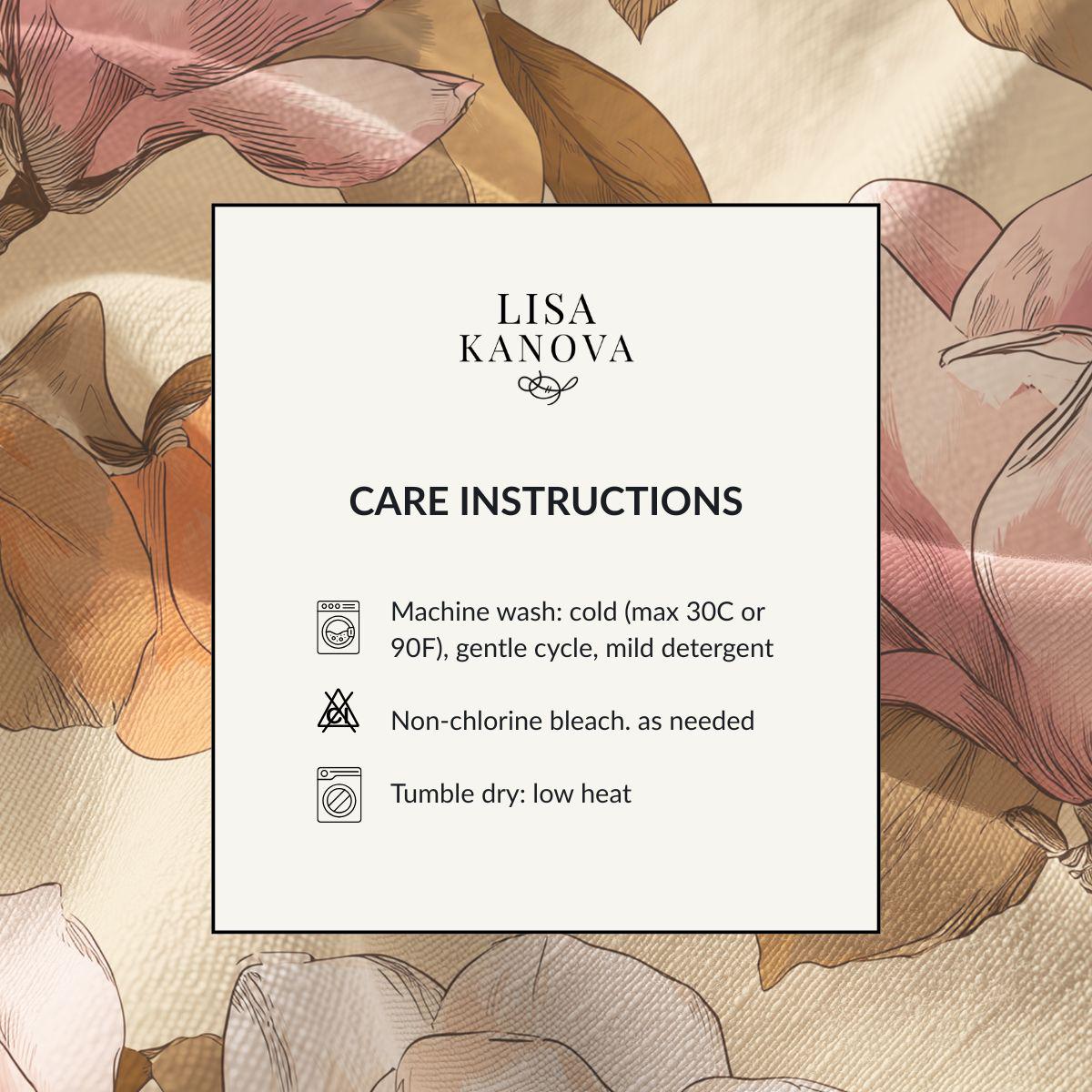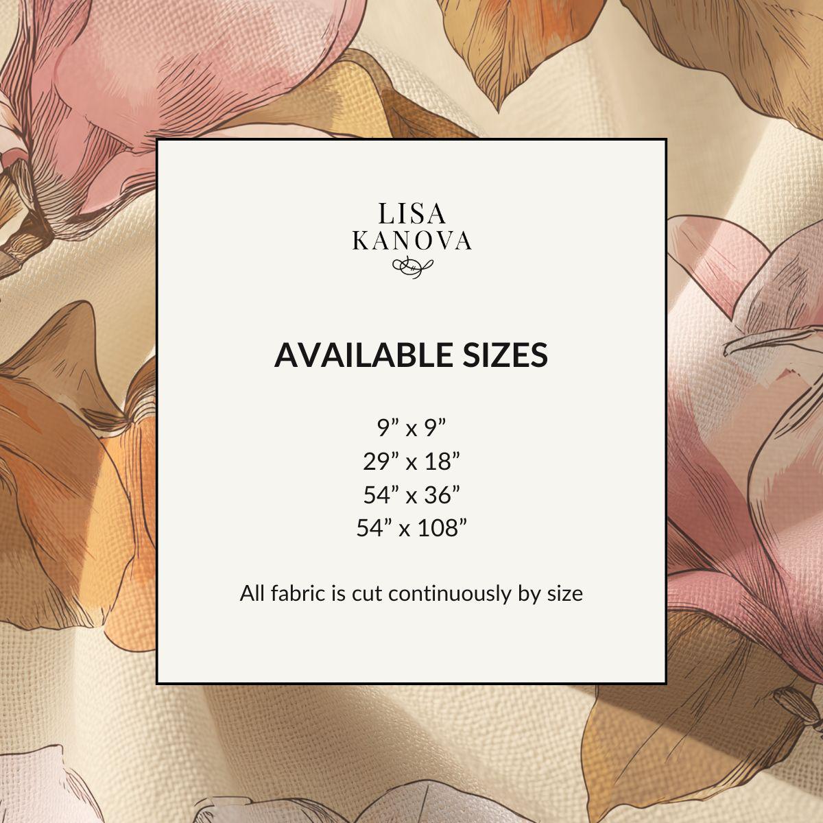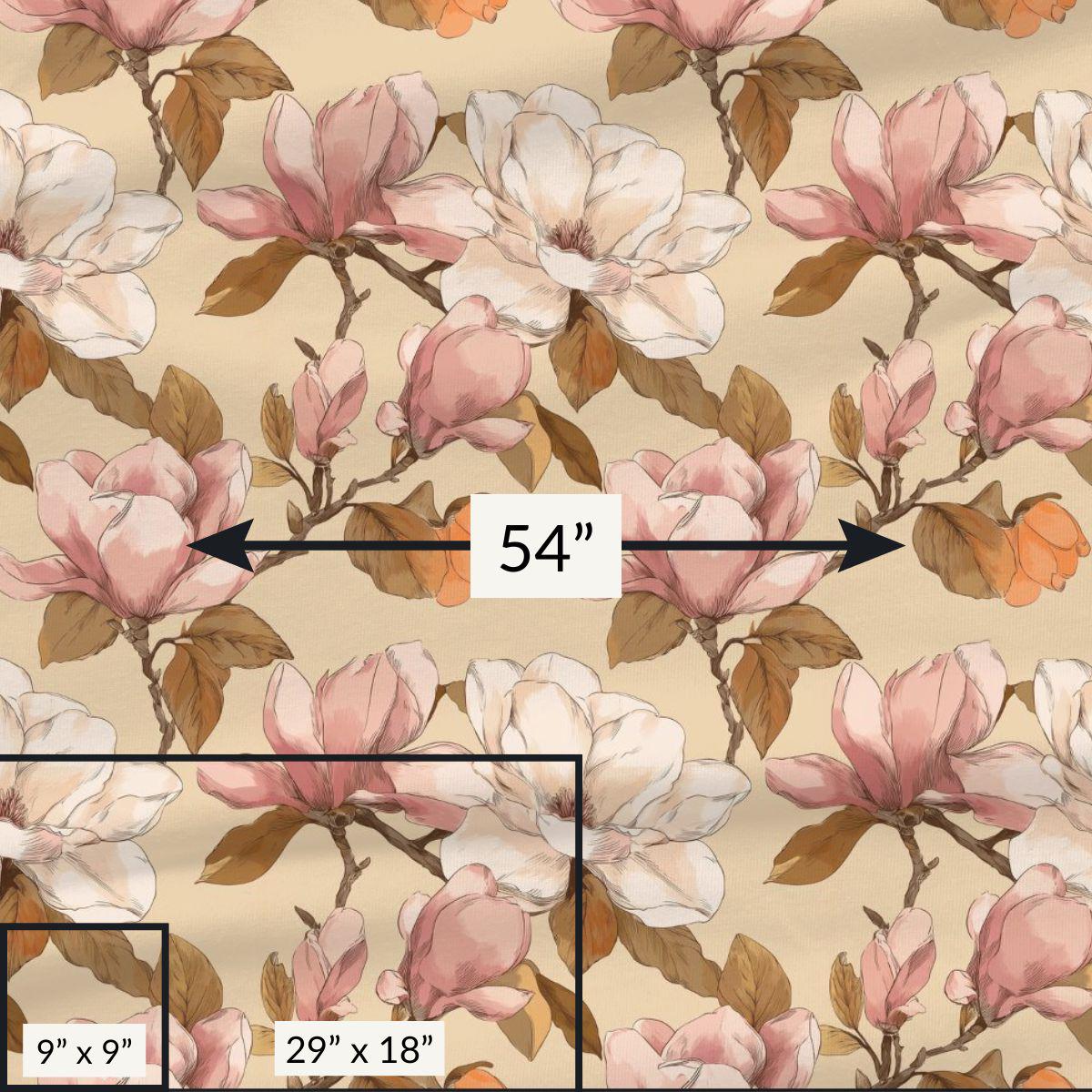 A soft, floral textile printed on buttery Pima cotton — airy magnolia blooms in warm peach and rose tones drift across a creamy background. The cloth feels gentle against skin, with a slight weight that still moves freely. It works as a cozy wrap, a decorative fabric panel, or a personalized home accent that brings a quiet, vintage-inspired garden into everyday life. Wear it, drape it, or style it on a table or shelf; the muted palette and painterly petals add a calm, feminine touch to slow mornings, garden parties, or serene afternoons spent with tea and a book.