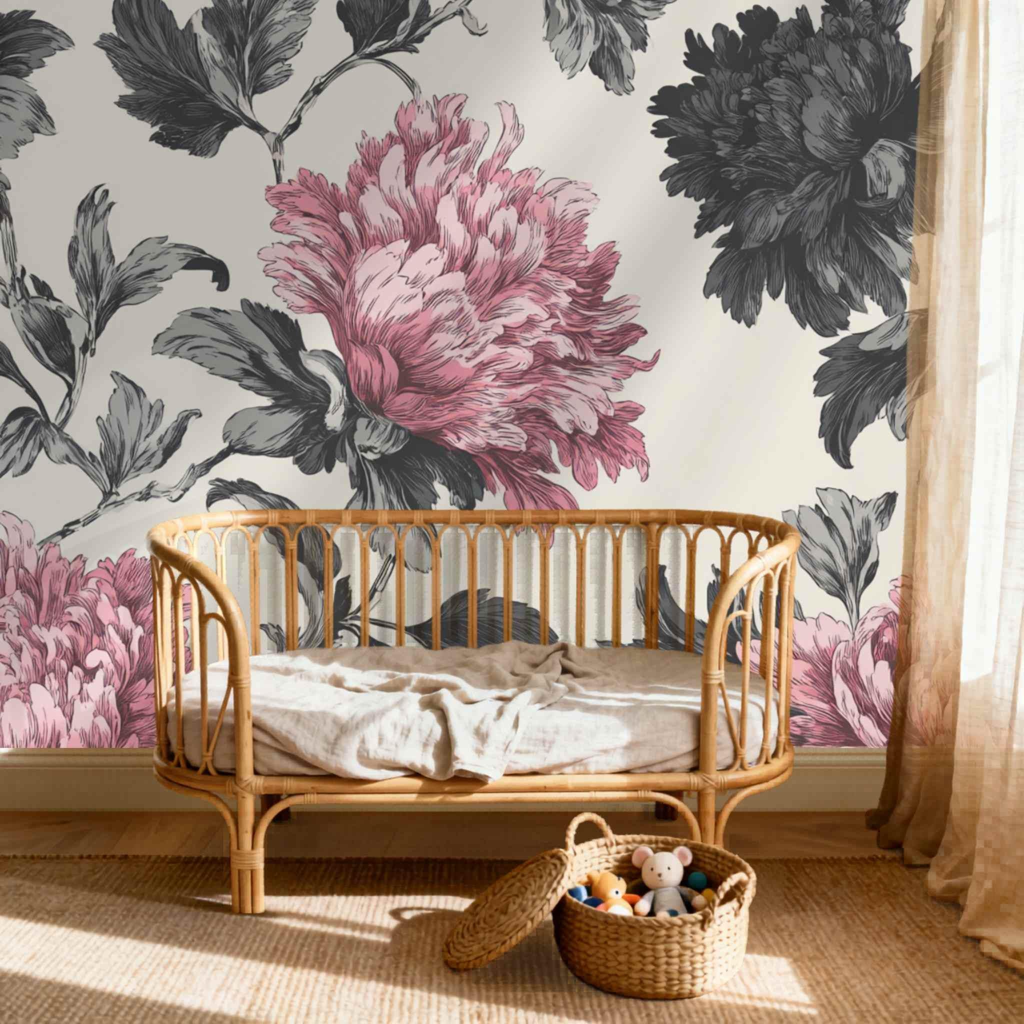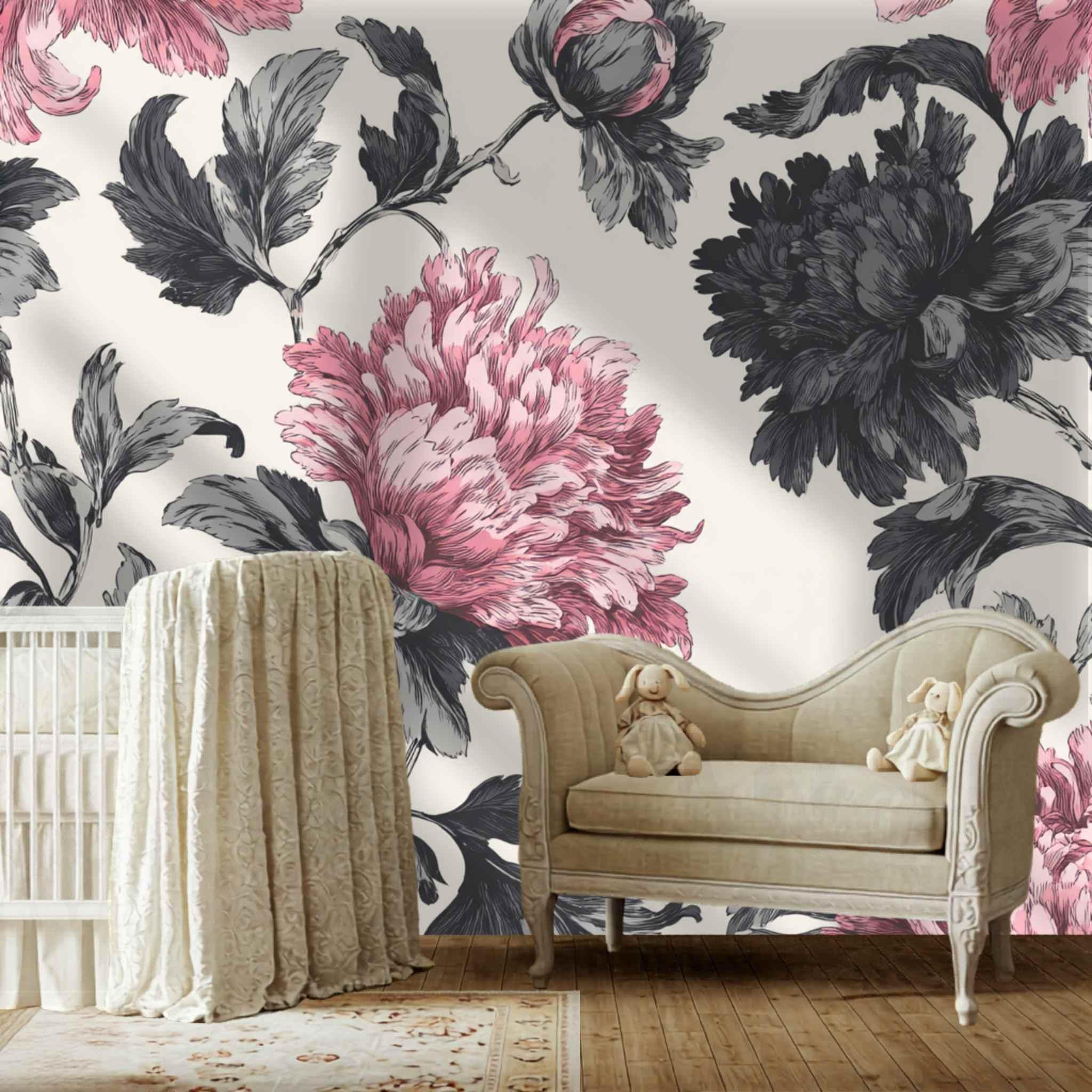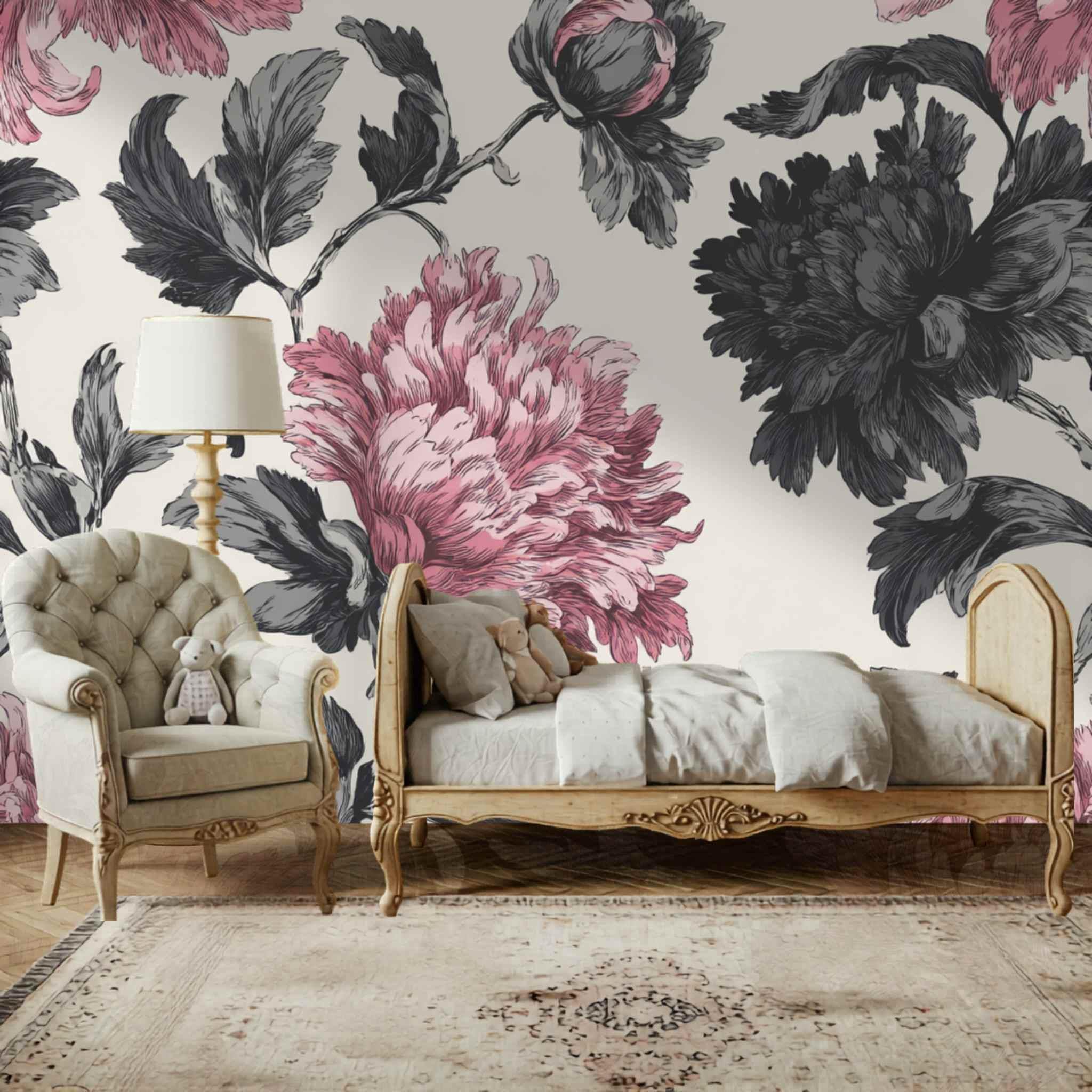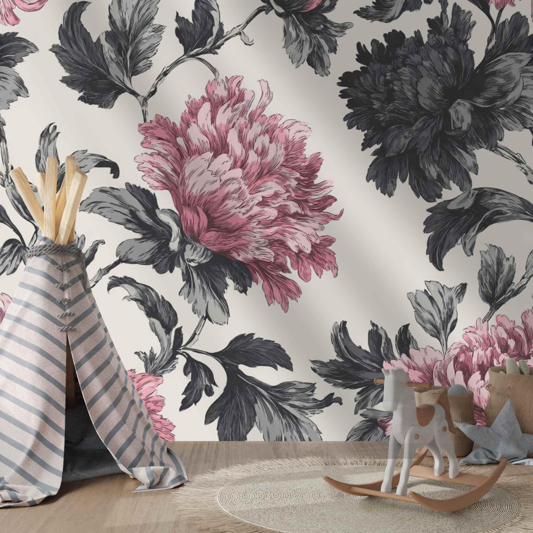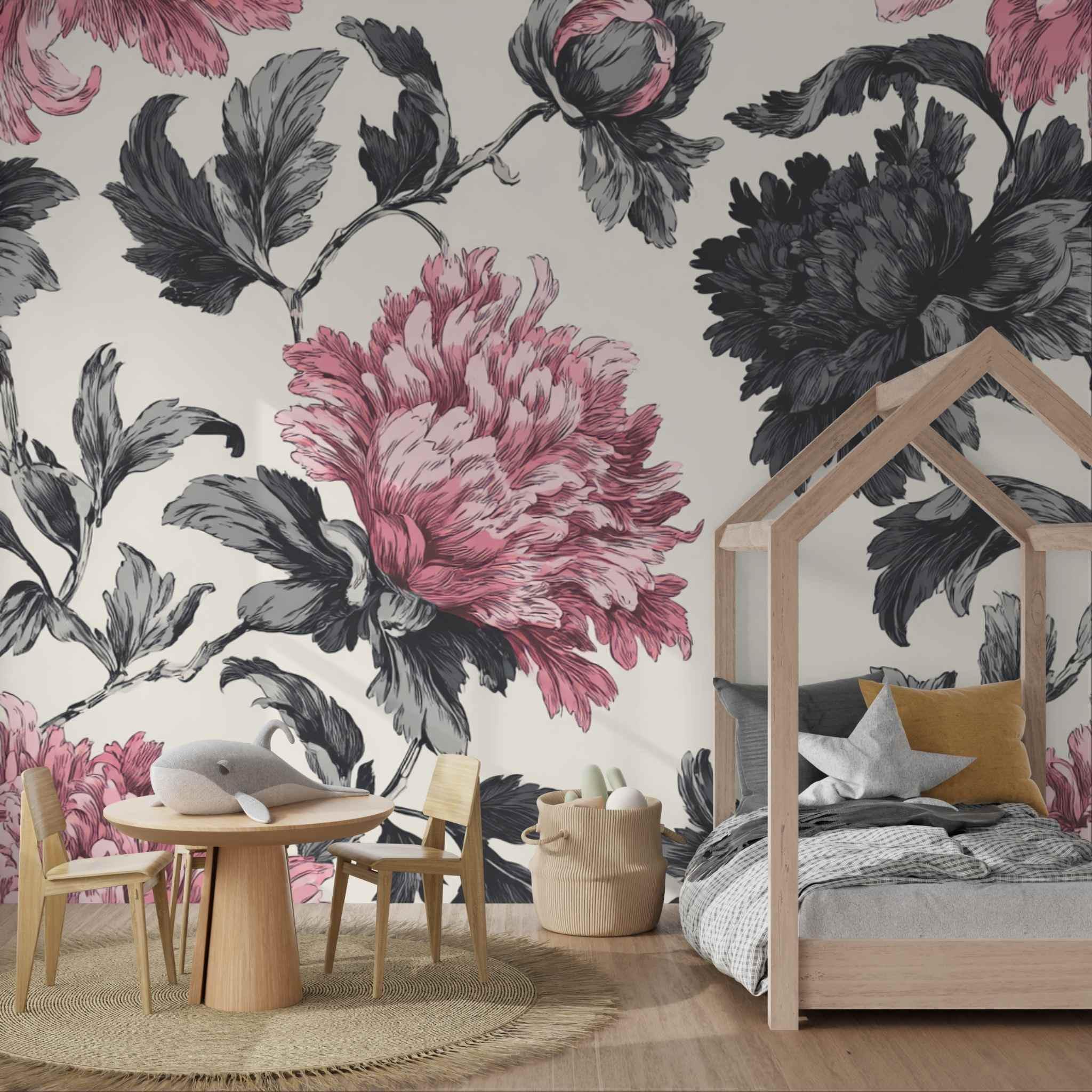 Rosy Blooms in Late Afternoon | Nursery or Kids Room Wall Mural Digital Download, Large Floral Print File, Bold Home Decor