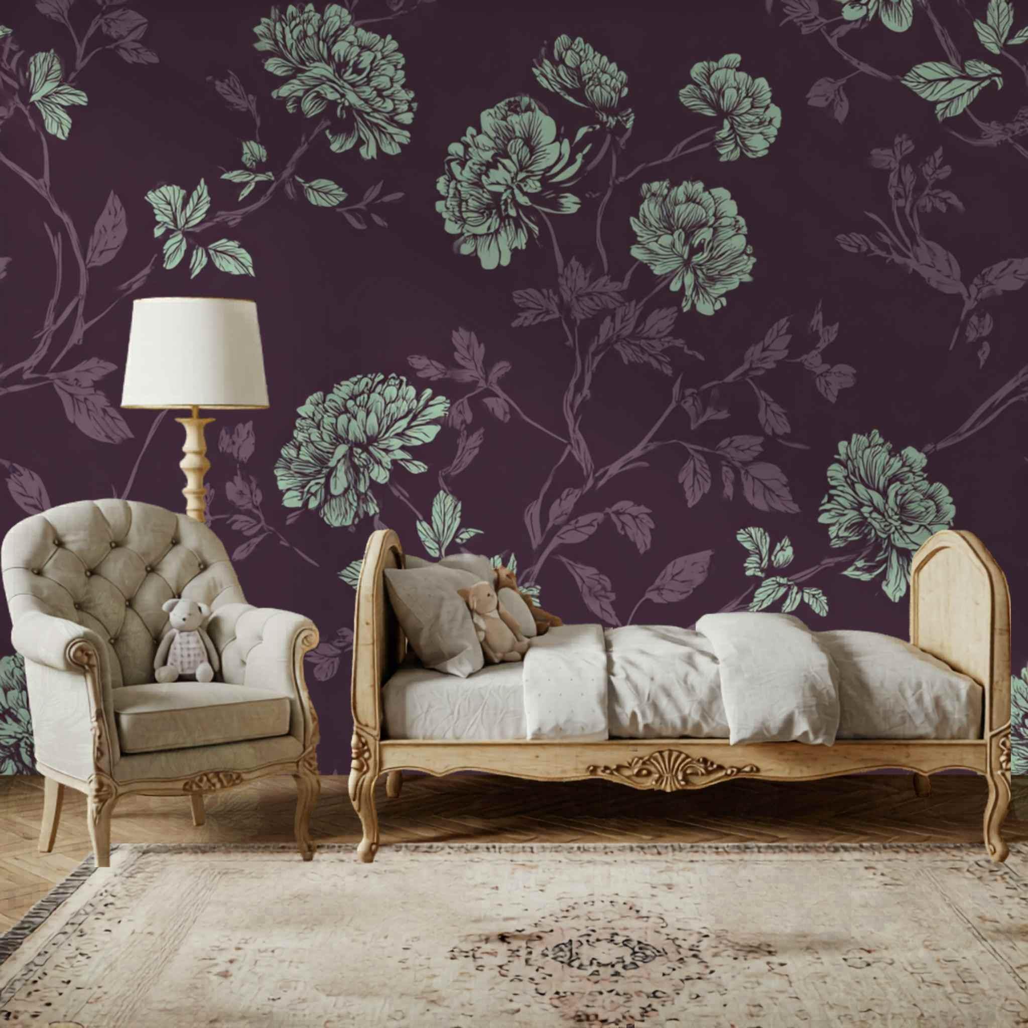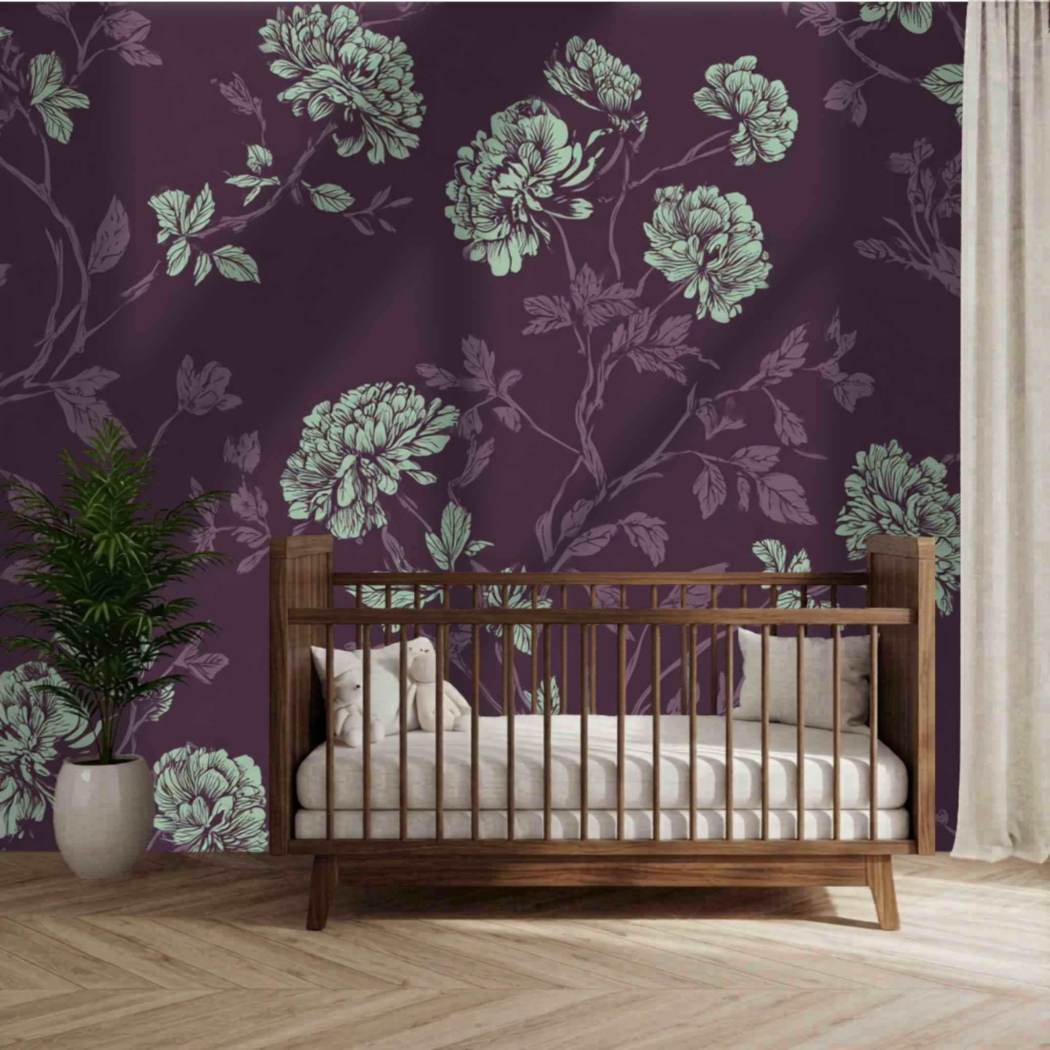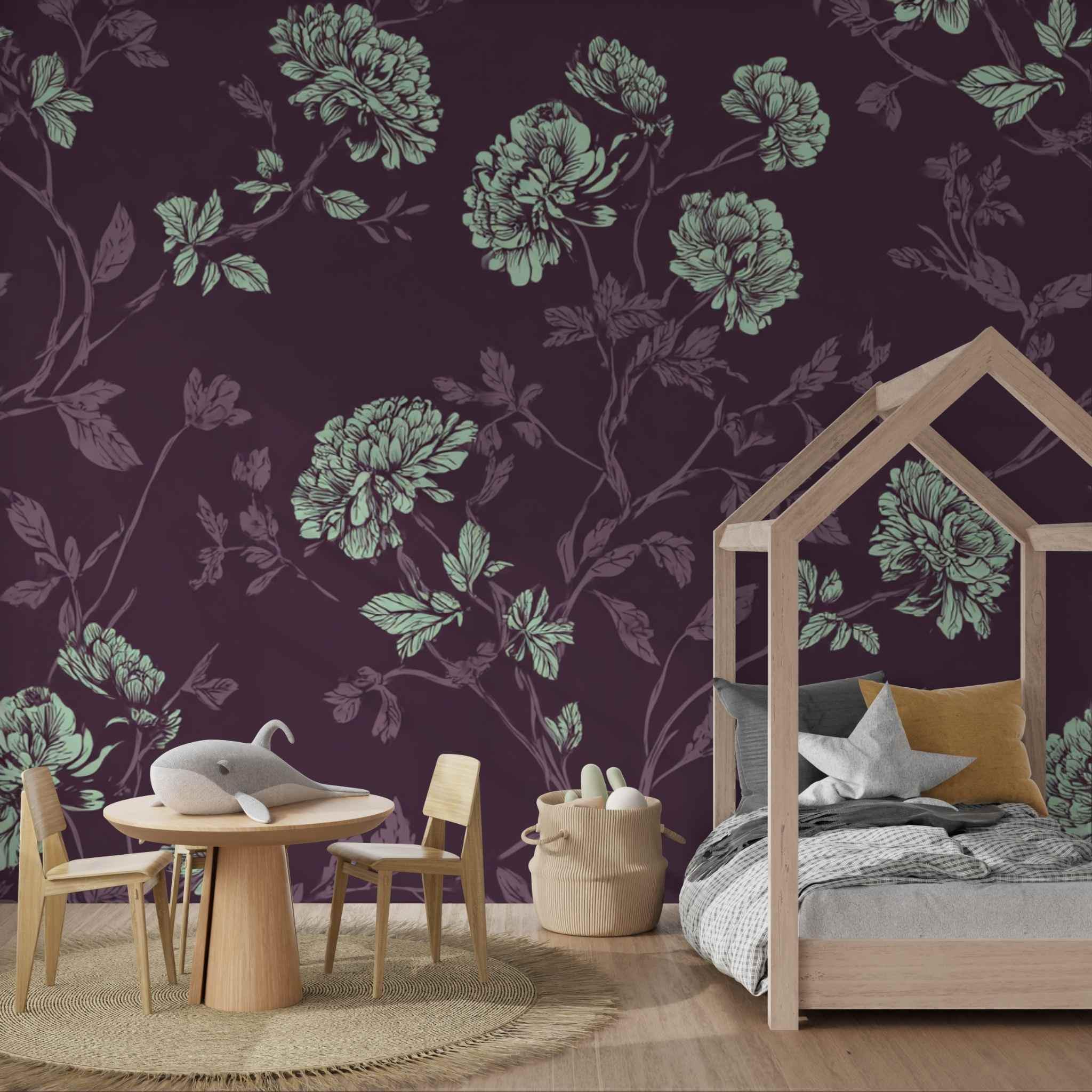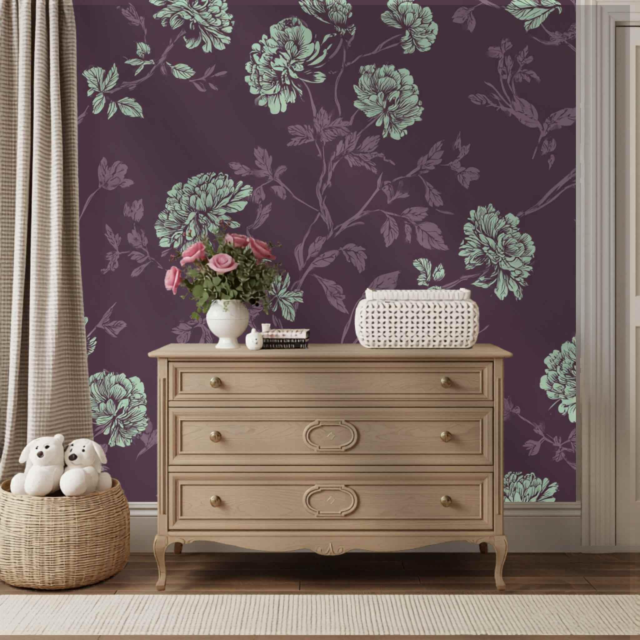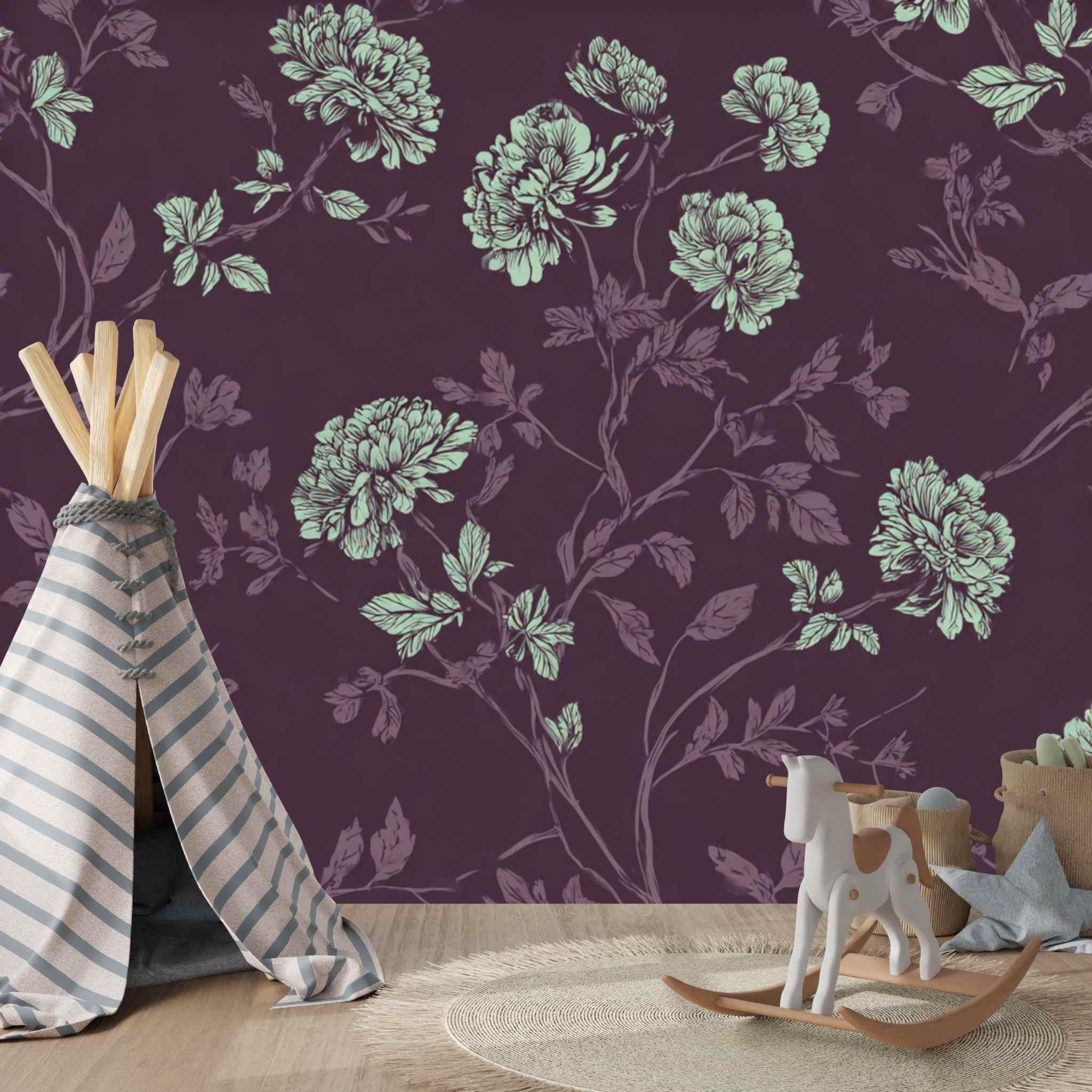 A Proper Plum and Mint Tea | Nursery or Kids Room Wall Mural Digital Download, Large Floral Print File, Bold Home Decor